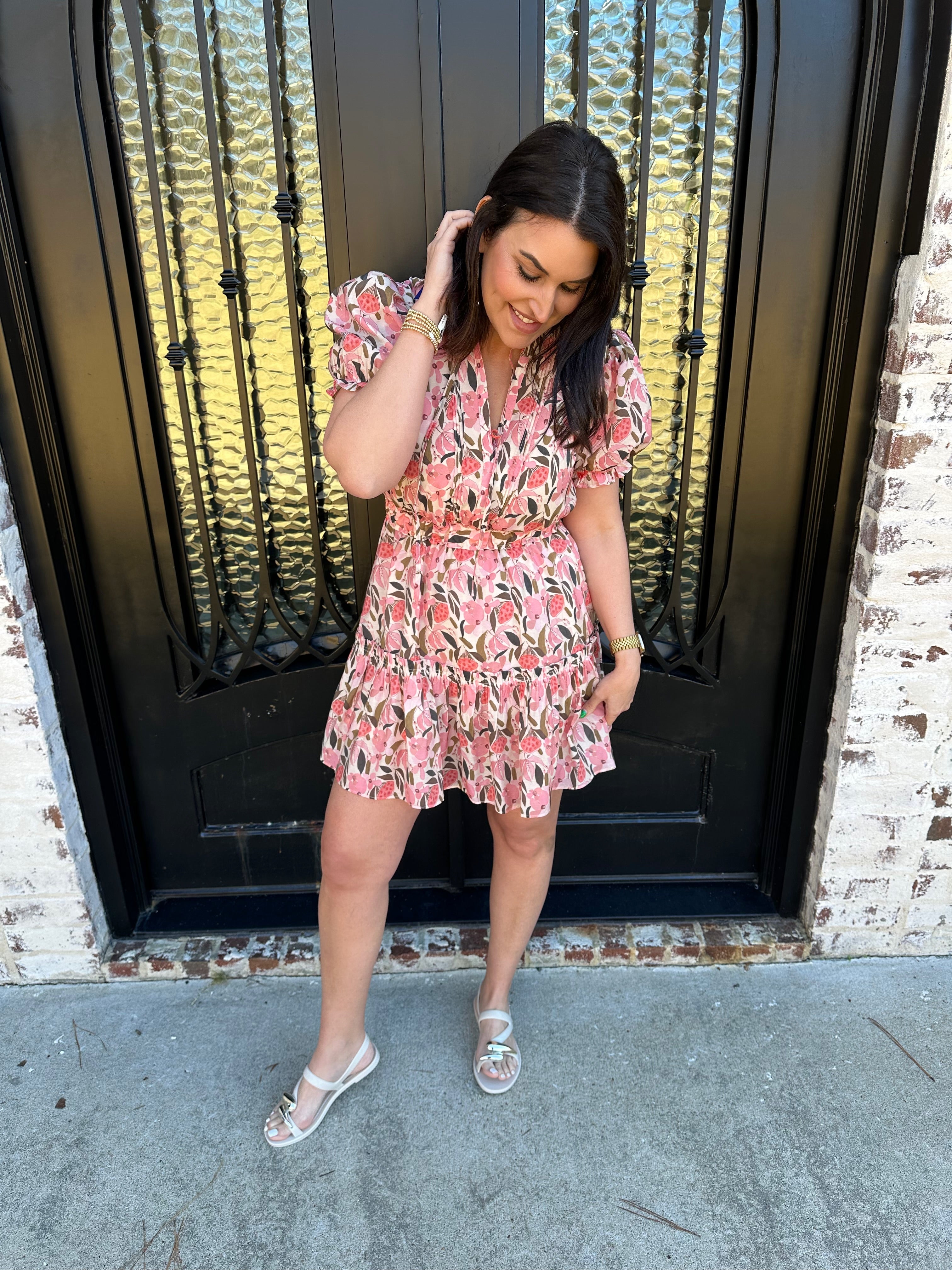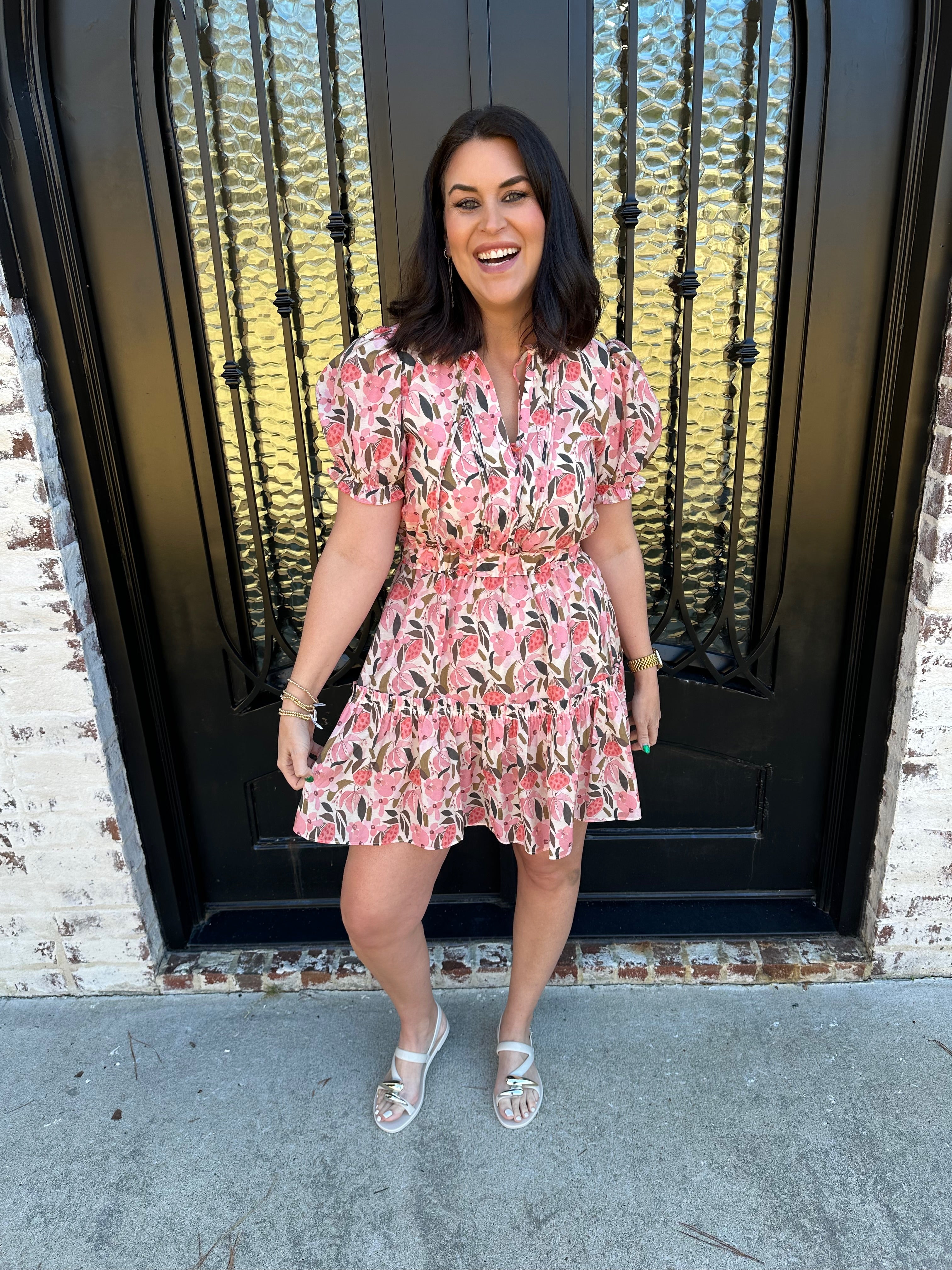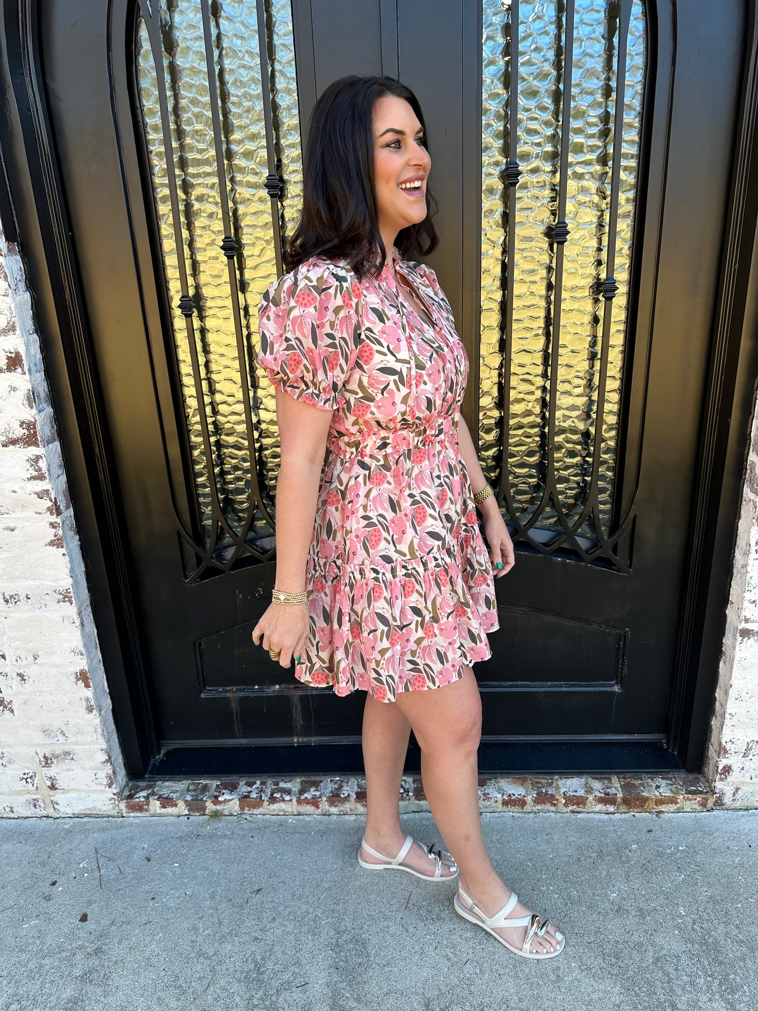 The Peony Glow Dress in Pink features a mini length design with short sleeves and a cinched waist. The floral pattern enhances its romantic aesthetic, making it suitable for various spring & summer occasions. Its fit promotes comfort while accentuating the silhouette, offering both style and ease of movement.