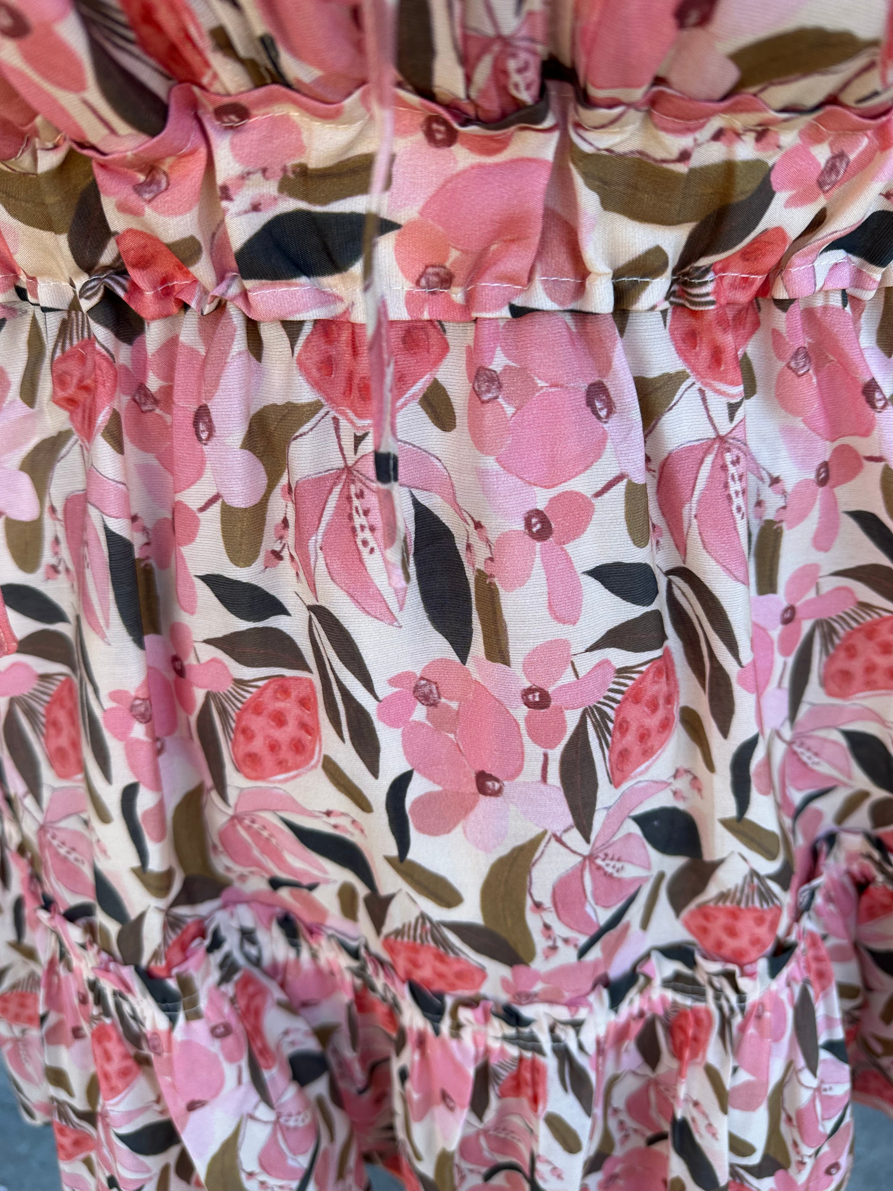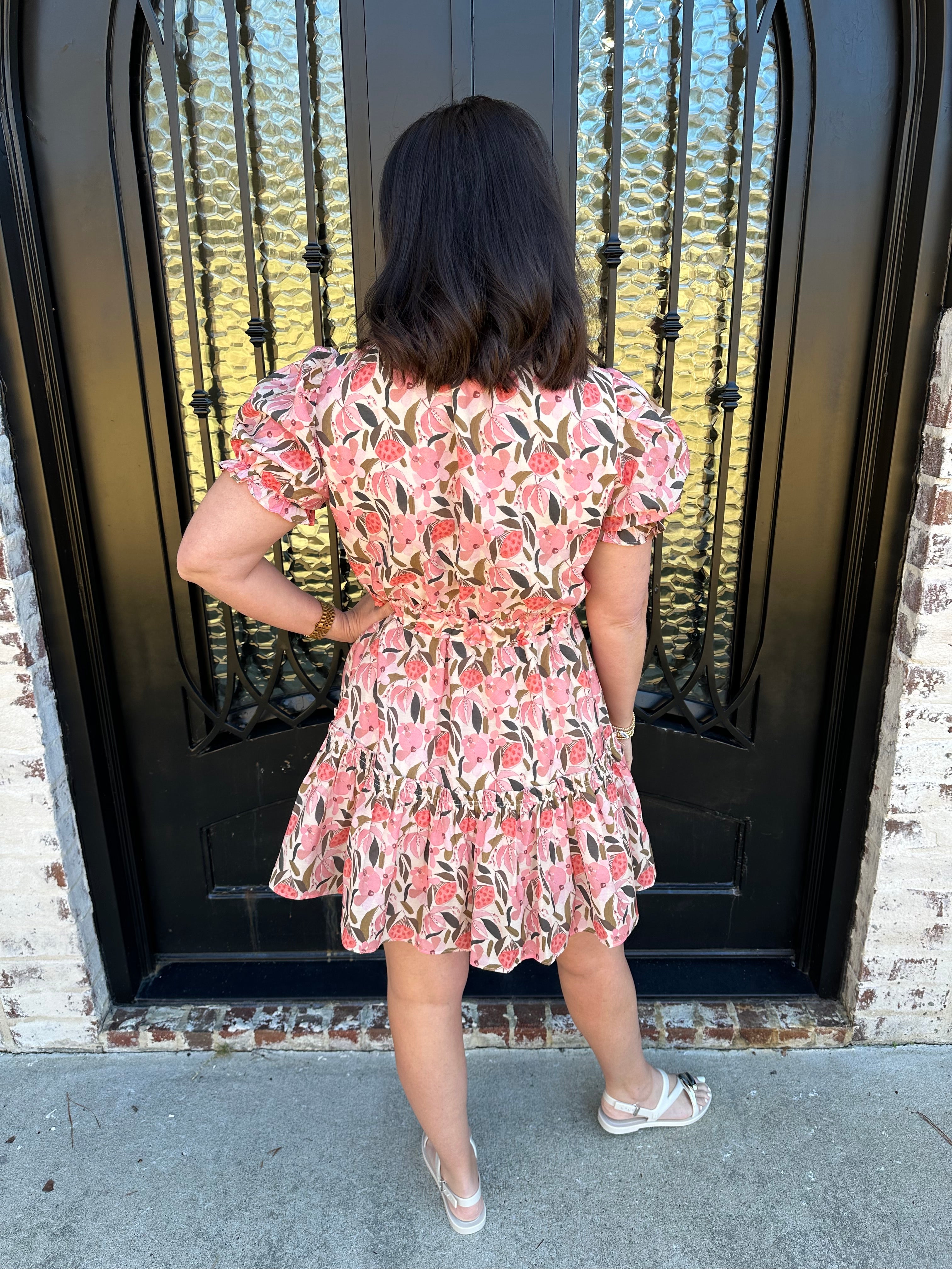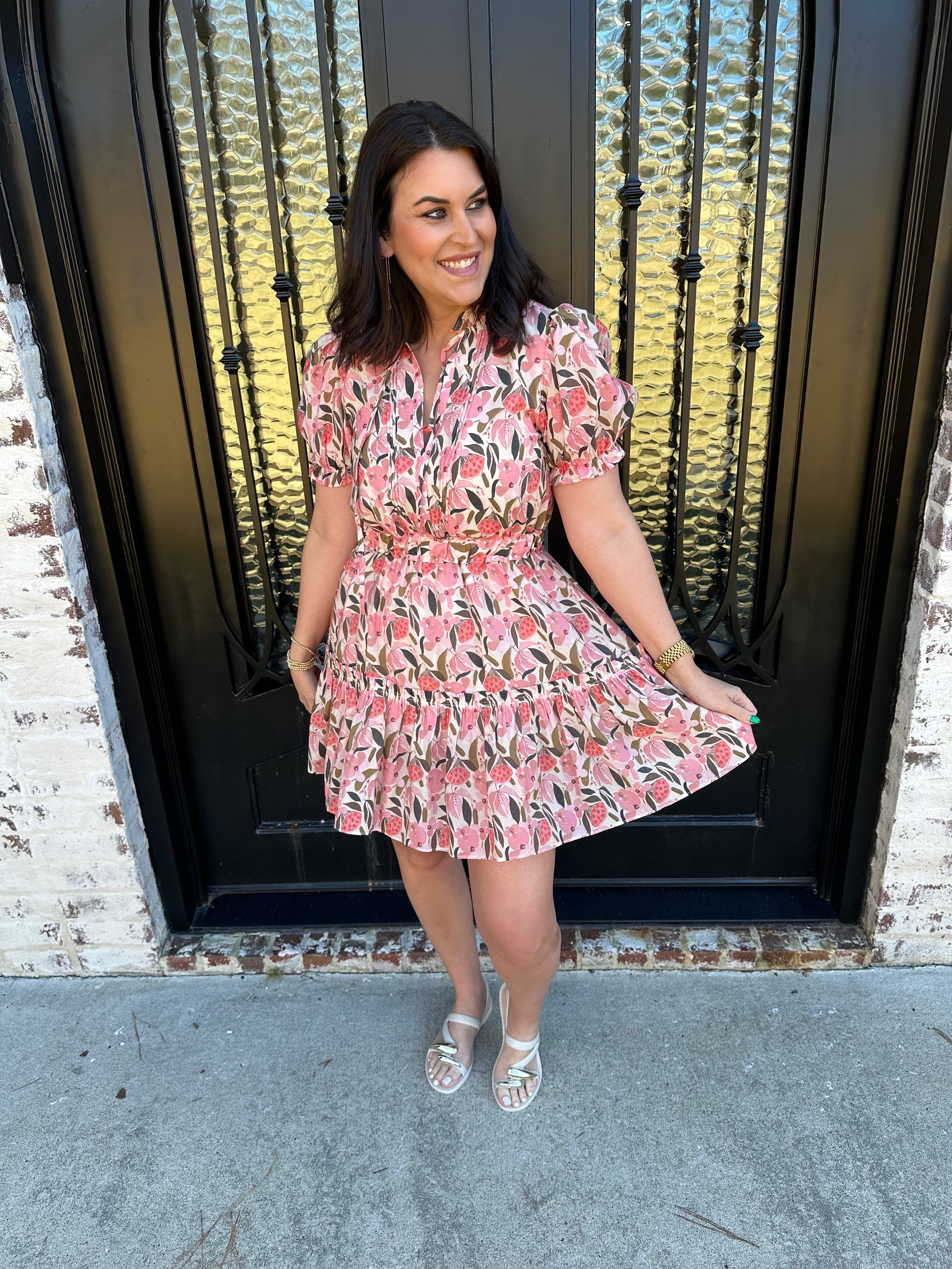The Peony Glow Dress in Pink features a mini length design with short sleeves and a cinched waist. The floral pattern enhances its romantic aesthetic, making it suitable for various spring & summer occasions. Its fit promotes comfort while accentuating the silhouette, offering both style and ease of movement.