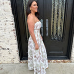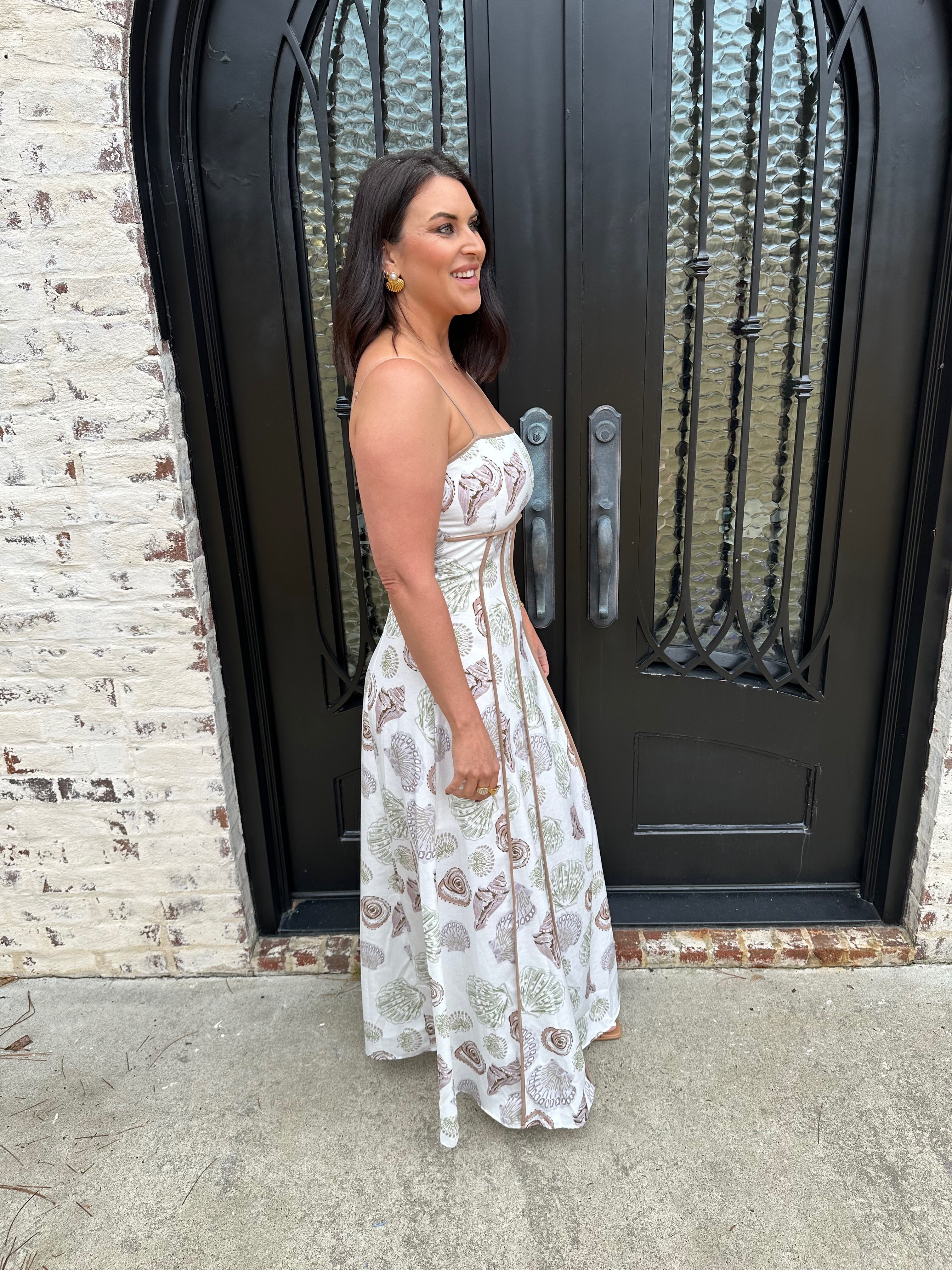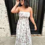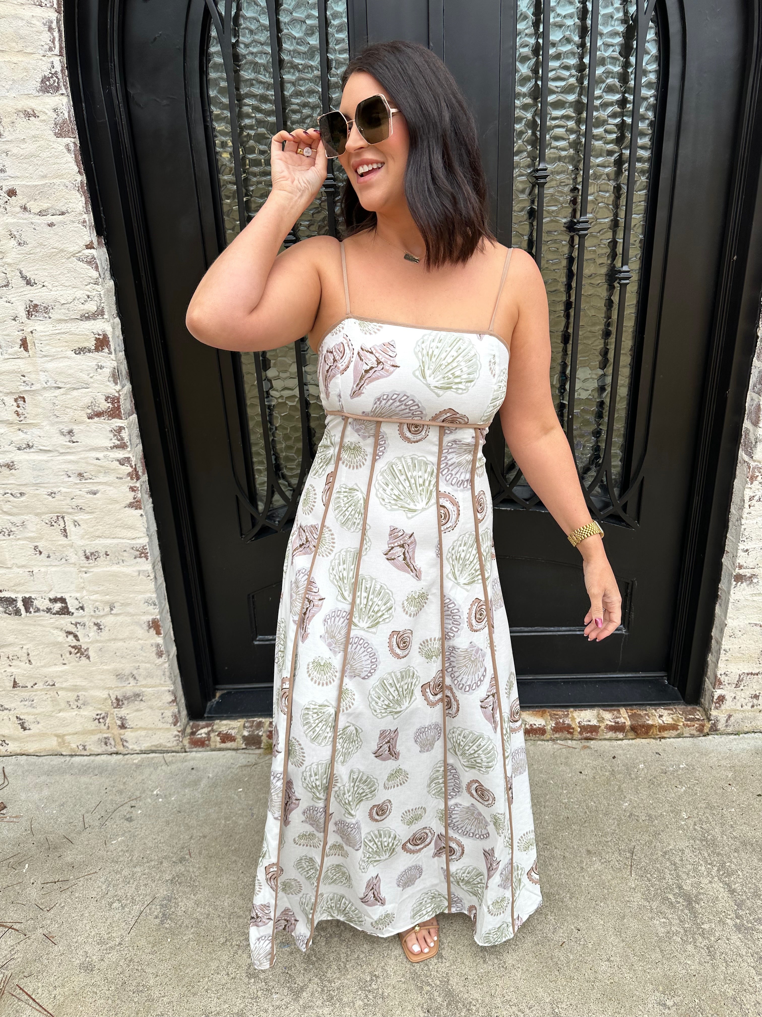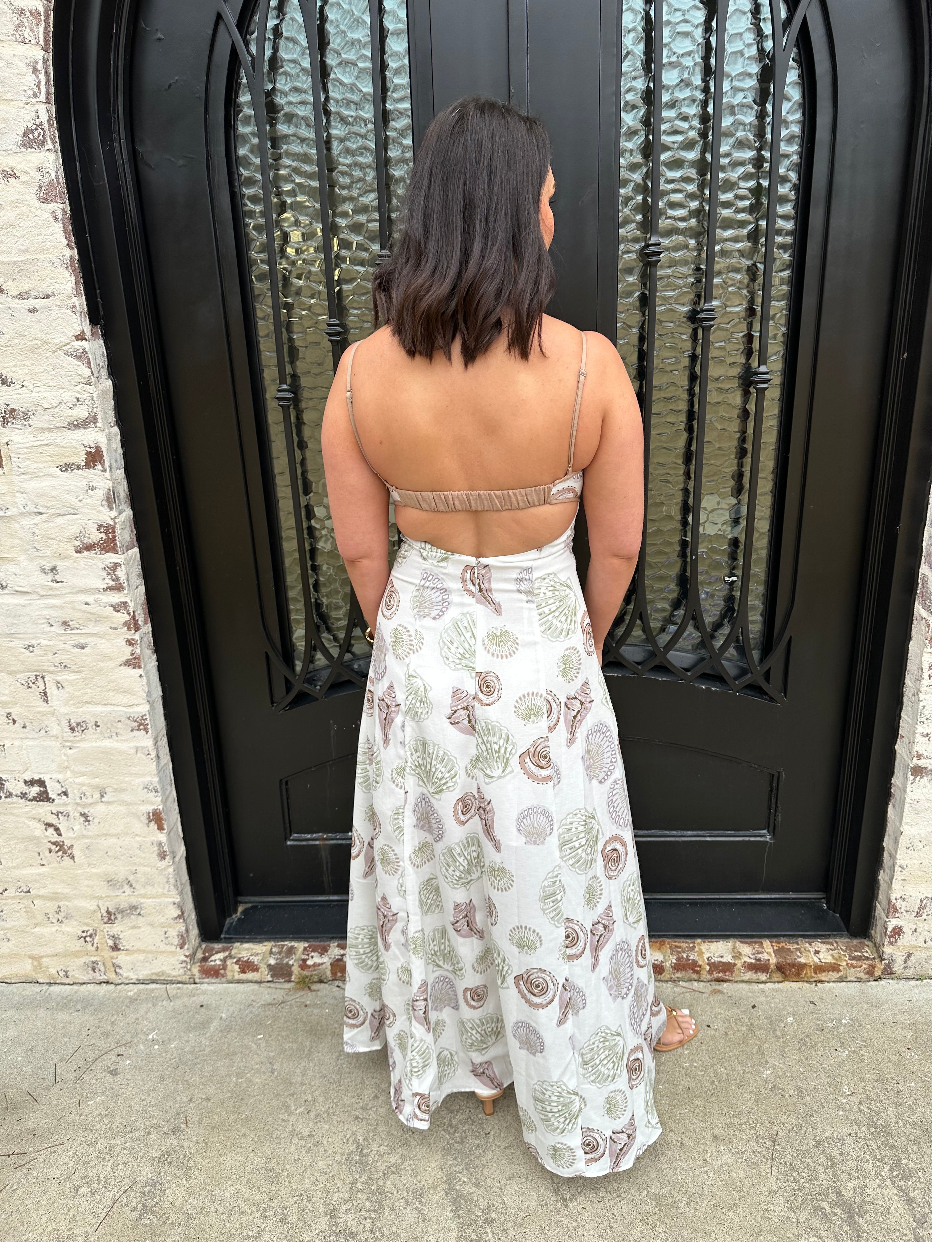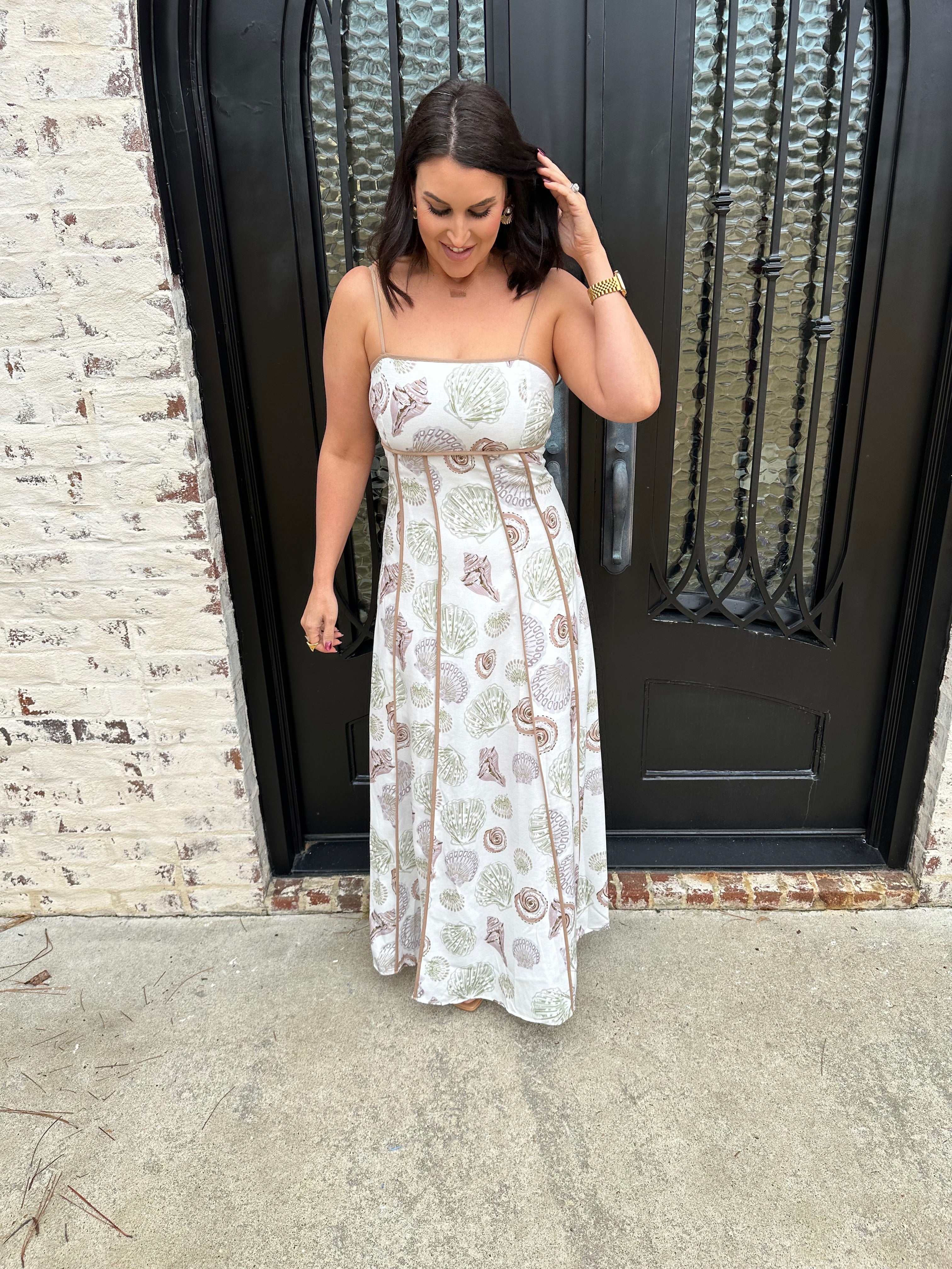 Escape to paradise with the Island Time Maxi Dress, featuring a captivating seashell beach print that transports you straight to your dream vacation. This elegant white maxi is perfect for sunset dinners, beachside celebrations, and those unforgettable getaway moments. The hidden zipper ensures a seamless silhouette, while the elastic leather back strap adds a touch of sophistication and comfort. Whether you're dressing up for a special occasion or embracing casual island elegance, this dress delivers effortless style that makes you feel like you're always on vacation.