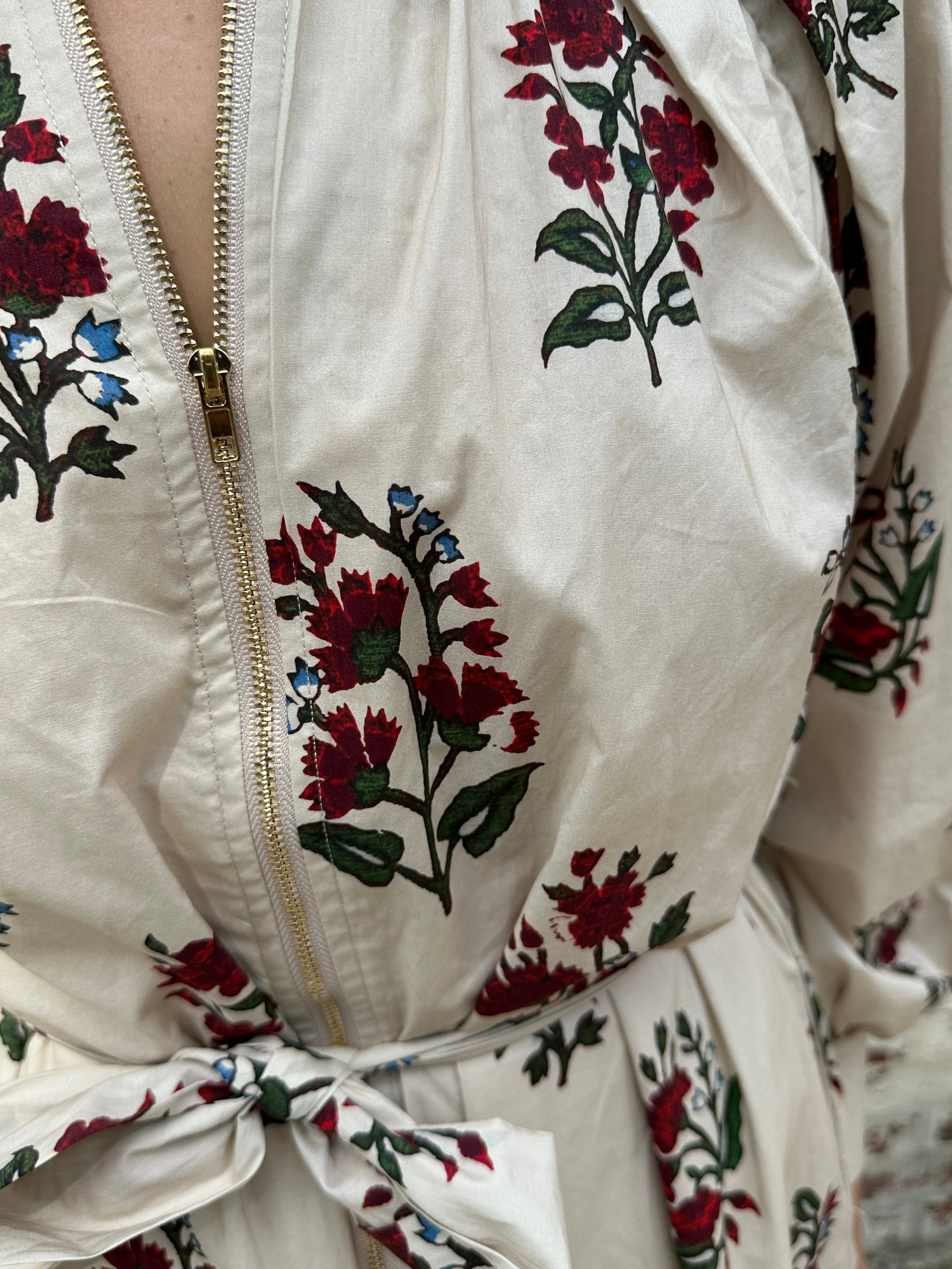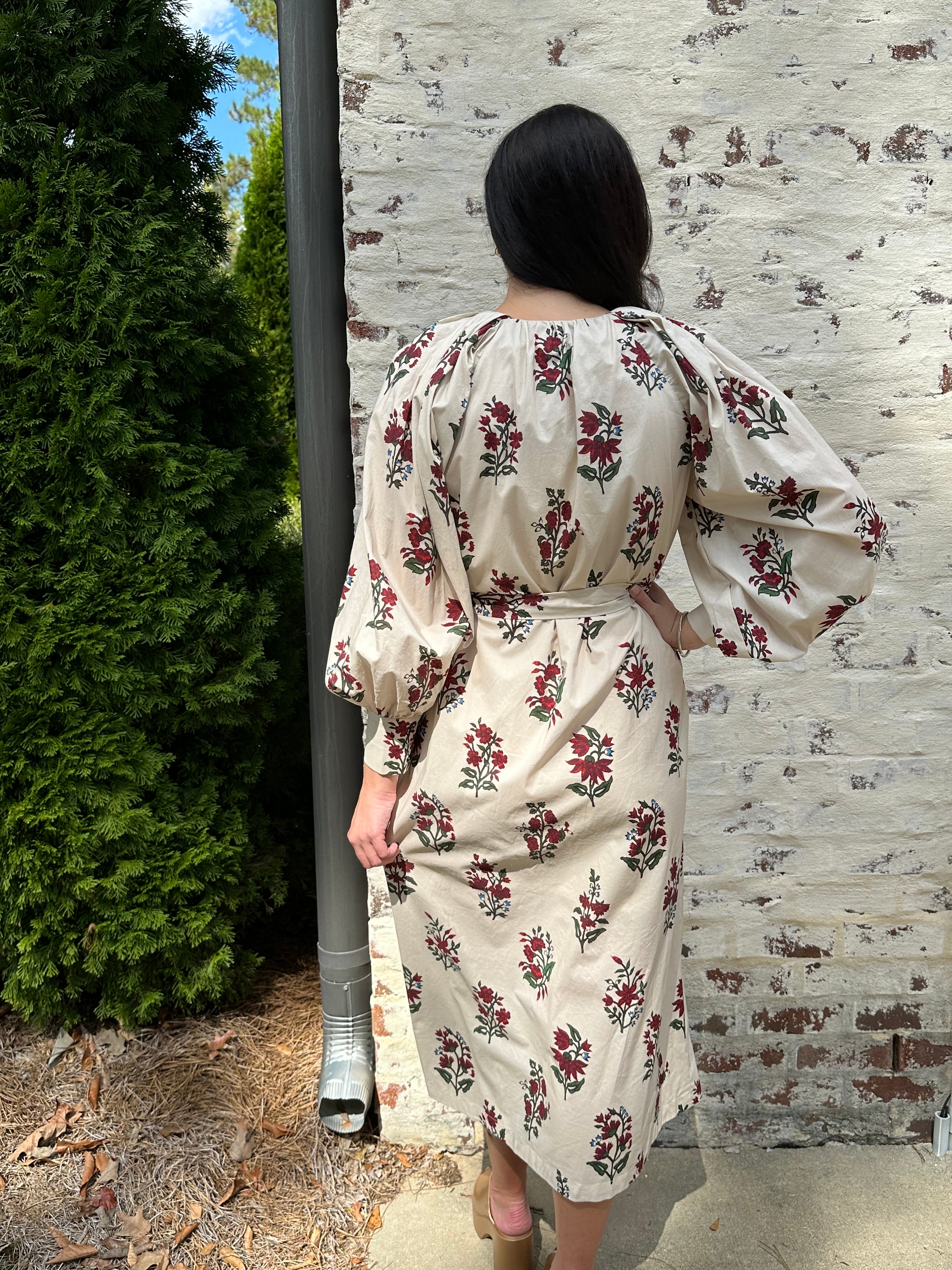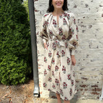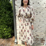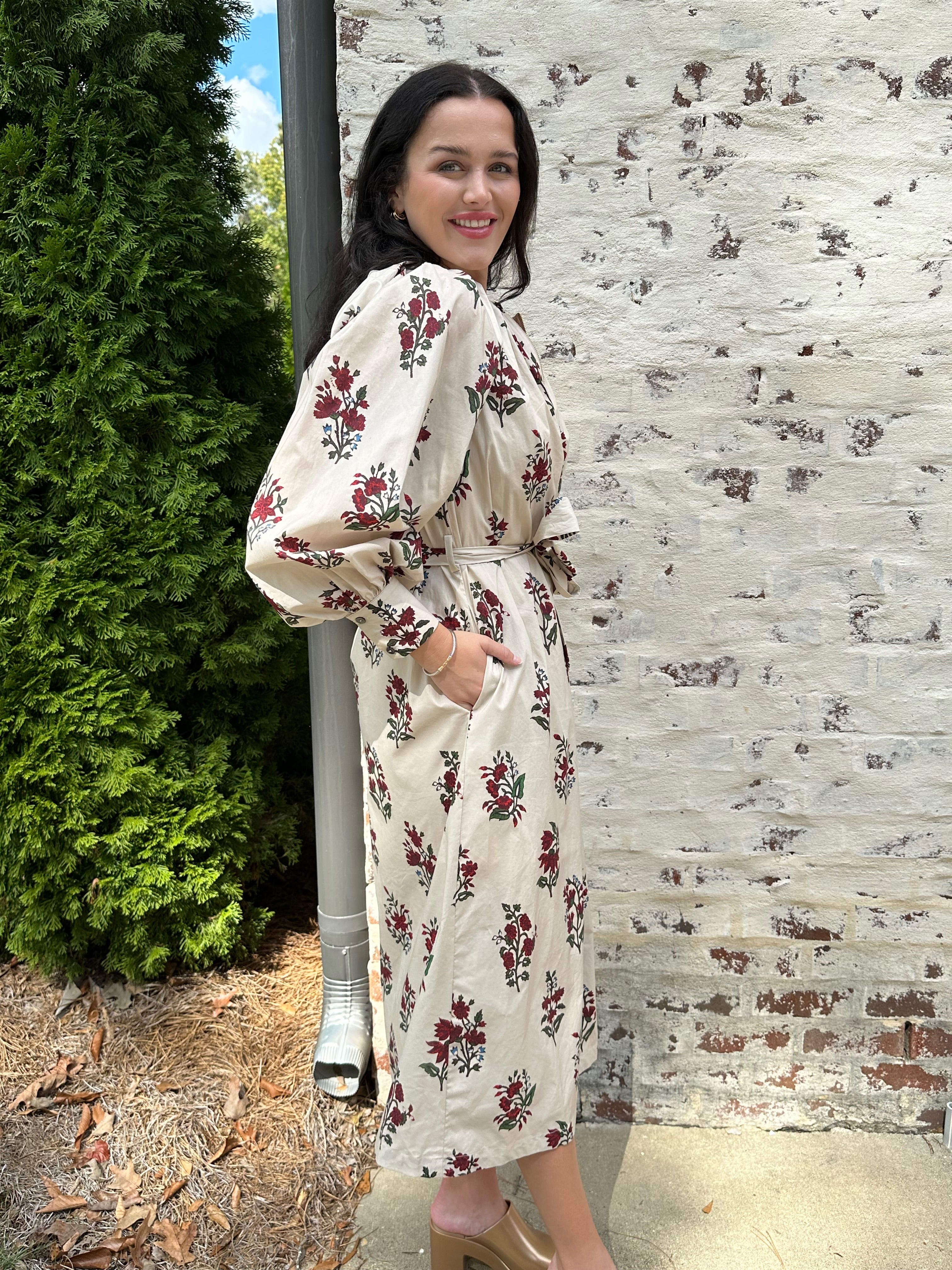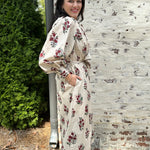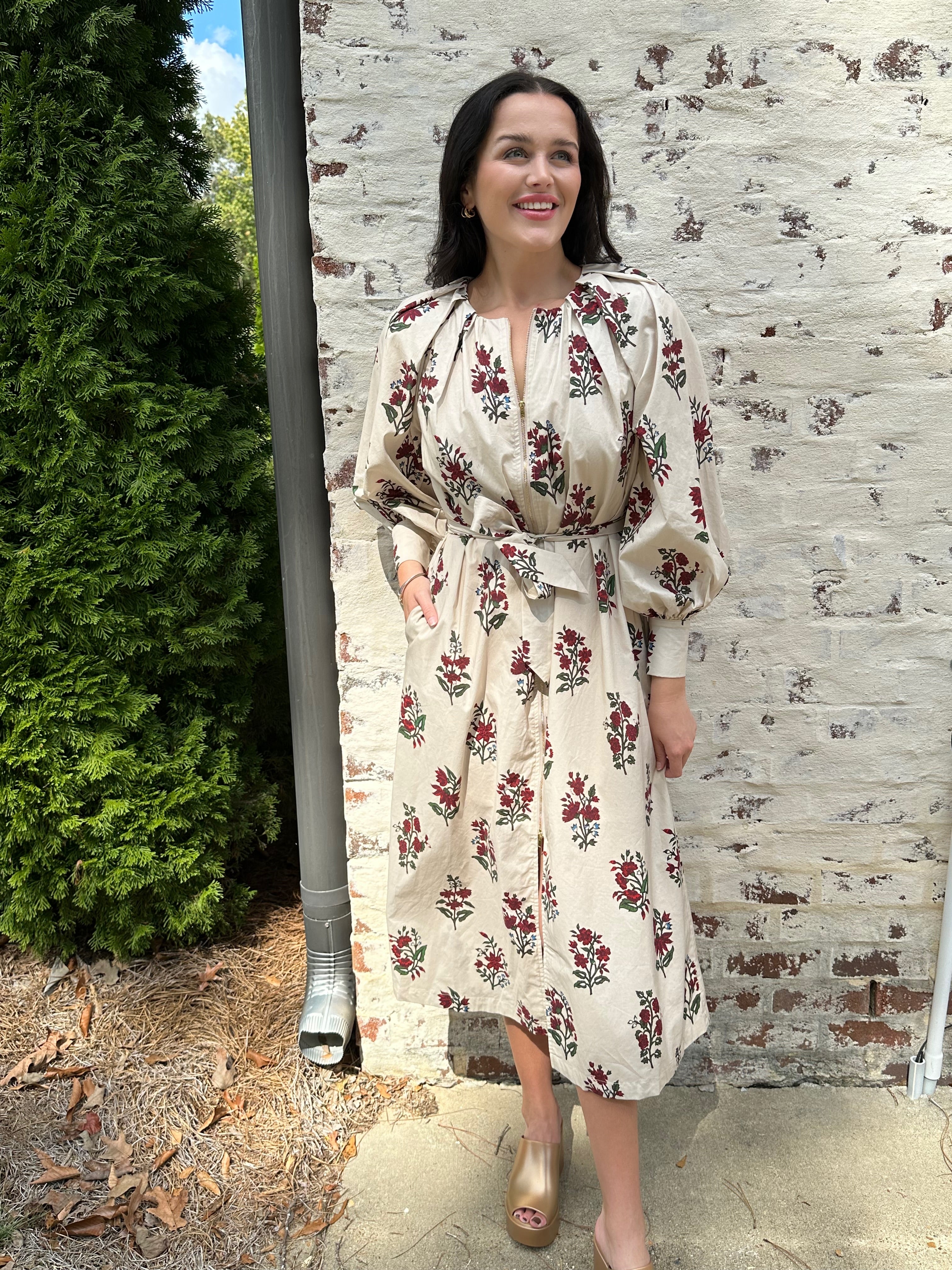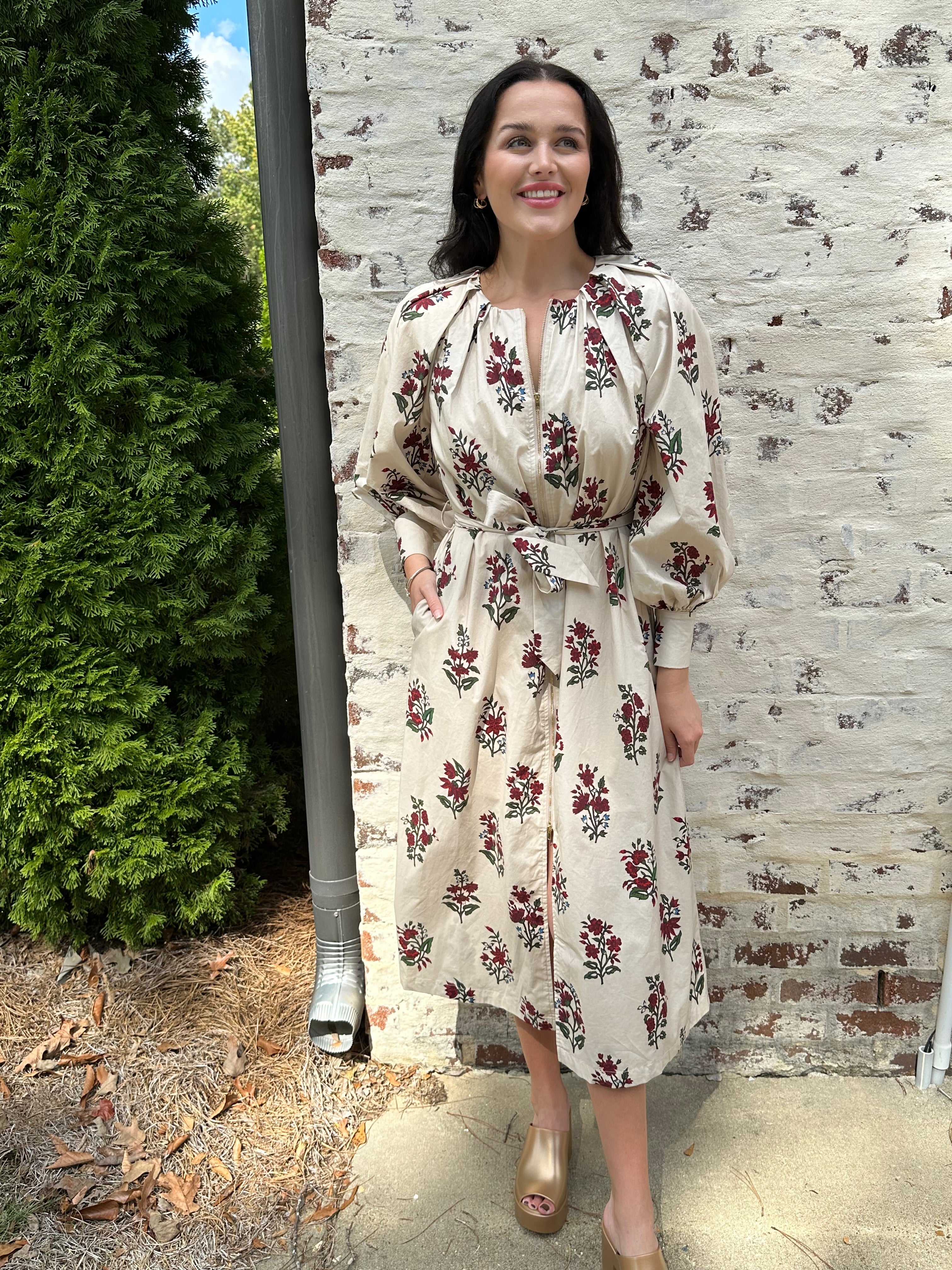 Celebrate the return of our best-selling Franny Floral Dress in Ecru, now in a stunning floral print. Designed with a functional zipper and optional tie waist, it flatters every silhouette while offering easy wear. Long puff sleeves add a touch of elegance, making it perfect for fall and winter occasions. Embrace warmth and style effortlessly with this versatile dress that radiates charm wherever you go. We paired her back with our Melissa Mules in Gold. We recommend sticking with your true size!