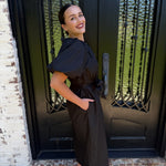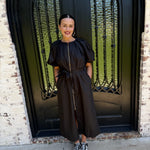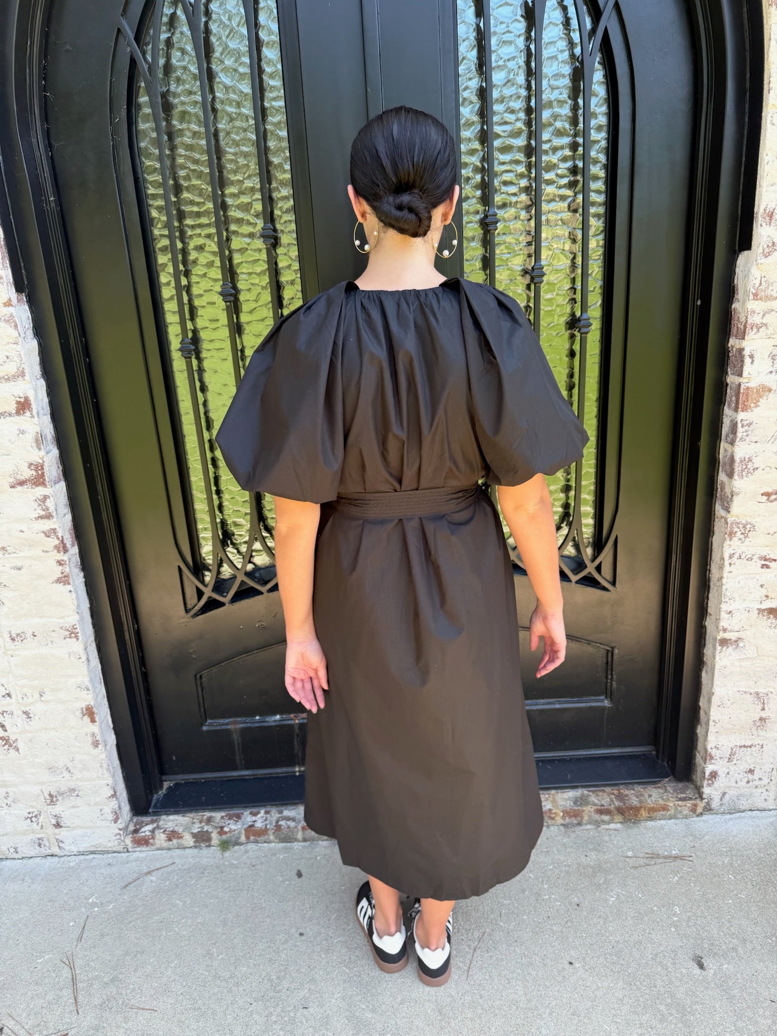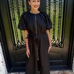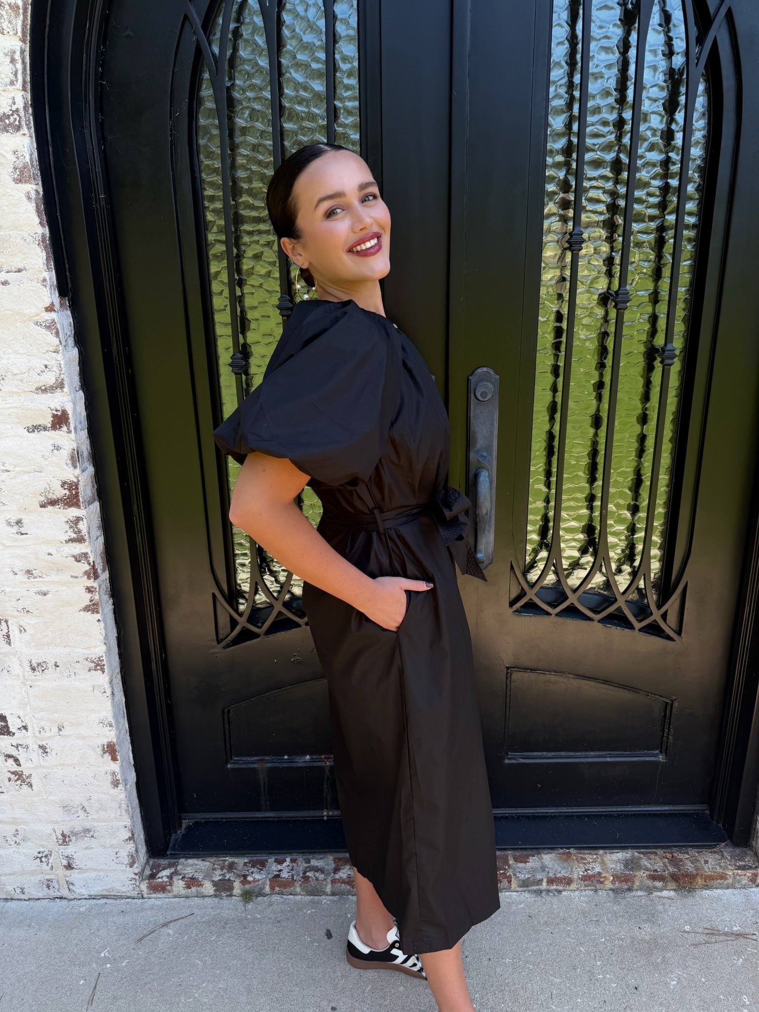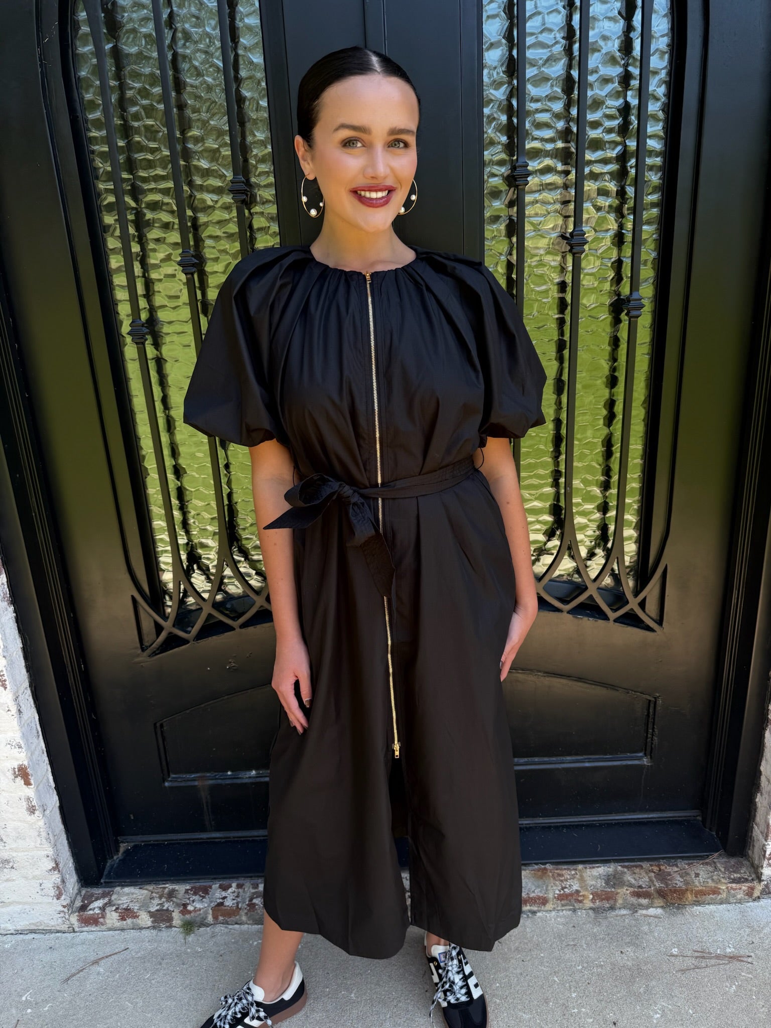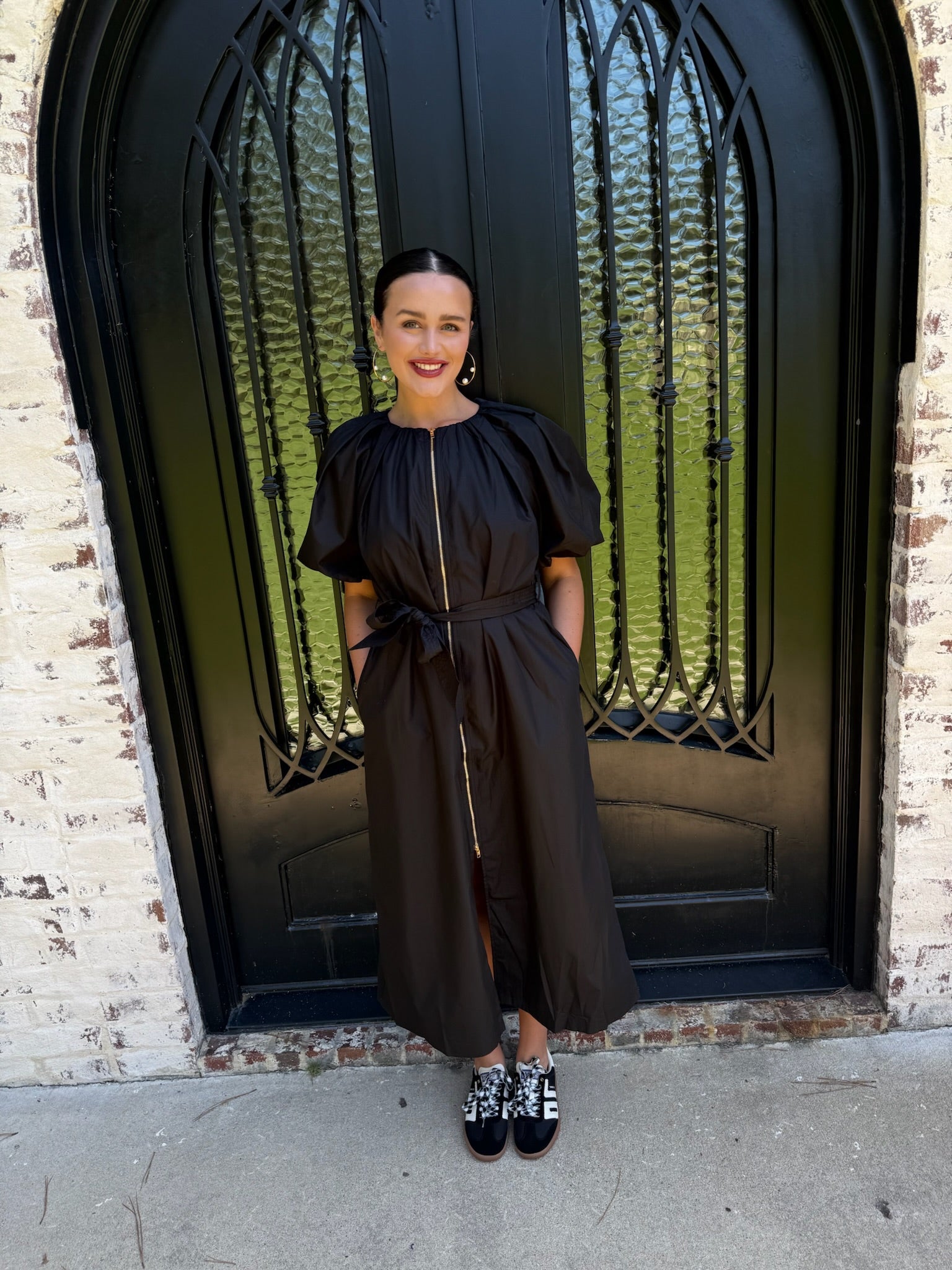 Introducing the best selling Franny Zip Up Midi in Black! This rust clay dress features a gold functioning zipper, puff sleeves, and an optional tie waist for a flattering fit. The Franny is a must have for this fall! We love her paired back with our Black Back70 sneakers!