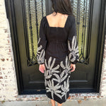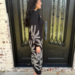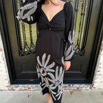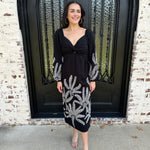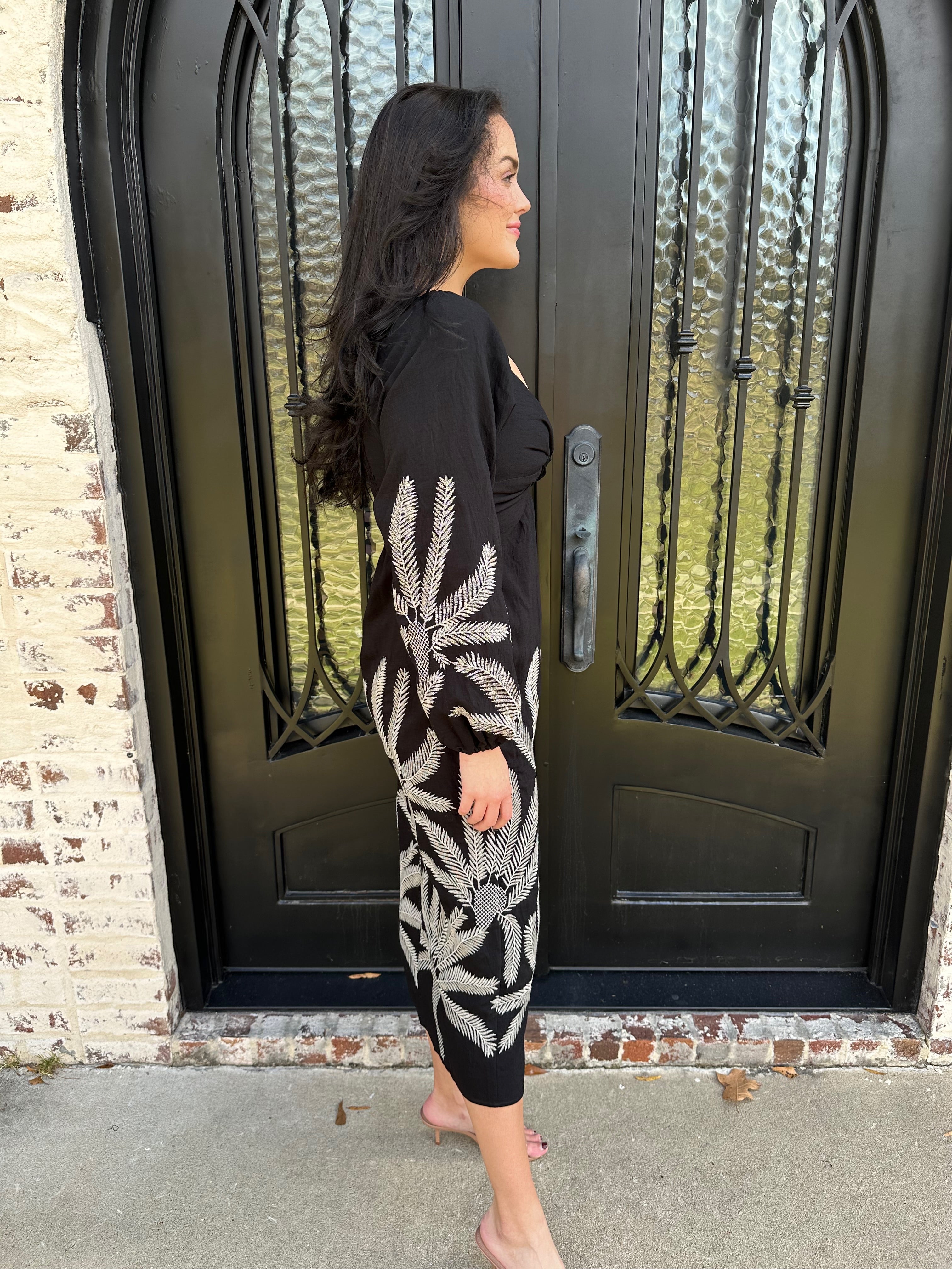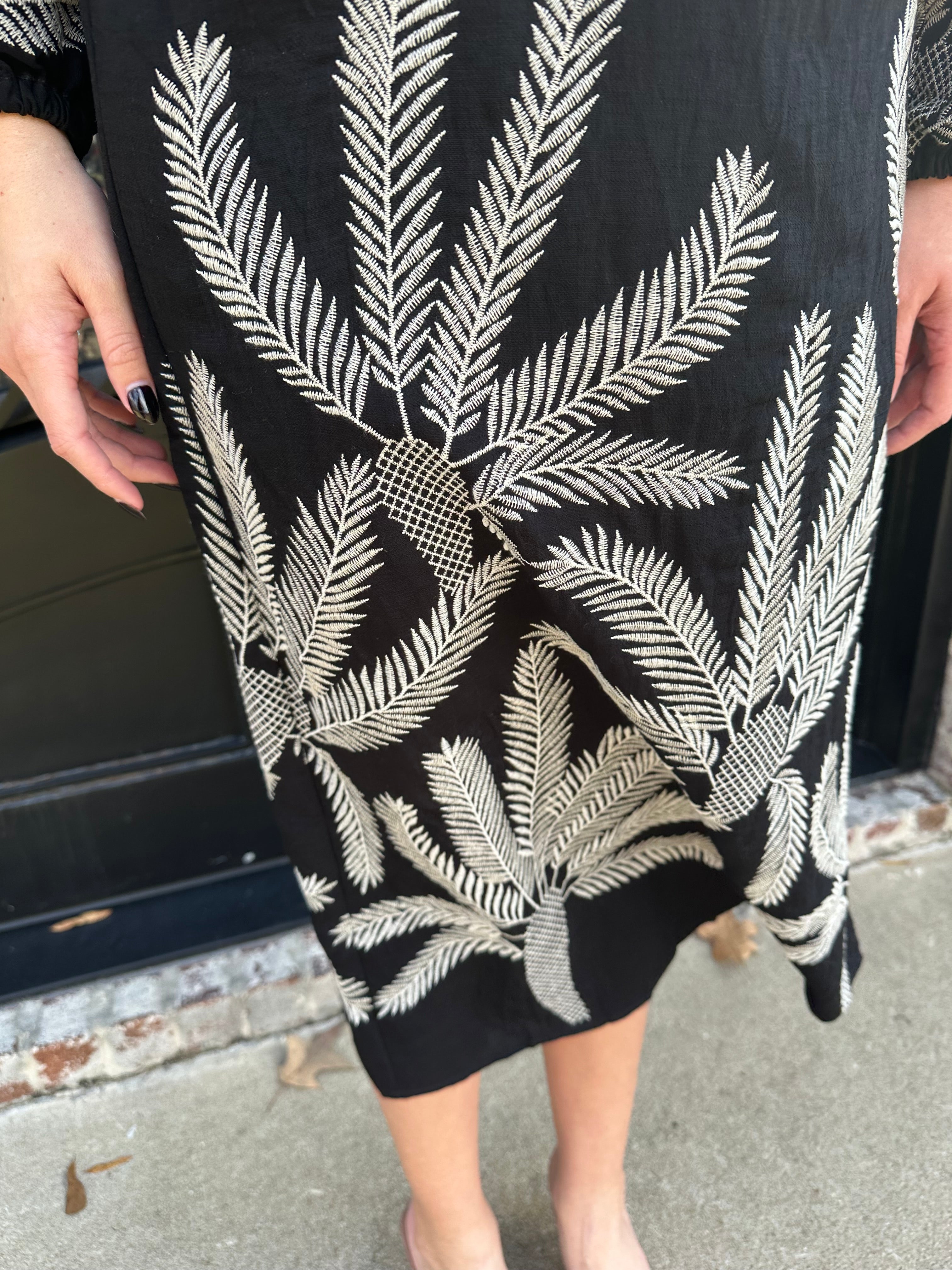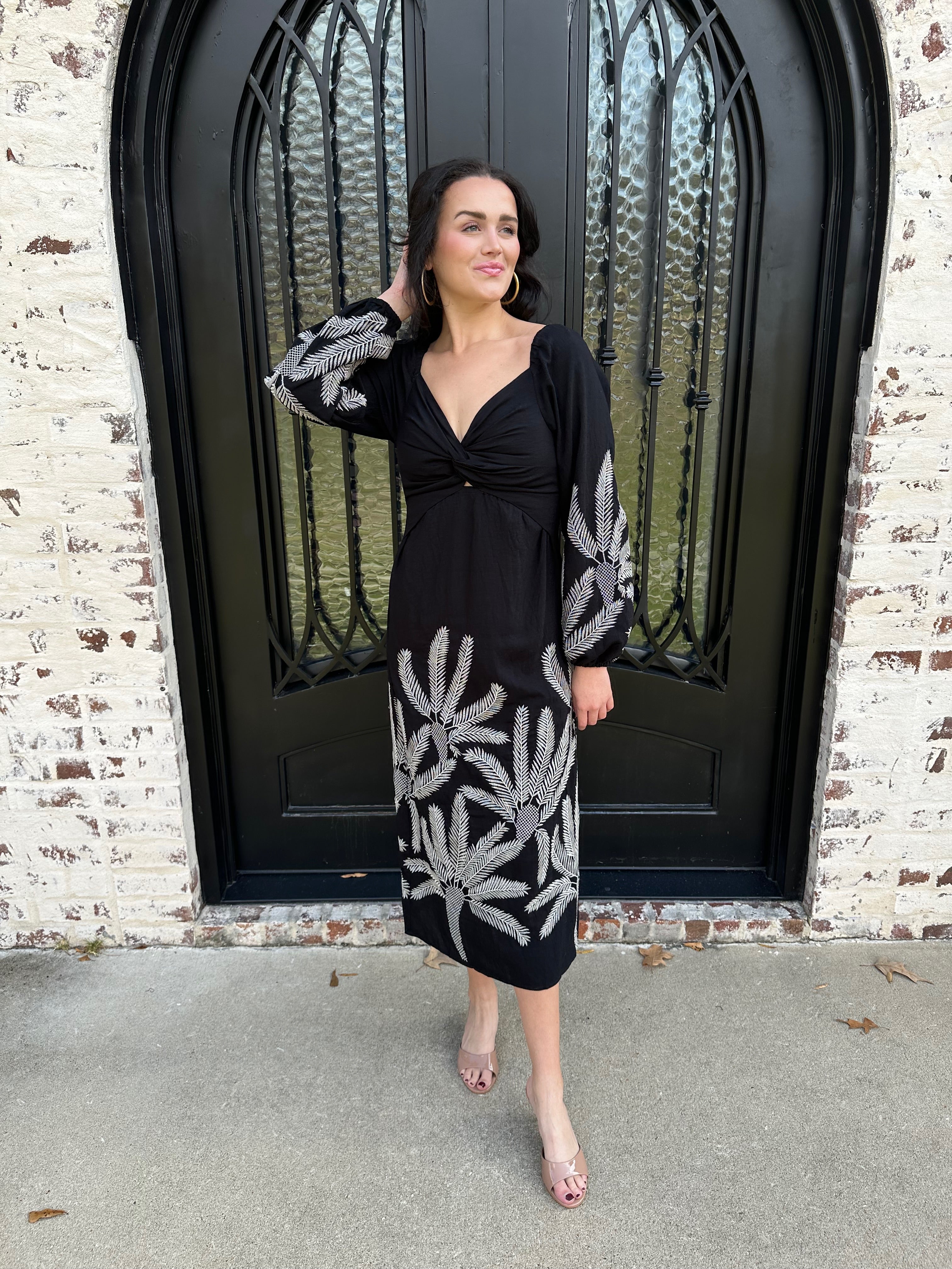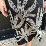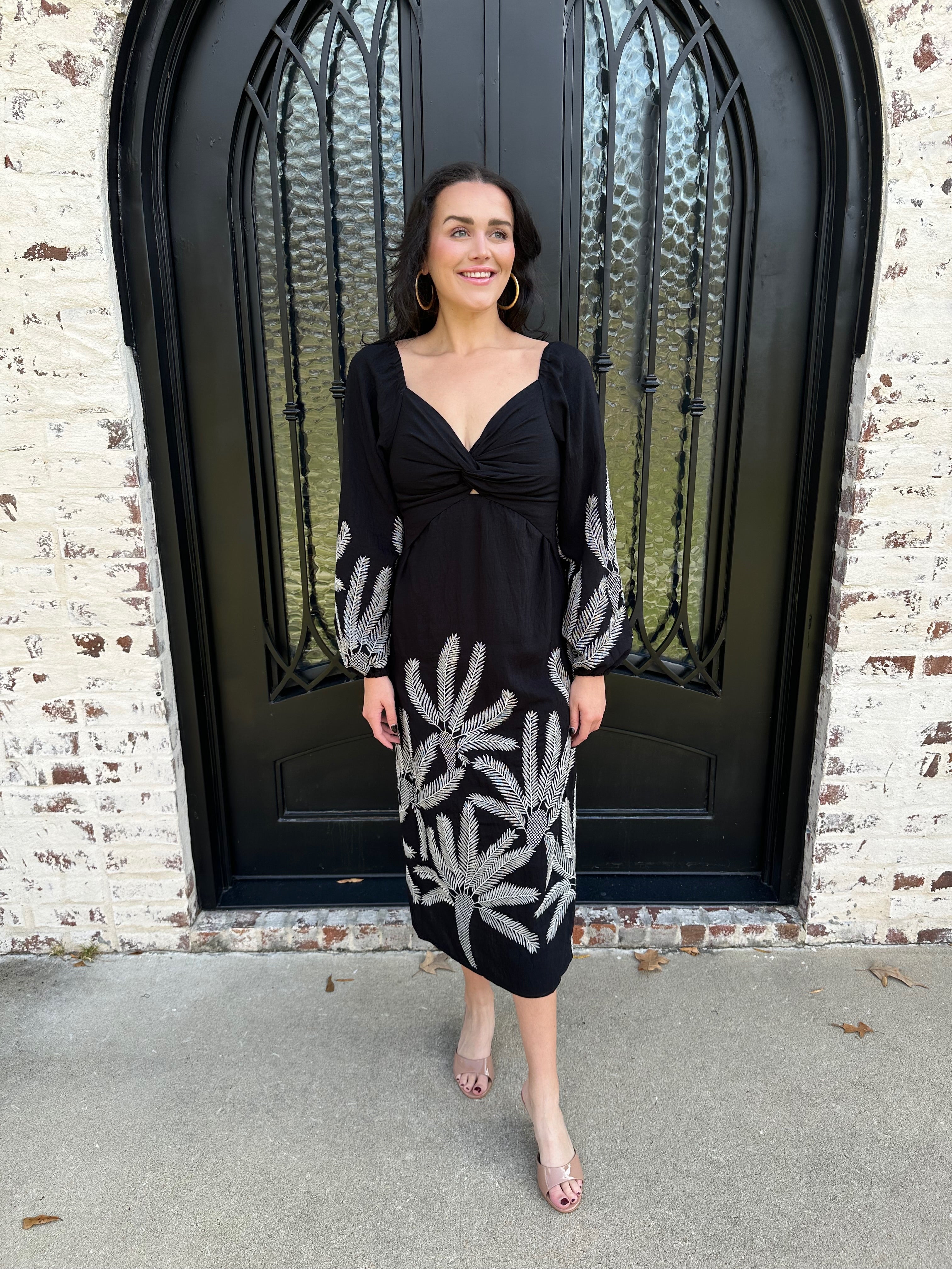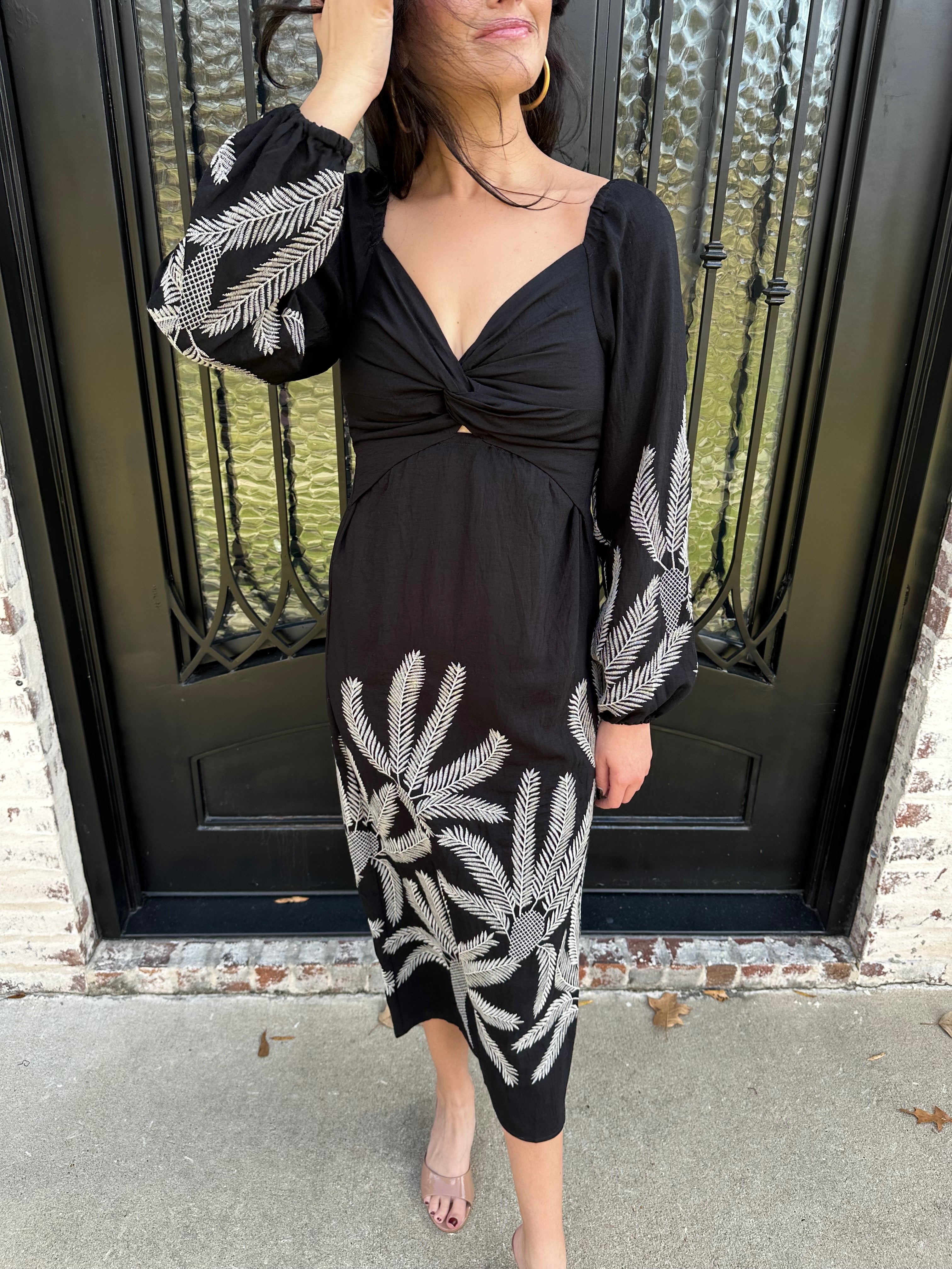Its standout feature is the delicate embroidery detailing, which adds visual interest and a high-end feel to the garment. The silhouette is an elegant midi dress length, offering coverage and formality. The bodice appears structured, possibly featuring a flattering neckline like a halter or scoop neck, allowing the embroidery to frame the upper body beautifully.