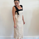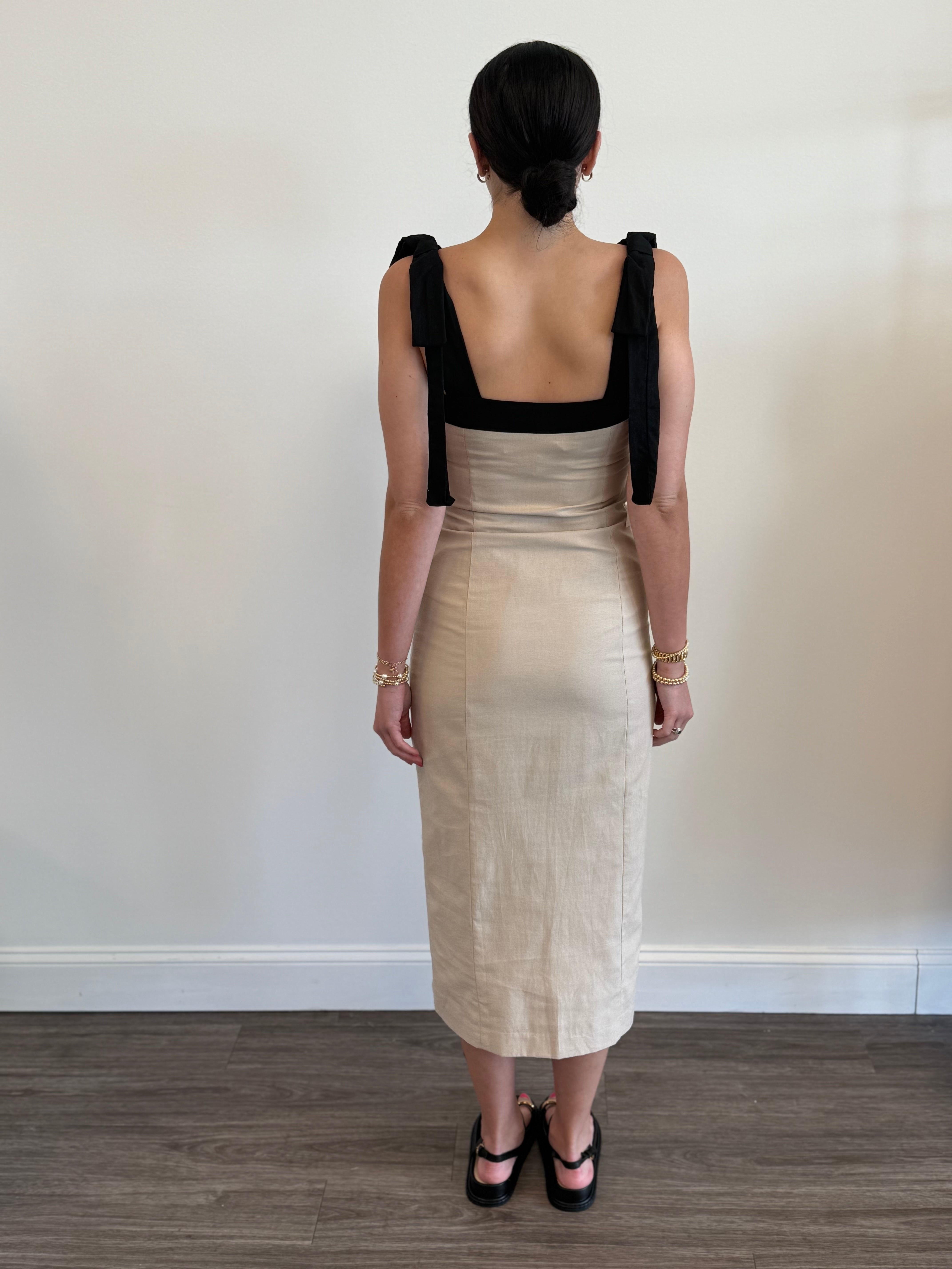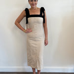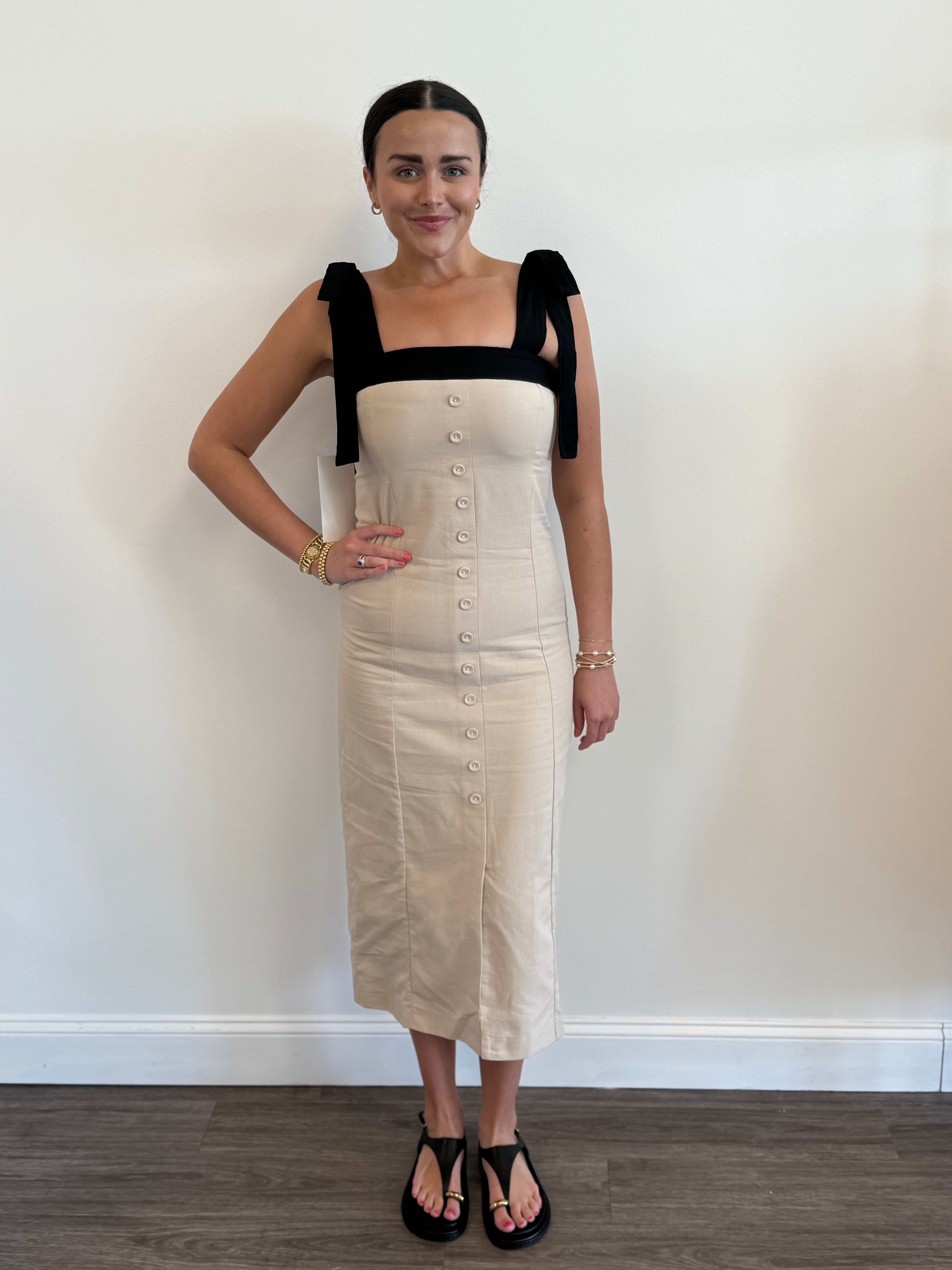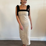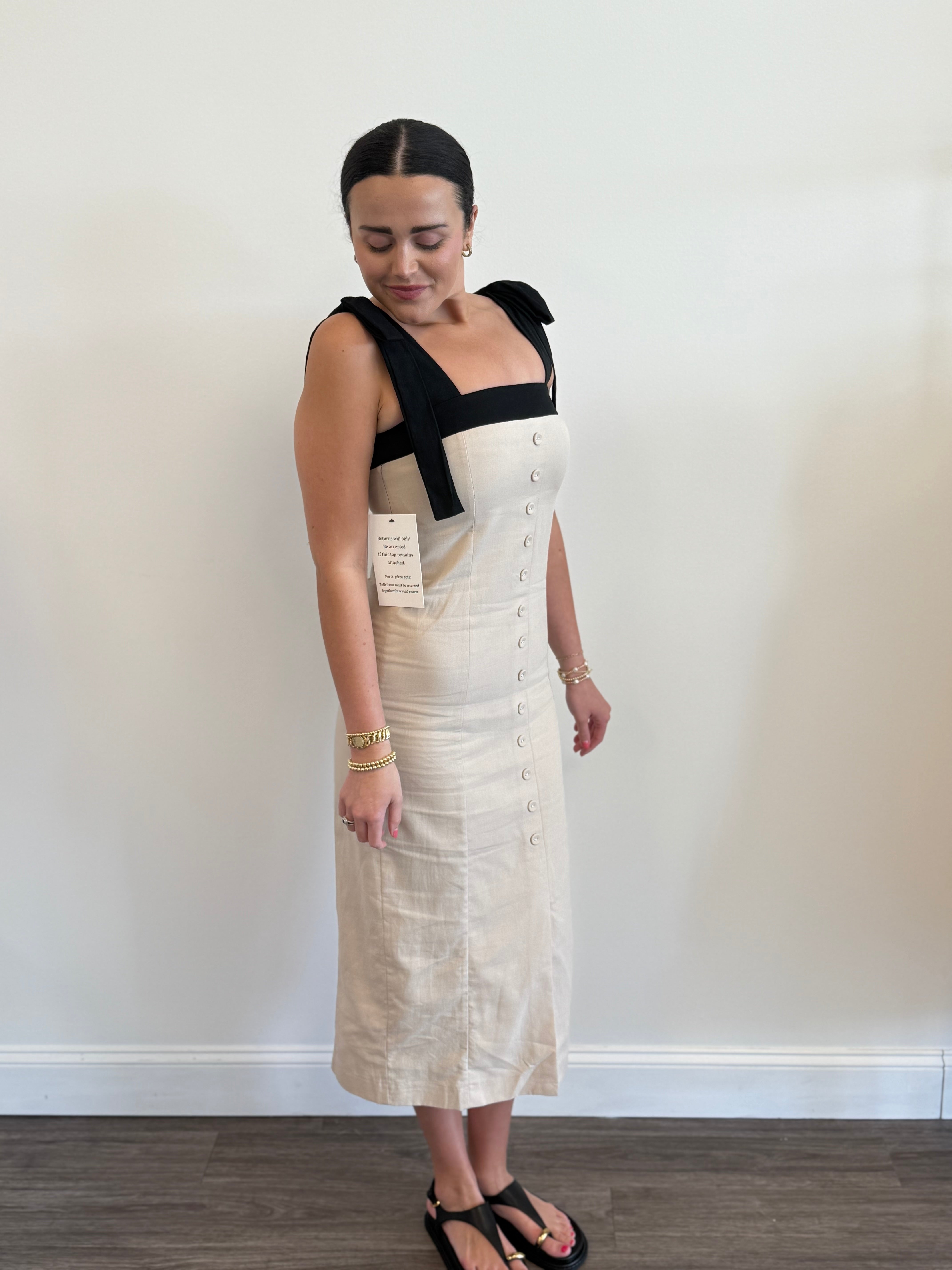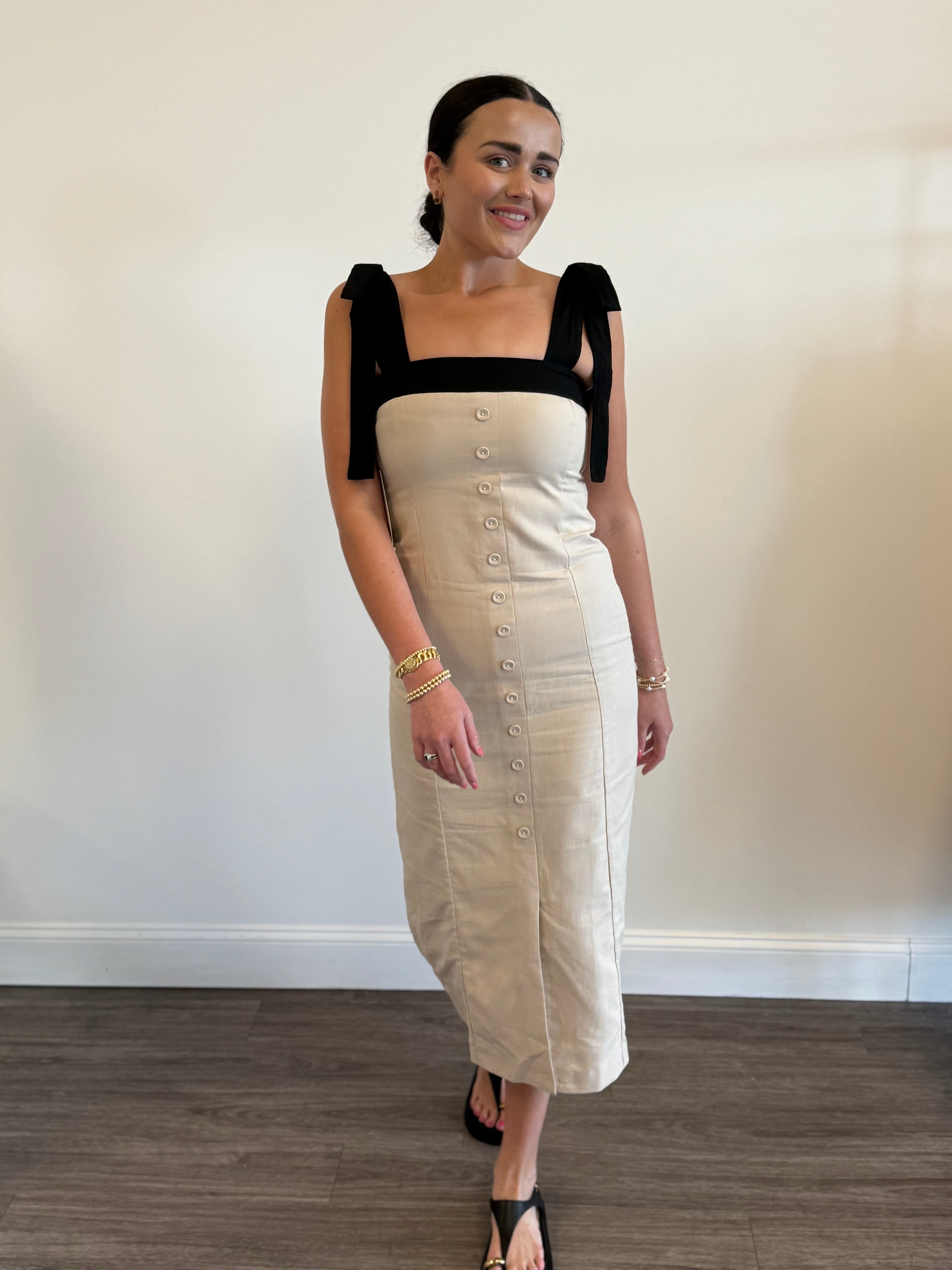 Get ready to turn heads in our Monomoy Linen Button Down Maxi! This stunning dress features a khaki button down linen design with black bow tie straps, with a slit front, creating a chic and sophisticated look. Perfect for any occasion, let this dress elevate your style and confidence! Runs Small, we suggest sizing up!