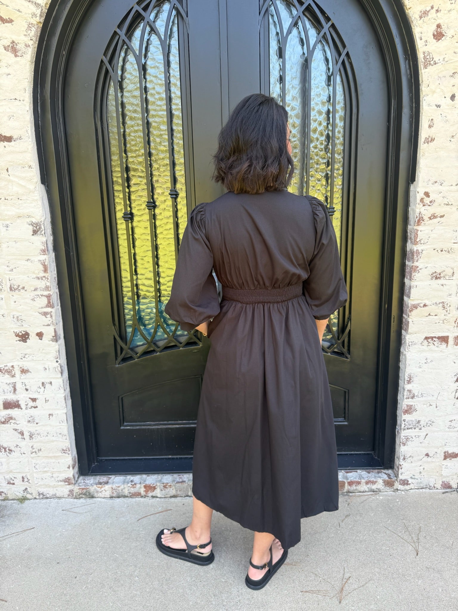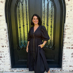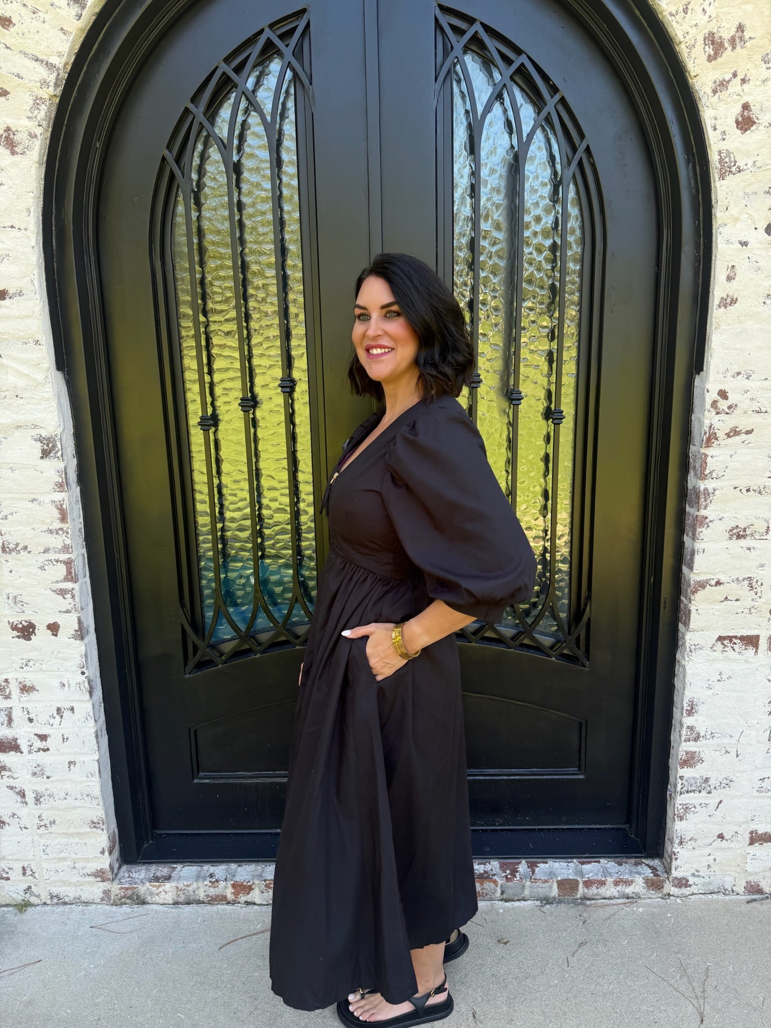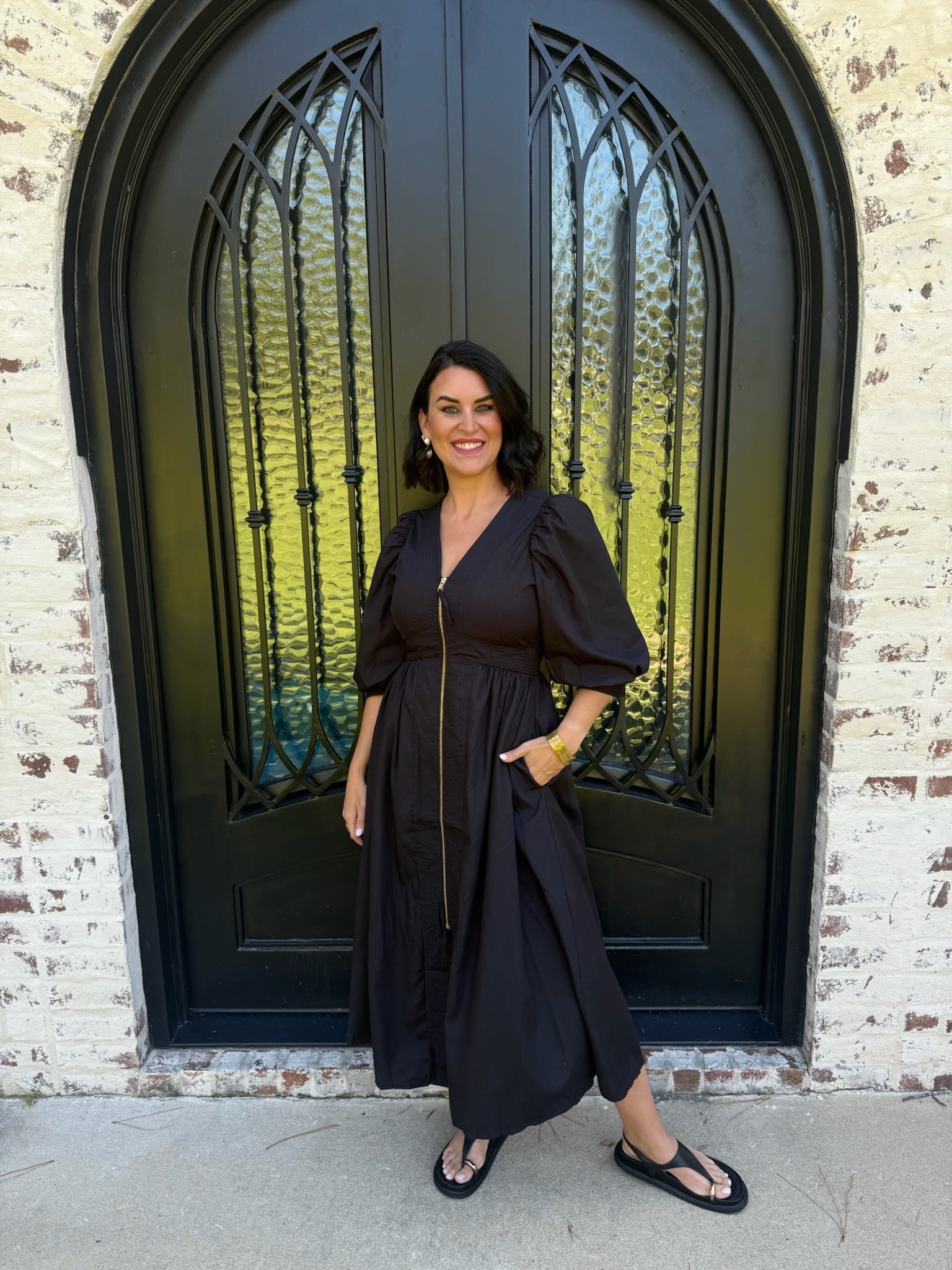 The Rena Midi Dress in Black is perfect for any occasion. Featuring elegant puff sleeves and a sleek gold zip-up design, expect to turn heads wherever you go. The high-quality materials and expert craftsmanship ensure both style and comfort, making it a must-have addition to any wardrobe.