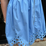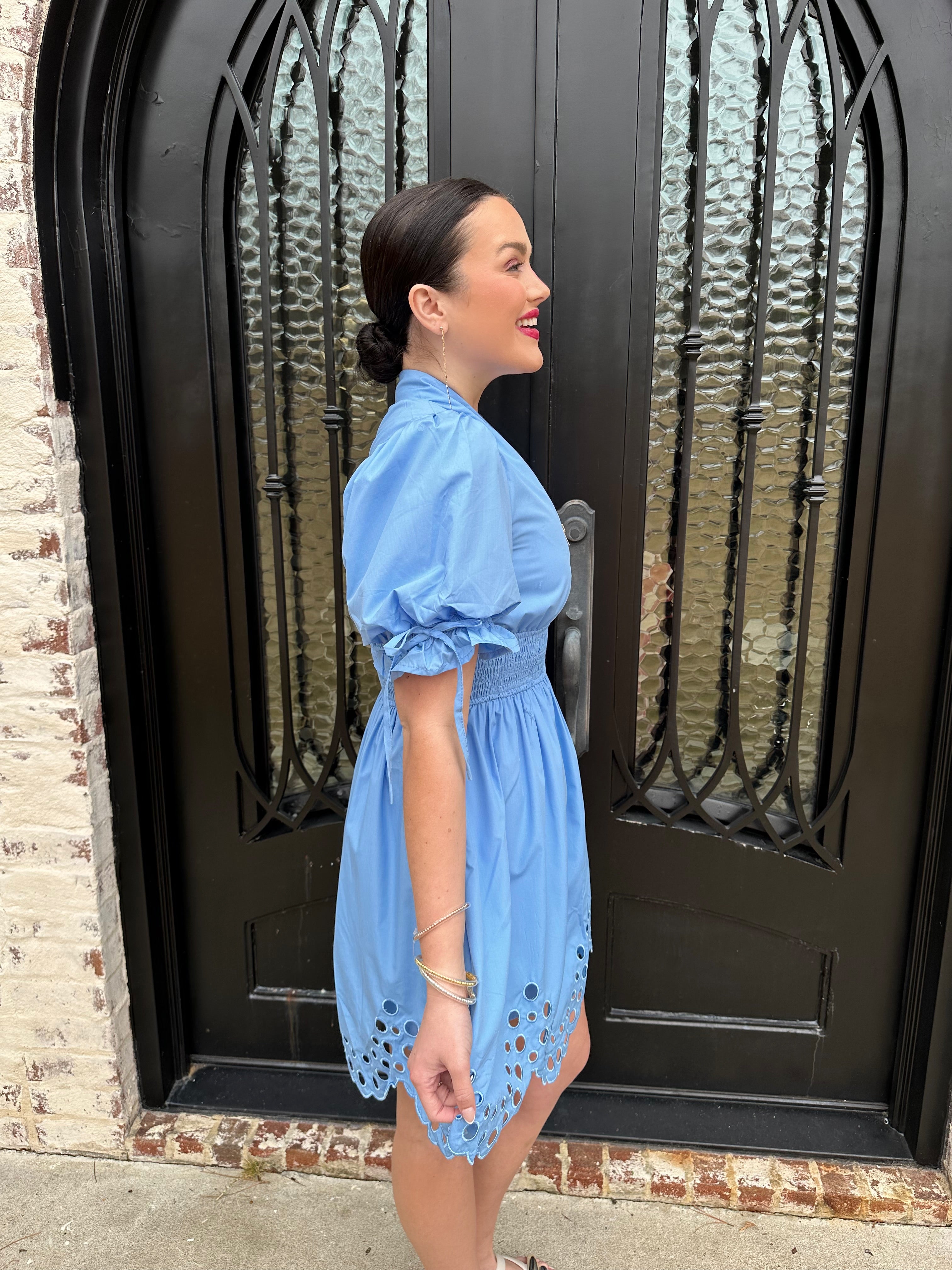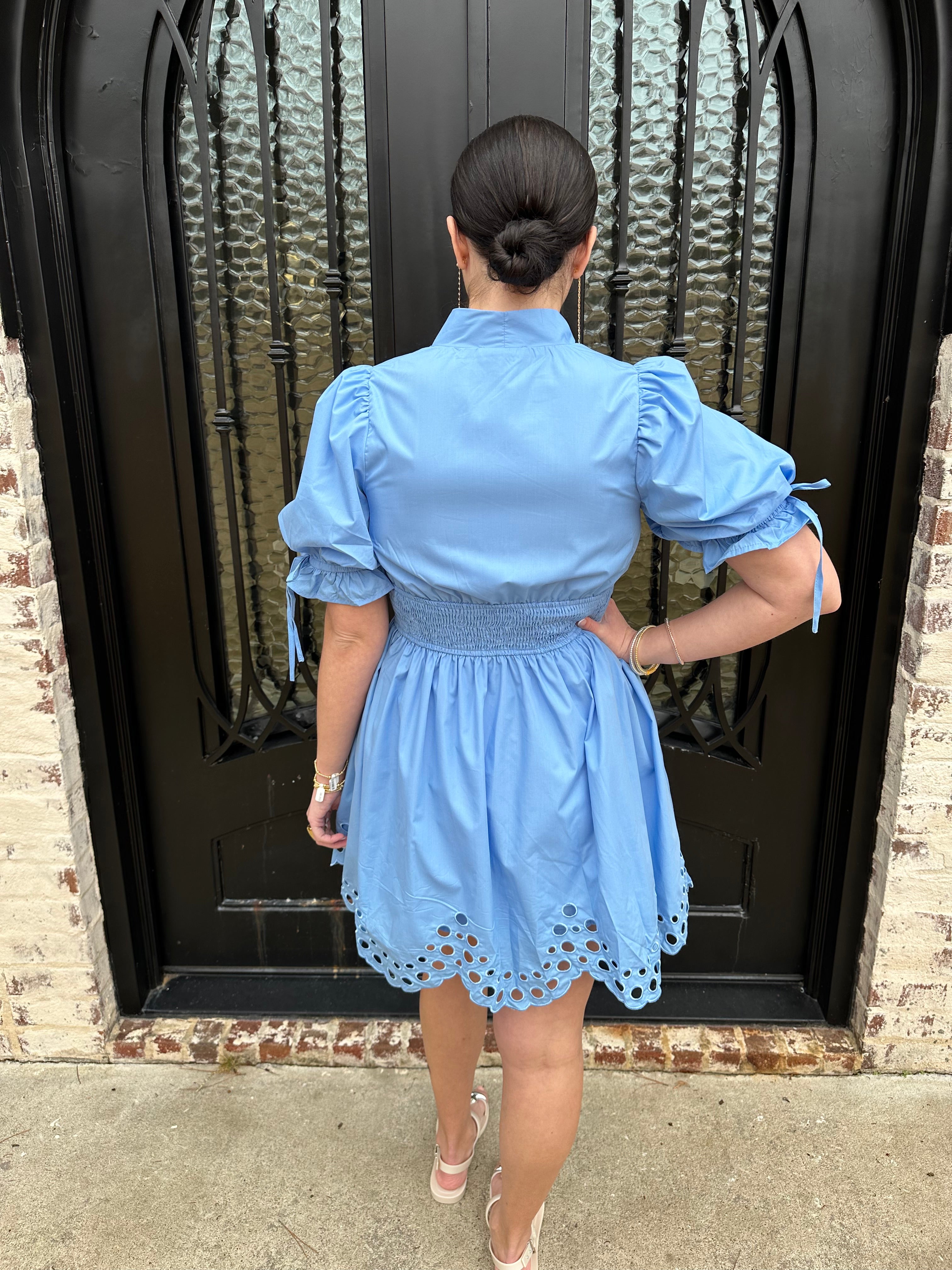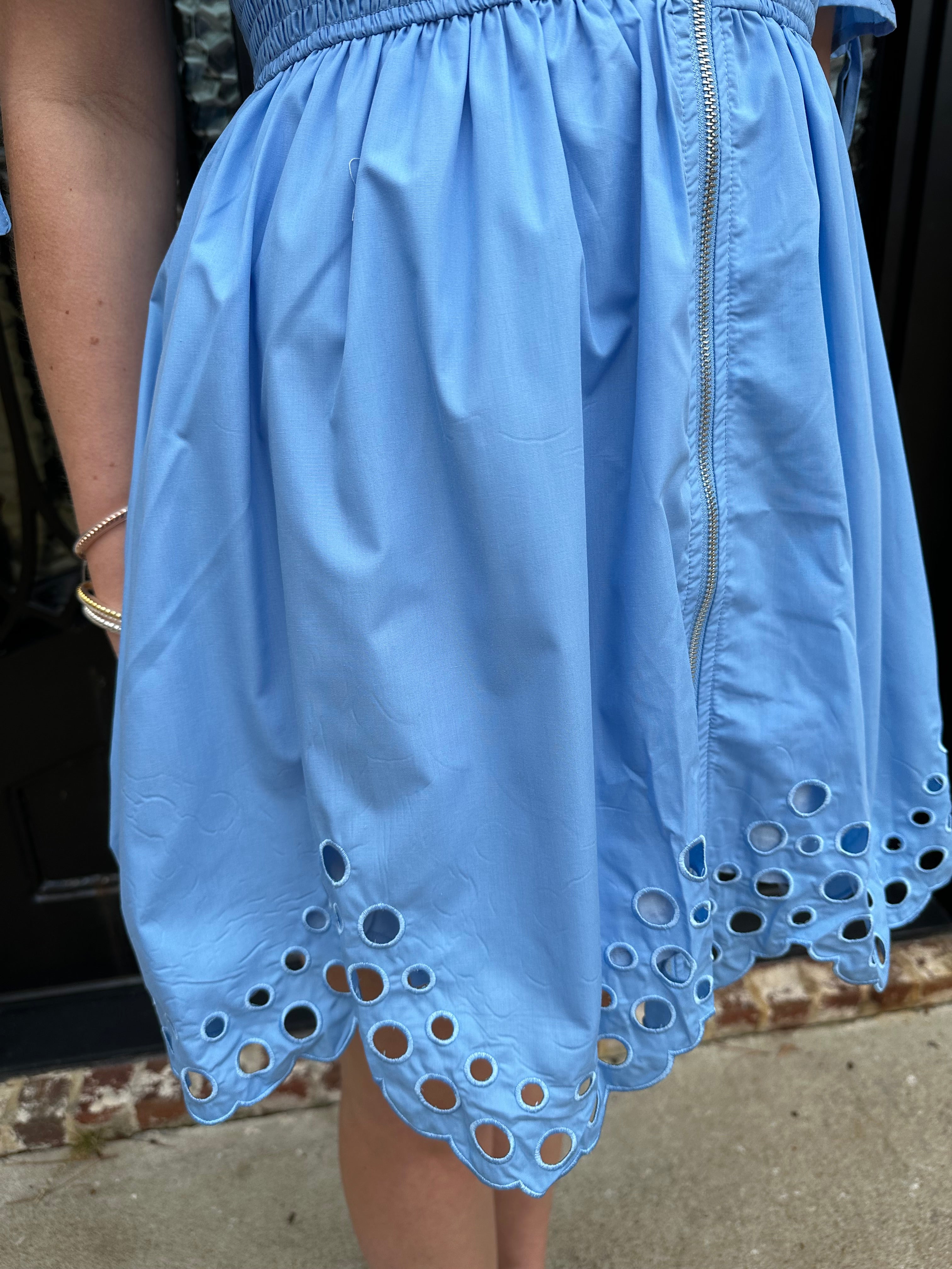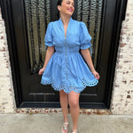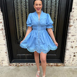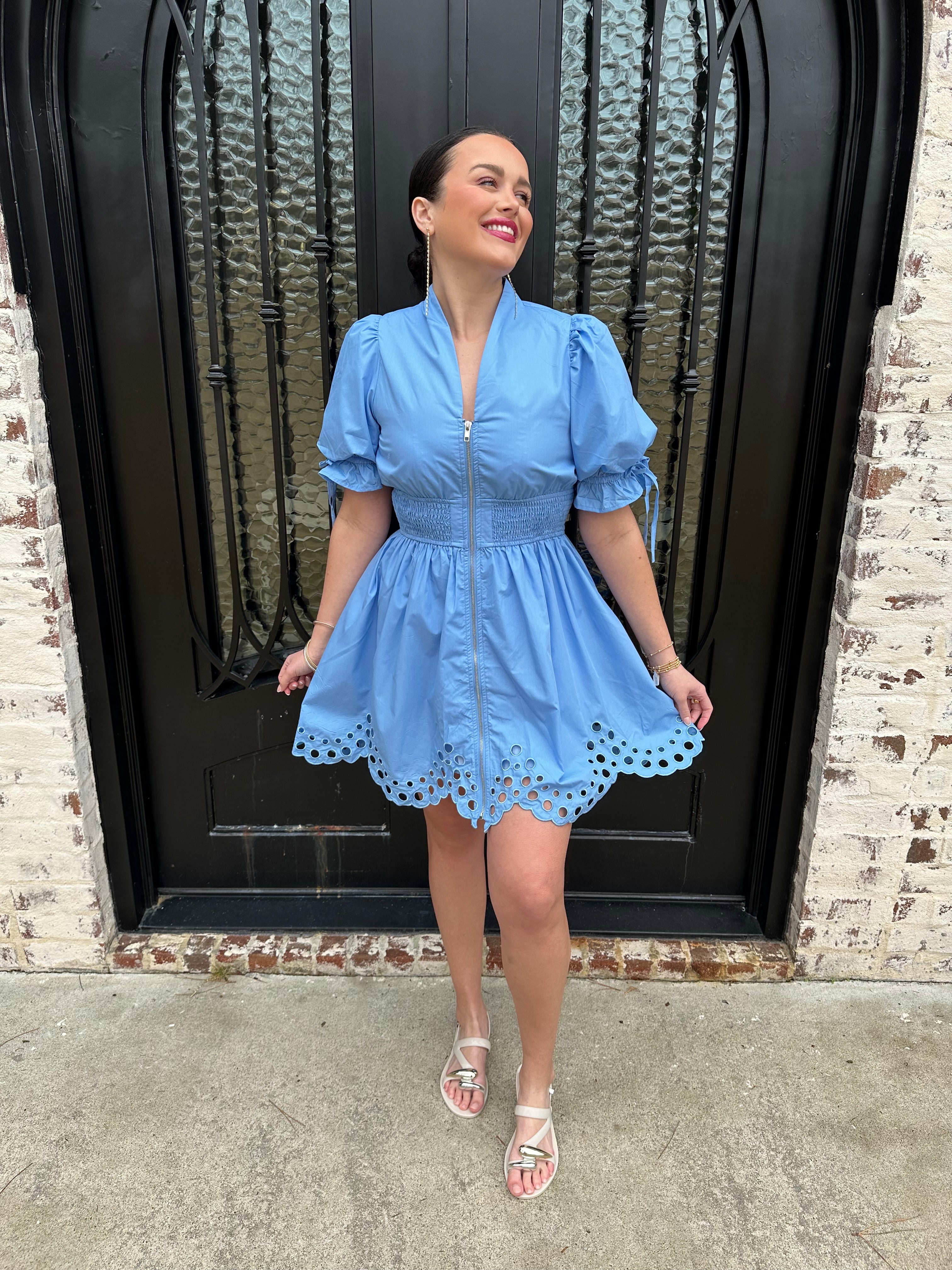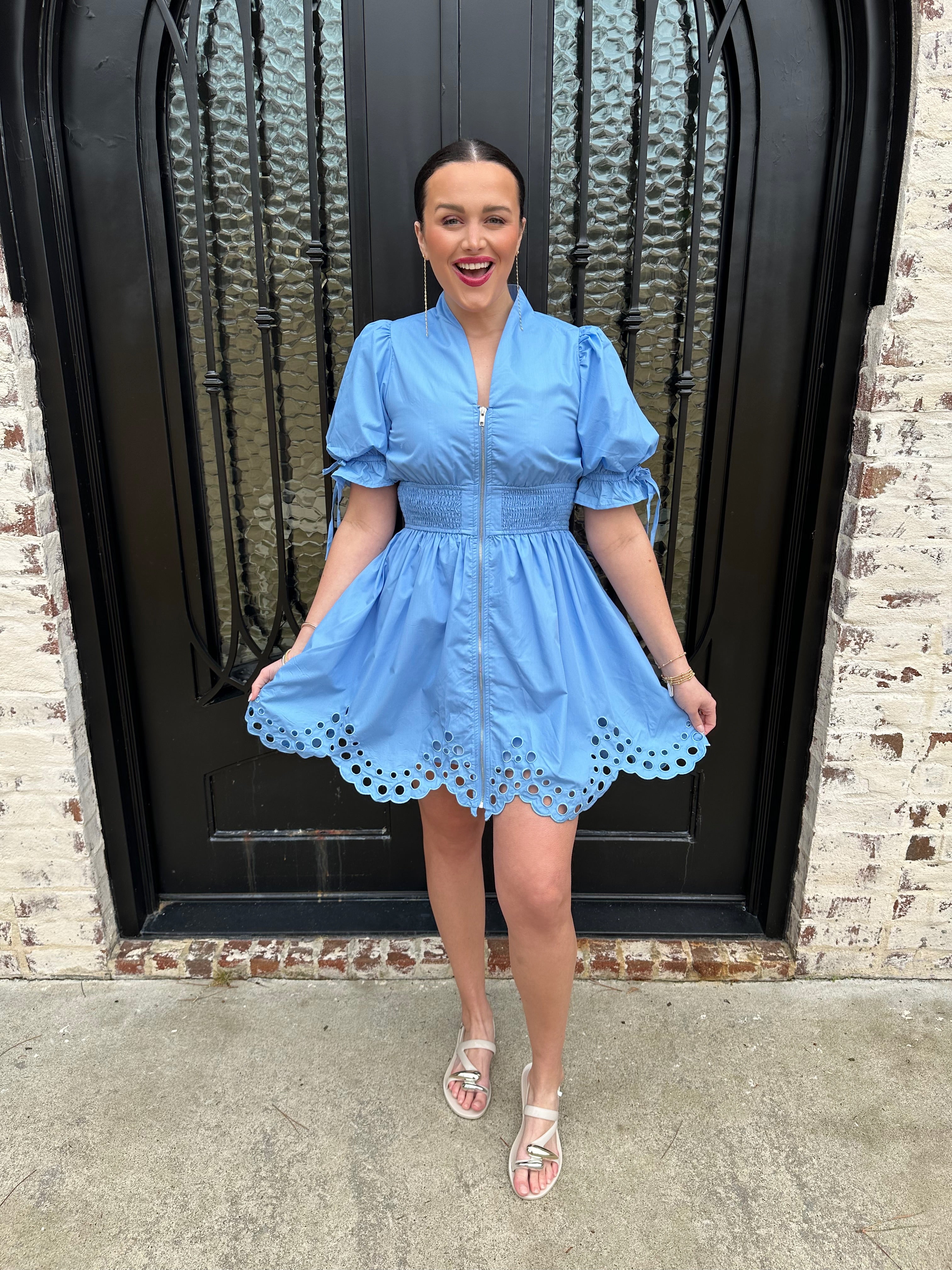 Meet the Jaqueline Dress in Blue—your answer to effortless warm-weather dressing. This captivating piece combines practical style with undeniable charm through its smocked zip-up bodice, which hugs in all the right places while offering convenient fastening. Statement puff sleeves bring movement and personality, while the delicate eyelet scalloped hem adds a touch of sophistication. Designed for spring and summer moments that matter, this dress works beautifully for everything from weekend getaways to special occasions.