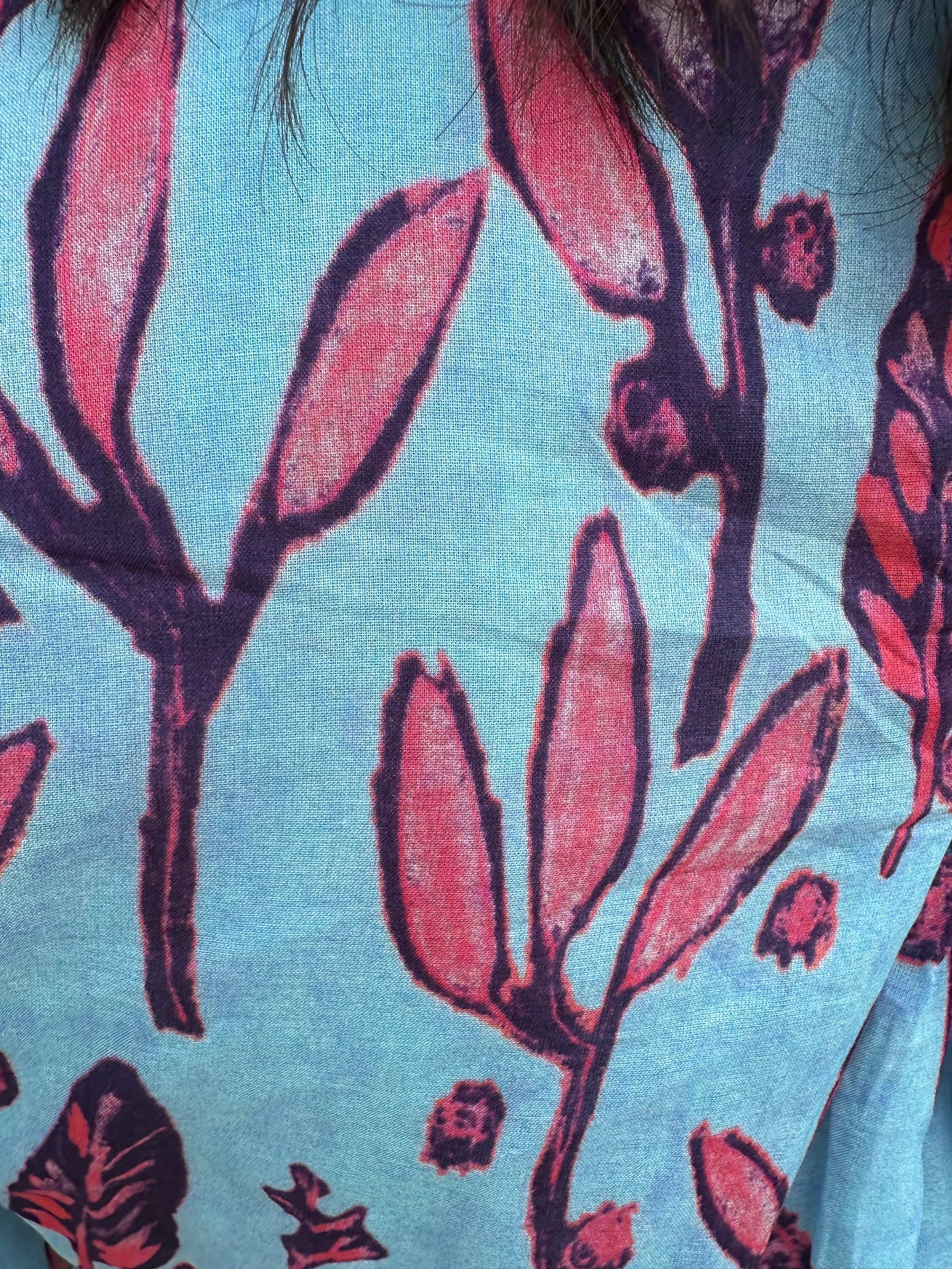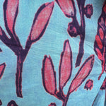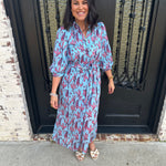 The Florina Floral Midi Dress features a blue fabric adorned with red floral accents, offering a visually appealing contrast. The short sleeves enhance comfort and breathability, making it suitable for warm weather. This dress combines style and functionality, ideal for various occasions.