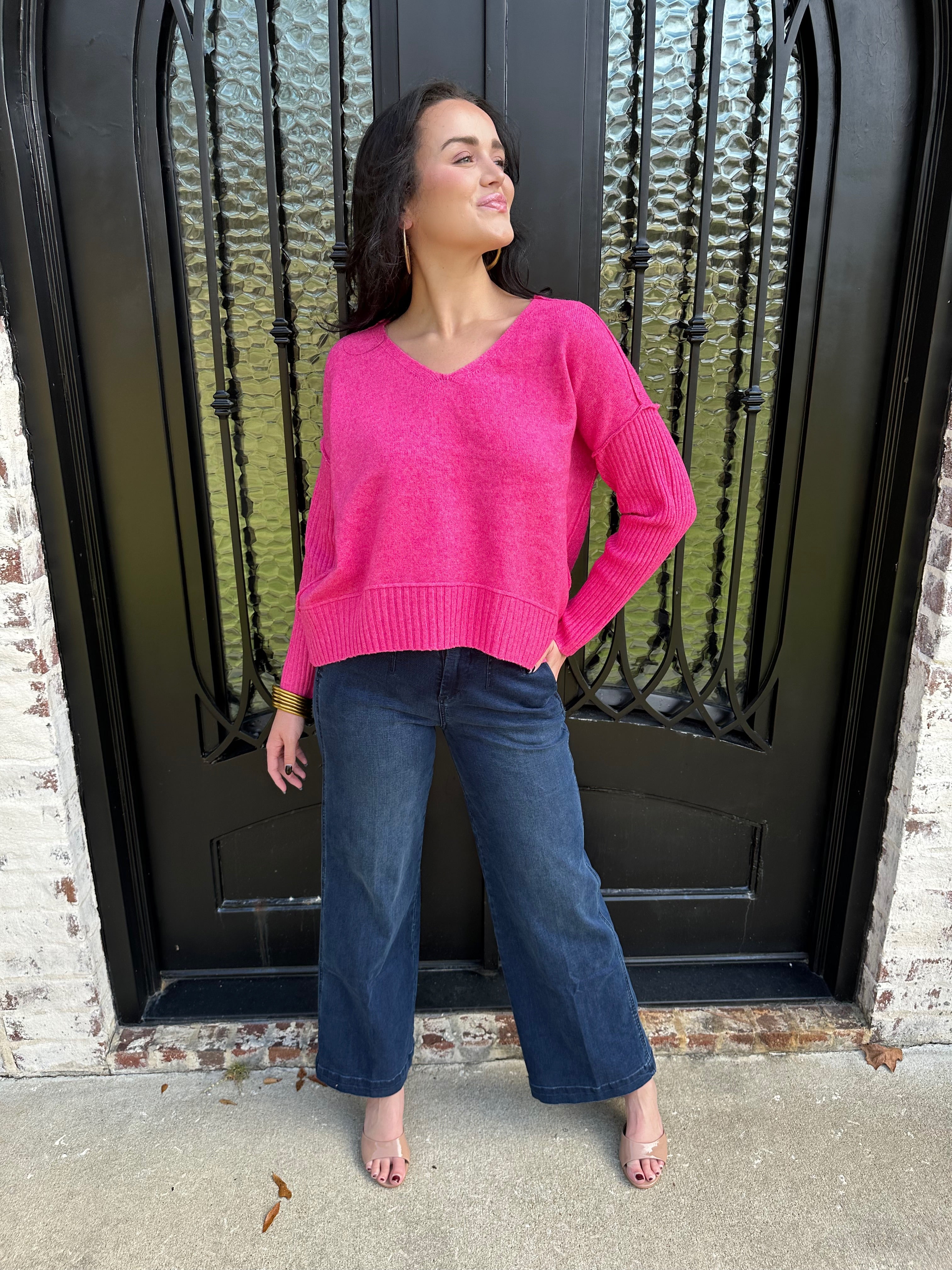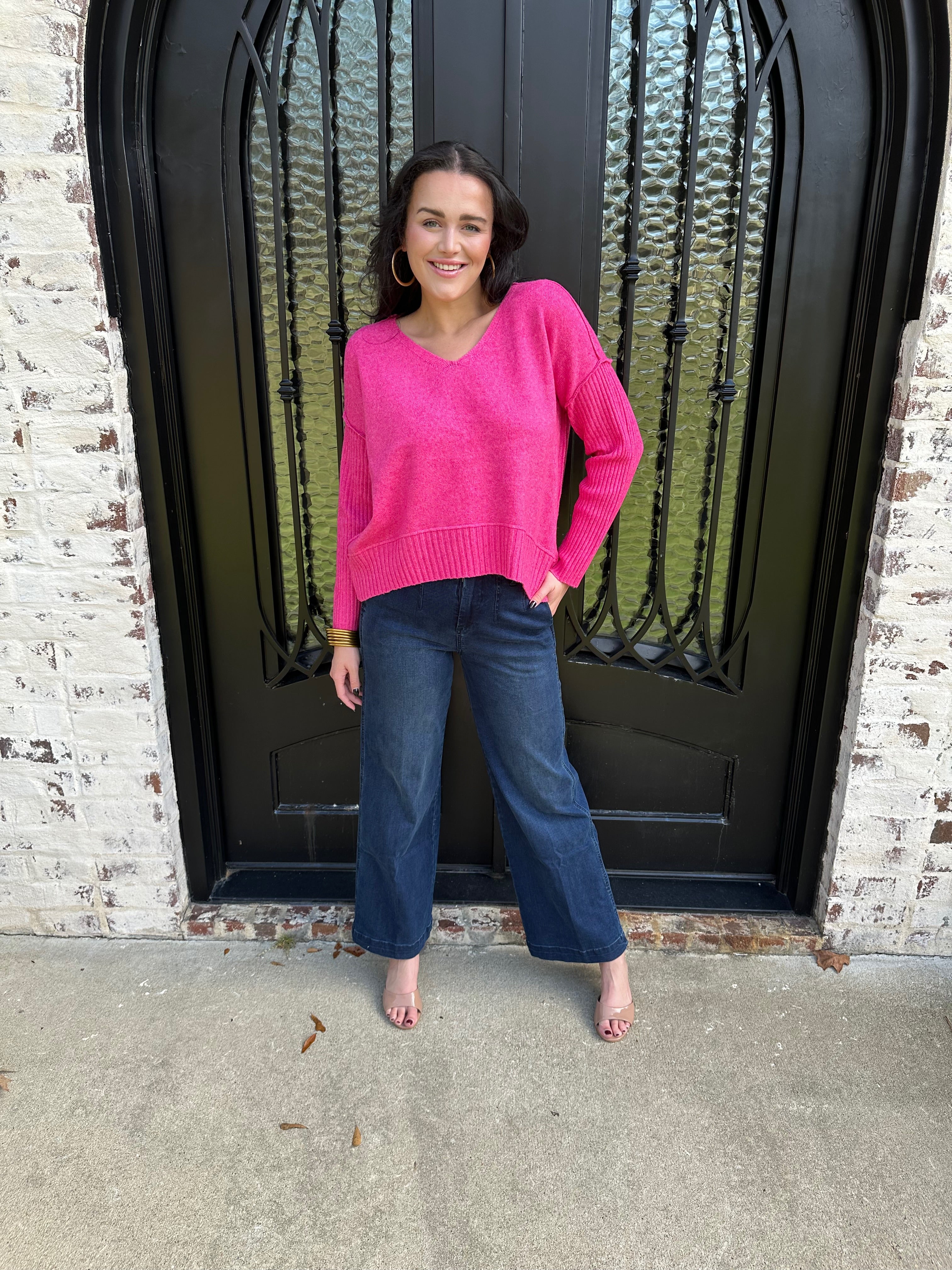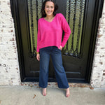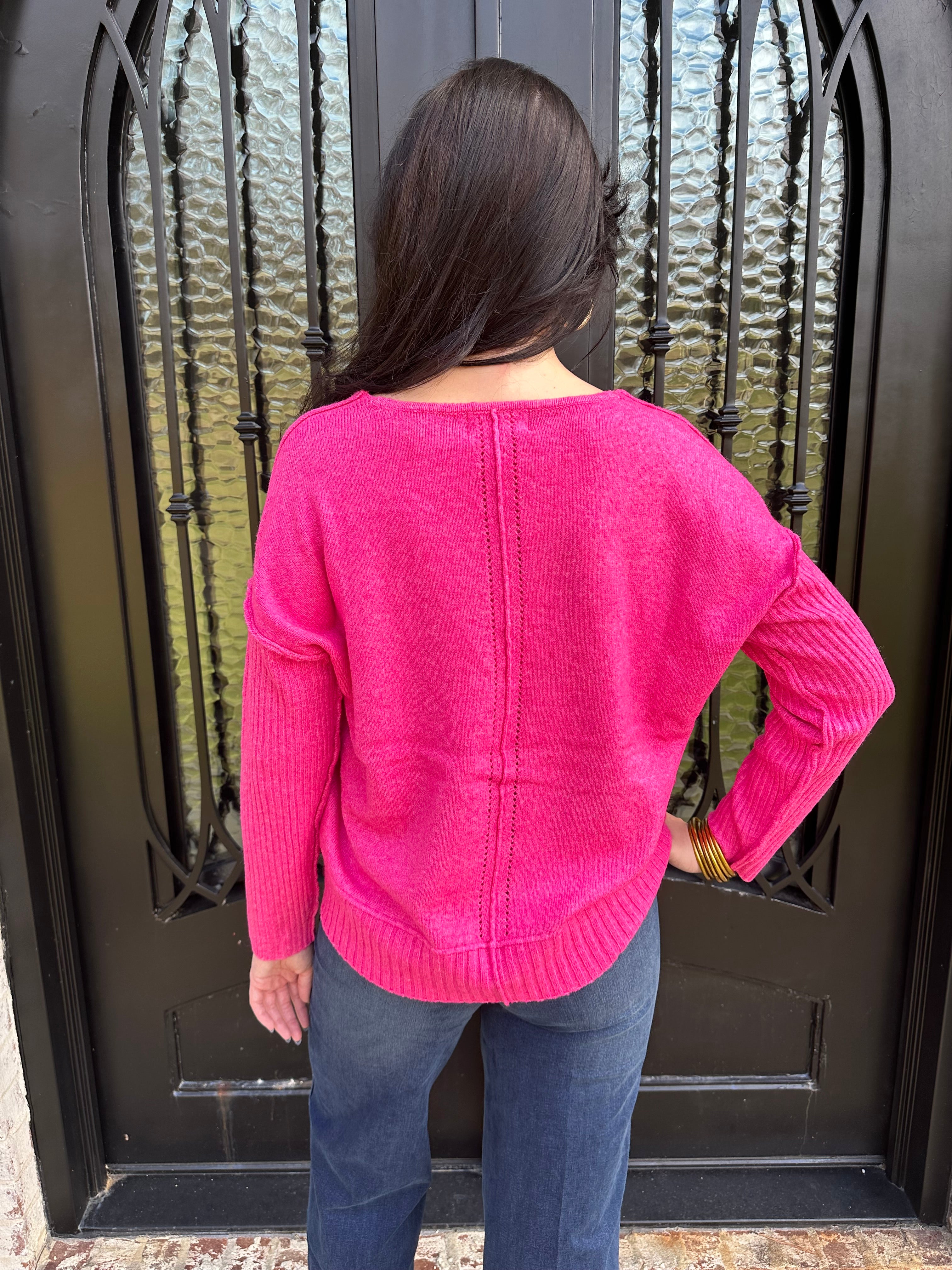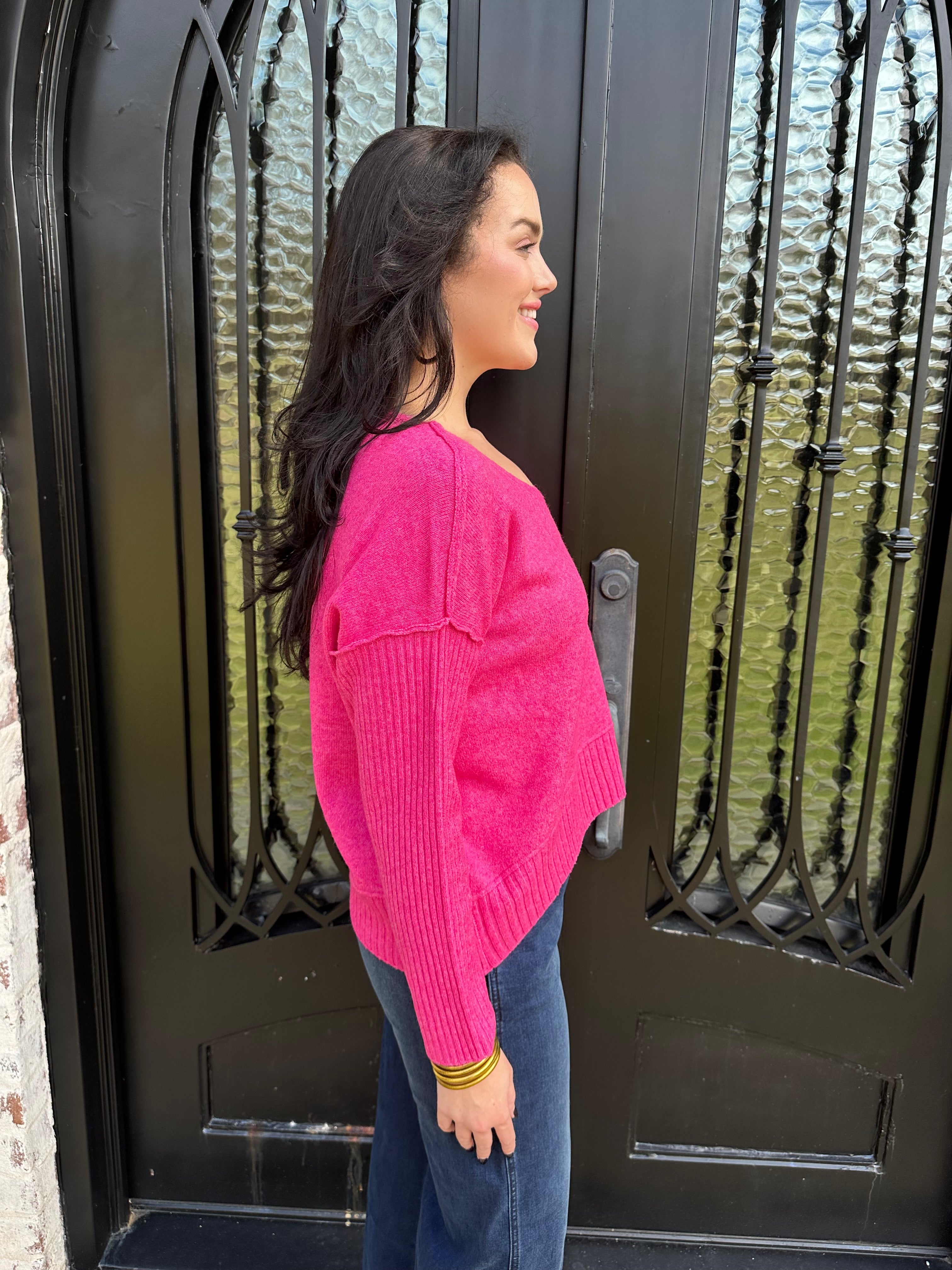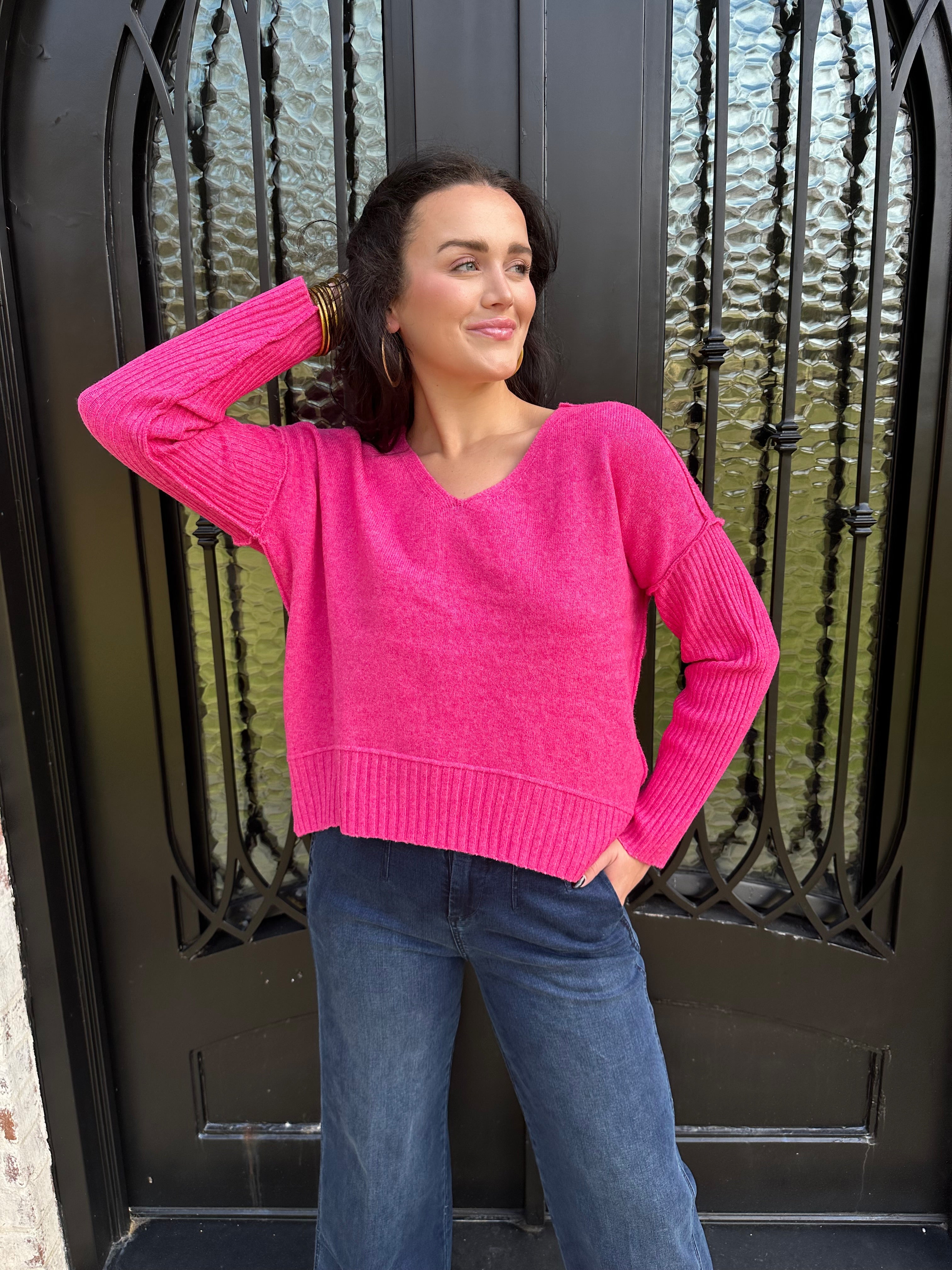 Cozy, soft, and effortlessly stylish, this vibrant pink knit brings the perfect blend of warmth and personality to your everyday wardrobe. Designed with a relaxed fit, ribbed sleeve detailing, and a flattering V-neckline, it’s the kind of sweater that looks just as good with denim as it does dressed up for a night out.