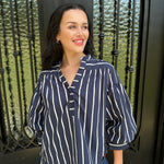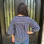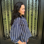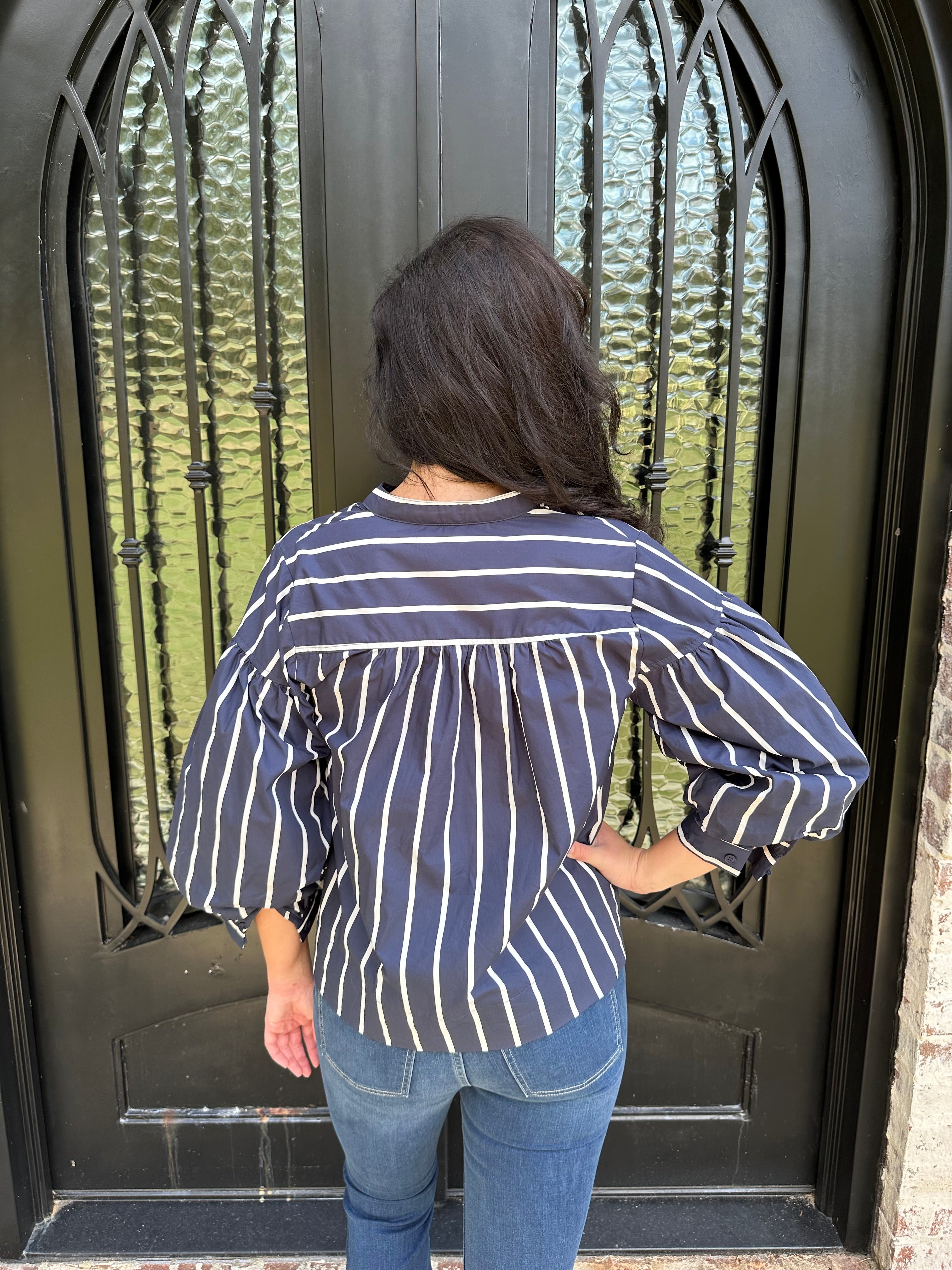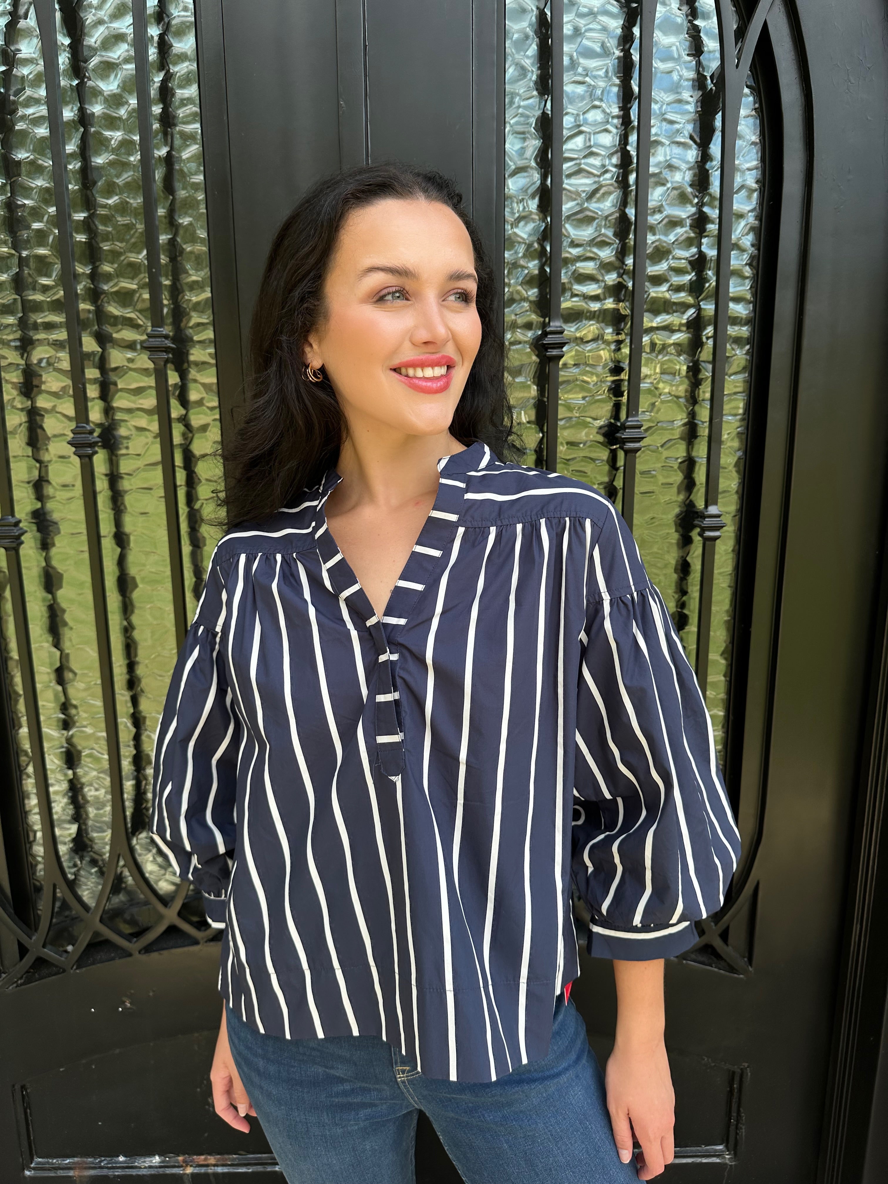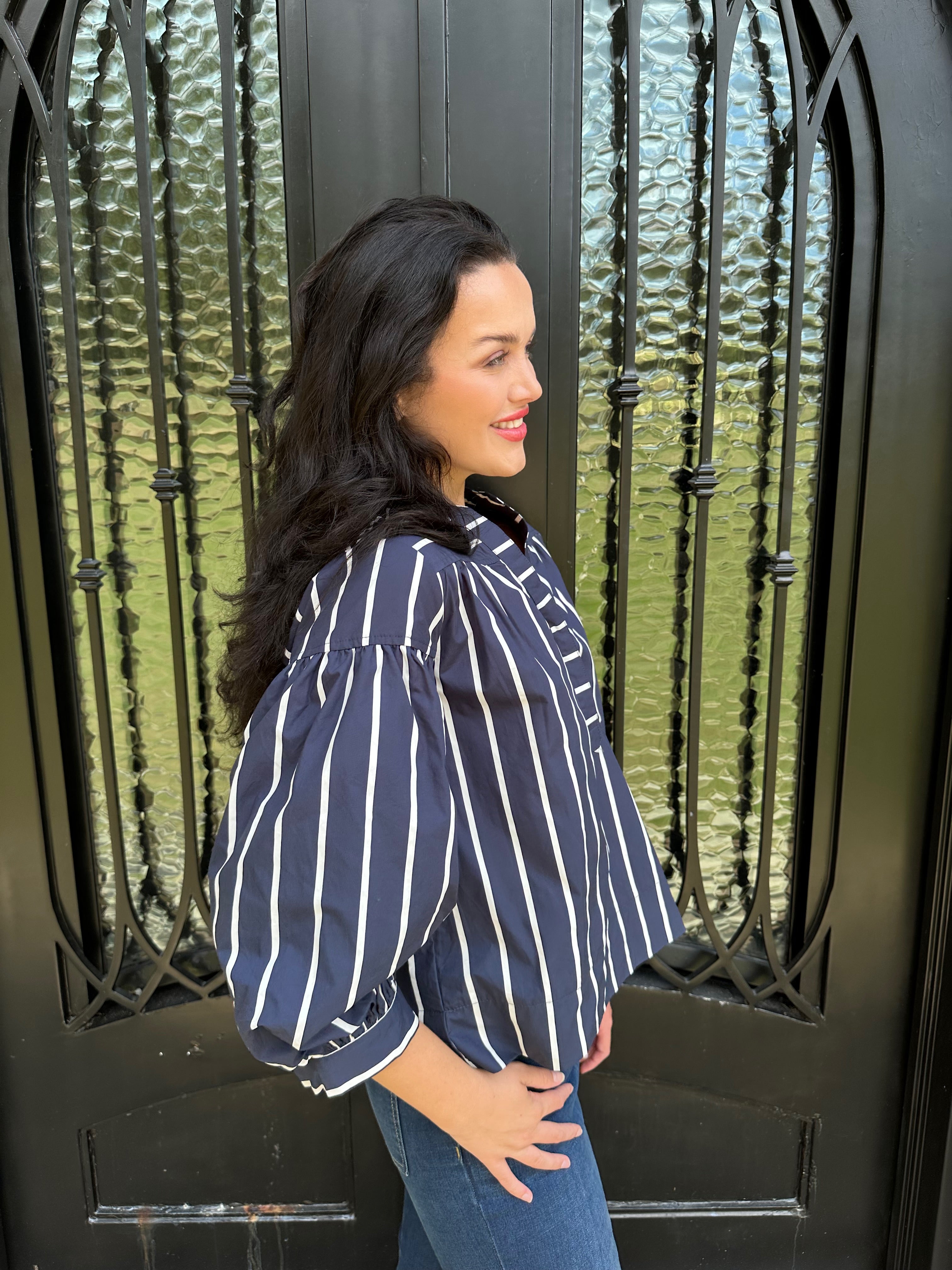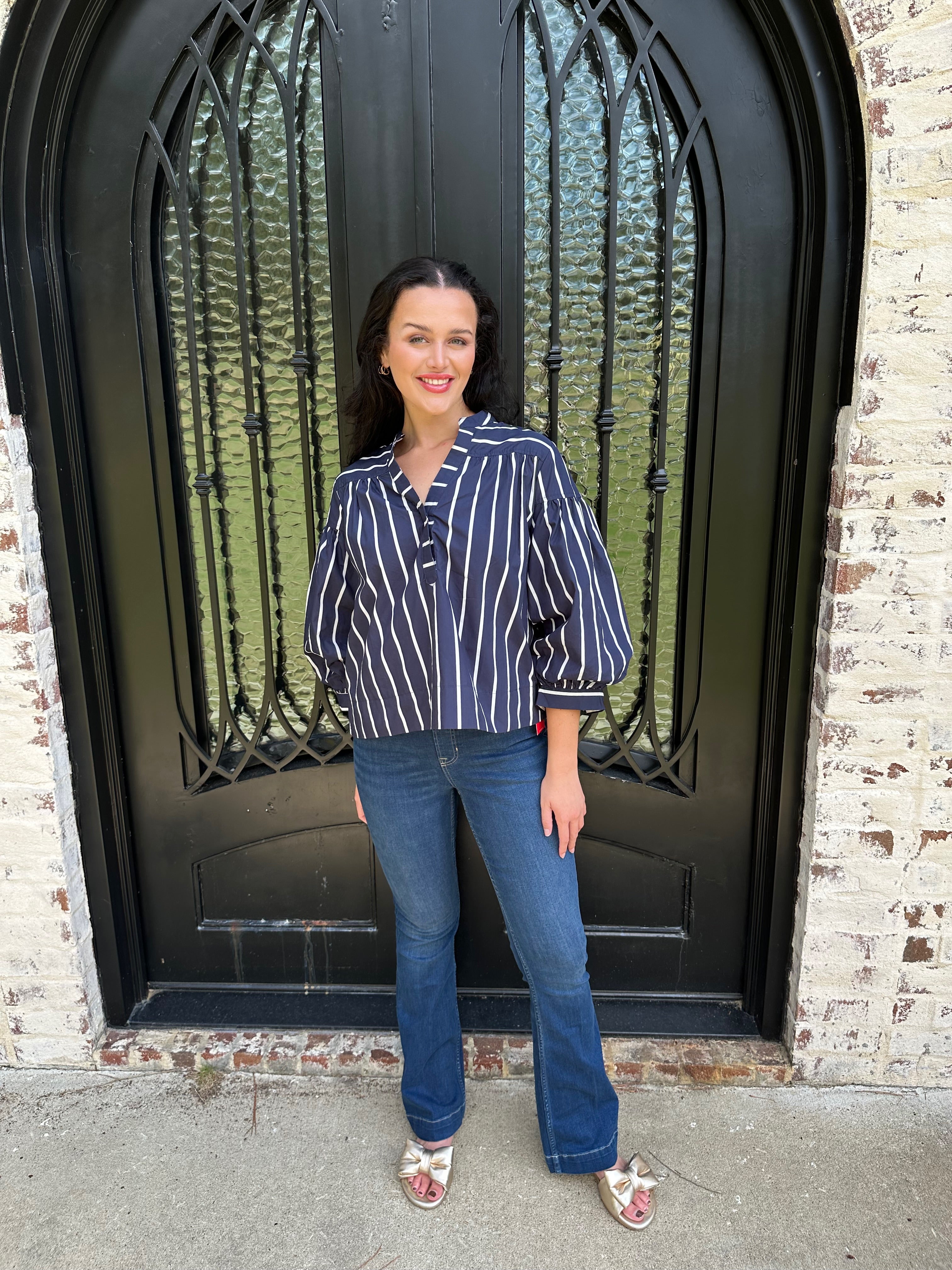 The Flemming Stripe Top in Navy combines elegant long puff sleeves with cuffs and a chic V-neckline for a timeless look. Its classic striped pattern pairs seamlessly with our Spanx flare jeans in Poseidon, creating a stylish outfit perfect for school events, dinners, parties, and casual get-togethers. This combination offers both comfort and sophistication, ensuring you look effortlessly polished at every occasion.