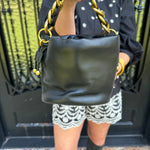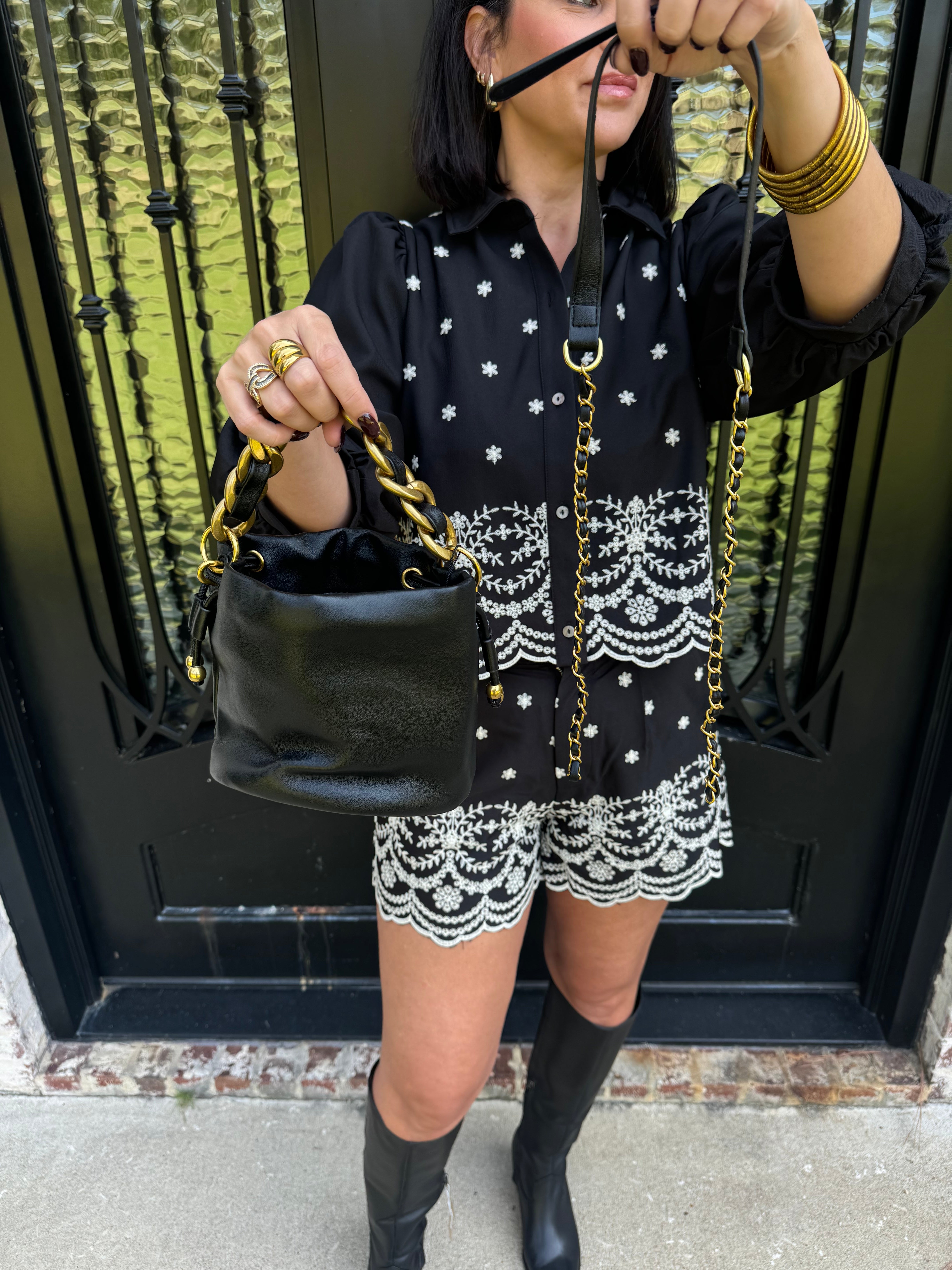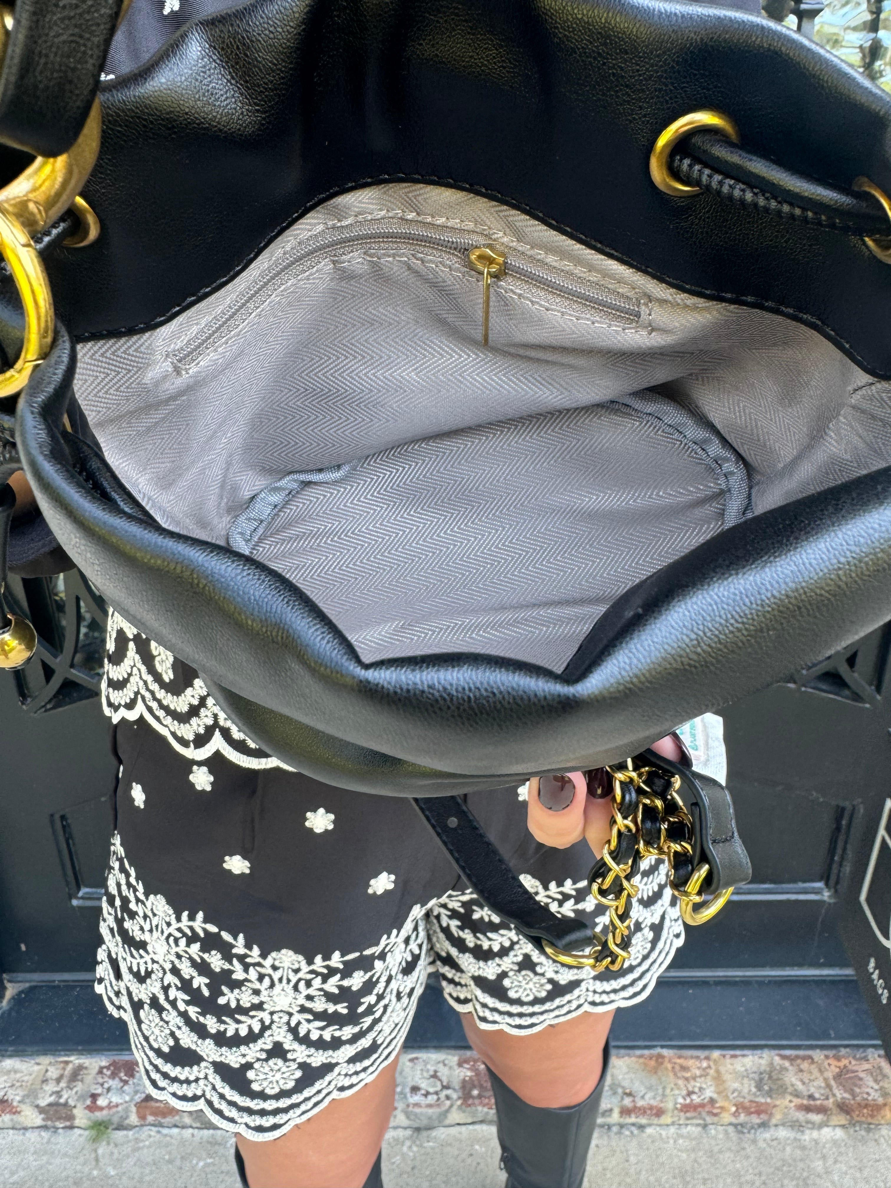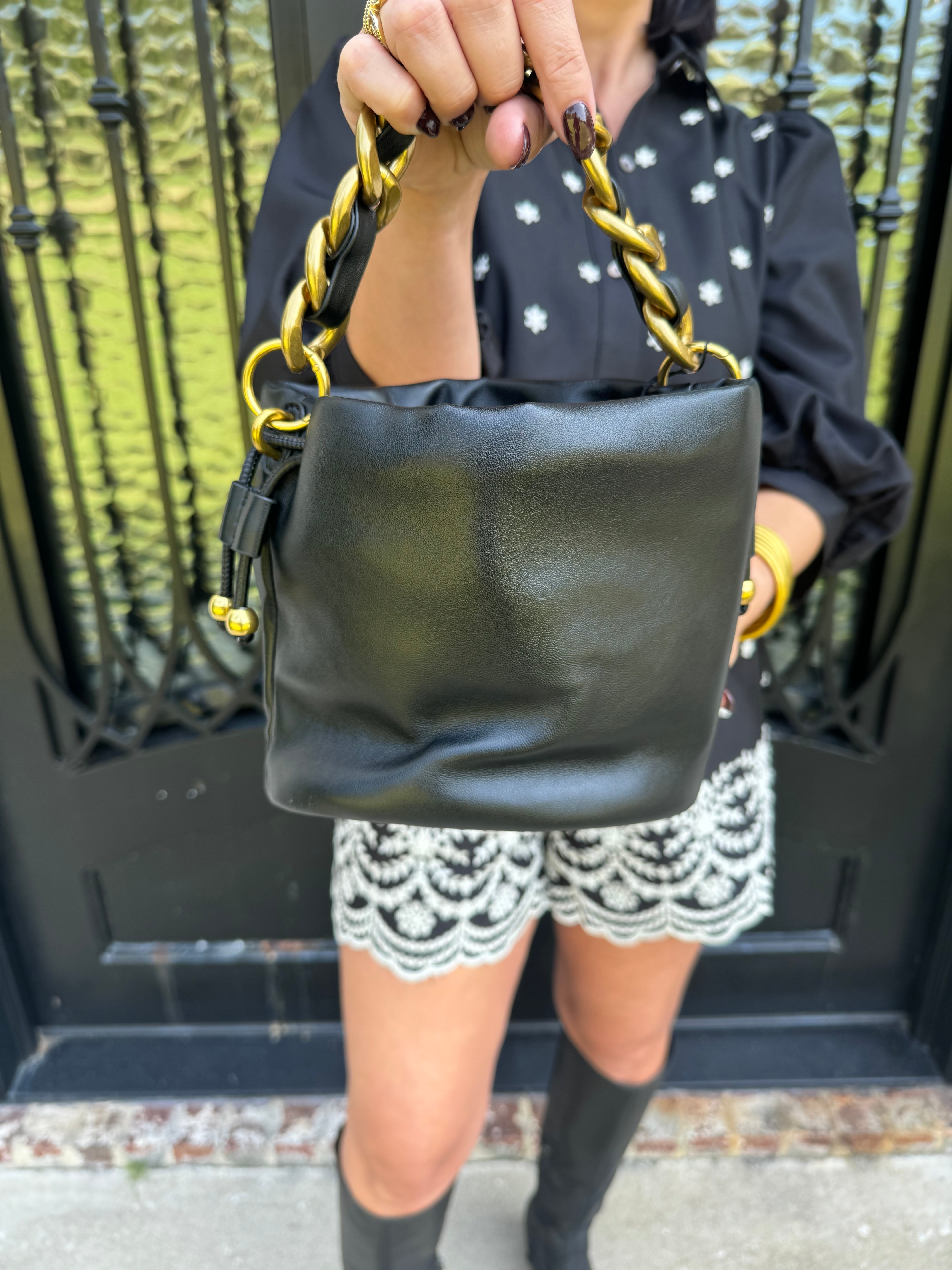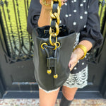 Elevate your style with this Gold Chain Bucket Purse in Black. Its sleek, versatile design pairs effortlessly with any outfit, while the sturdy gold chain adds a touch of luxury. Spacious yet compact, it keeps your essentials organized and within reach, perfect for day-to-night wear. Make a statement with a purse that combines elegance and practicality seamlessly.