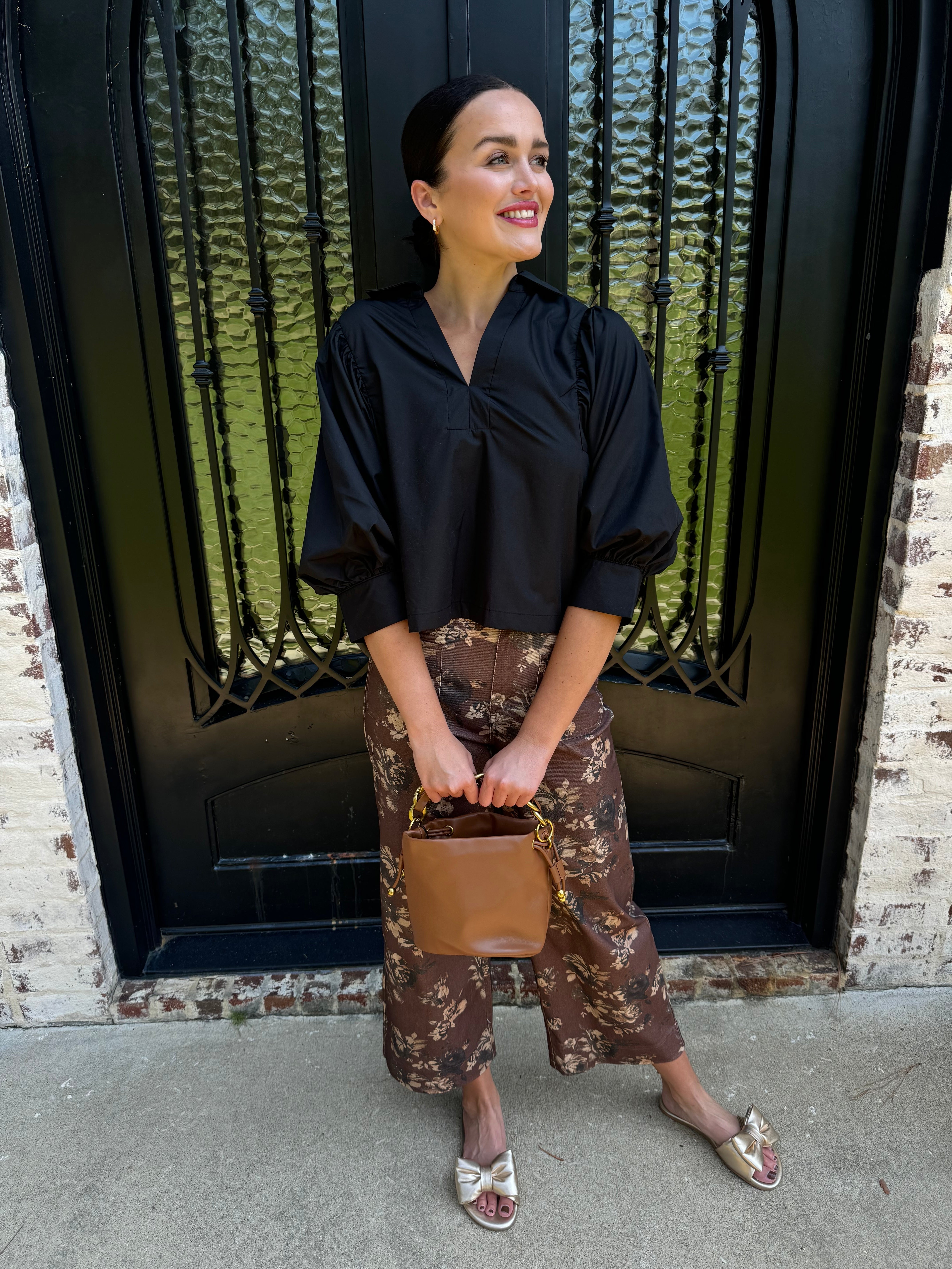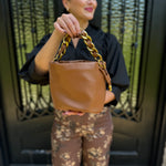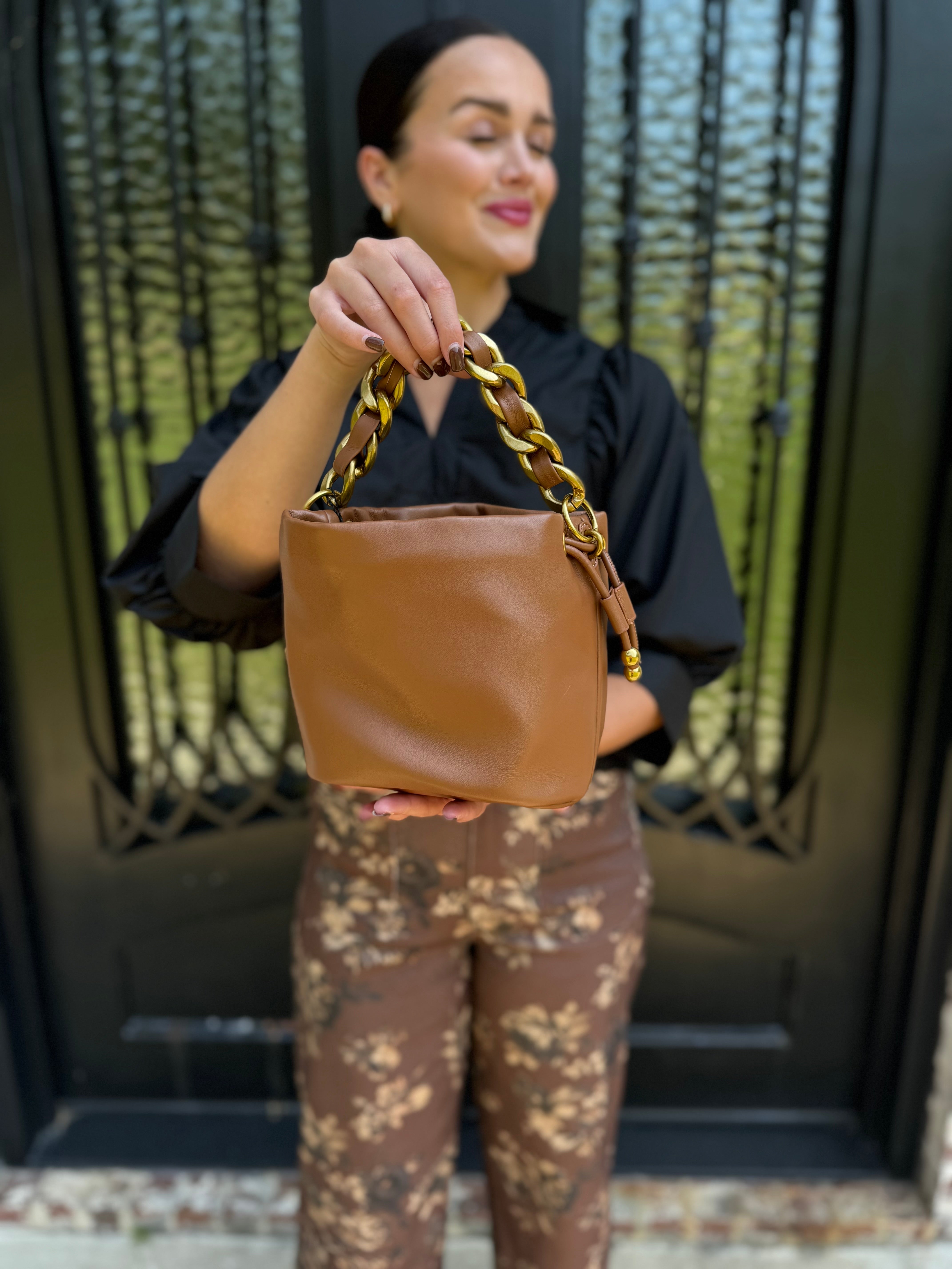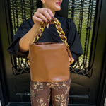 Elevate your style with this Gold Chain Bucket Purse in Chocolate. Its sleek, versatile design pairs effortlessly with any outfit, while the sturdy gold chain adds a touch of luxury. Spacious yet compact, it keeps your essentials organized and within reach, perfect for day-to-night wear. Make a statement with a purse that combines elegance and practicality seamlessly.