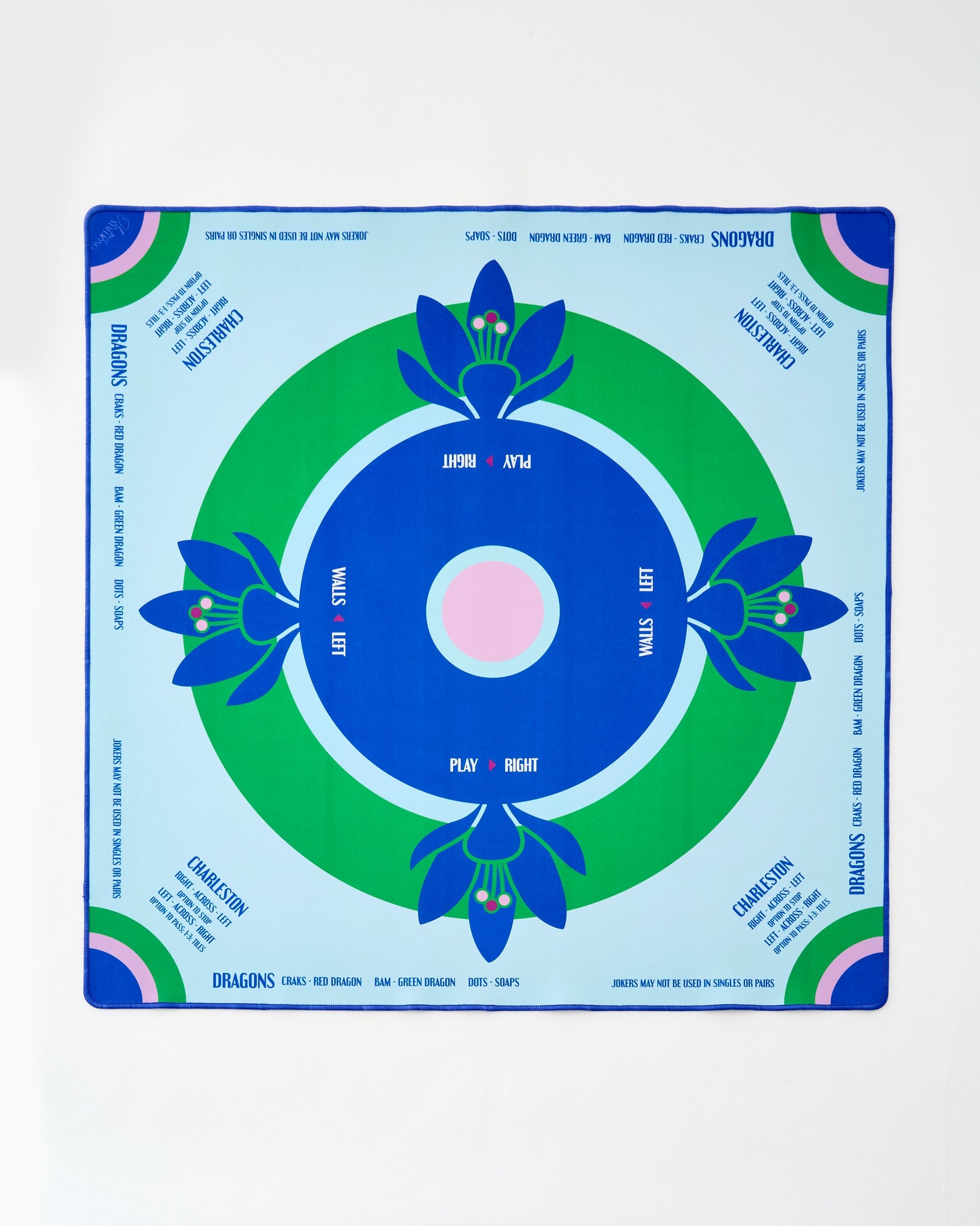 The perfect addition to your game night shenanigans! Not only does this mat scream style with its preppy color scheme, but it's also super functional. Featuring a non-slip surface, it ensures your tiles stay put as you play like a seasoned pro. Plus, it includes essential rules for American Mahjong, covering everything from directions of The Charleston, suit and dragon pairings, gameplay and wall direction and the pesky no jokers in a pair rule.