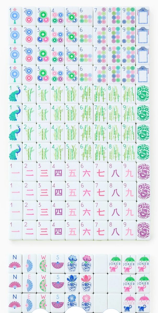 Set includes Tiles, Dice/Coin Bag and 4 Instructional Cards (If playing American Mahjong, will need to purchase NMJL Playing Card separately.