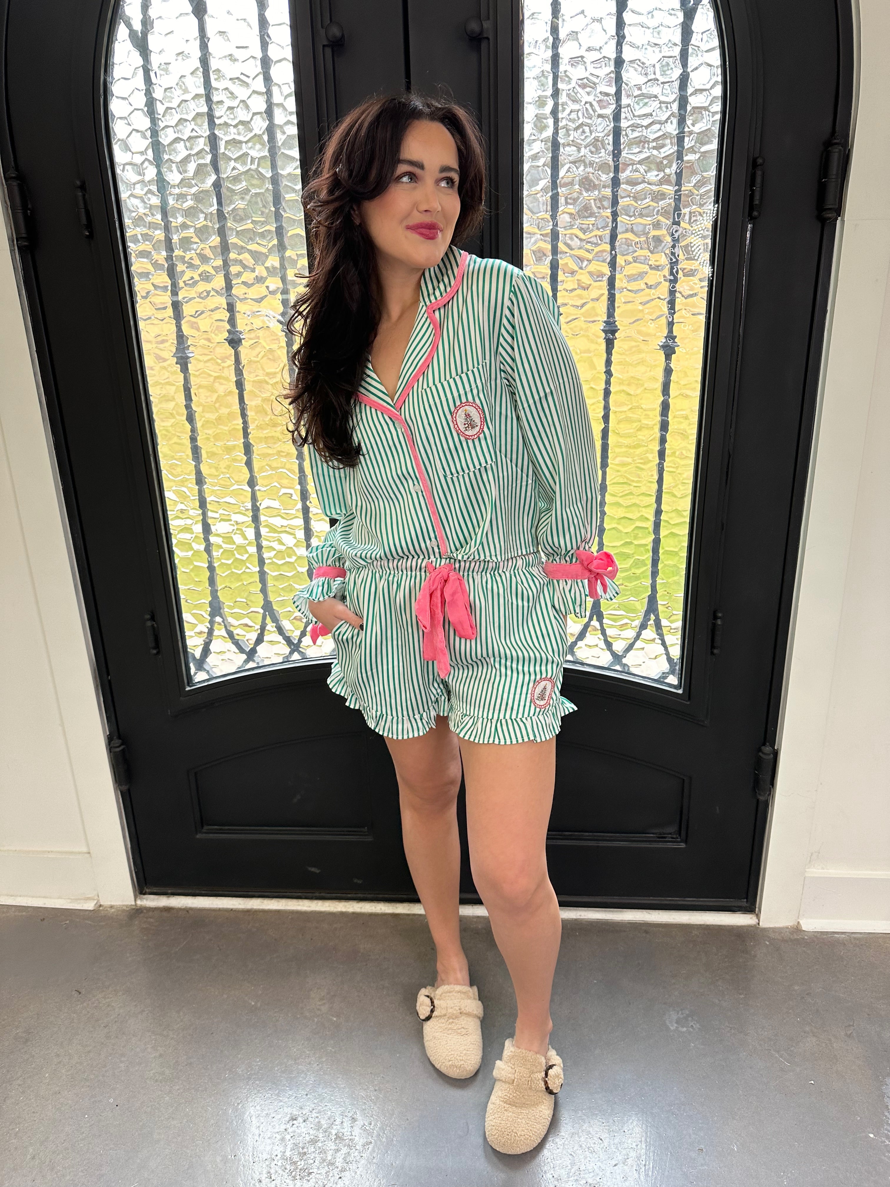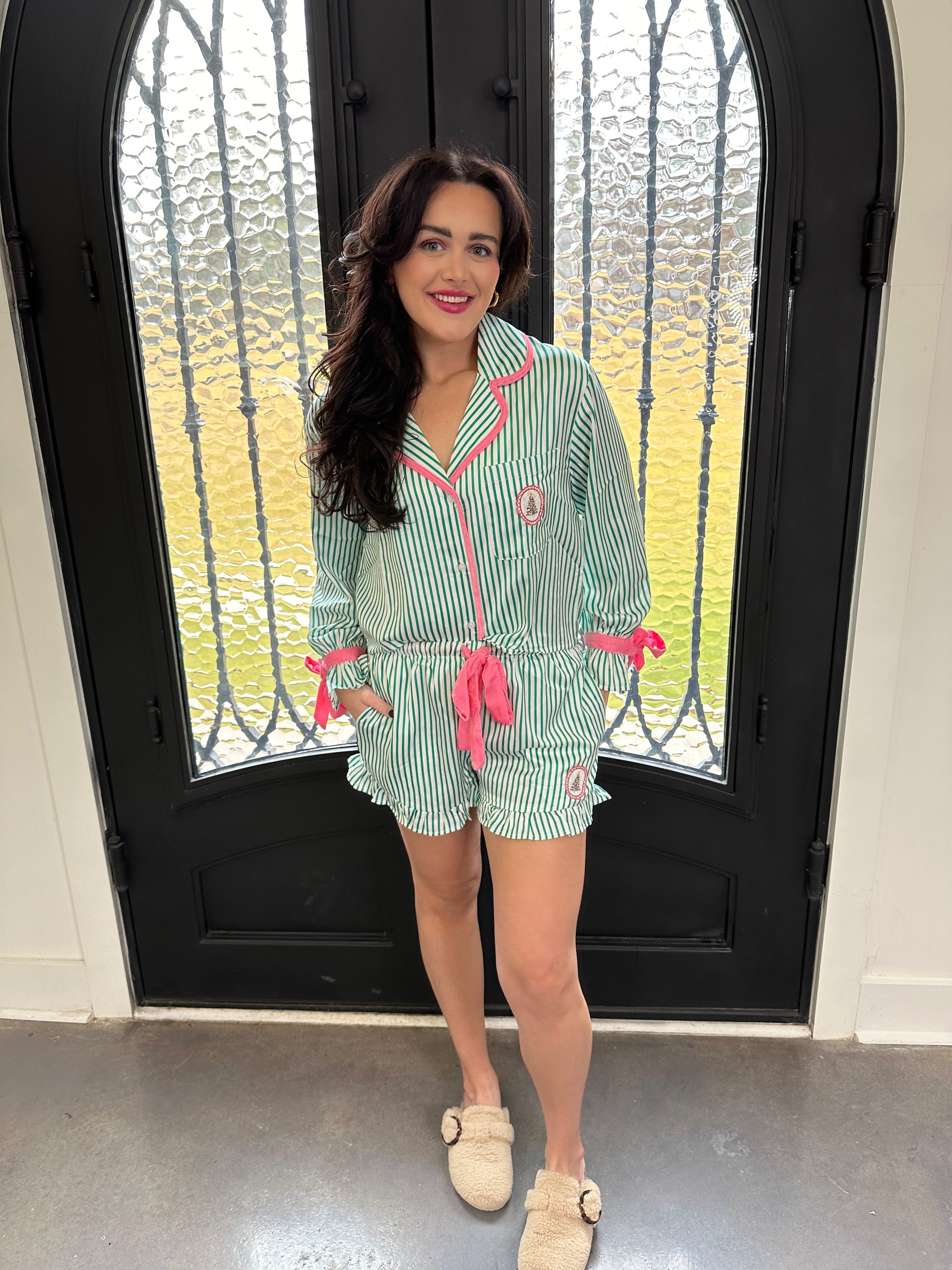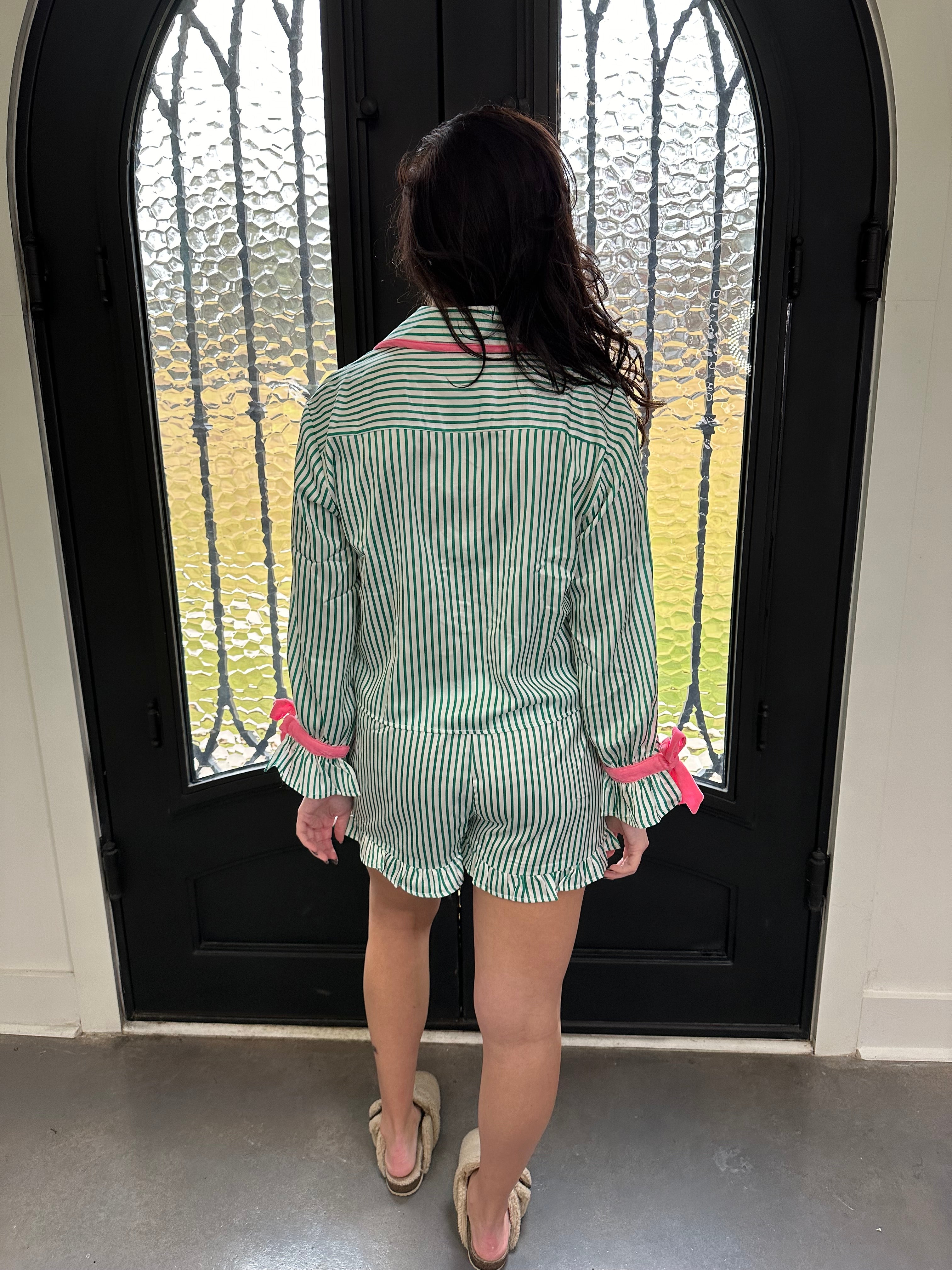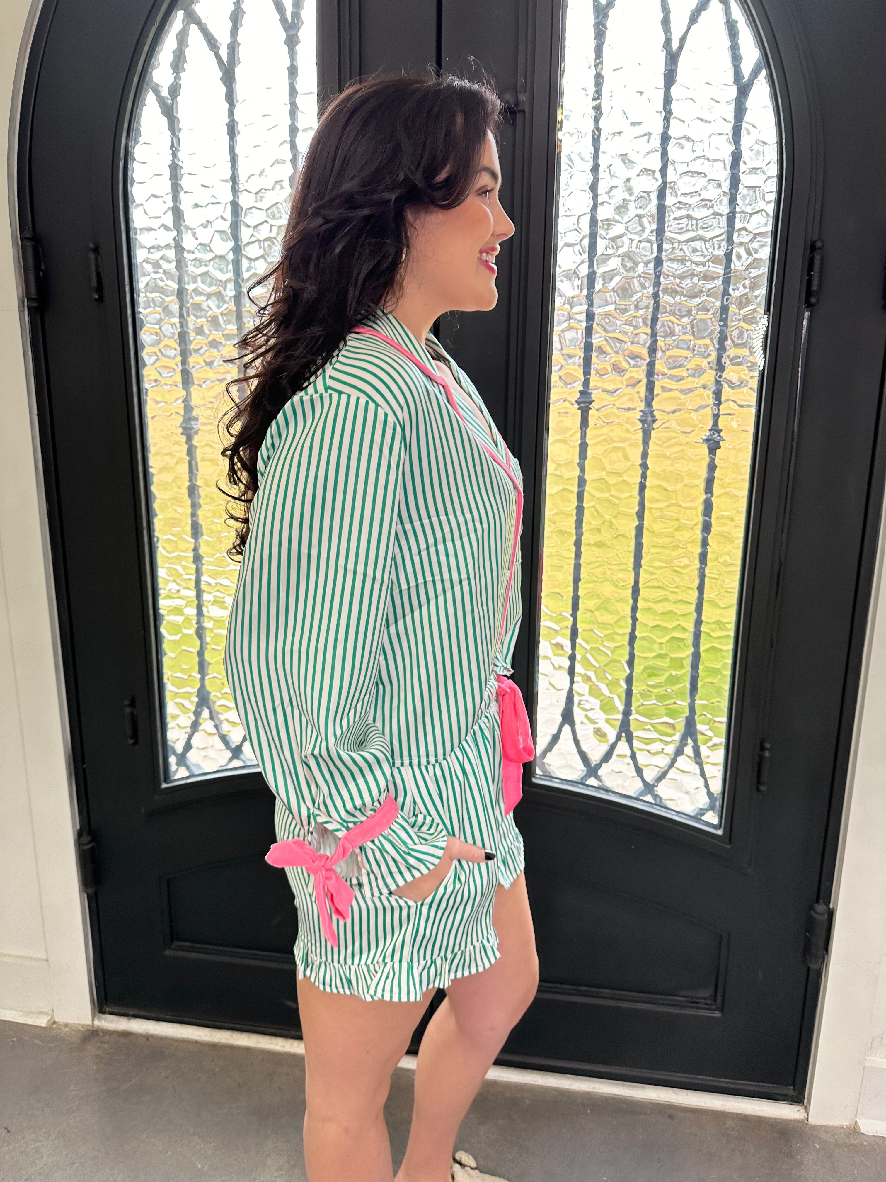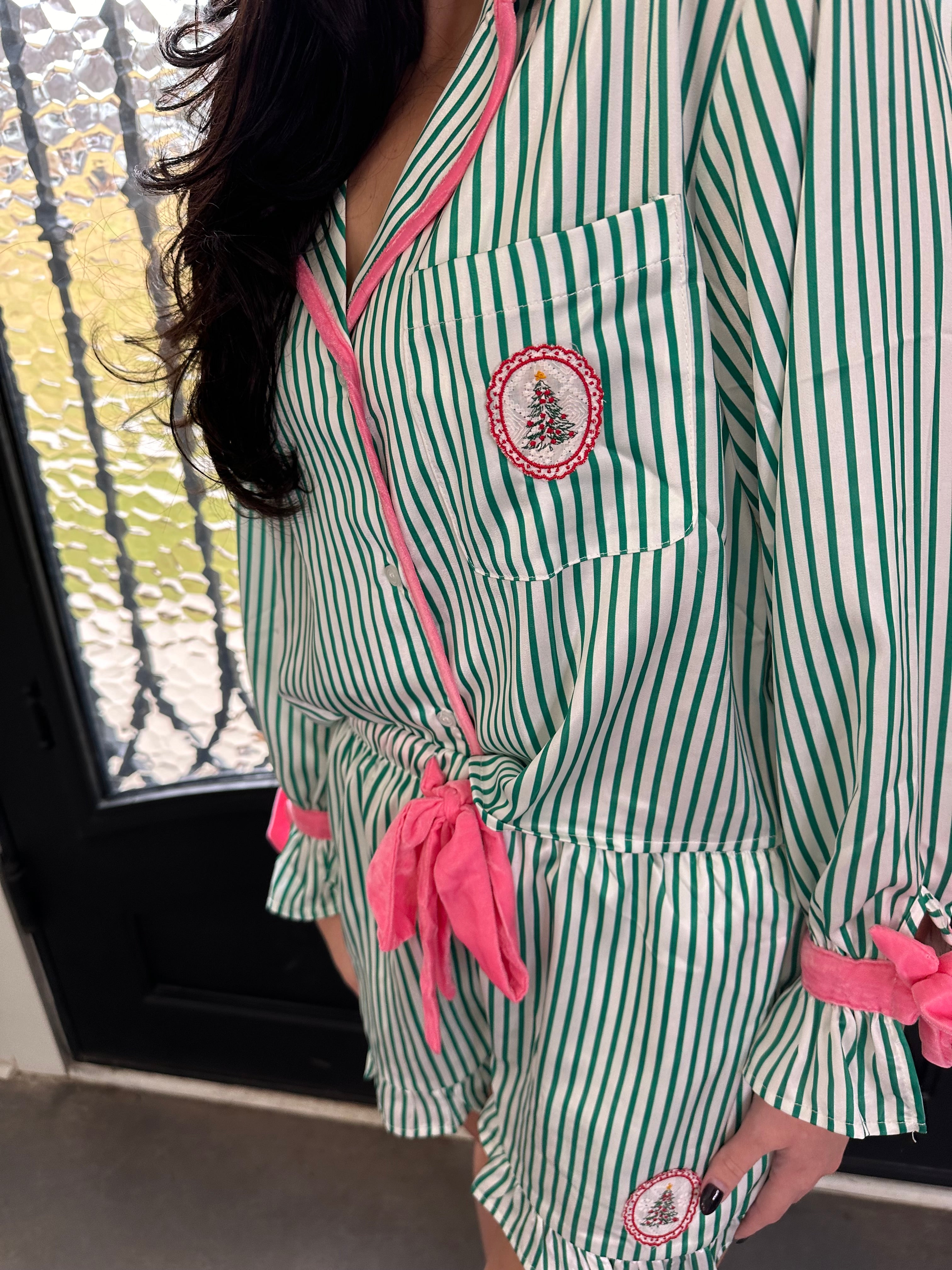 Green & Pink Stripe Christmas Pajama Set in Kelly Green