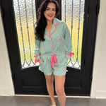 Get into the holiday spirit with this stunning Green & Pink Stripe Christmas Pajama Set featuring rich kelly green tones. The playful pink striping adds a modern twist to traditional seasonal wear, making it perfect for anyone seeking comfort with personality. Ideal for Christmas morning traditions, cozy nights in, or festive family photos, this set combines softness with style. The flattering fit and quality construction mean you'll reach for it again and again throughout the season. Treat yourself or surprise a loved one with pajamas that capture the warmth and joy of the holidays in every wear.