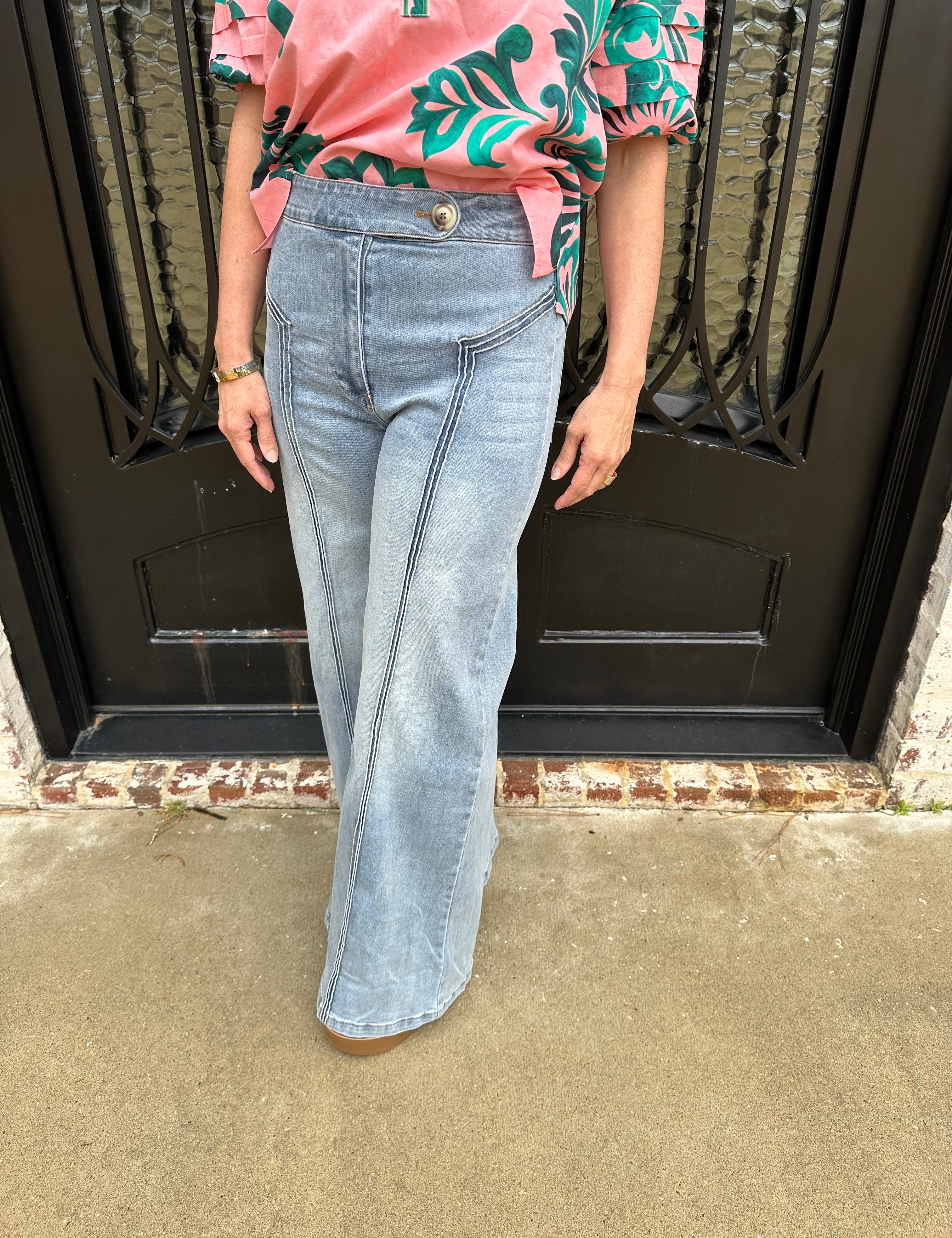 Pleated Side Gusset Wide Leg Jeans