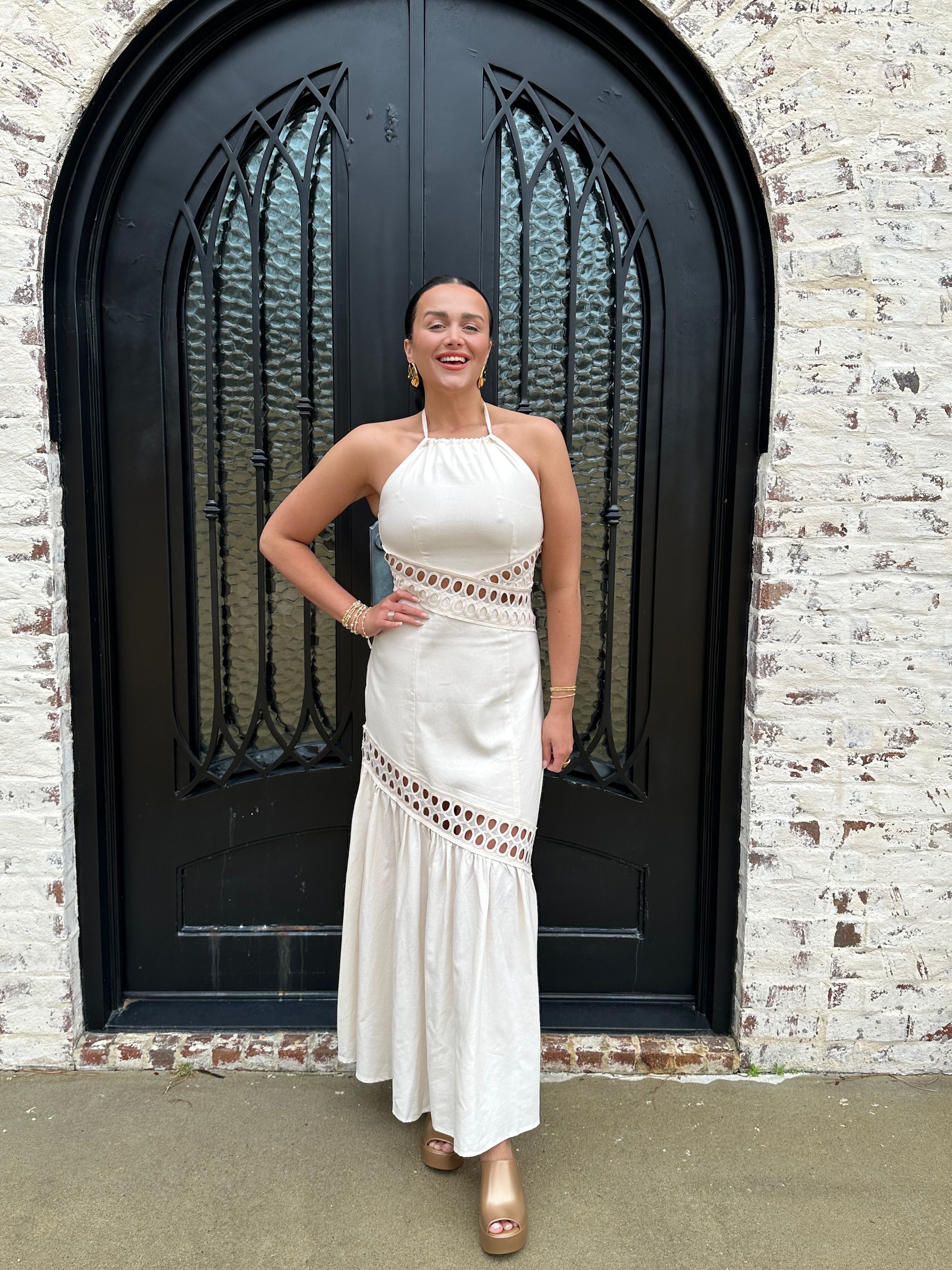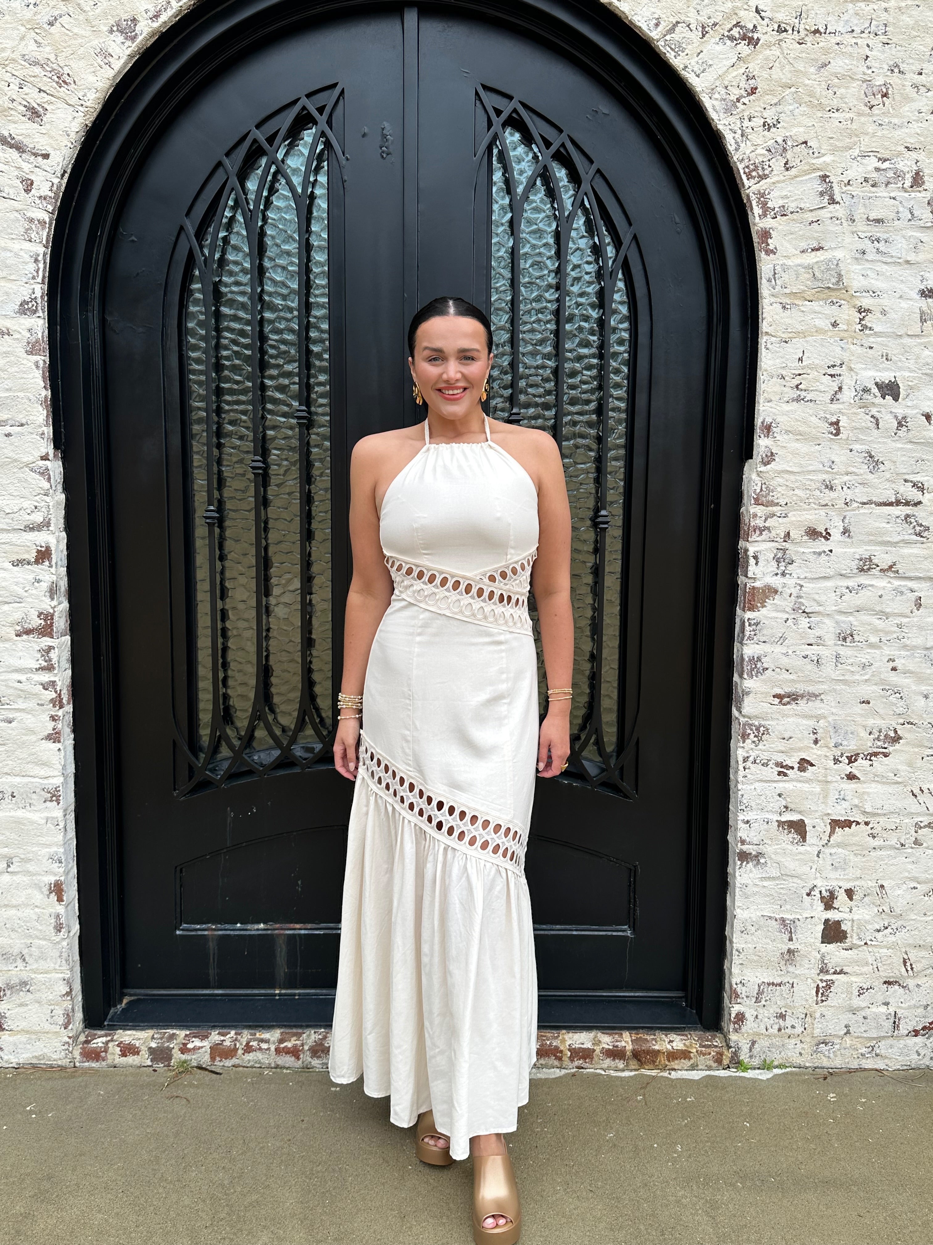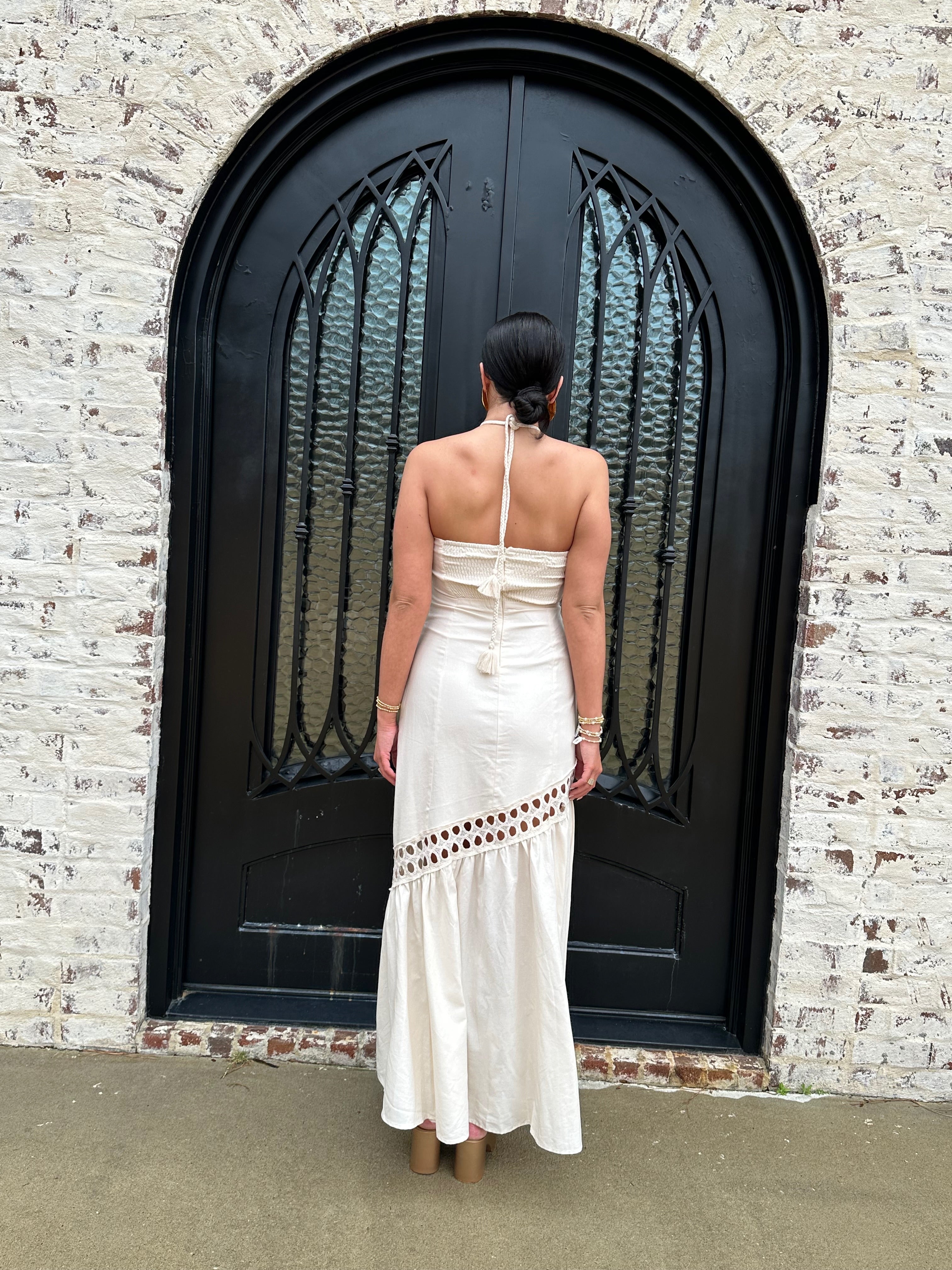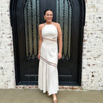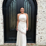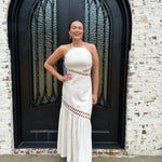 The Brendon Maxi Dress is your go-to for stunning spring and summer escapes! Embrace its ecru hue and flirty see-through design, creating an effortlessly chic look. The halter neck tie and flattering smocking offer comfort and style, while the zipper back ensures a perfect fit. Get ready to shine!