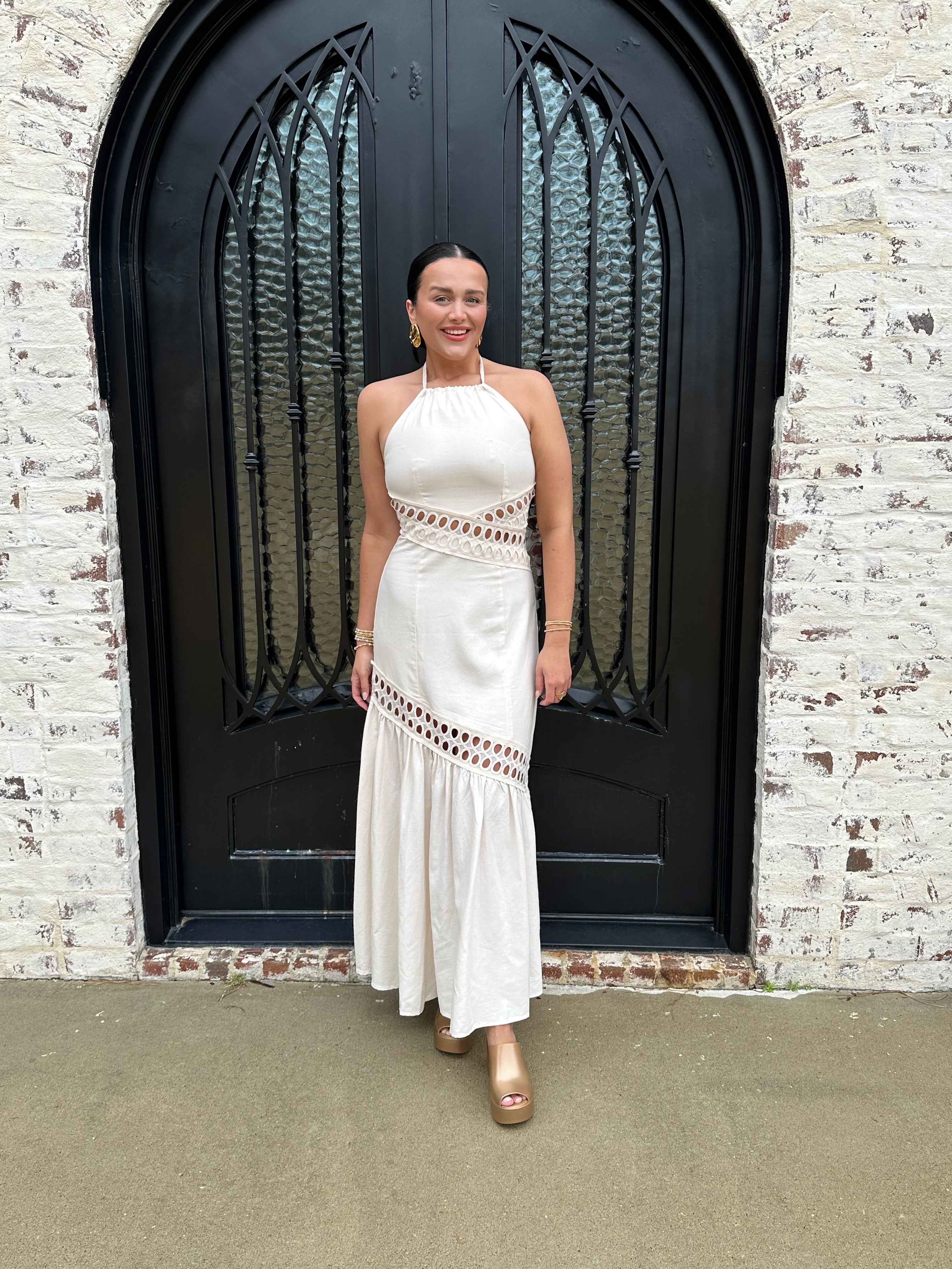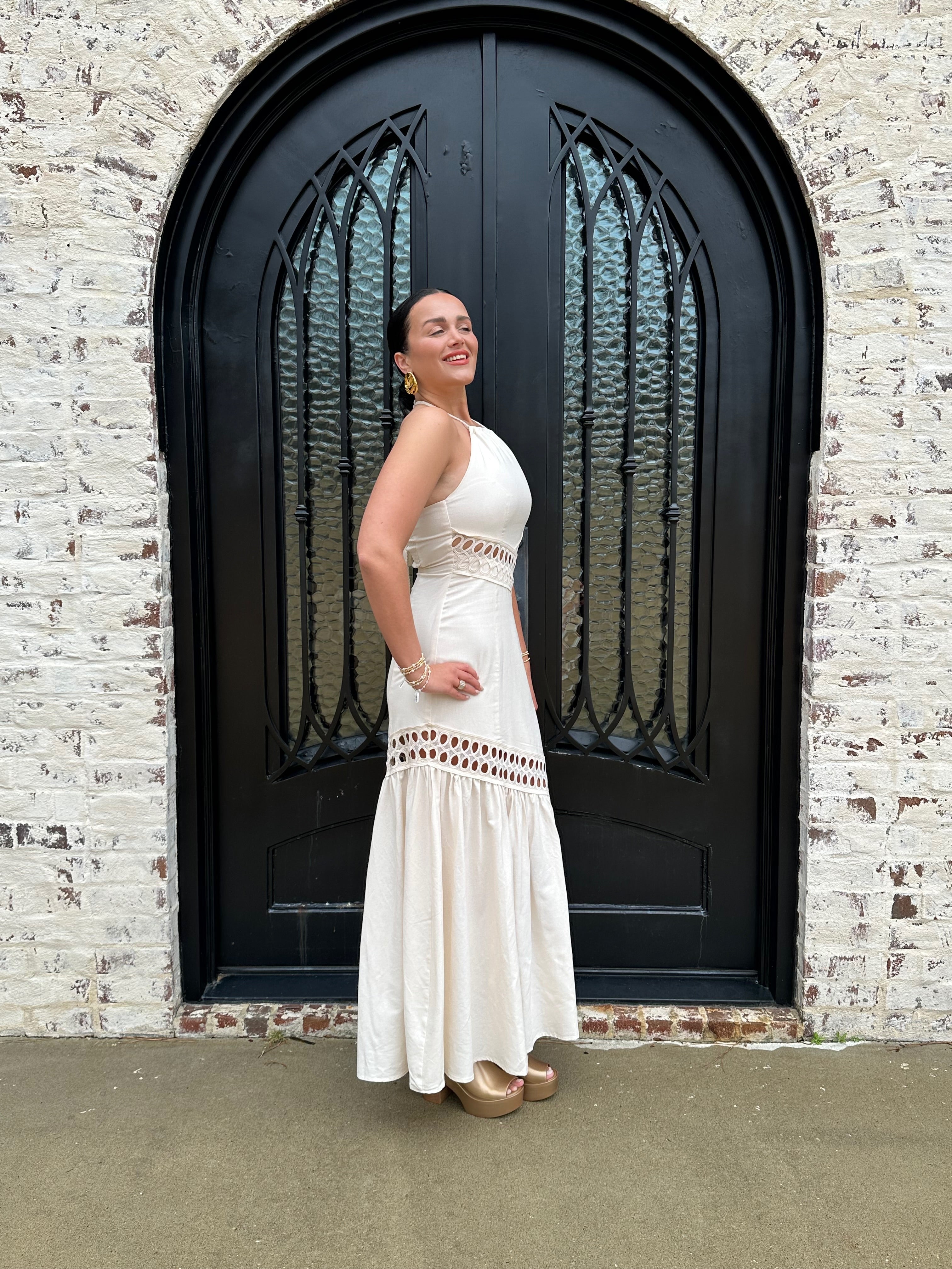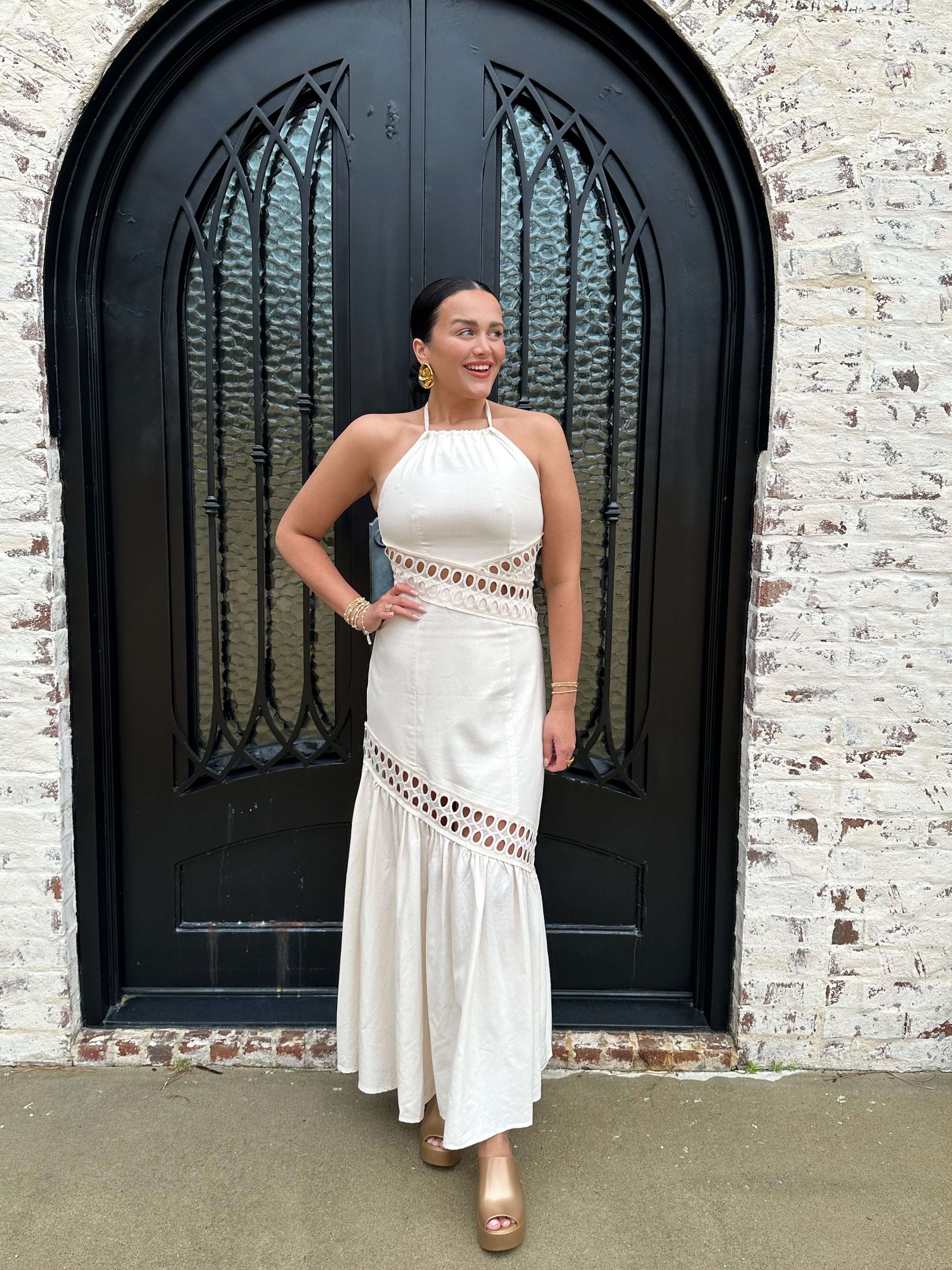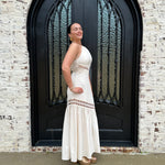 The Brendon Maxi Dress is your go-to for stunning spring and summer escapes! Embrace its ecru hue and flirty see-through design, creating an effortlessly chic look. The halter neck tie and flattering smocking offer comfort and style, while the zipper back ensures a perfect fit. Get ready to shine!