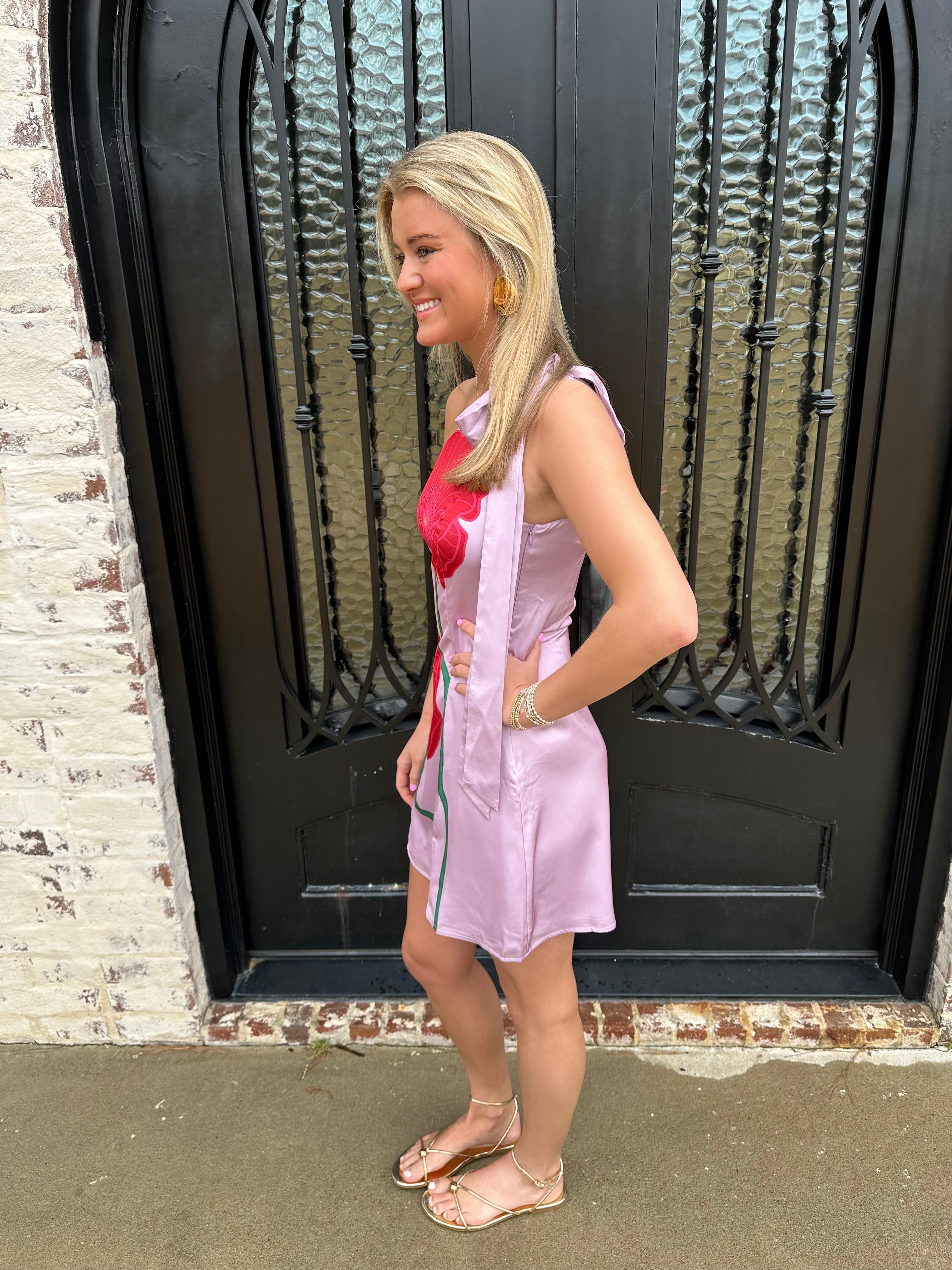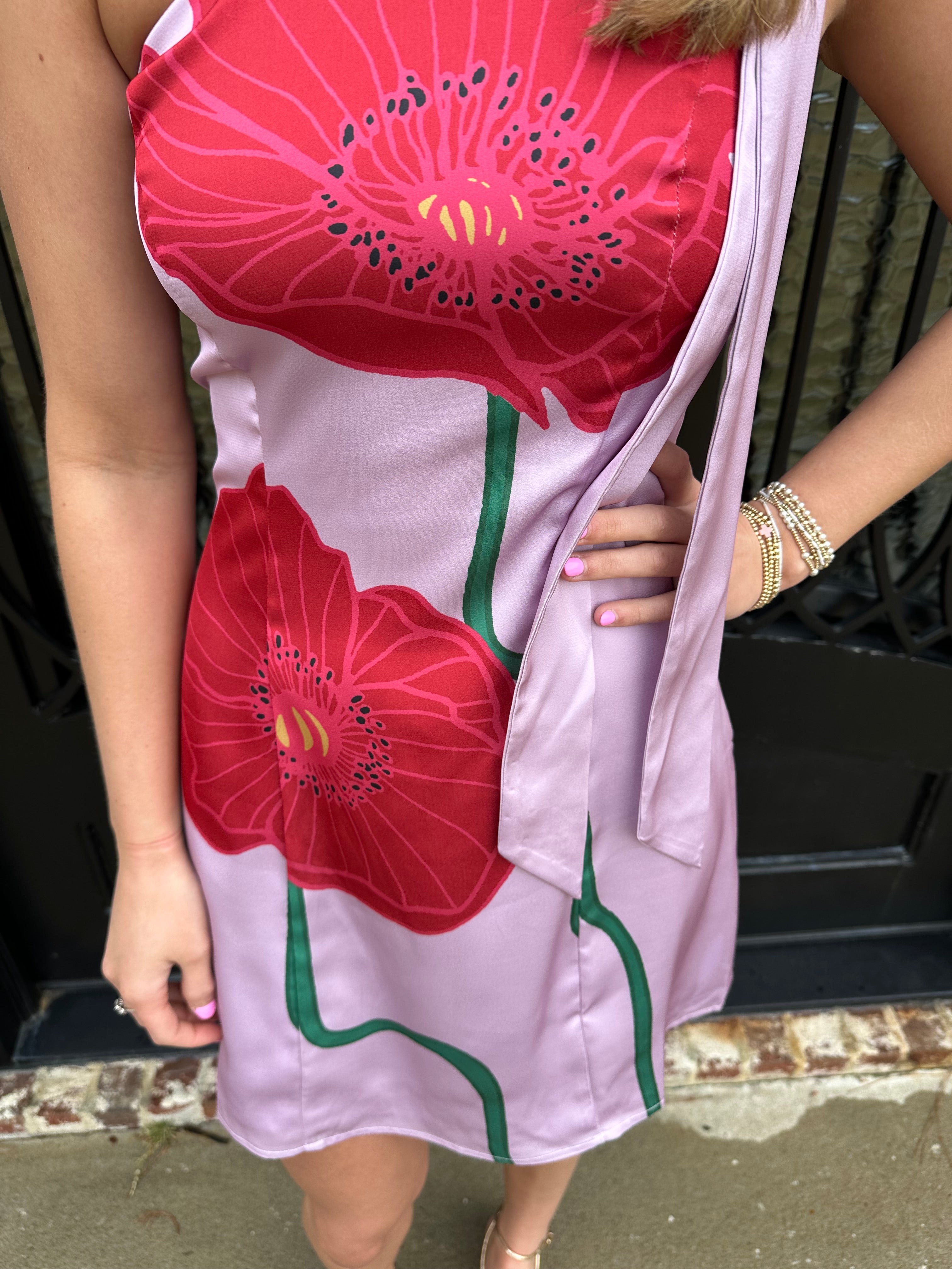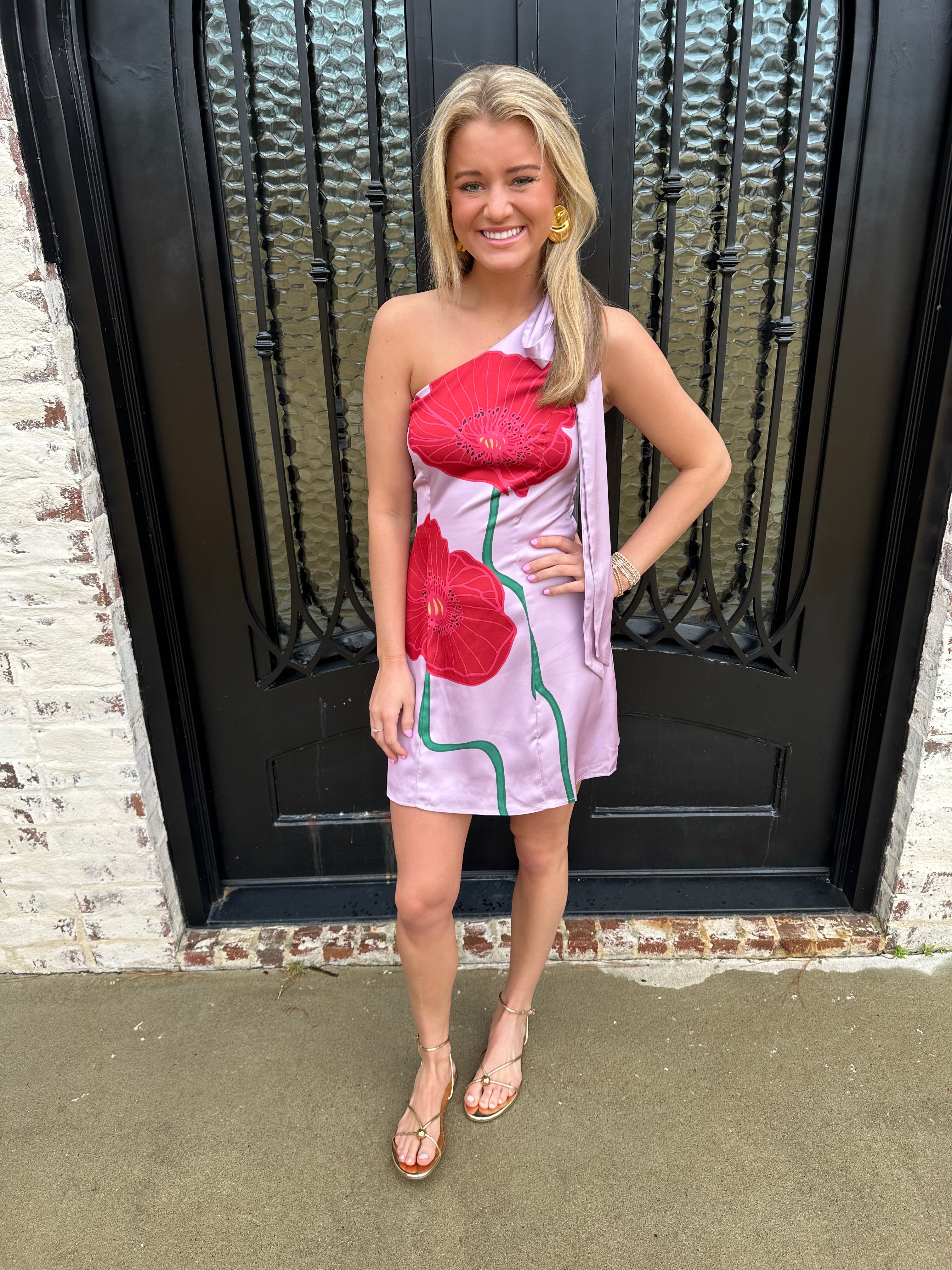 Embrace the blossoming beauty of spring with The Dawson Dress in Lilac Red. This enchanting mini dress features a striking one-shoulder design adorned with a charming red flower pattern. Perfect for dances, it promises to make you feel vibrant and confident, radiating joy with every step!