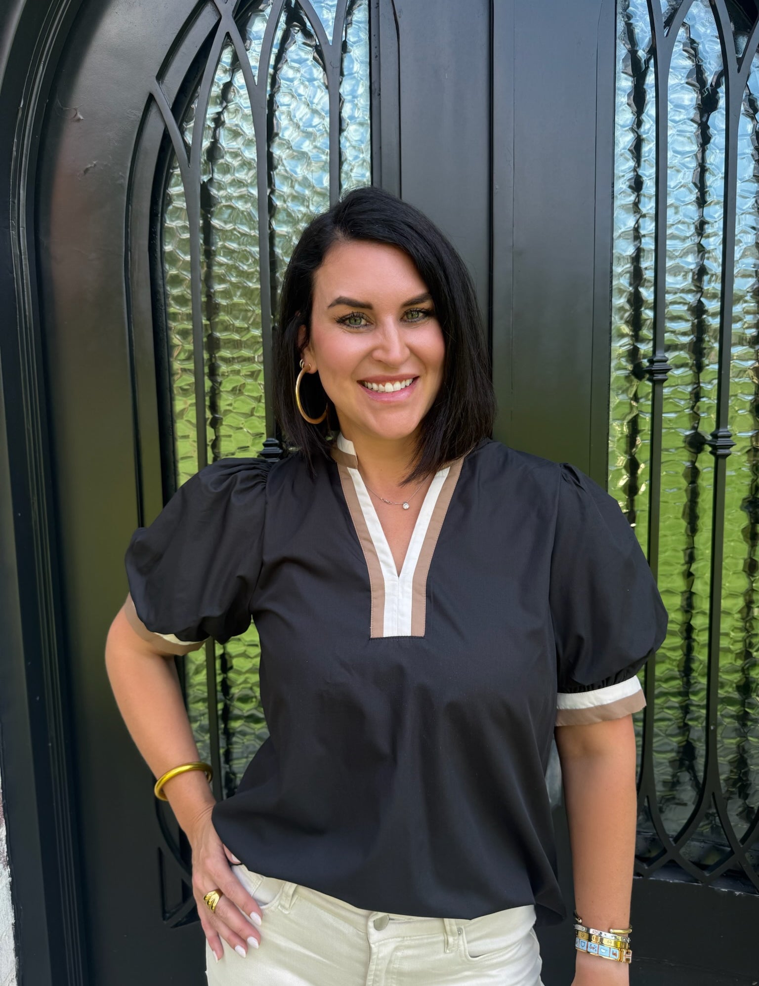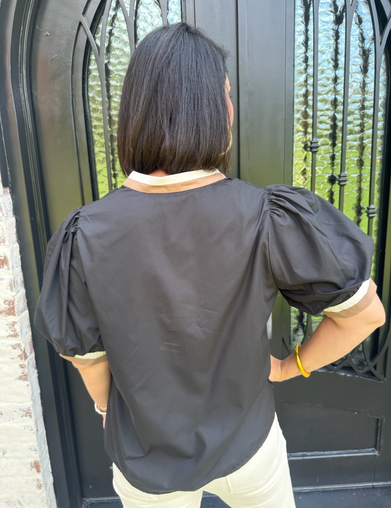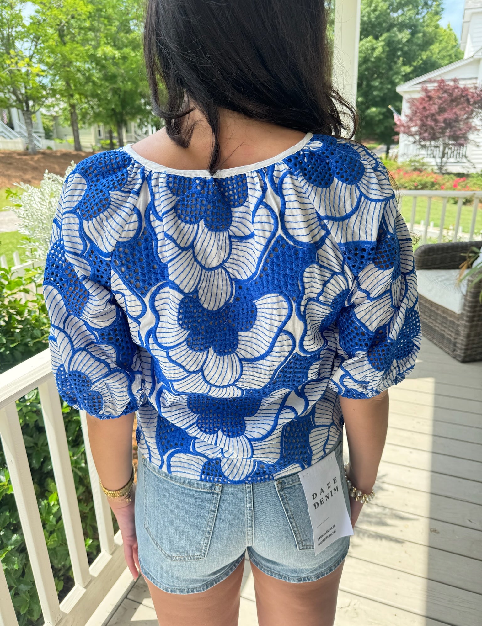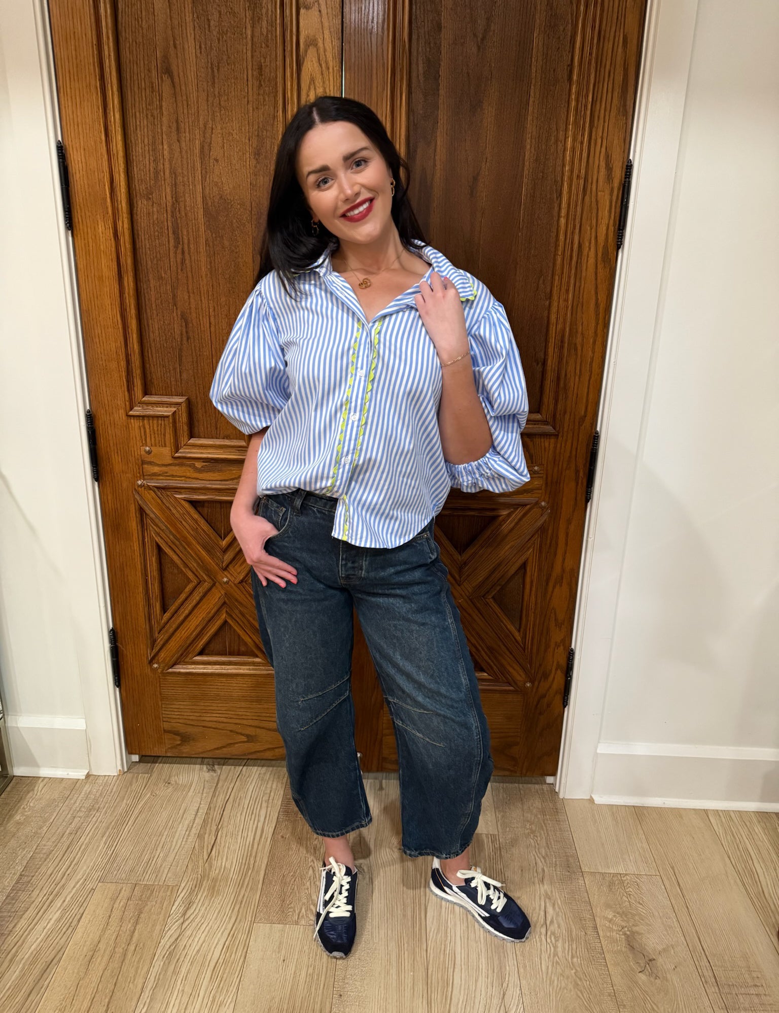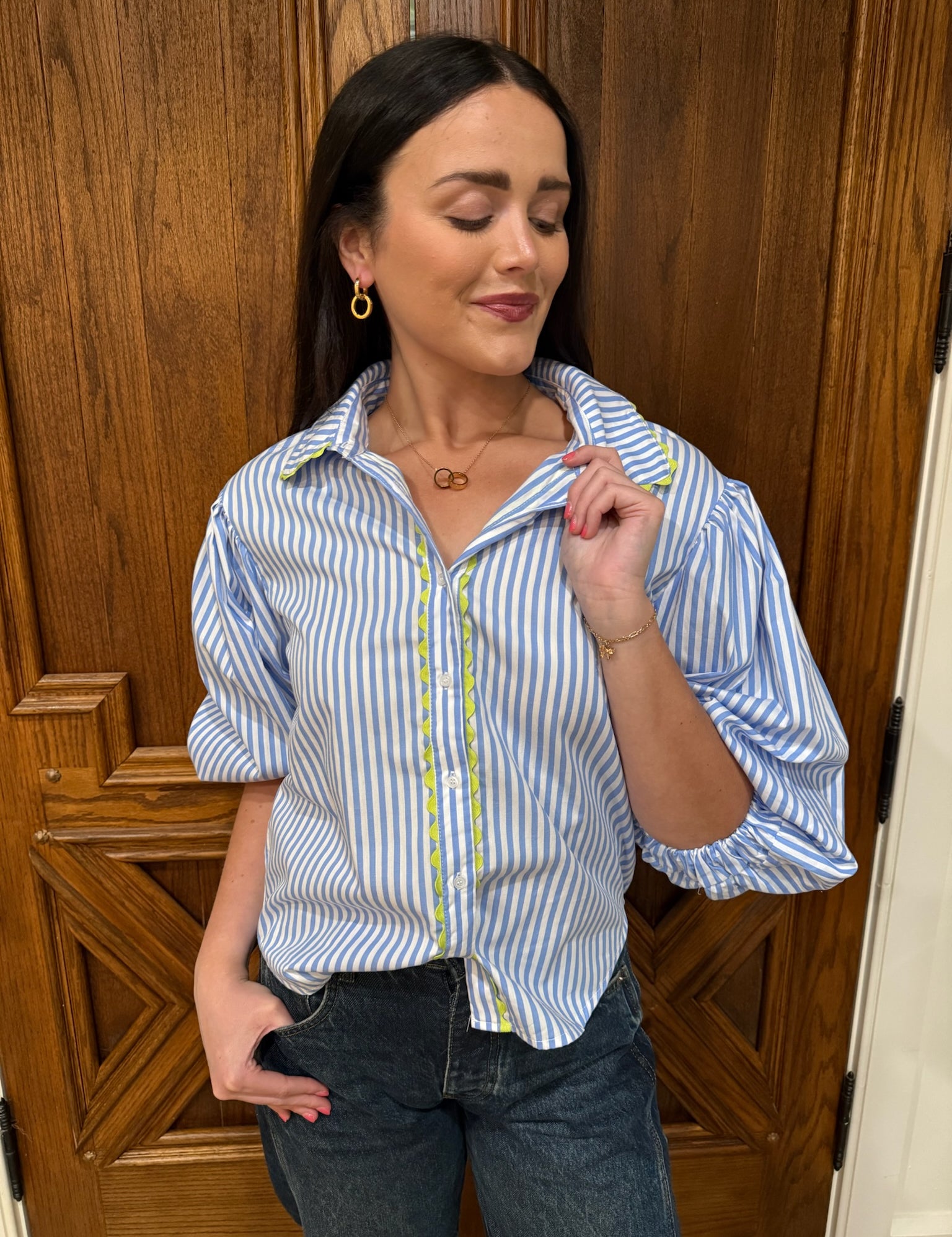 Karlie Poplin Stripe Ric-Rac Trim Button Up Top in Blue and white