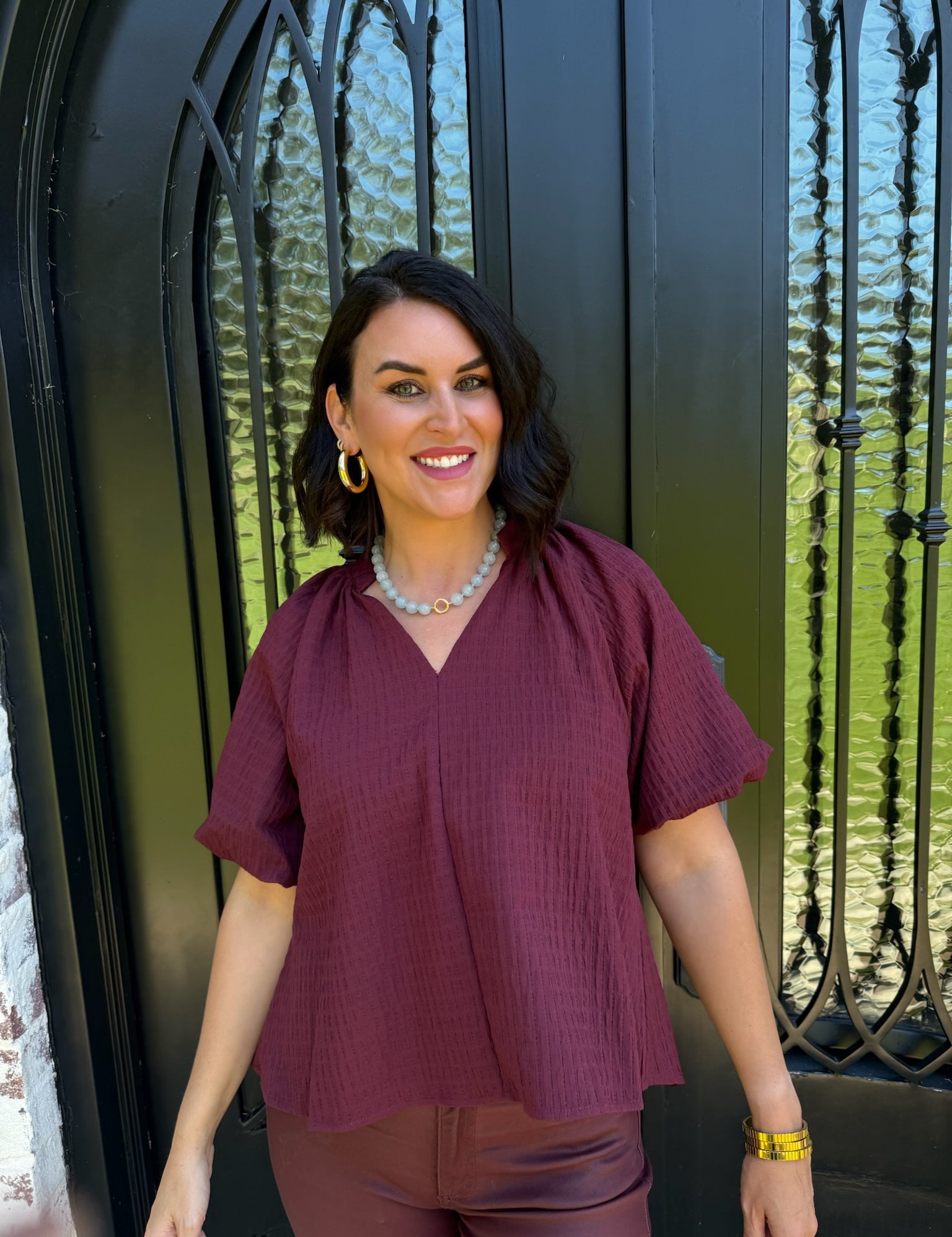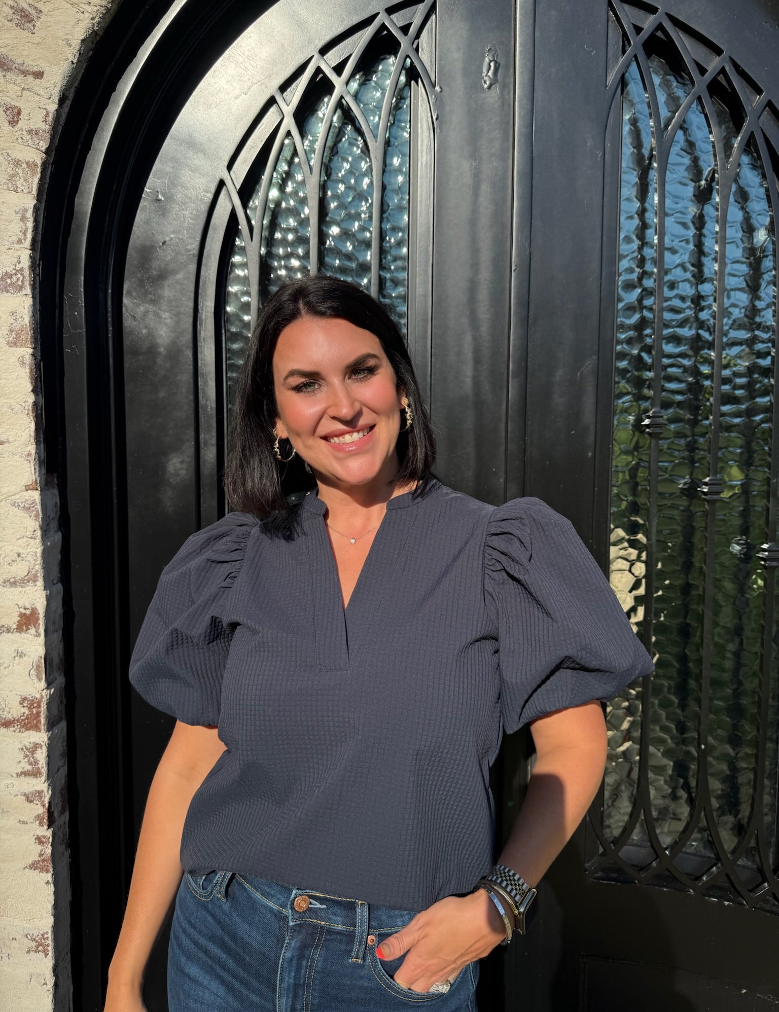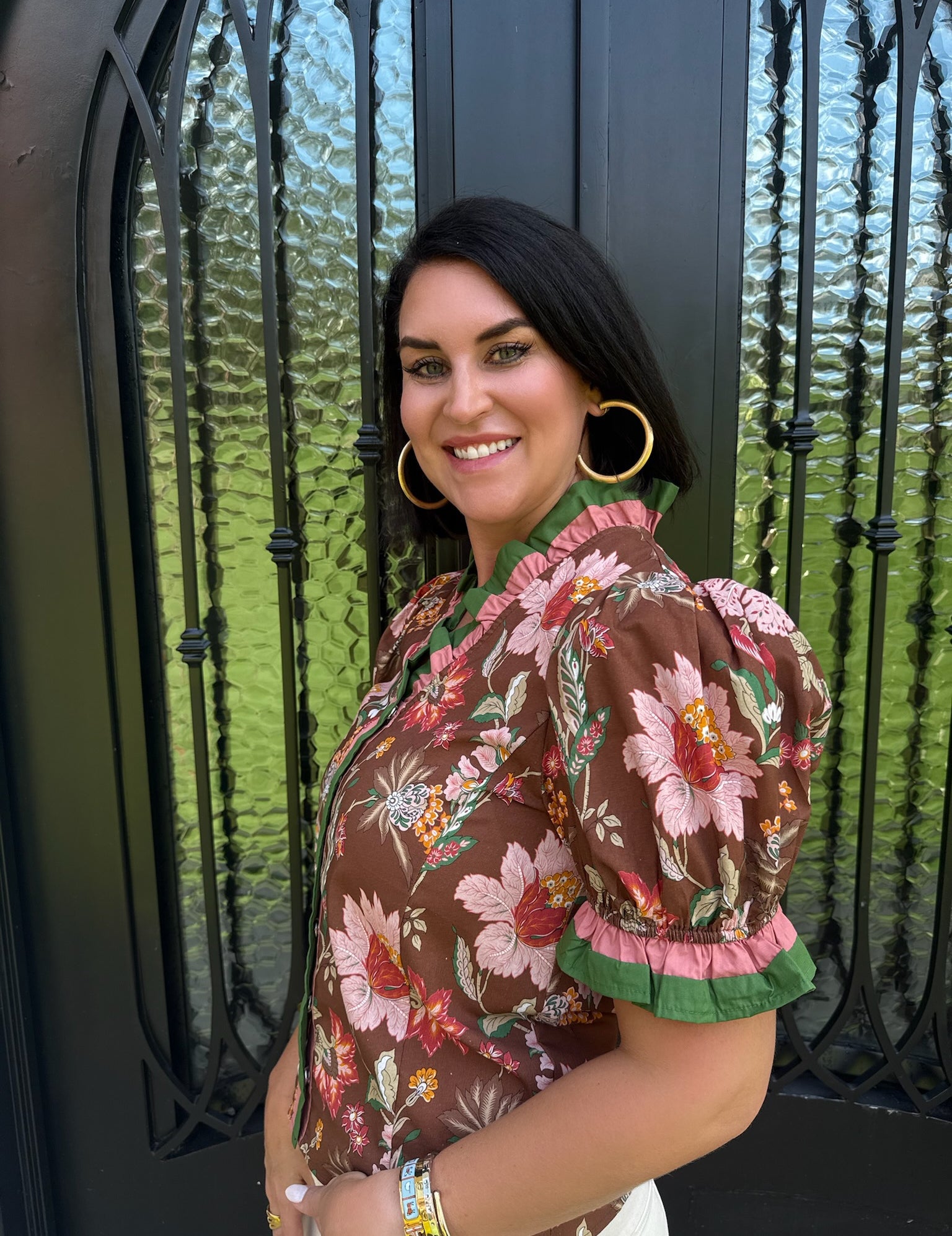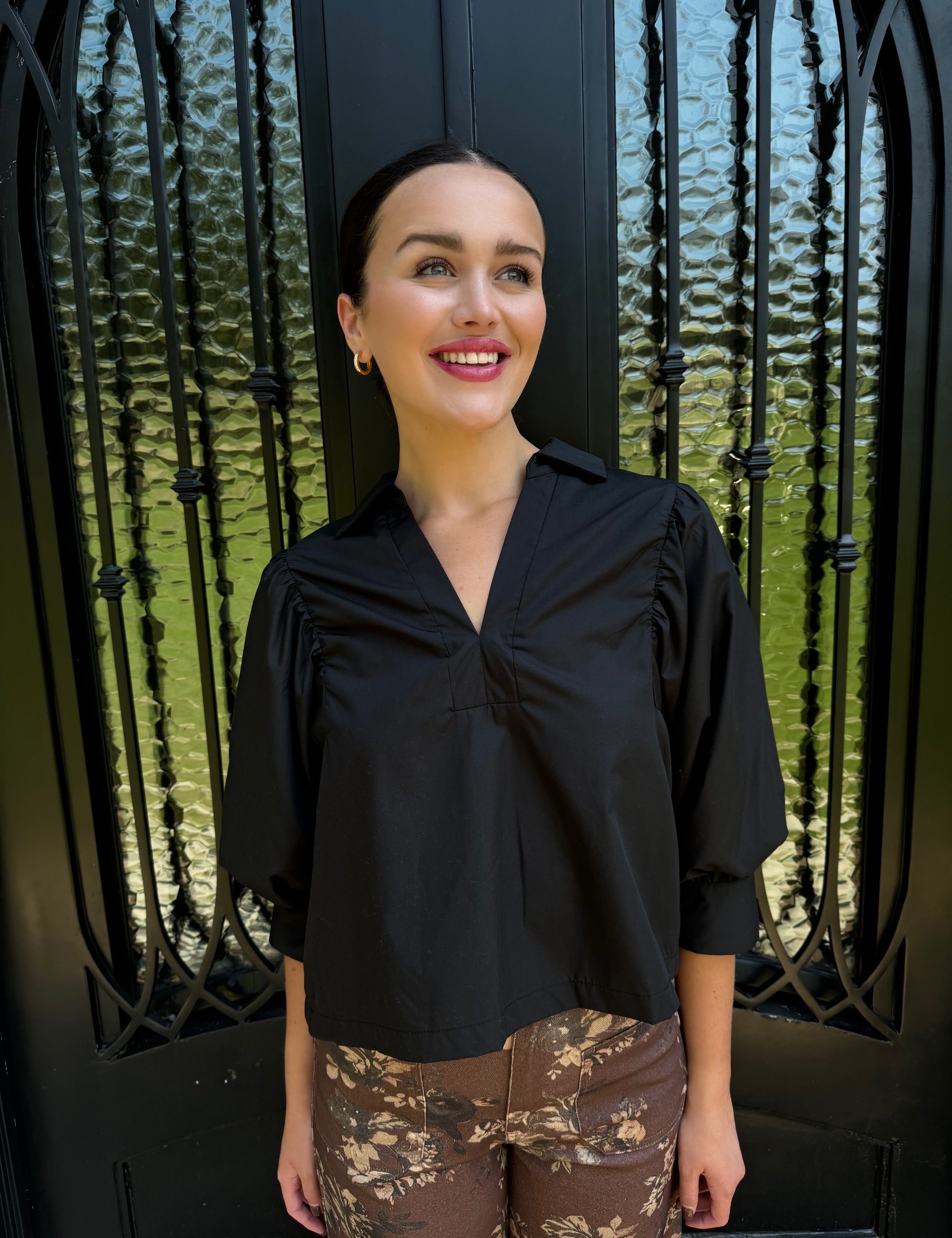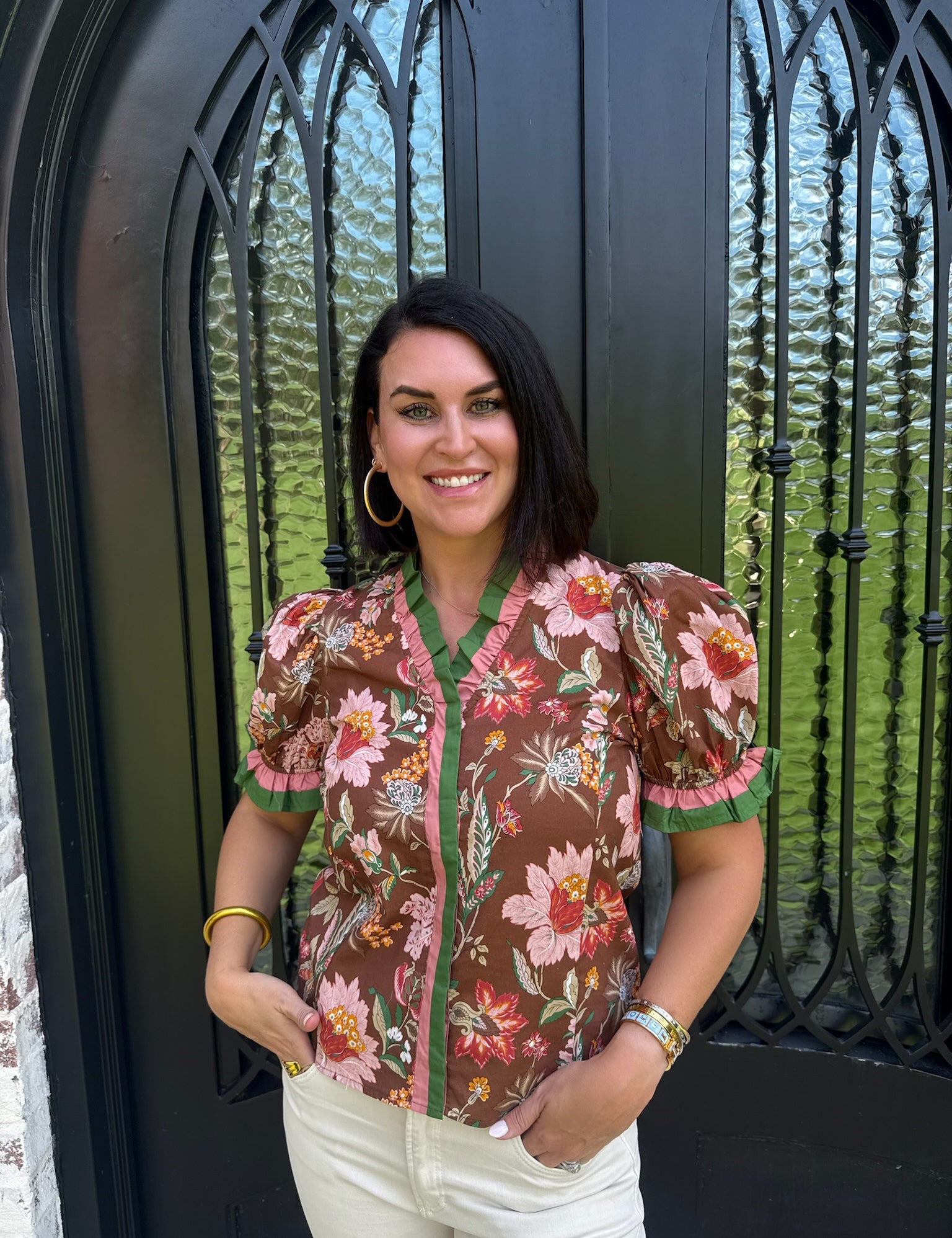 Karlie Poplin Stripe Ric-Rac Trim Button Up Top in Blue and white