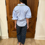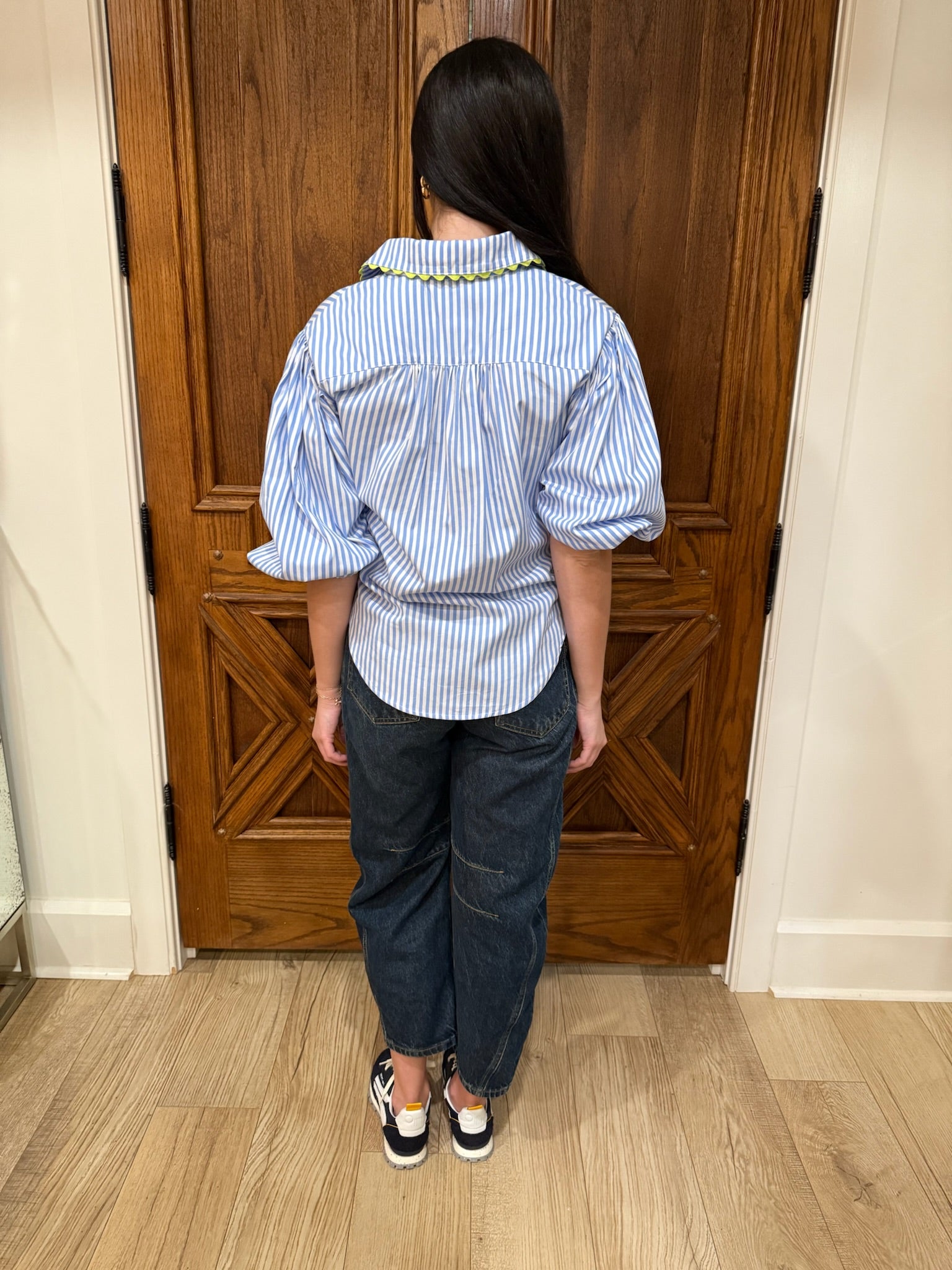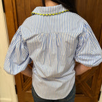 Karlie Poplin Stripe Ric-Rac Trim Button Up Top in Blue and white
