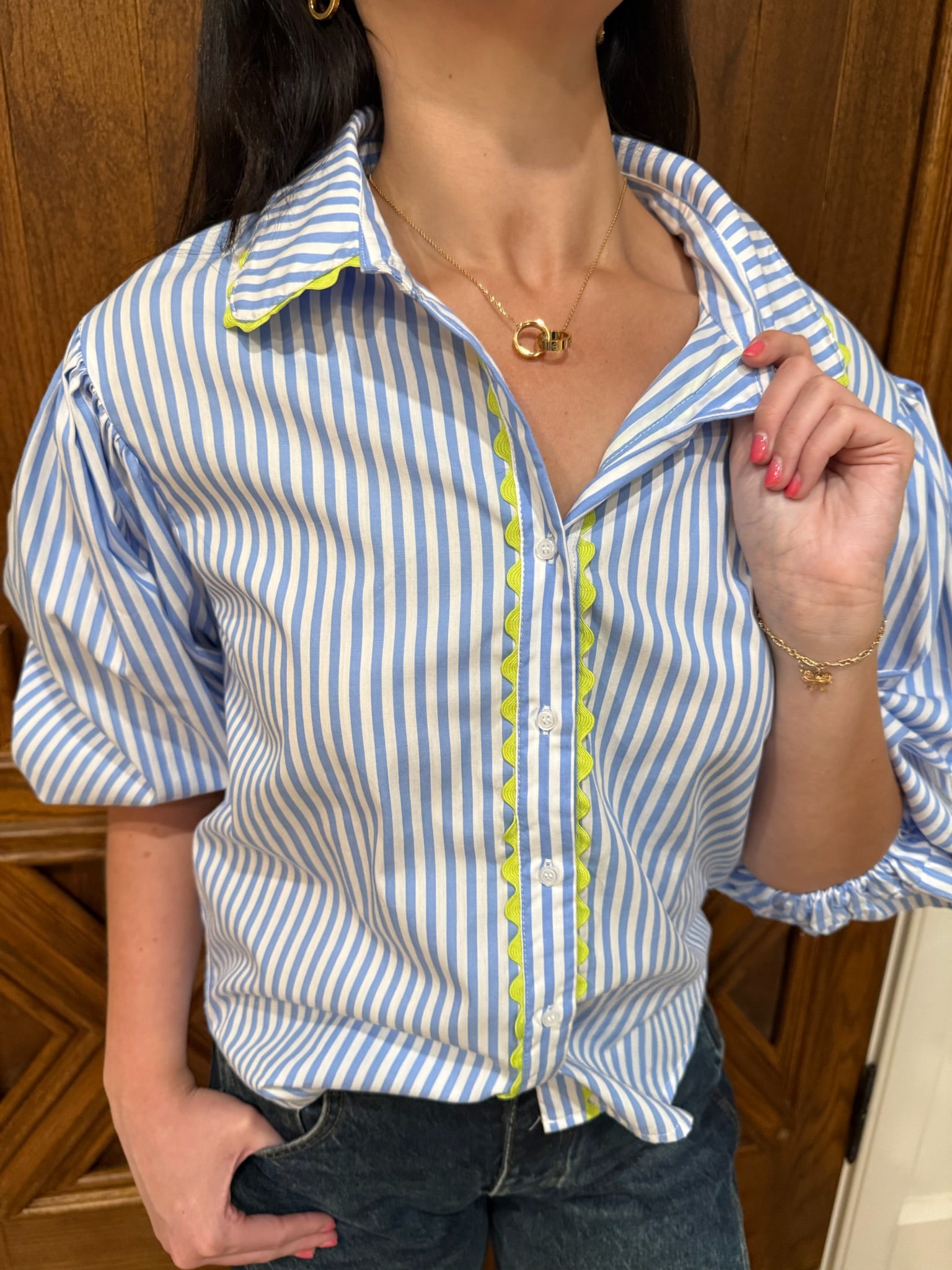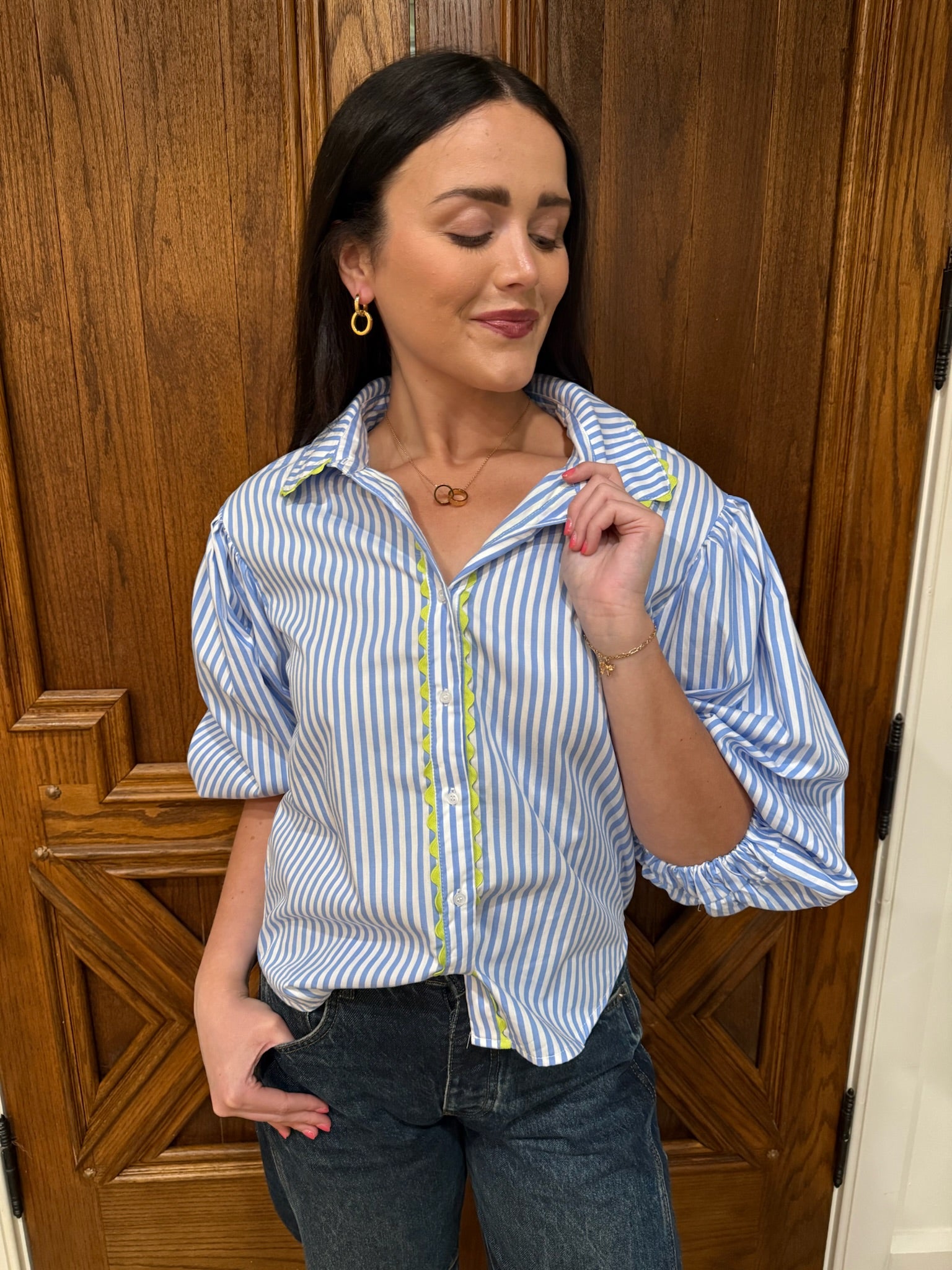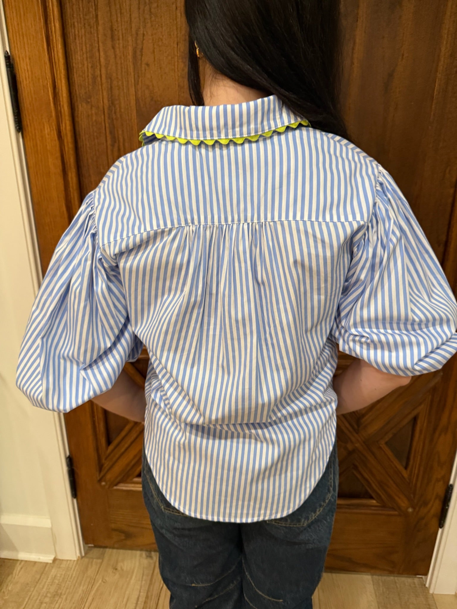 Expertly crafted from soft poplin fabric, this button up collar top features a classic blue and white stripe design. The addition of vibrant green ric rac trim adds a playful touch to this sophisticated piece. Perfect for adding a touch of charm to any outfit.