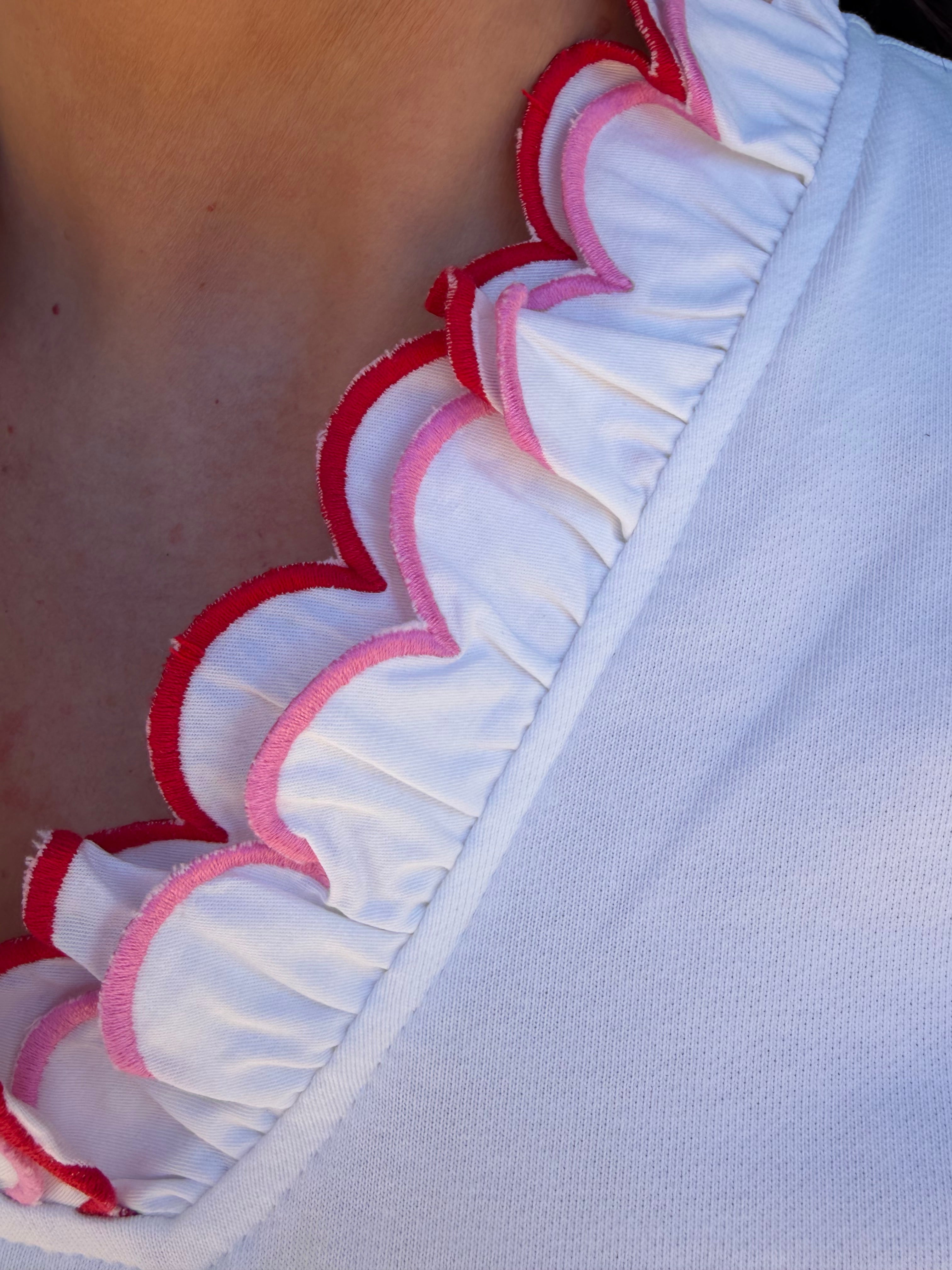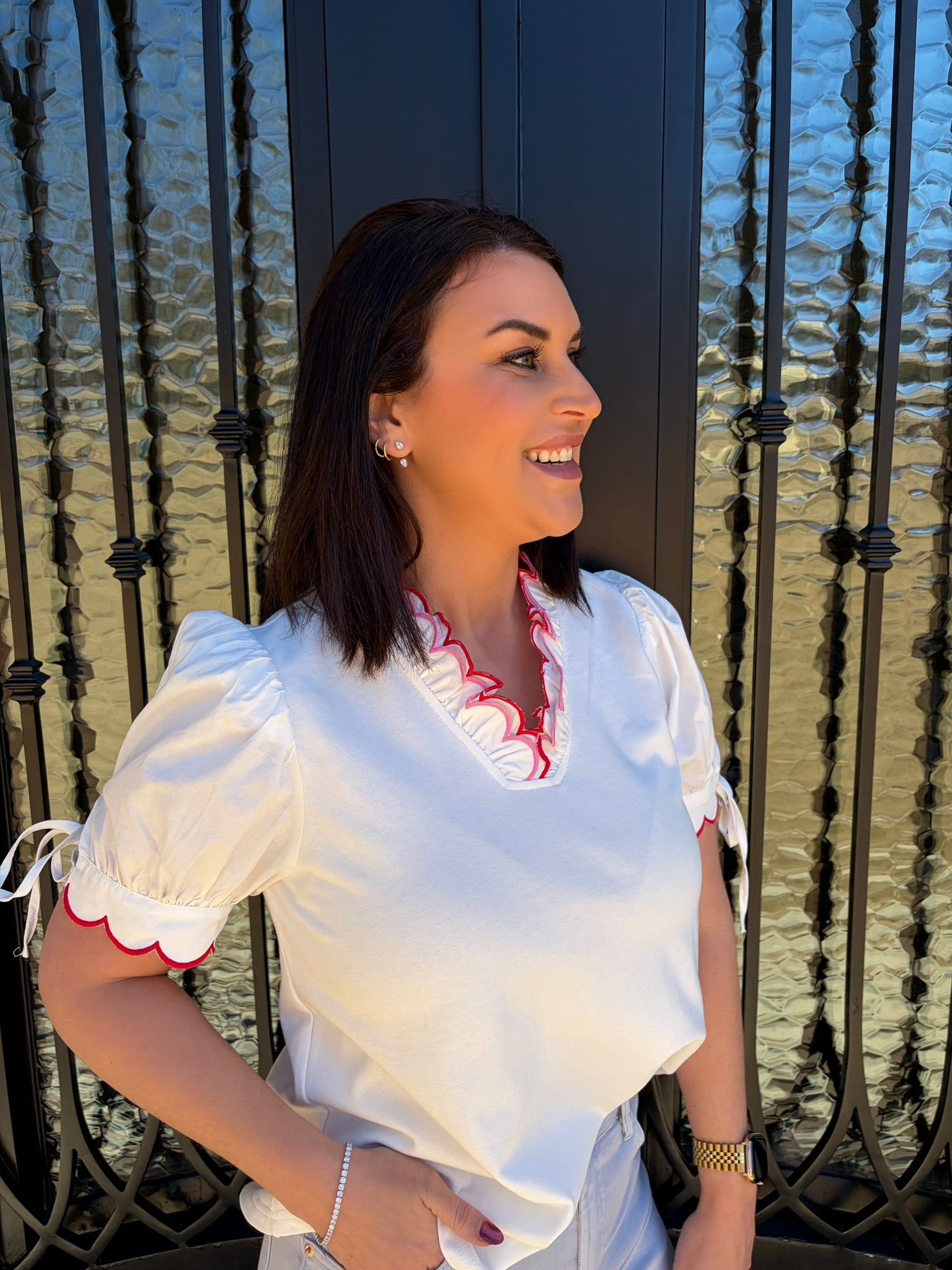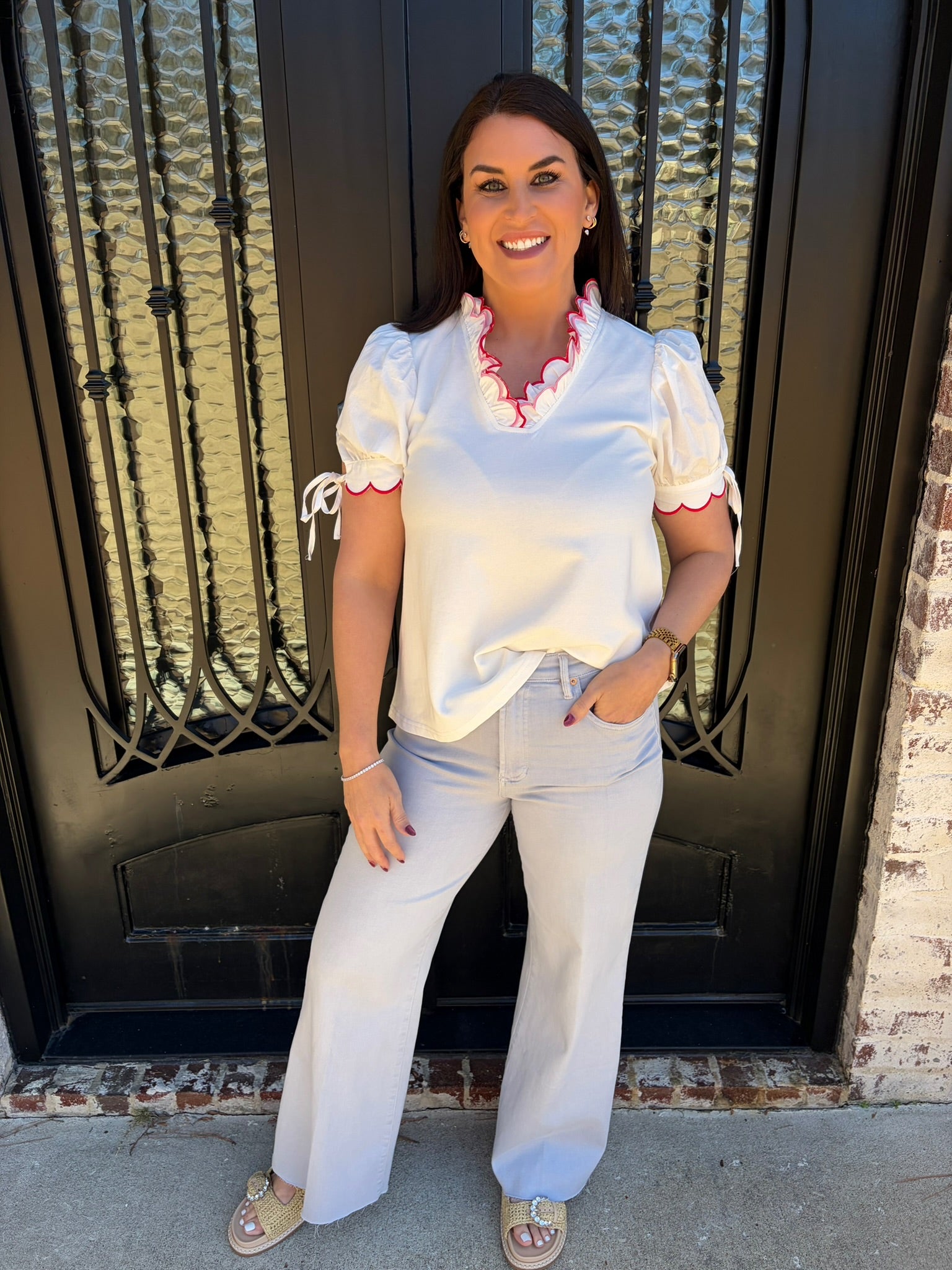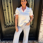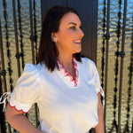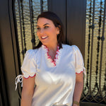 Meet the Connie Top—your new go-to for casual-cute style that effortlessly works with everything in your closet. This off-white beauty features sweet red and pink trim that adds just the right pop of color without overwhelming your look. Whether you're running errands, meeting friends, or enjoying a relaxed weekend, the Connie Top delivers that coveted laid-back charm with a playful edge. The soft trim detailing gives it personality while the classic white base keeps it endlessly versatile. Comfortable, flattering, and undeniably cute—this is the piece you'll want in every color. Grab yours and elevate your casual rotation.
