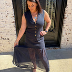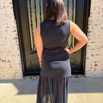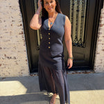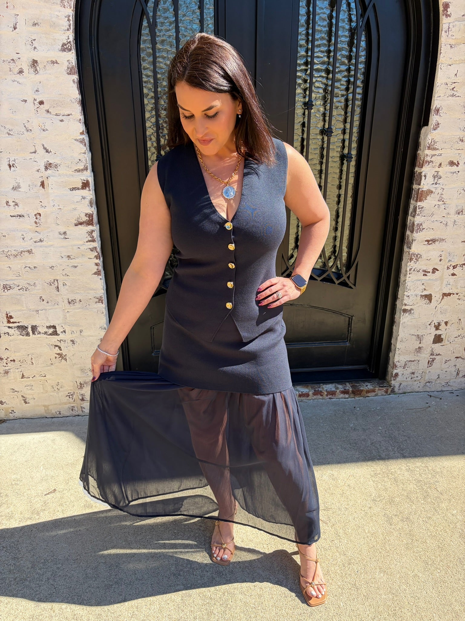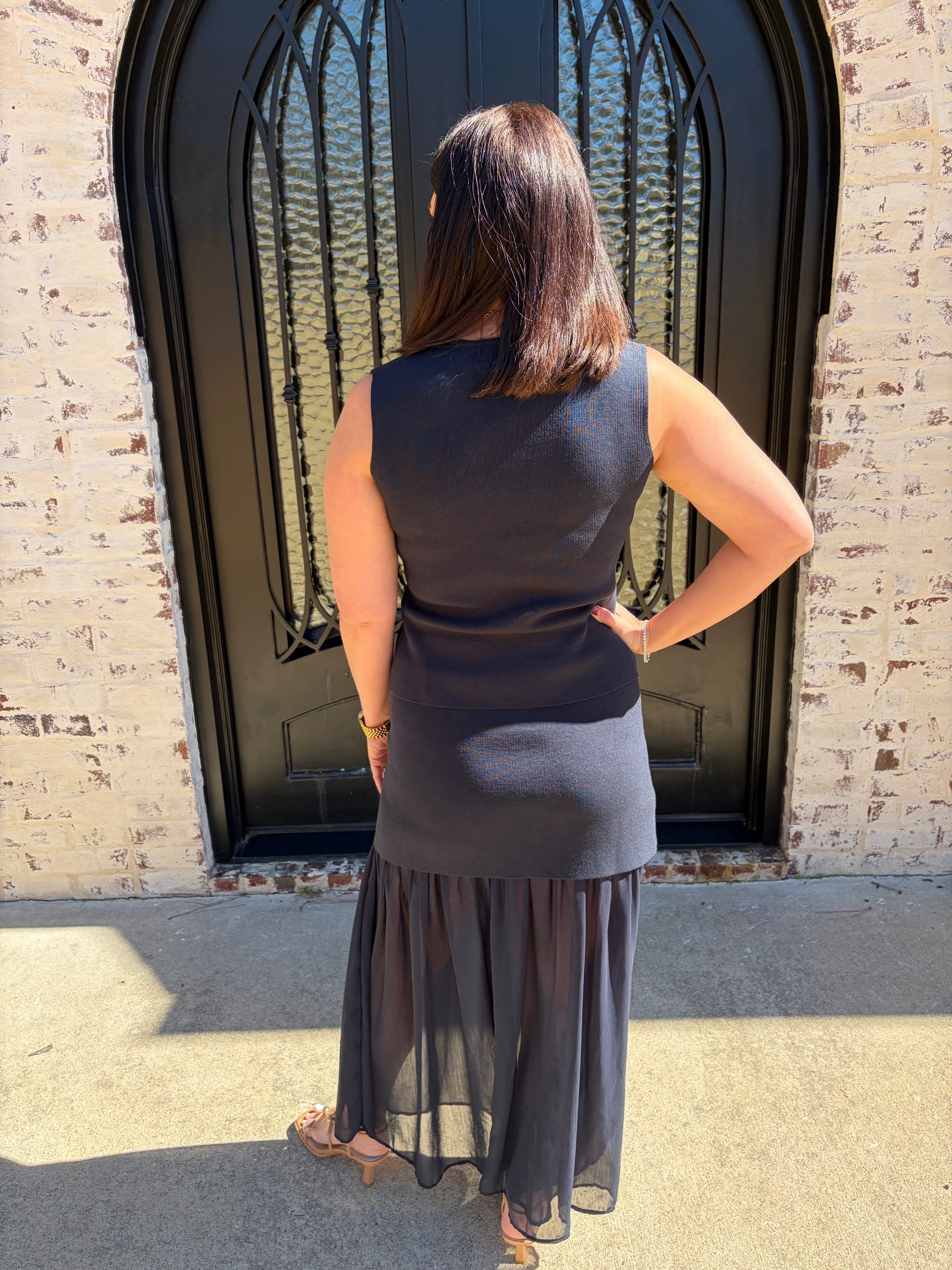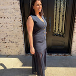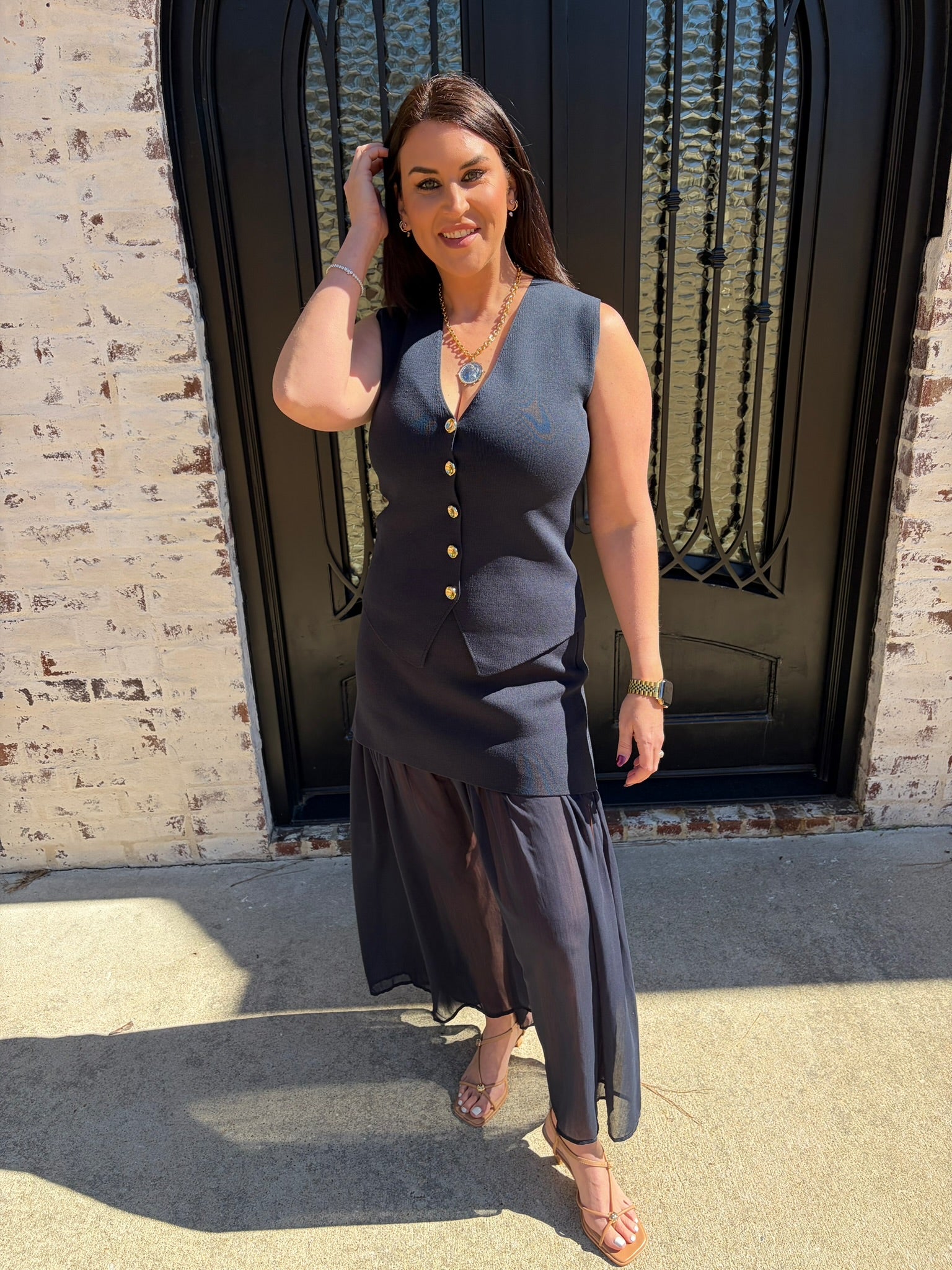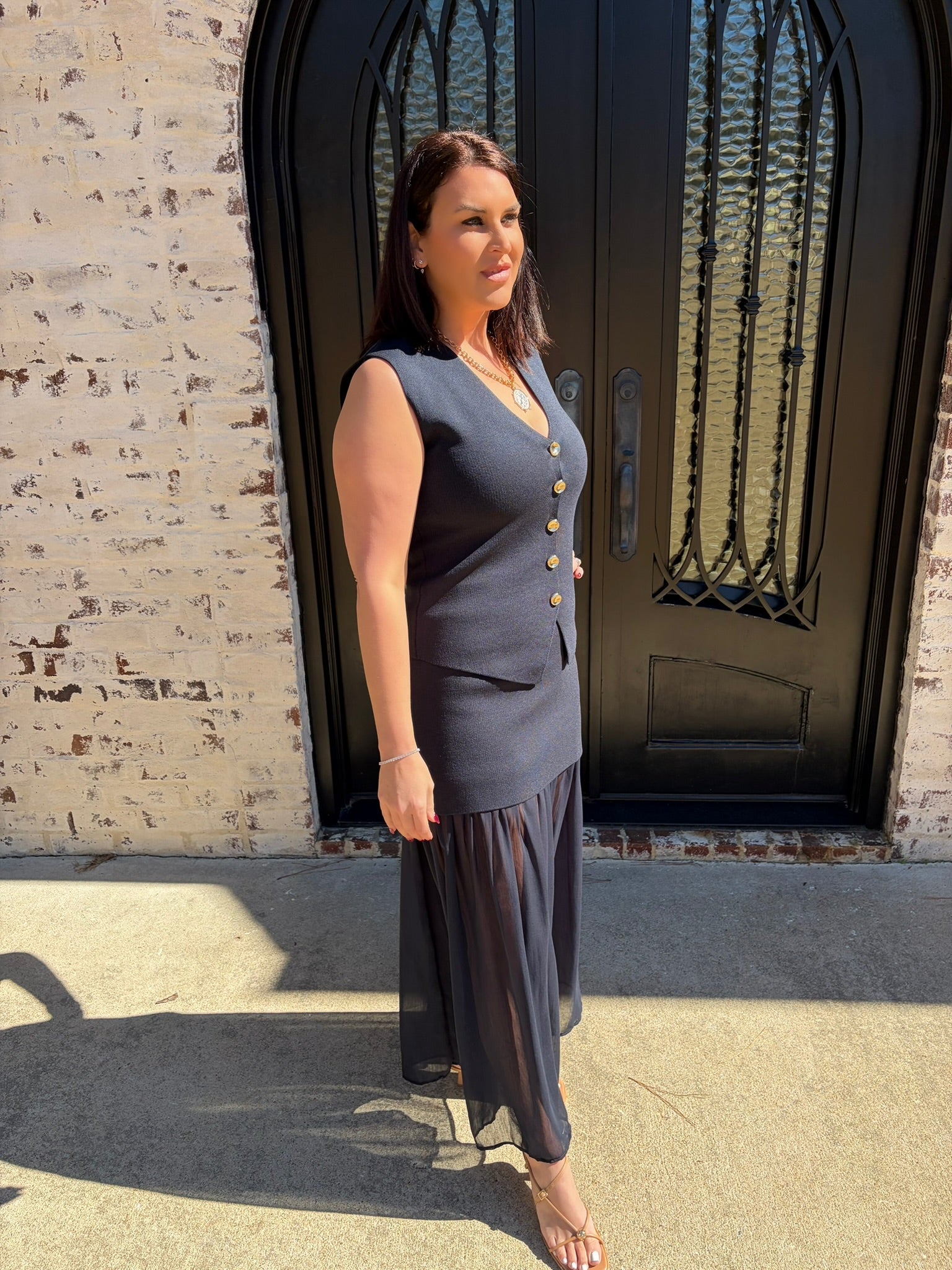 Make a statement with this captivating two-piece ensemble that combines timeless elegance with modern flair. The Kate Knit Button Top showcases a chic V-neck silhouette adorned with luxe gold buttons that catch the light beautifully, while the pleated chiffon midi skirt flows with an airy, see-through design that adds an alluring dimension to your look. This sophisticated pairing is ideal for business casual, special occasions, date nights, at the office or whenever you want to feel confident and polished. The interplay between the fitted knit bodice and the graceful chiffon skirt creates an undeniably flattering aesthetic that turns heads.