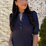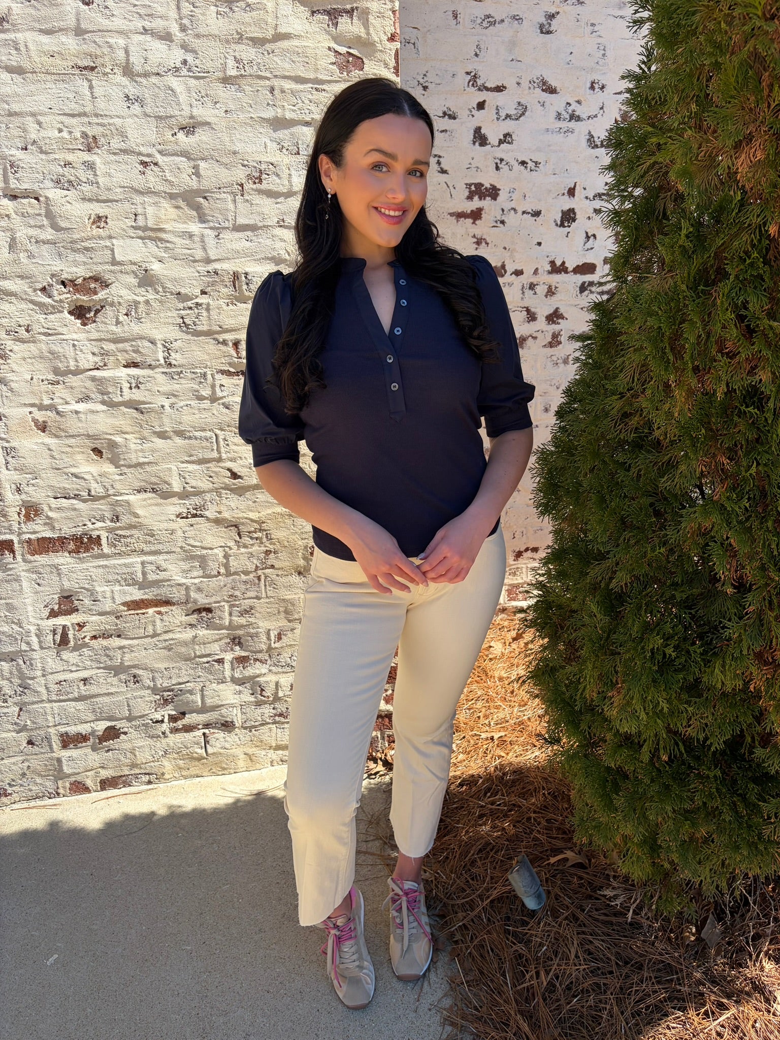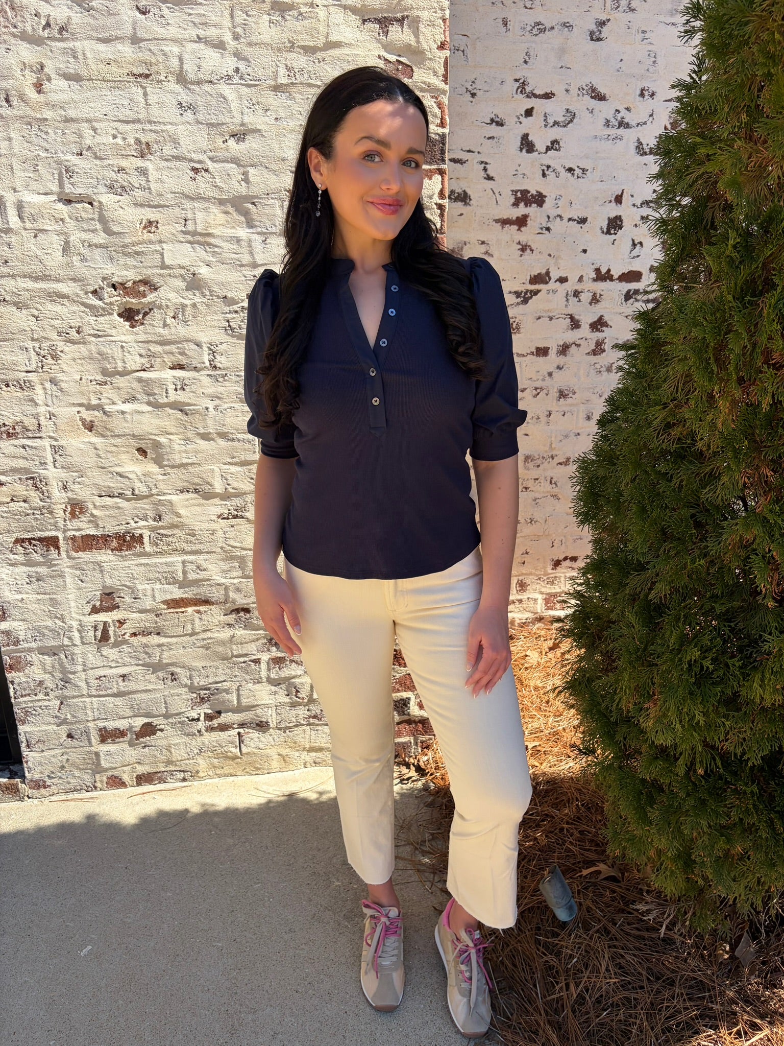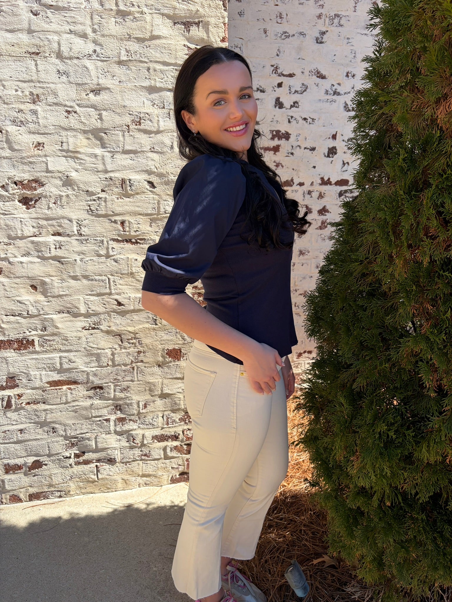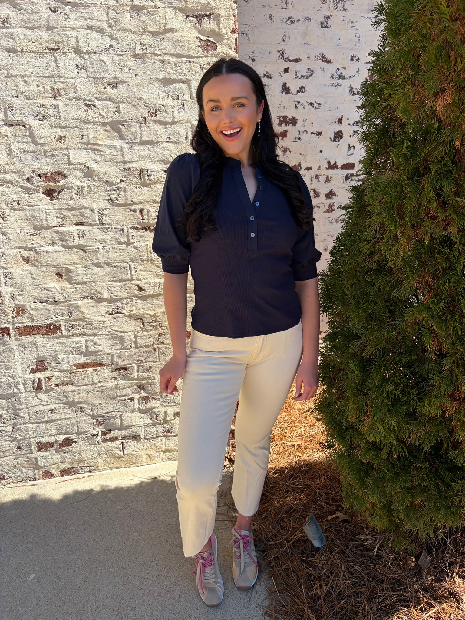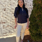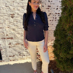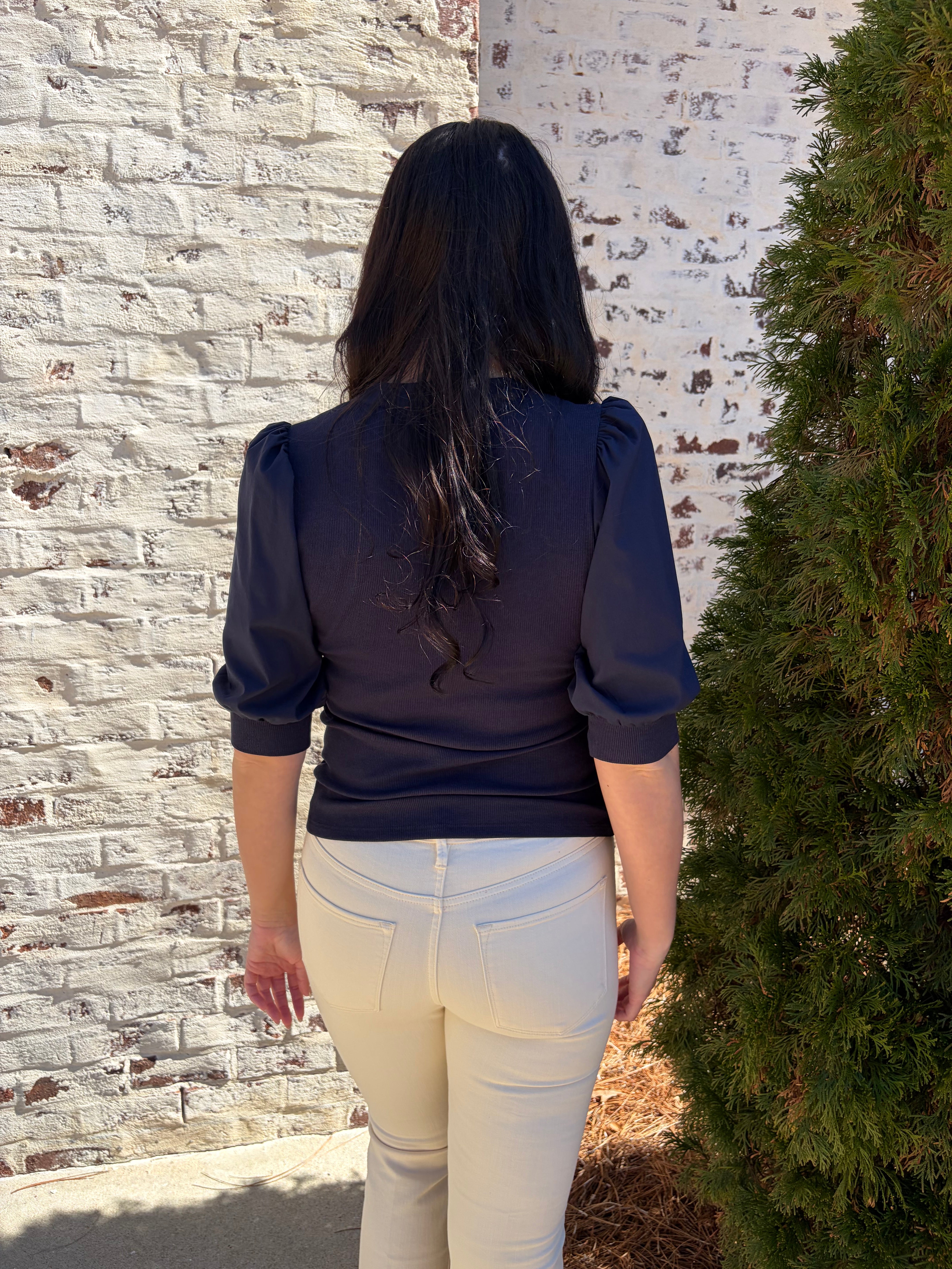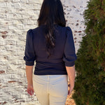 Audrey is the perfect mix of casual and chic. The bodice of this top is ribbed, and the sleeves and trimming are shirted. Make your look sophisticated by wearing this top with a satin skirt and heels, or pair it with jeans and a sneaker.