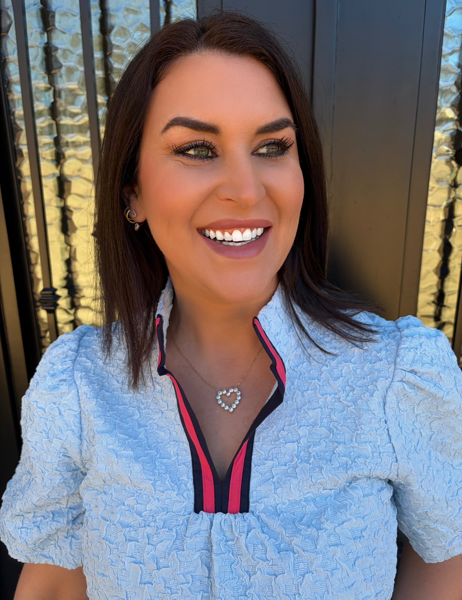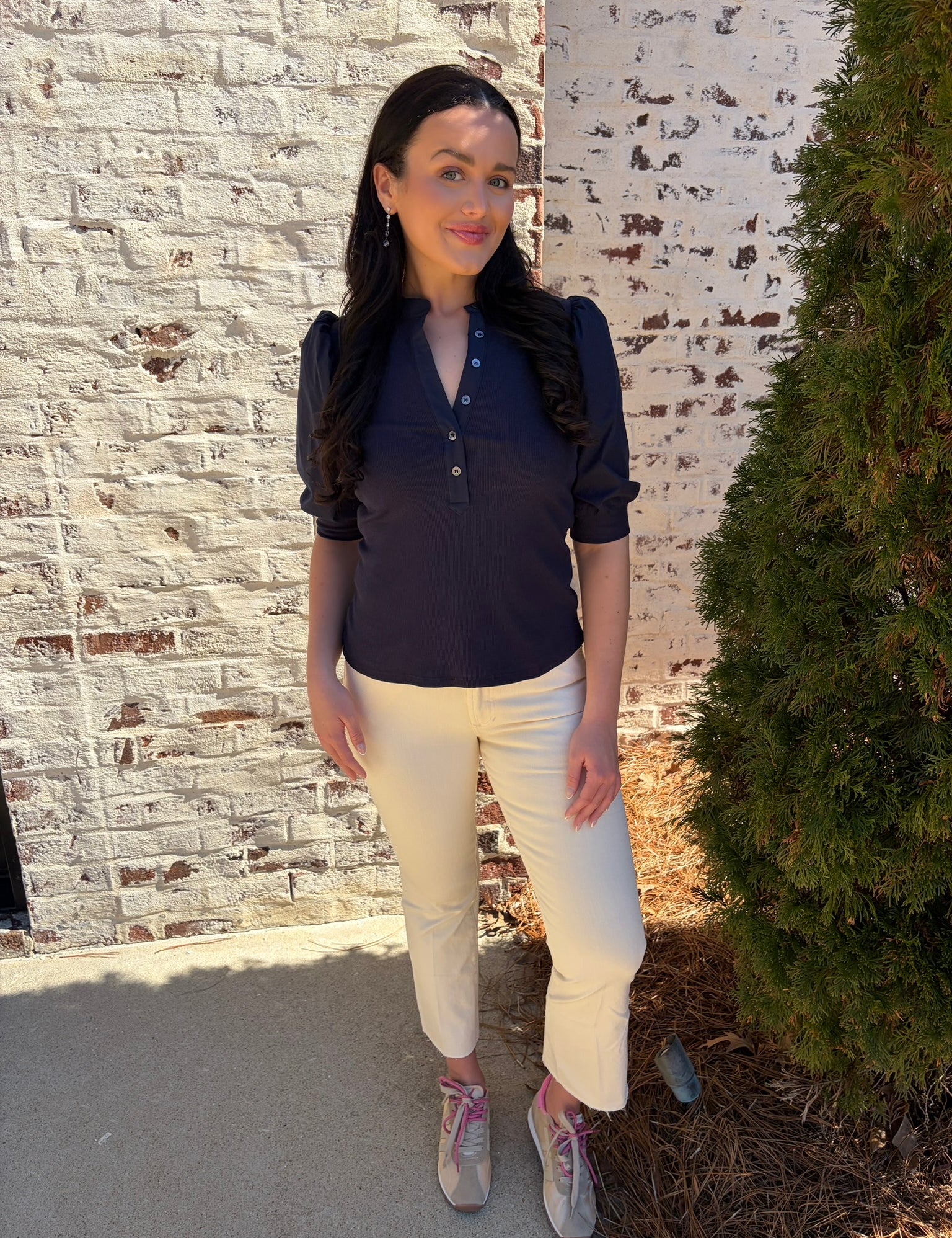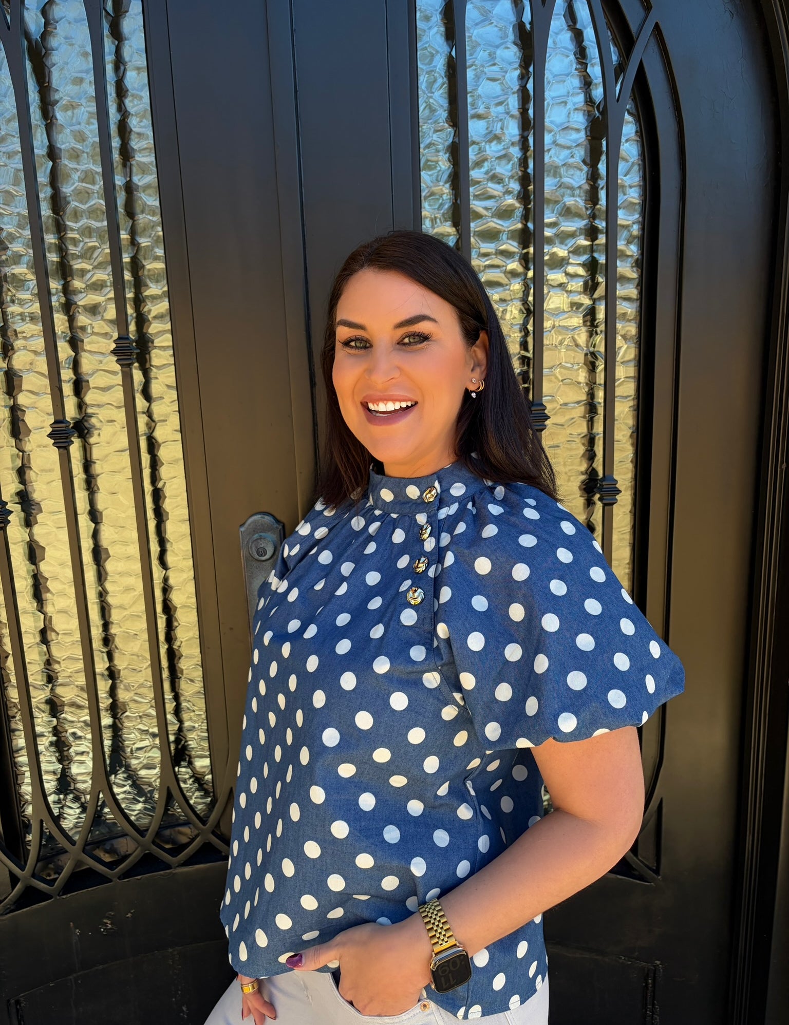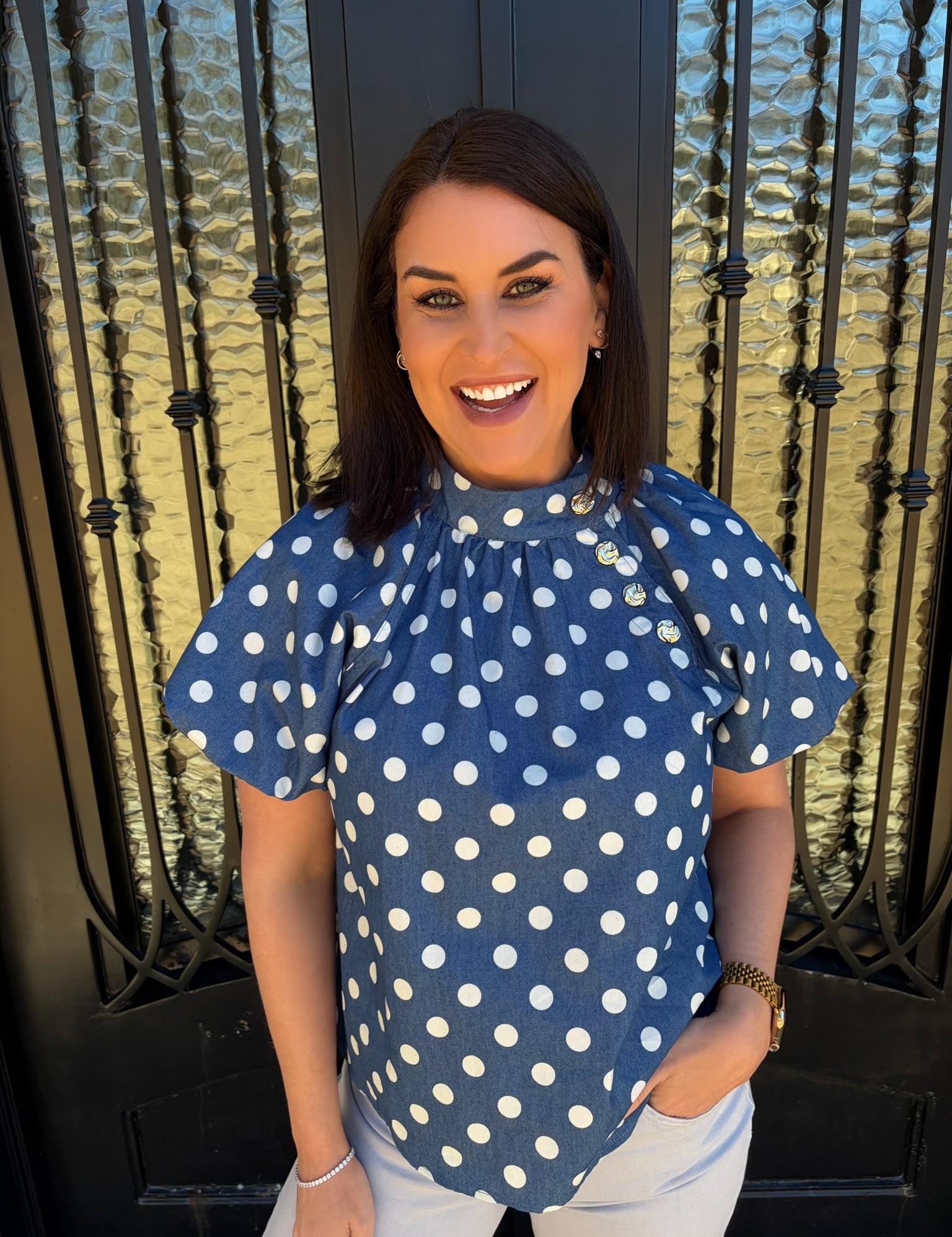 Denim Puff Sleeve Polka Dot Top