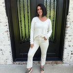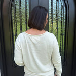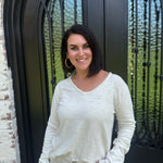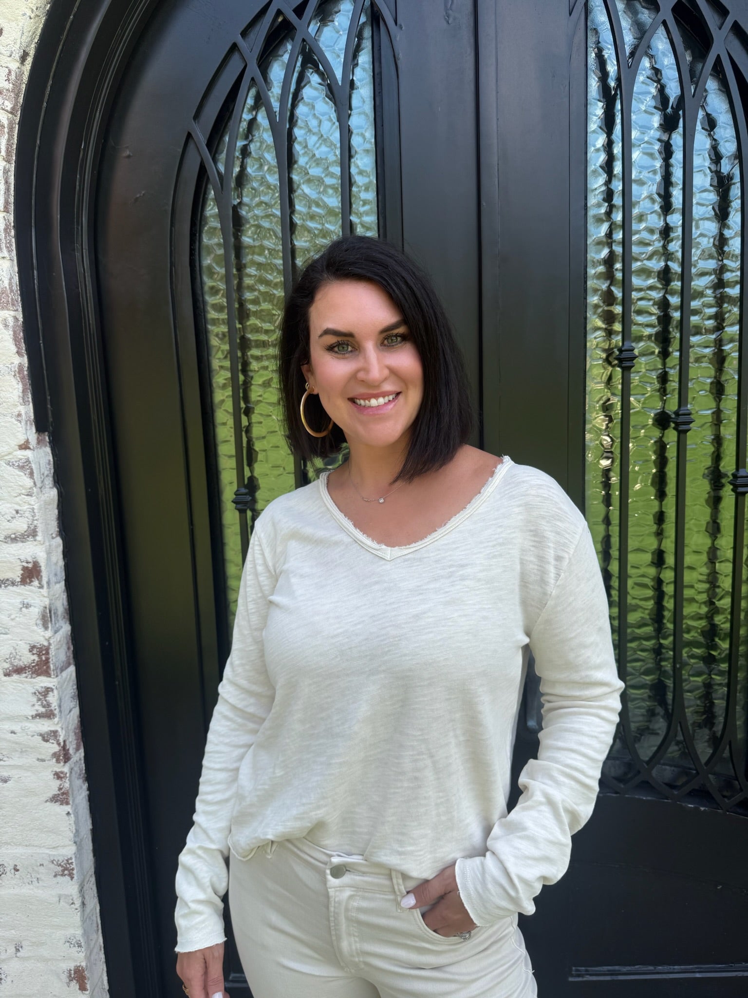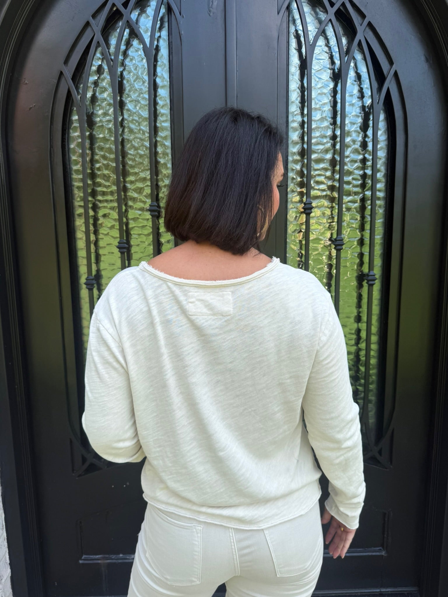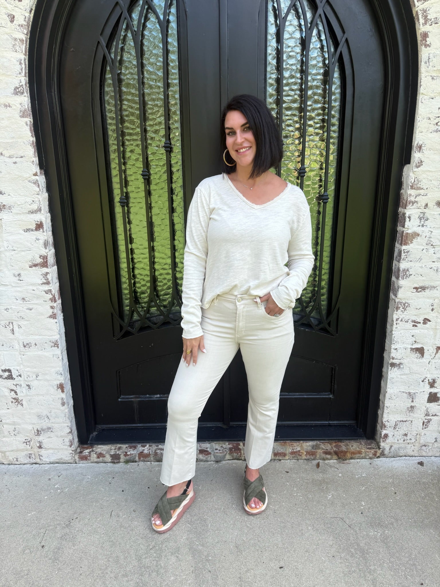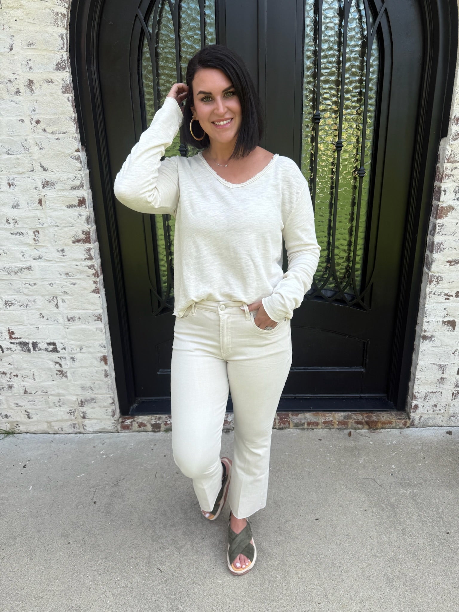 The Vanya long sleeve tee, a sophisticated choice that seamlessly combines style and comfort. This versatile top features a flattering V-neckline and chic raw edge details, creating an effortlessly modern aesthetic perfect for any occasion. Its relaxed fit ensures it is the ideal ensemble whether you're heading to work or enjoying a casual day out. Pair the Vanya Top back with our Jeanne jeans in whitecap for the most amazing tone on tone outfit.