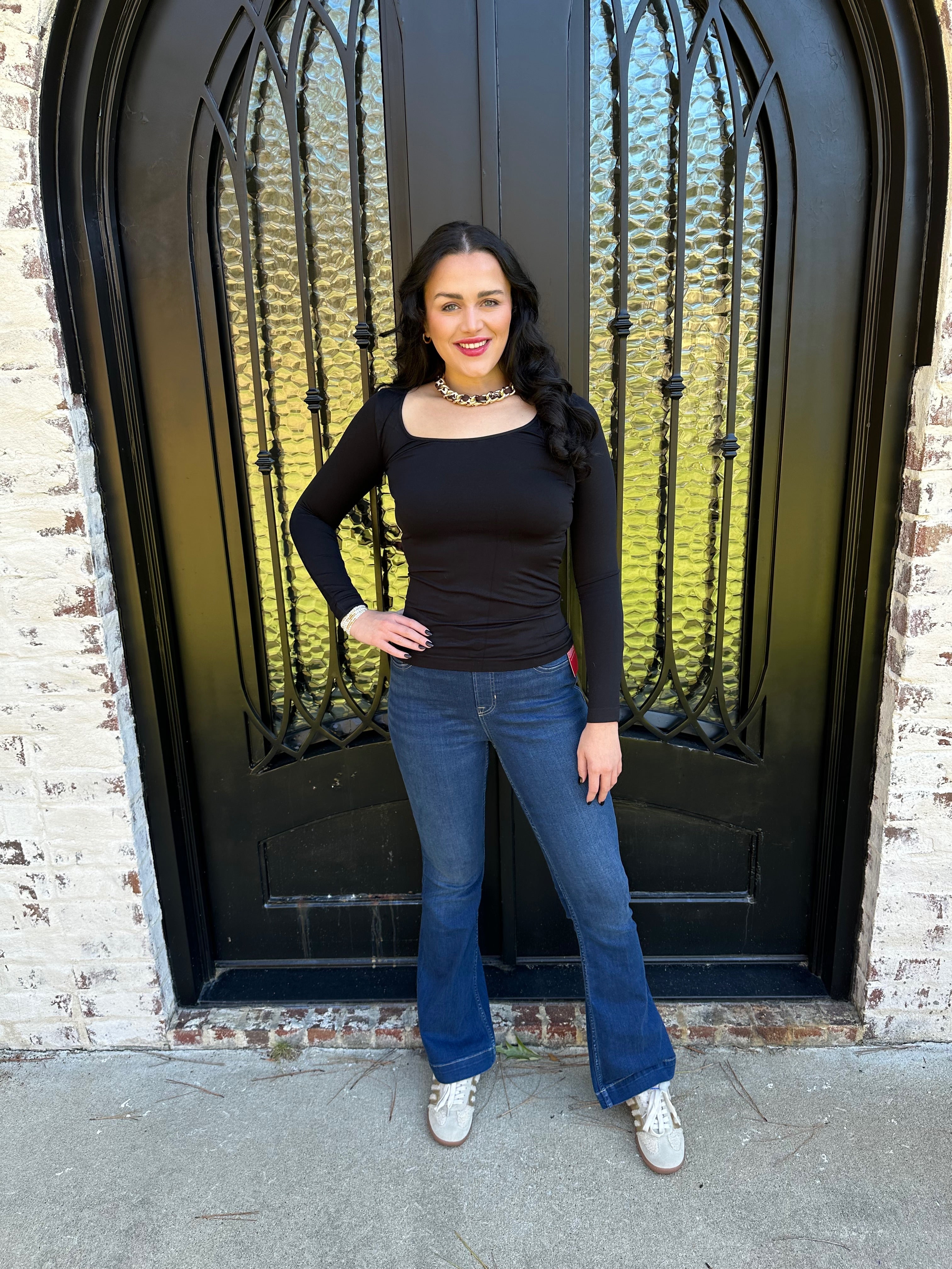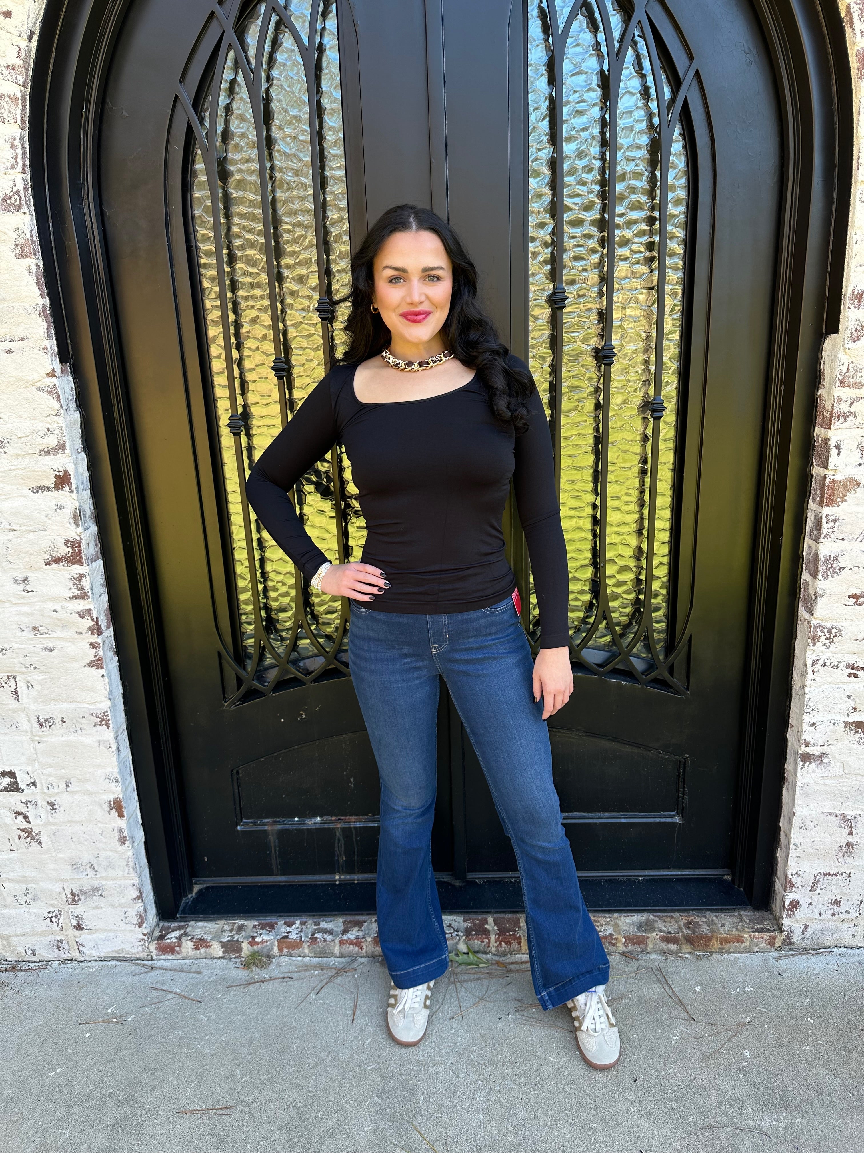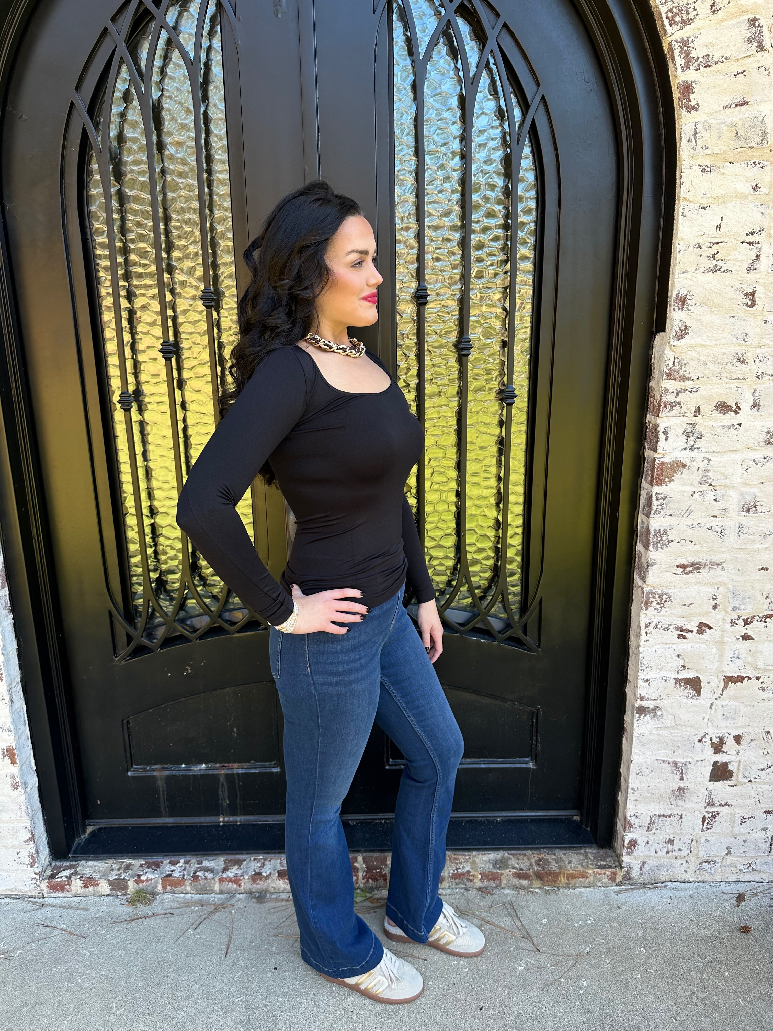A wardrobe staple that does it all. This longsleeve scoop neck top in Black offers clean, classic styling that pairs with everything from jeans to skirts to tailored trousers. The relaxed scoop neckline provides a flattering, comfortable fit, while long sleeves add dimension and coverage. Simple yet sophisticated, this basic top is the foundation piece you'll reach for again and again. Perfect for layering or wearing on its own, it's an investment in timeless style that never goes out of fashion.