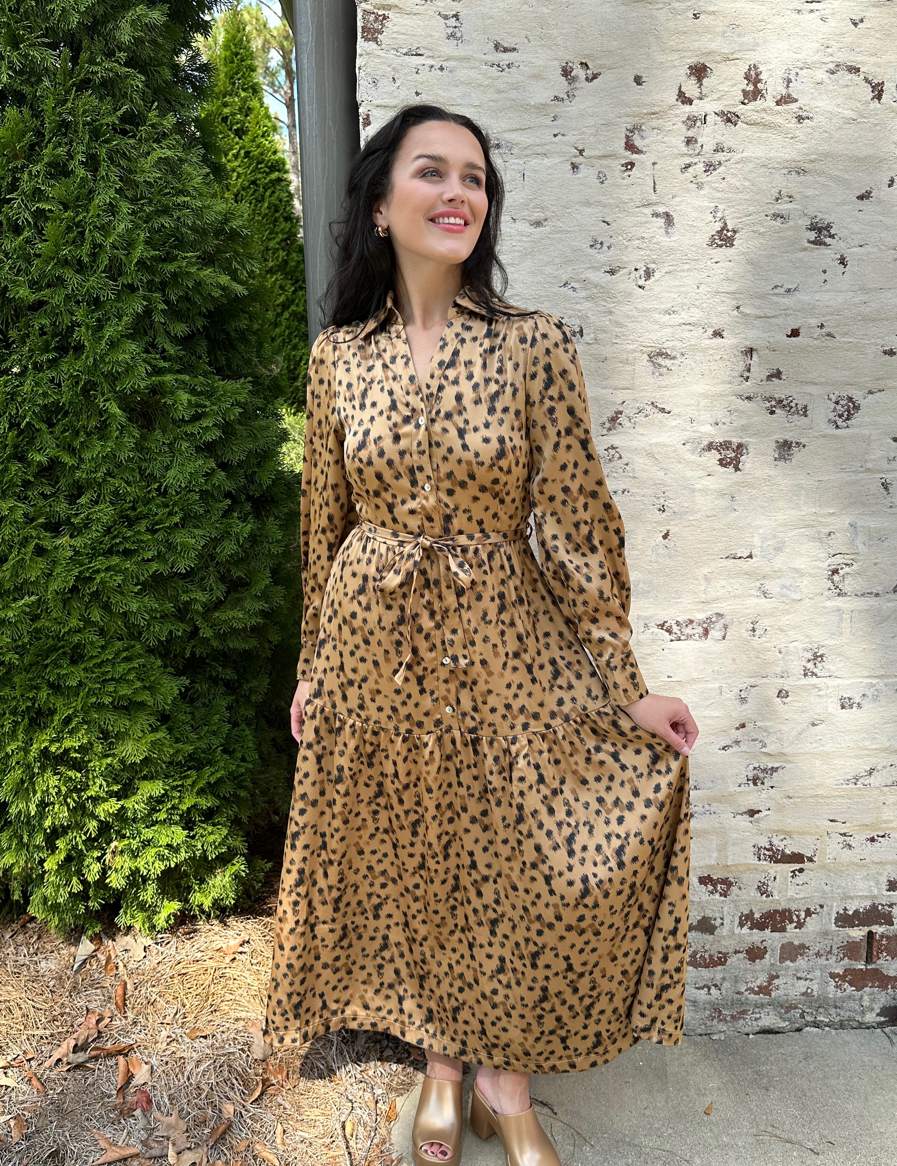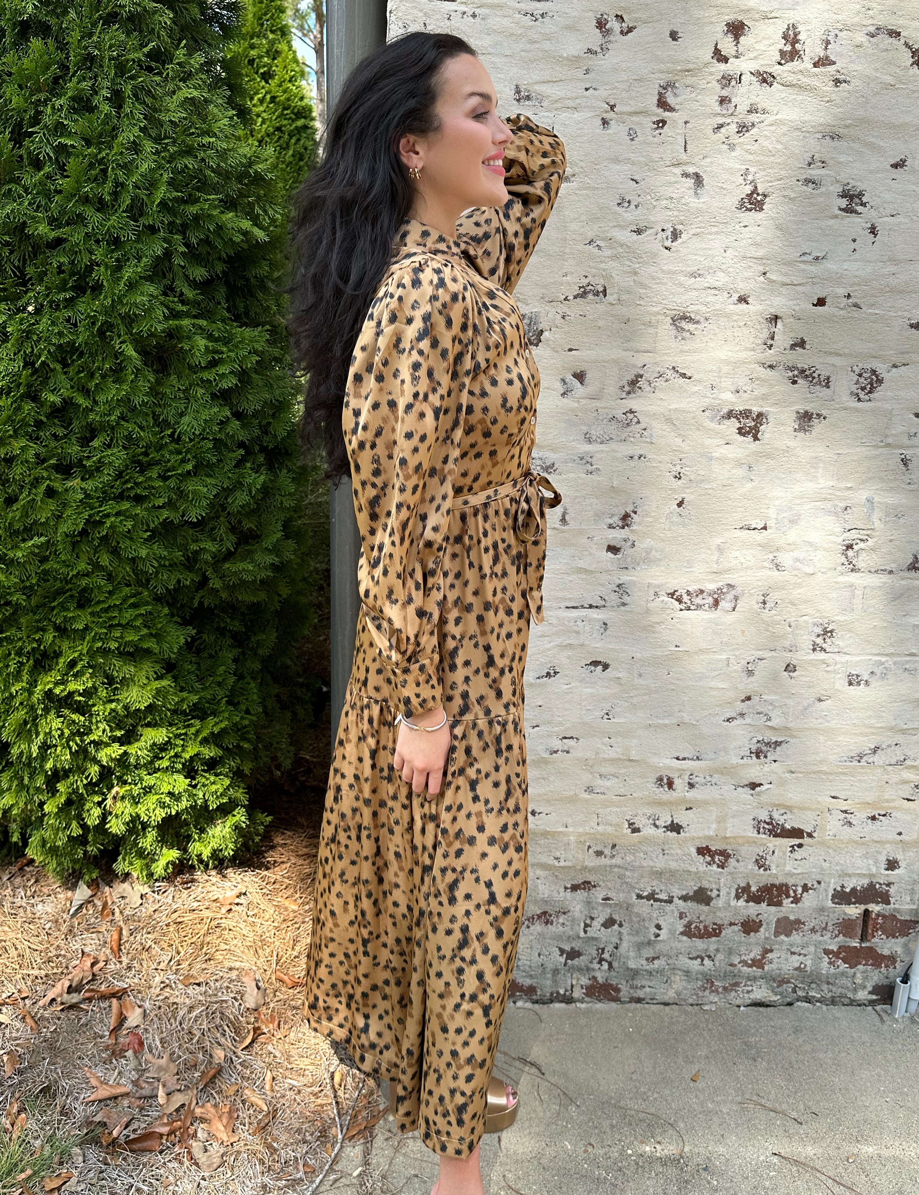 Button Down Tiered Dress in Leopard Print