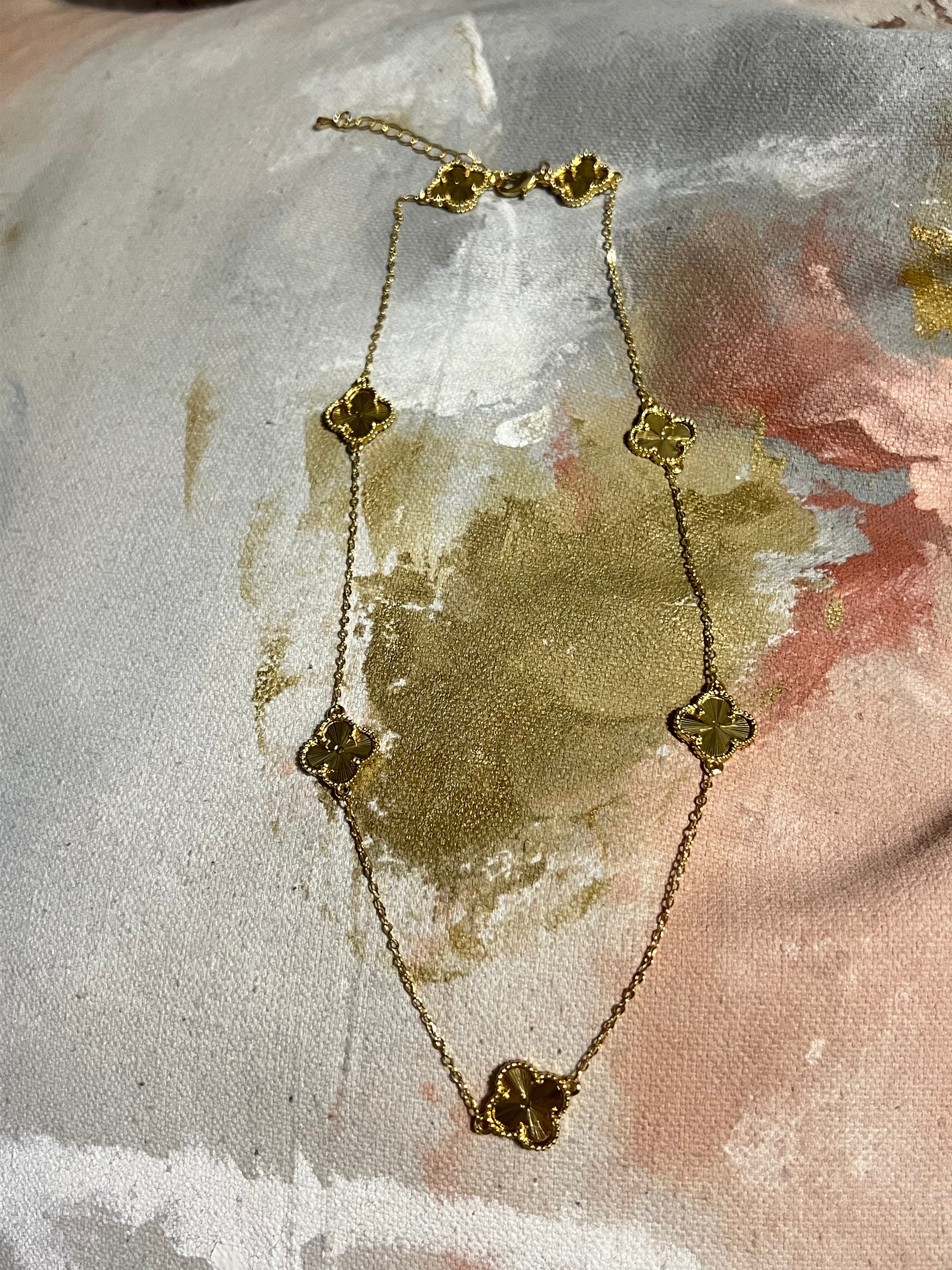Elevate your style with our exquisite 18" Gold Clover Necklace. Crafted with intricately designed gold clover pendants, this necklace exudes elegance and sophistication. Add a touch of luxury to any outfit with this exclusive piece. A must-have for any fashion-forward individual.
