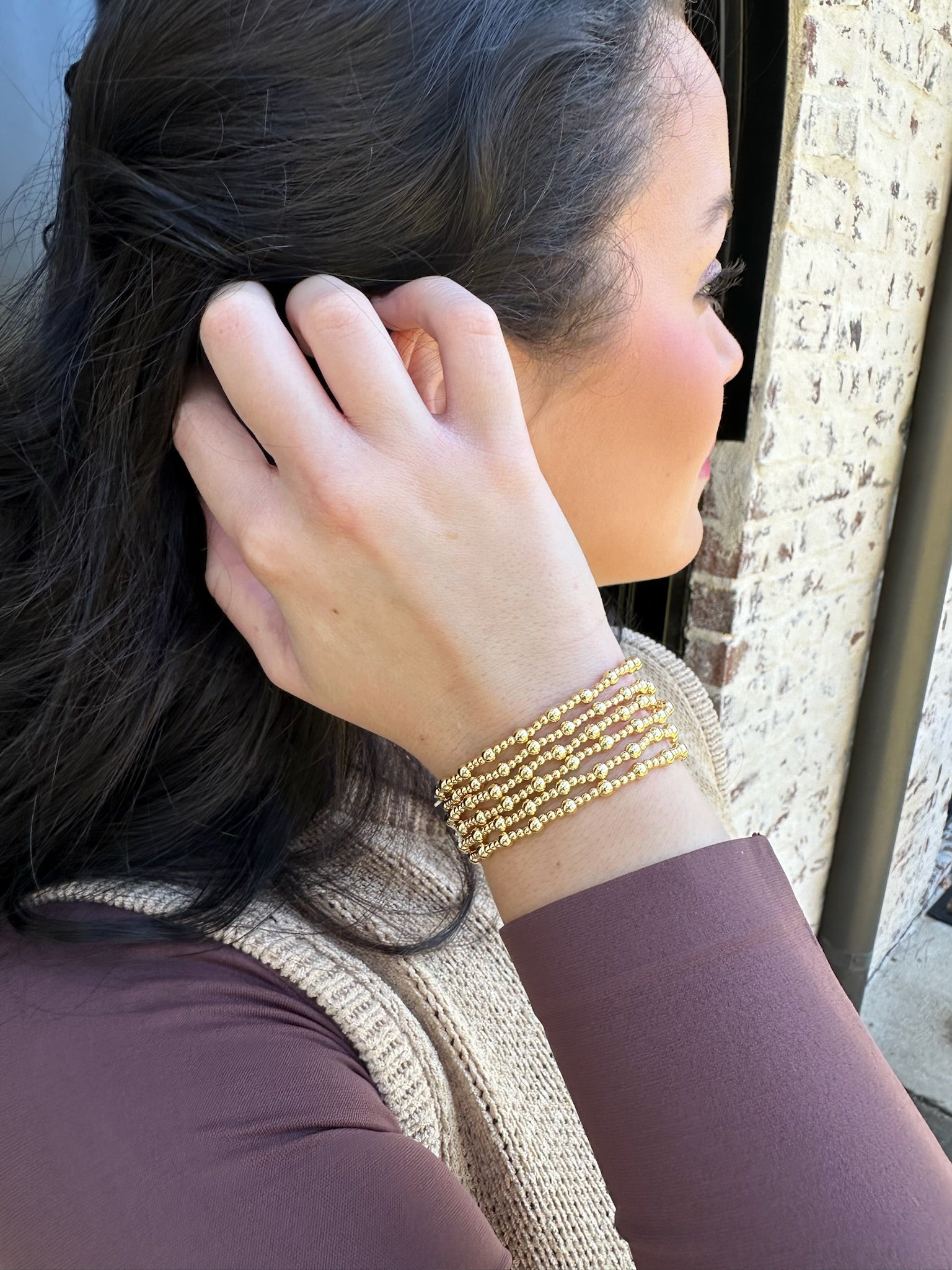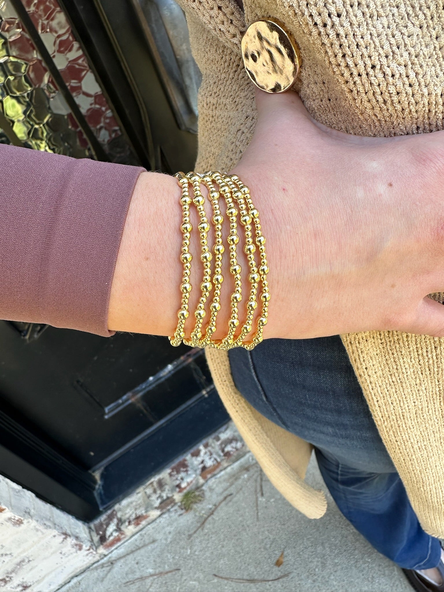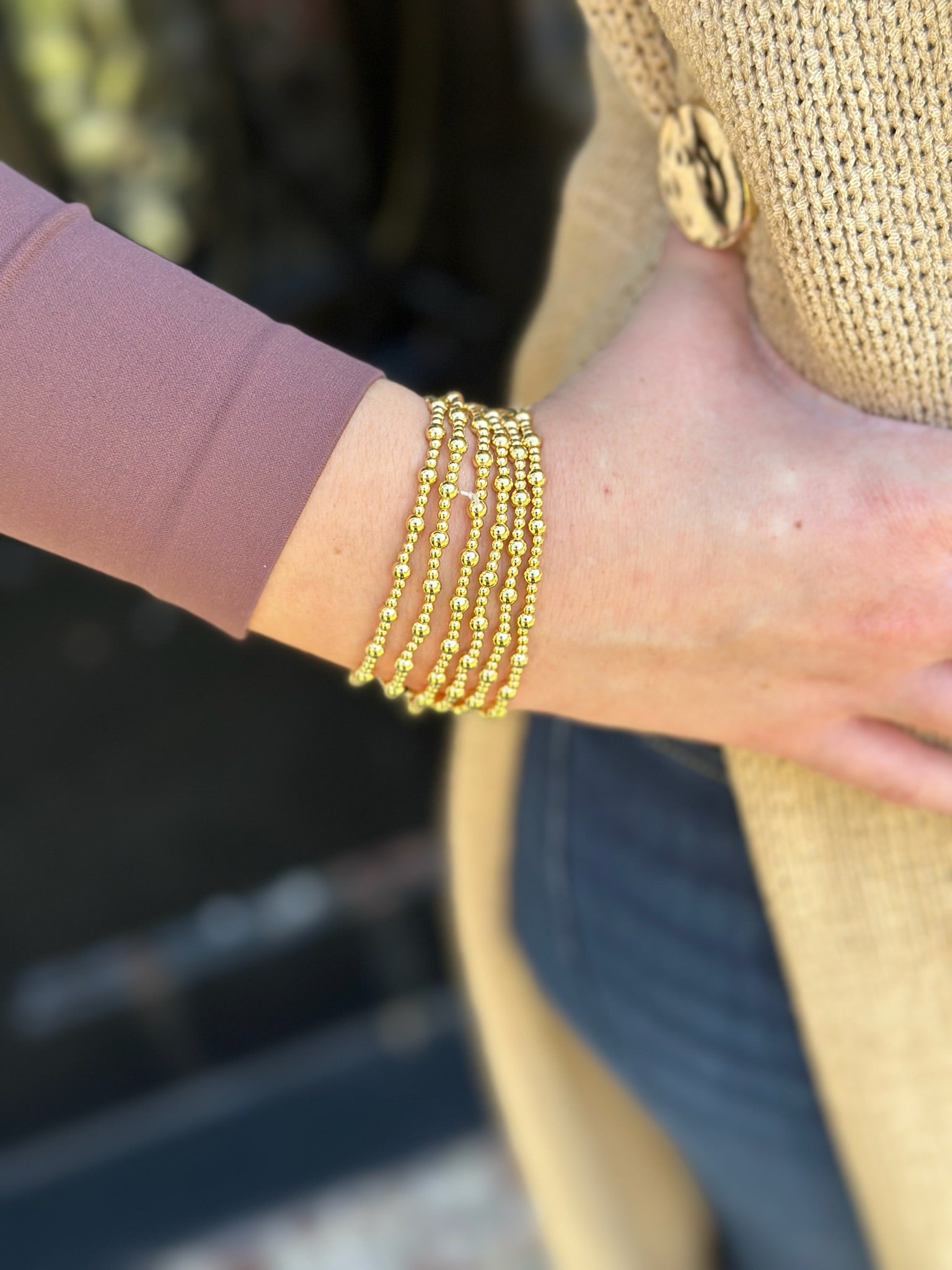 This beaded stretch bracelet showcases a refined trio pattern of gold beads, delivering visual depth and contemporary appeal. The stretch construction provides universal sizing and comfortable all-day wear, while water-resistant properties ensure durability across various environments. Its stackable design allows for curated layering, enabling personalized aesthetic expression. Engineered for longevity, each piece is protected by a lifetime warranty—a testament to superior craftsmanship. An essential addition to any jewelry collection.