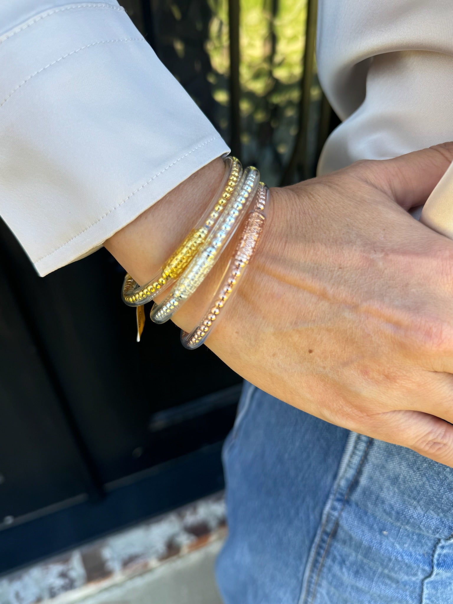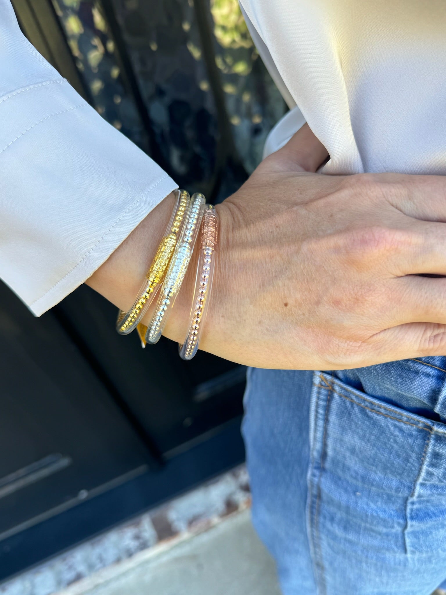 Each BIBI bangle features delicate metallic beads in BuDhaGirl’s iconic shades of Gold, Silver, and Rose Gold, nestled within crystal-clear polycarbonate tubing. These luminous beads evoke tiny, self-contained worlds, linked together like the moments of a lifetime. Slipping on your BIBI bangles becomes a meditative ritual, a reminder of the beauty found in life’s small yet significant connections.