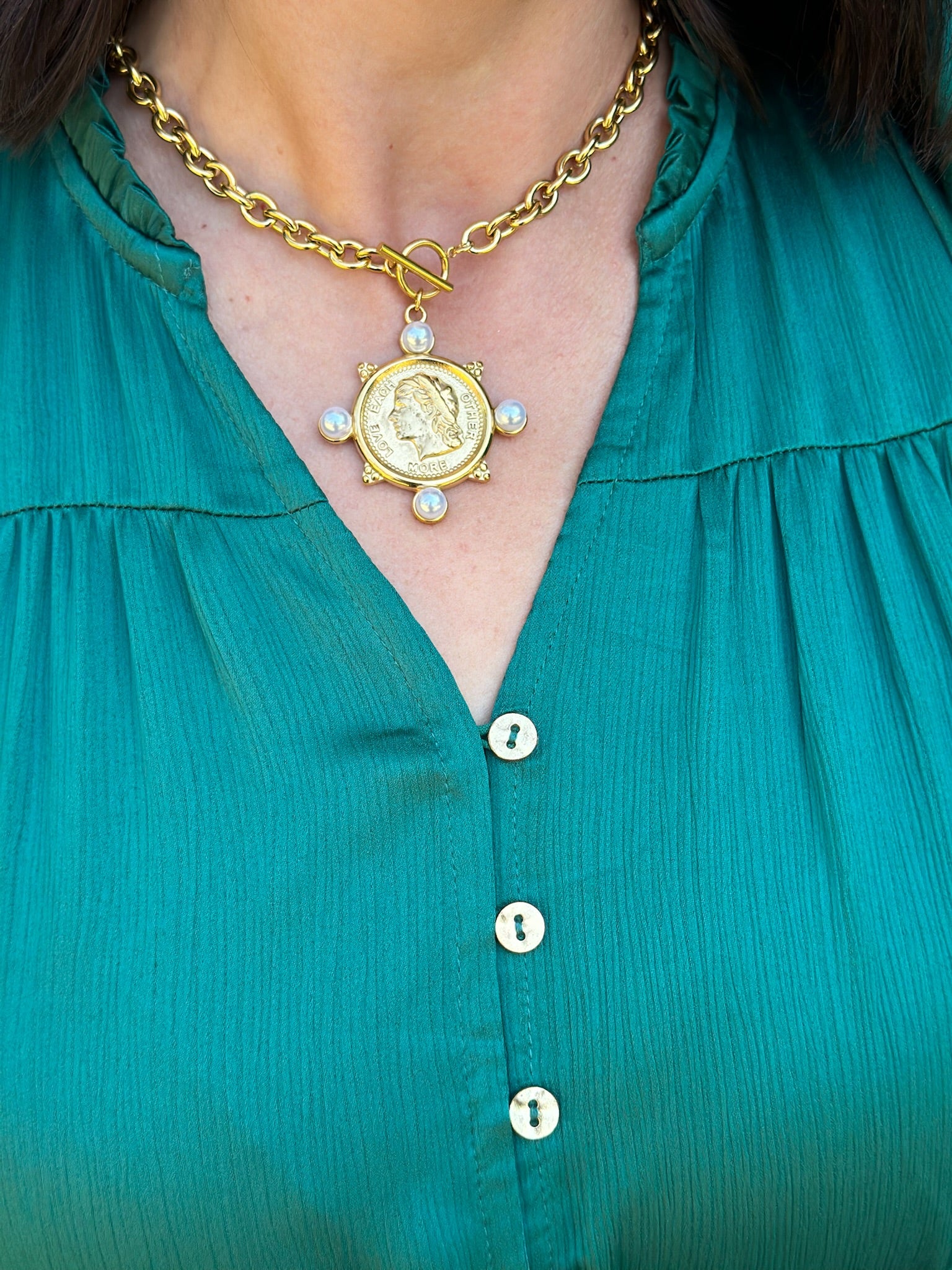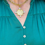 The Chansutt Pearl Coin Necklace in Gold is a stunning statement piece that effortlessly elevates any outfit. Featuring radiant pearls paired with an elegant coin, this necklace combines timeless beauty with modern style. Durable and water resistant, it’s designed to withstand daily wear while maintaining its shine. Backed by a lifetime warranty, this necklace promises lasting quality and confidence in your investment. Make a bold and sophisticated impression wherever you go with this exquisite accessory.