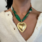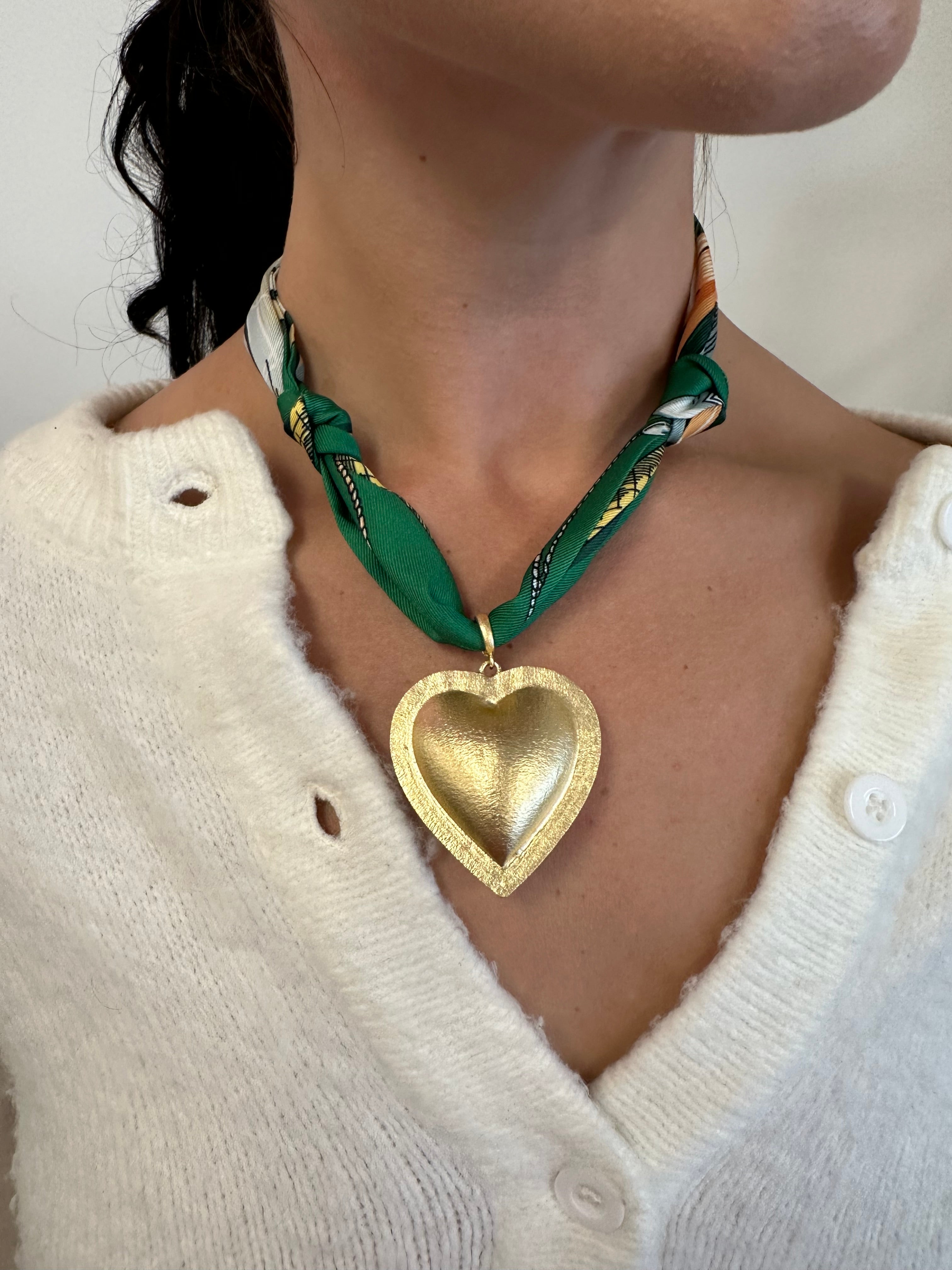 This elegant scarf necklace features a large reversible matte gold heart pendant, adding a touch of sophistication to any outfit. The open screen back allows for versatility. Perfect for those looking to make a stylish statement.