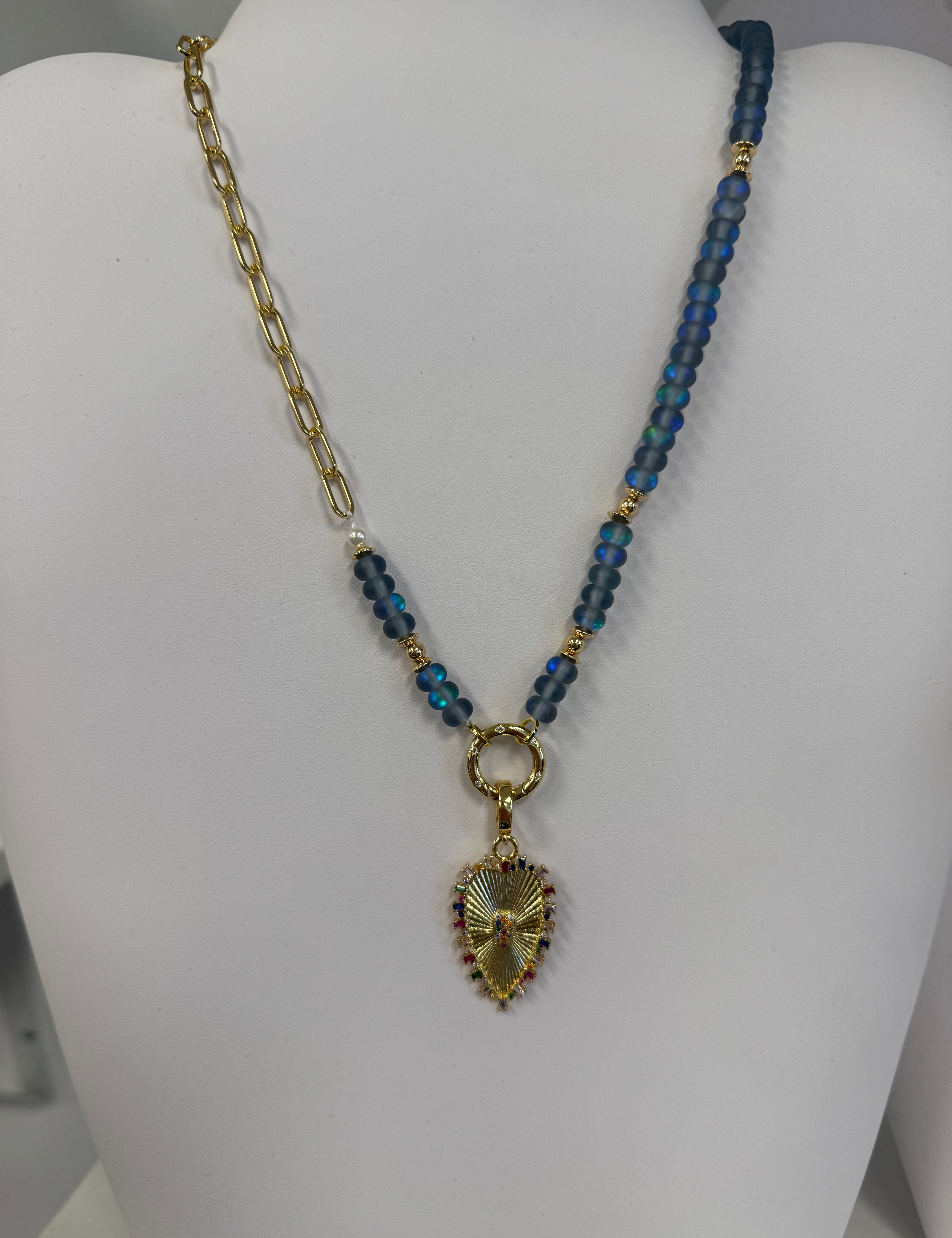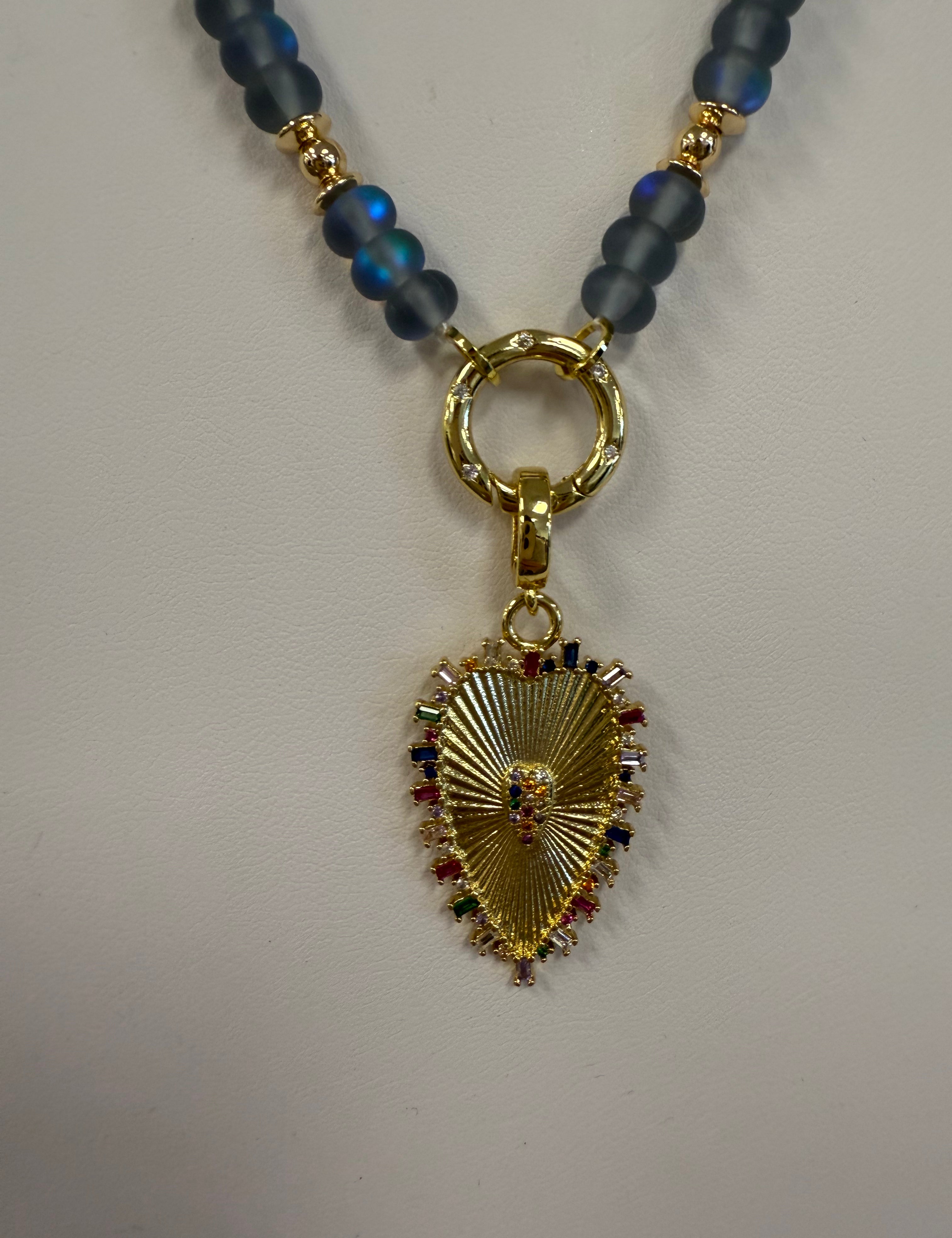 Beaded & Gold Multi Color Heart Necklace in Iridescent Blue