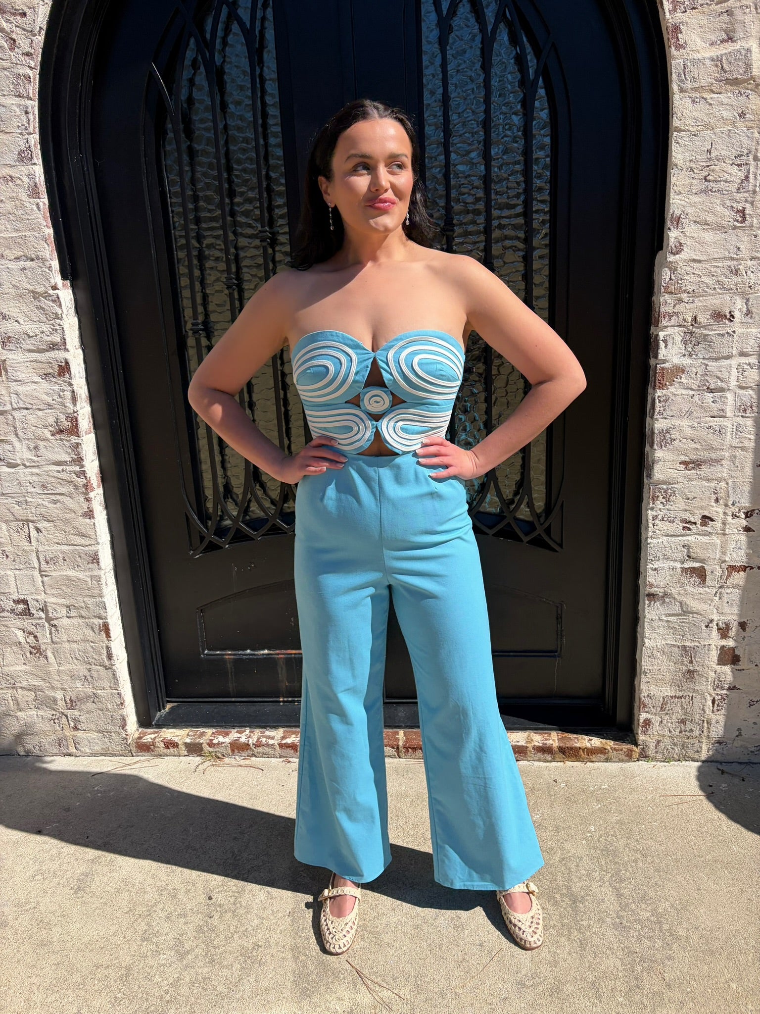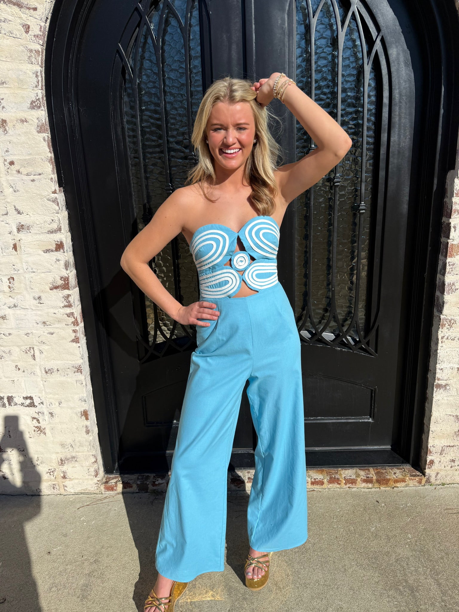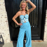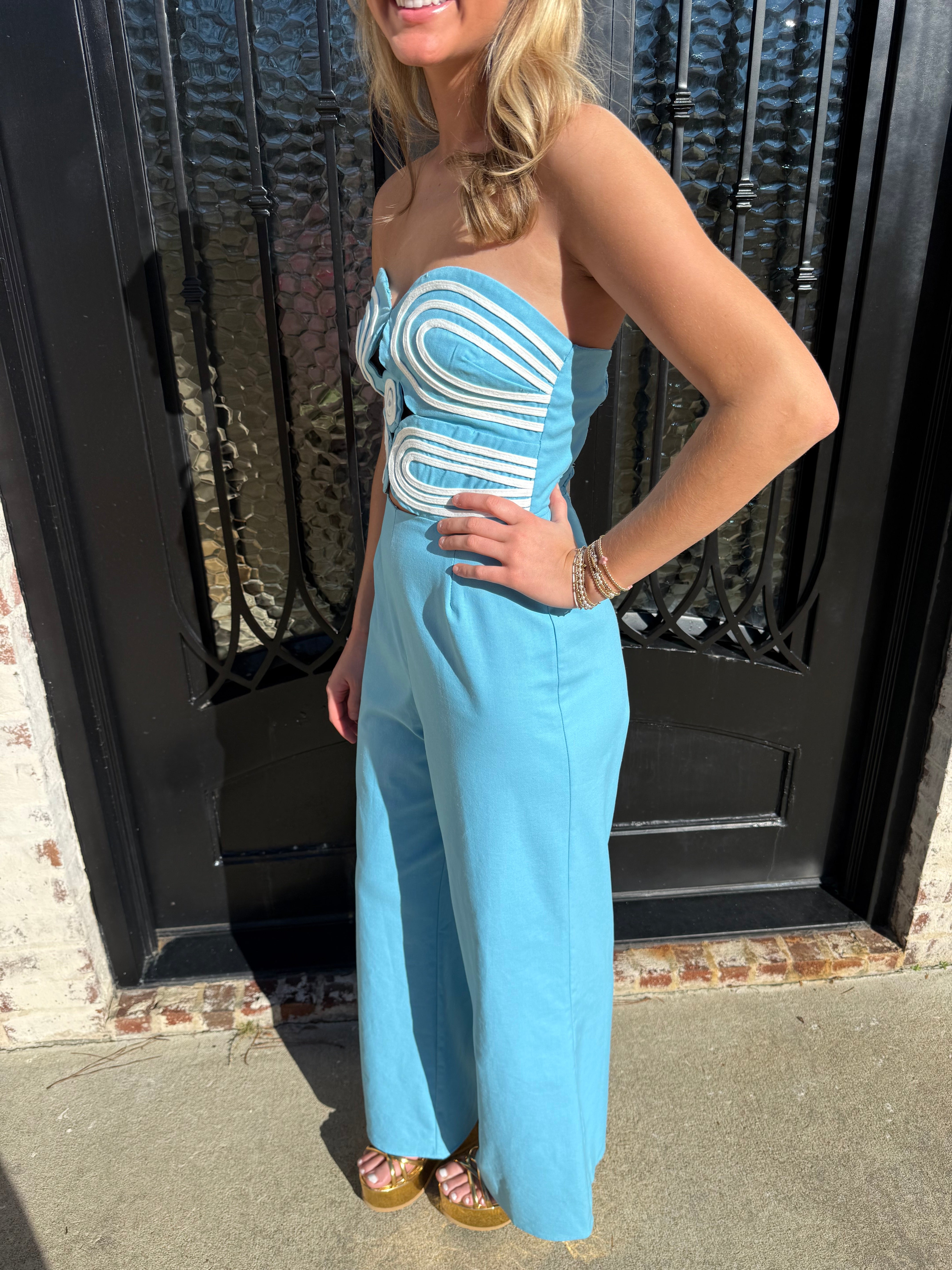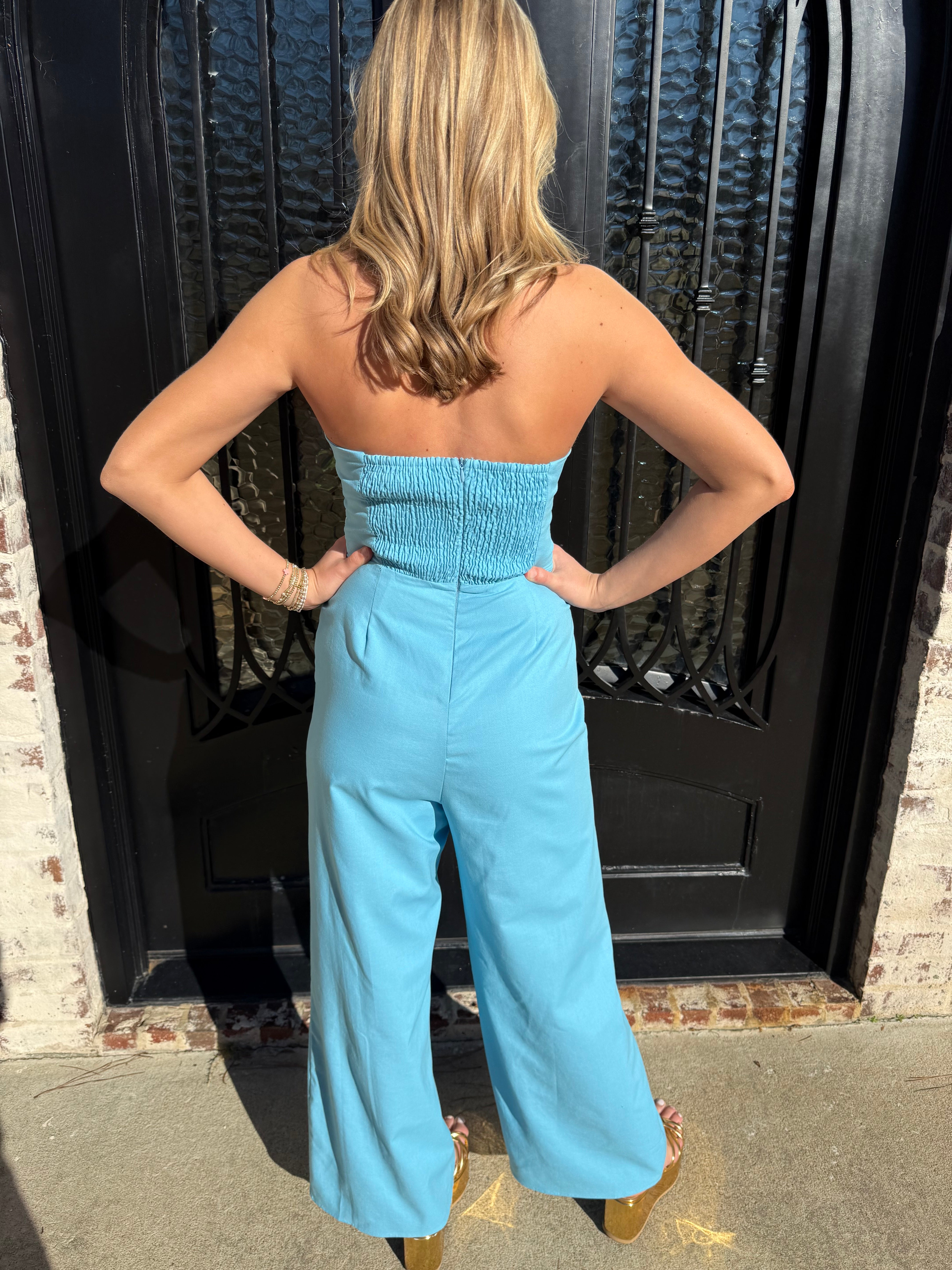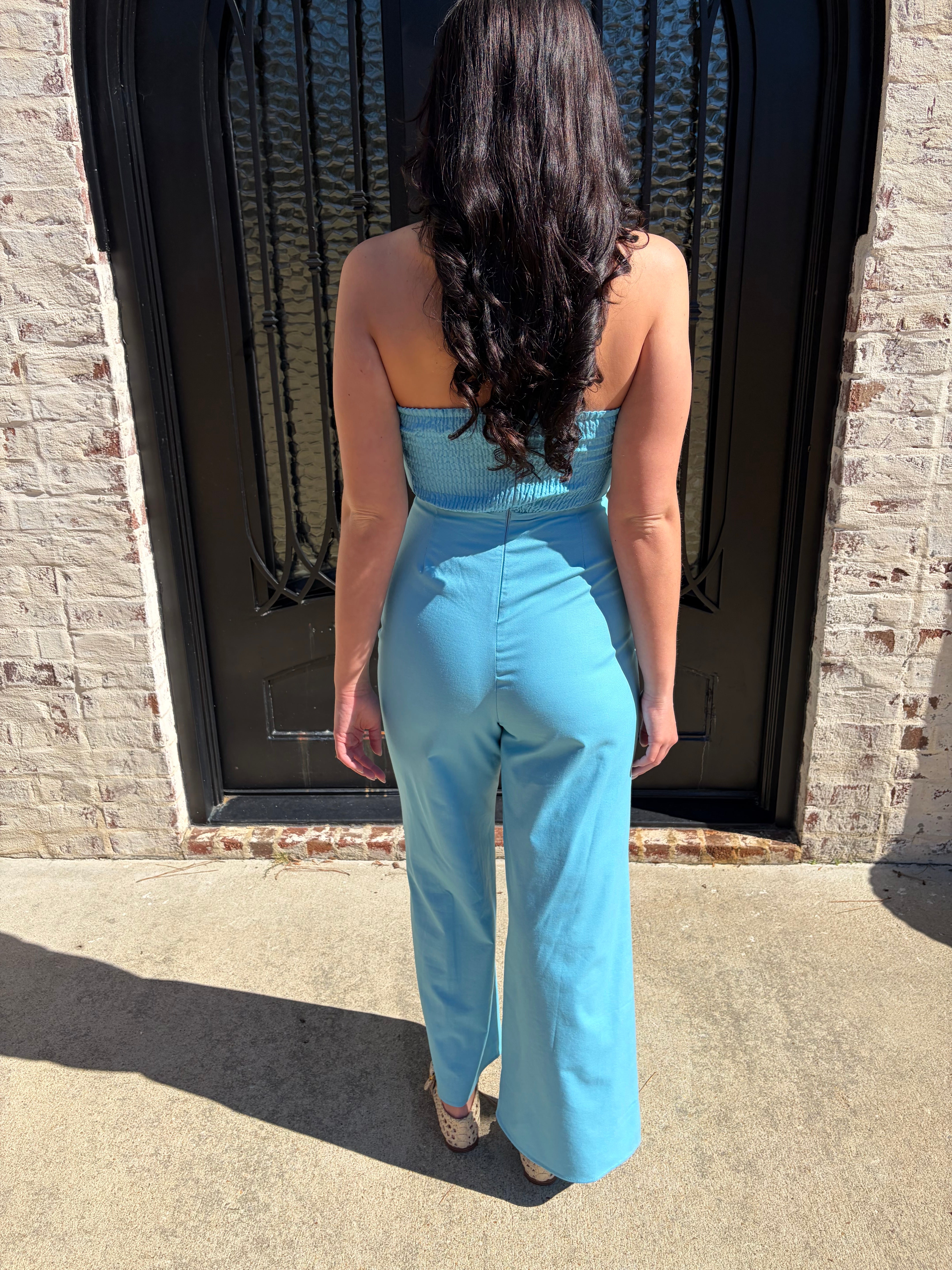 Dive into the Ashton Jumpsuit, where fashion meets fun in a splash of aqua blue and cream stripes! With a smocked back and hidden zipper, this strapless stunner is perfect for vacation vibes (or just strutting around your living room). Get ready for compliments hotter than a summer day!