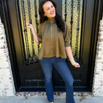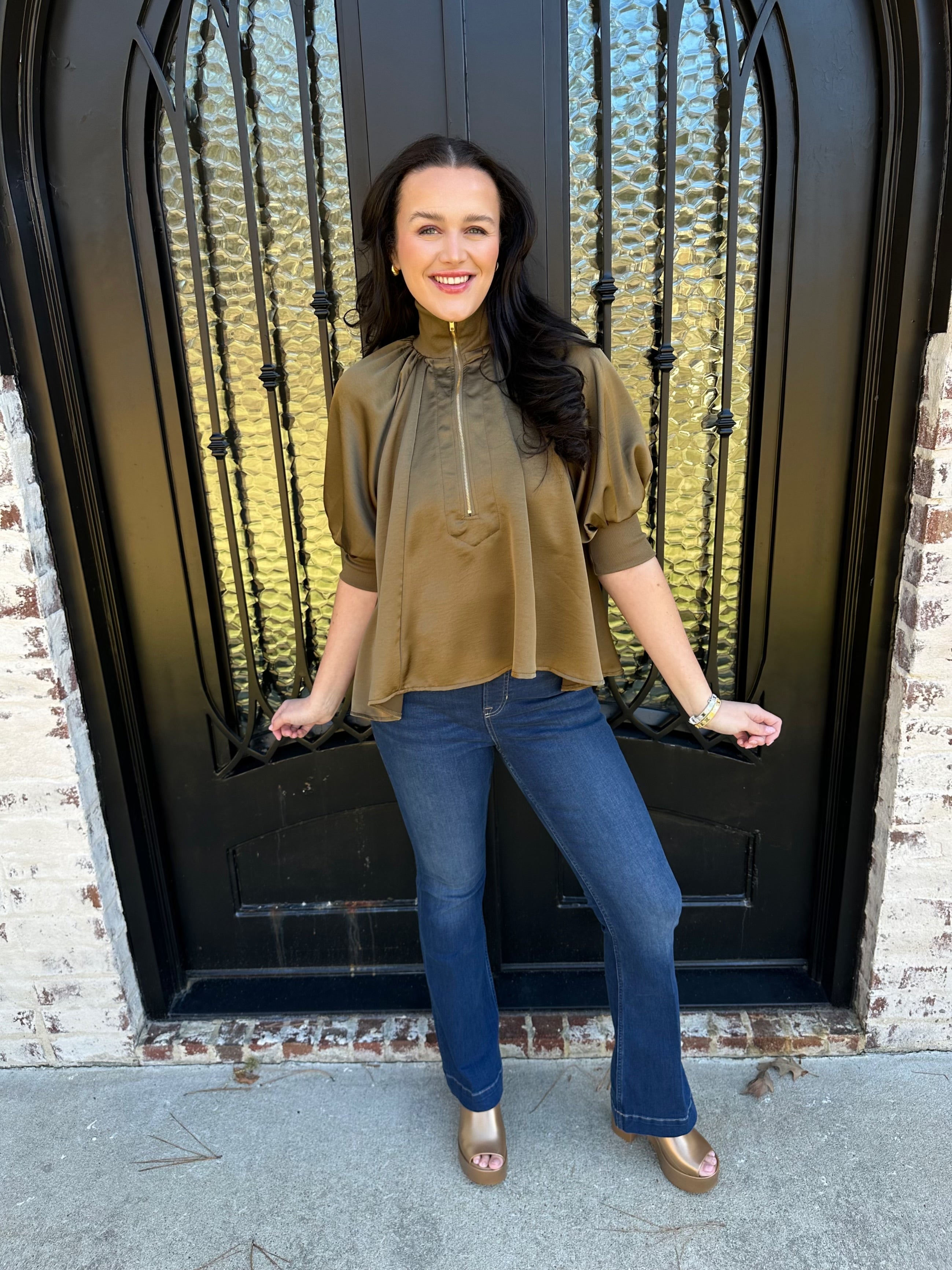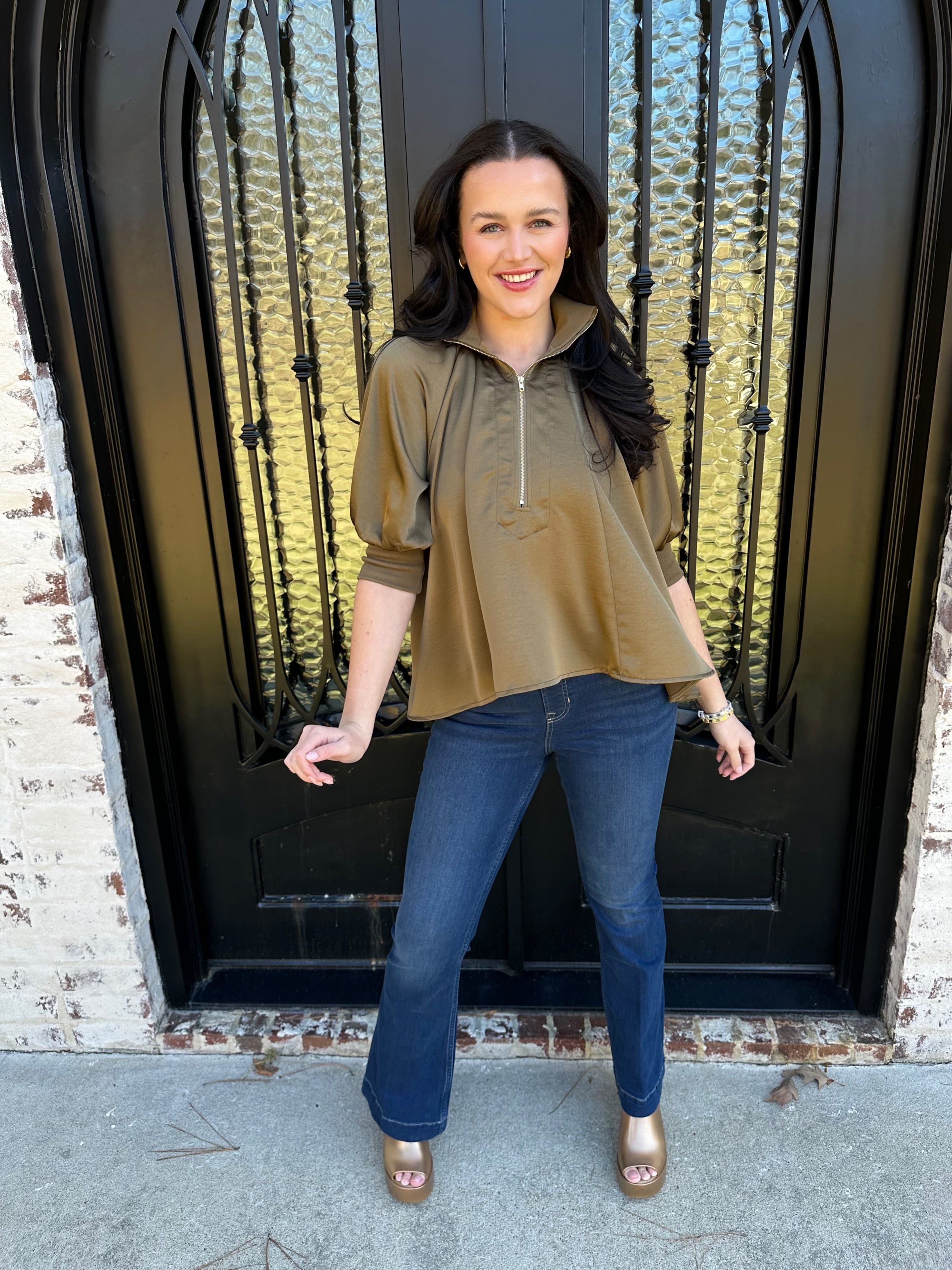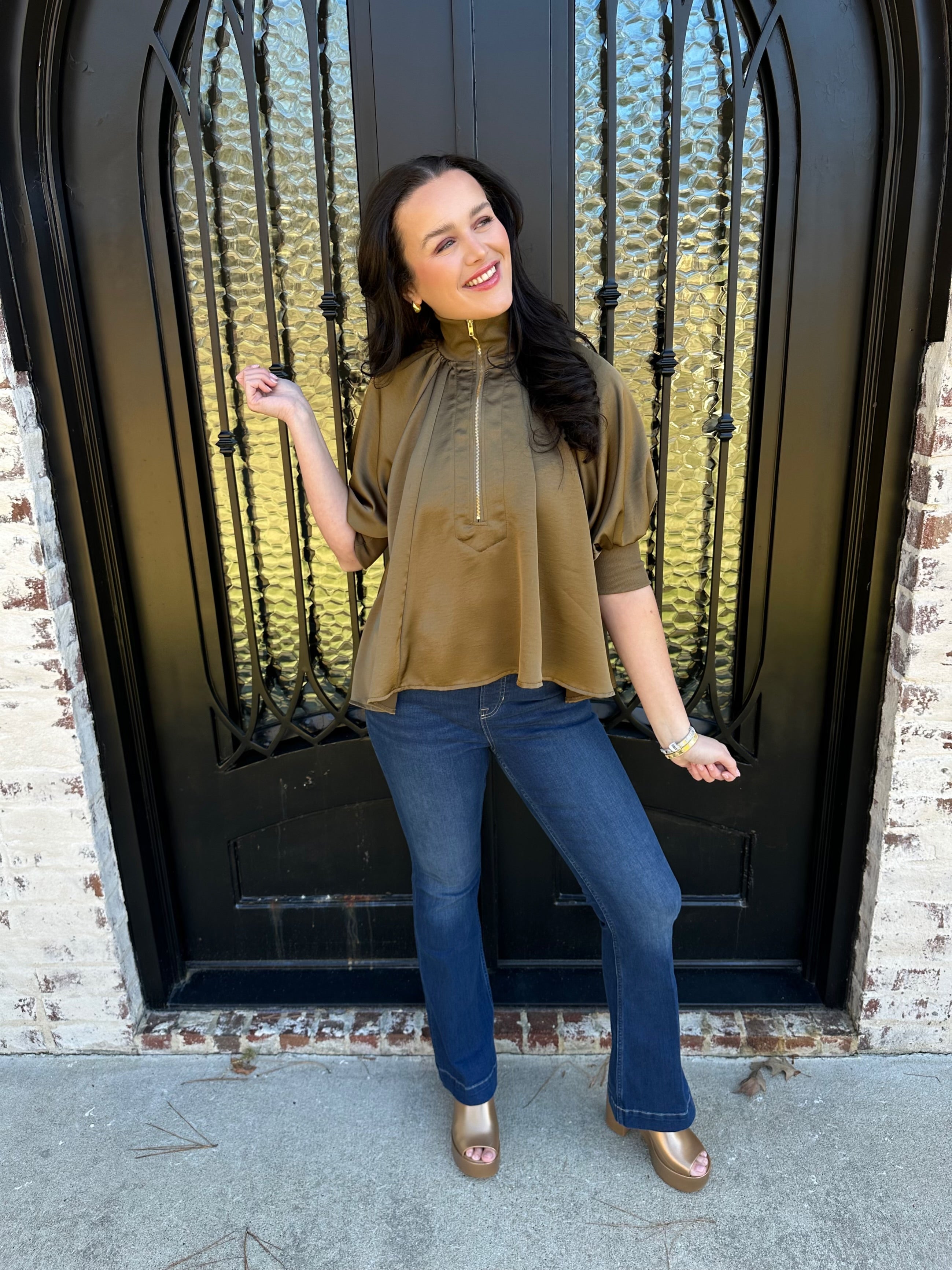 The Attley Mock Neck Zip Up Blouse in Olive is your go-to layering essential. Its clean mock neck design and functional front zipper offer flexibility—wear it buttoned up for a refined look or unzipped over your favorite tee for casual appeal. The sophisticated olive shade works with virtually everything in your closet, from tailored pants to relaxed denim. Whether you're heading to work or weekend plans, this blouse delivers timeless style and comfort that keeps you looking put-together all day long.