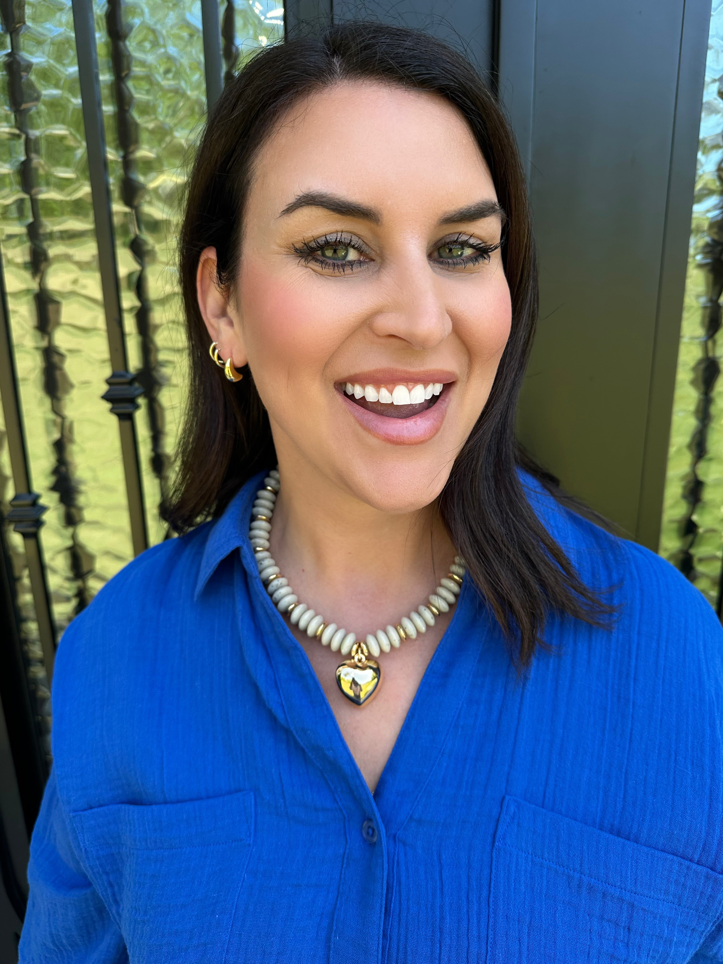 Say hello to your newest fav necklace with this neutral beauty! We are in love with beige beads on this necklace and of course the gold heart brings this piece all together for a feminine romantic finish!