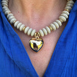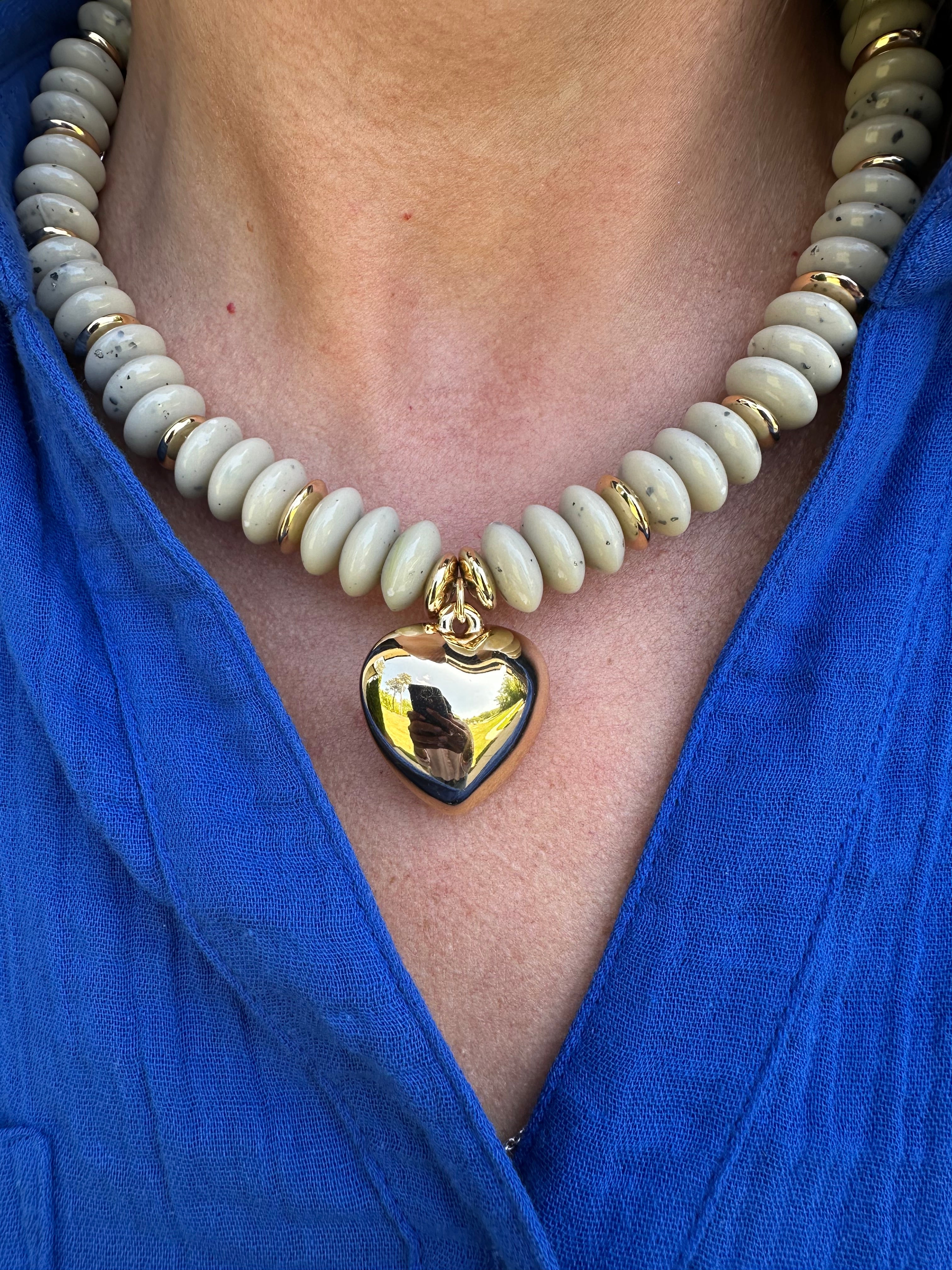 Beige Marble Wide Beaded Necklace with Gold Heart Pendant