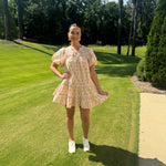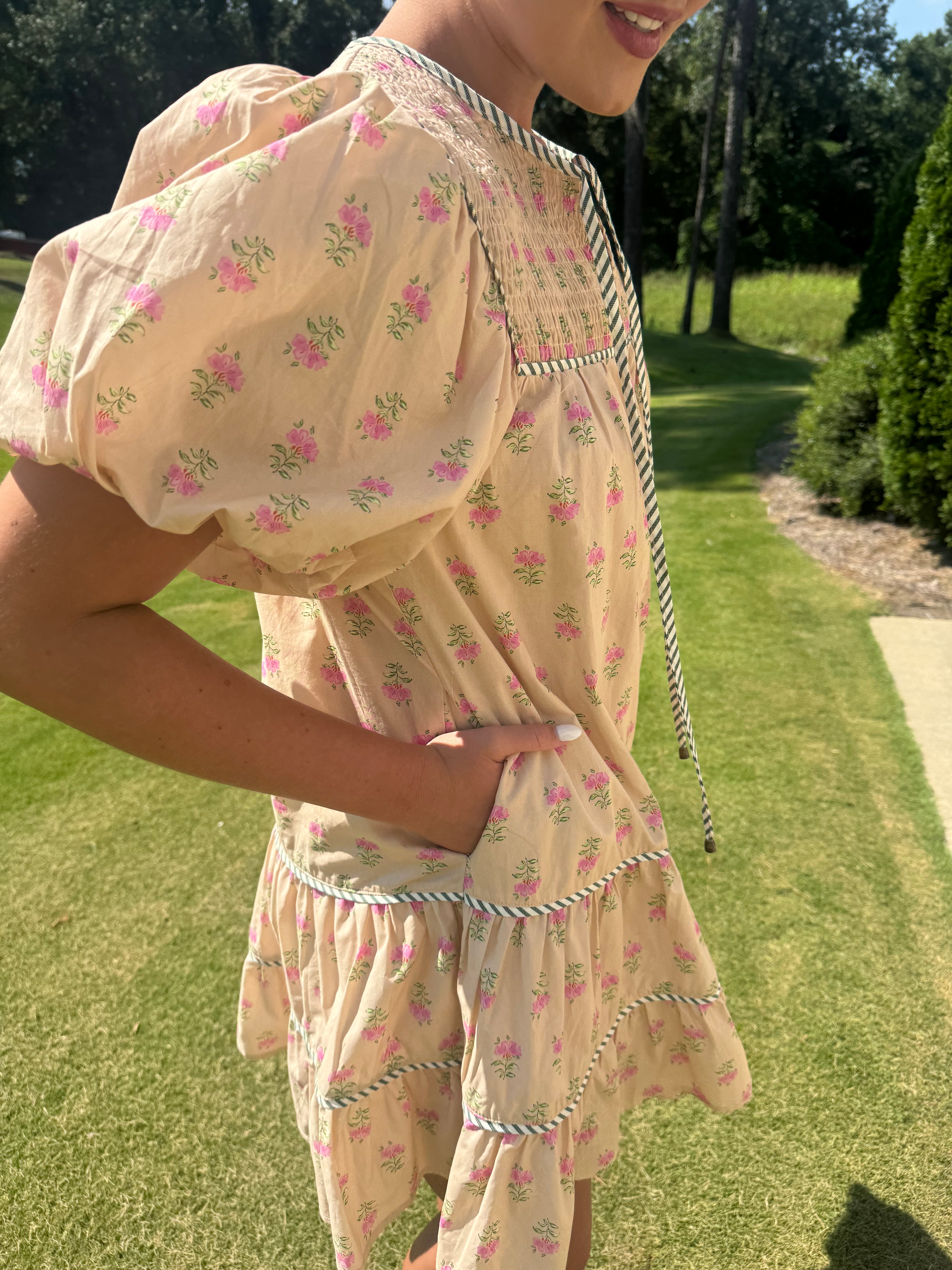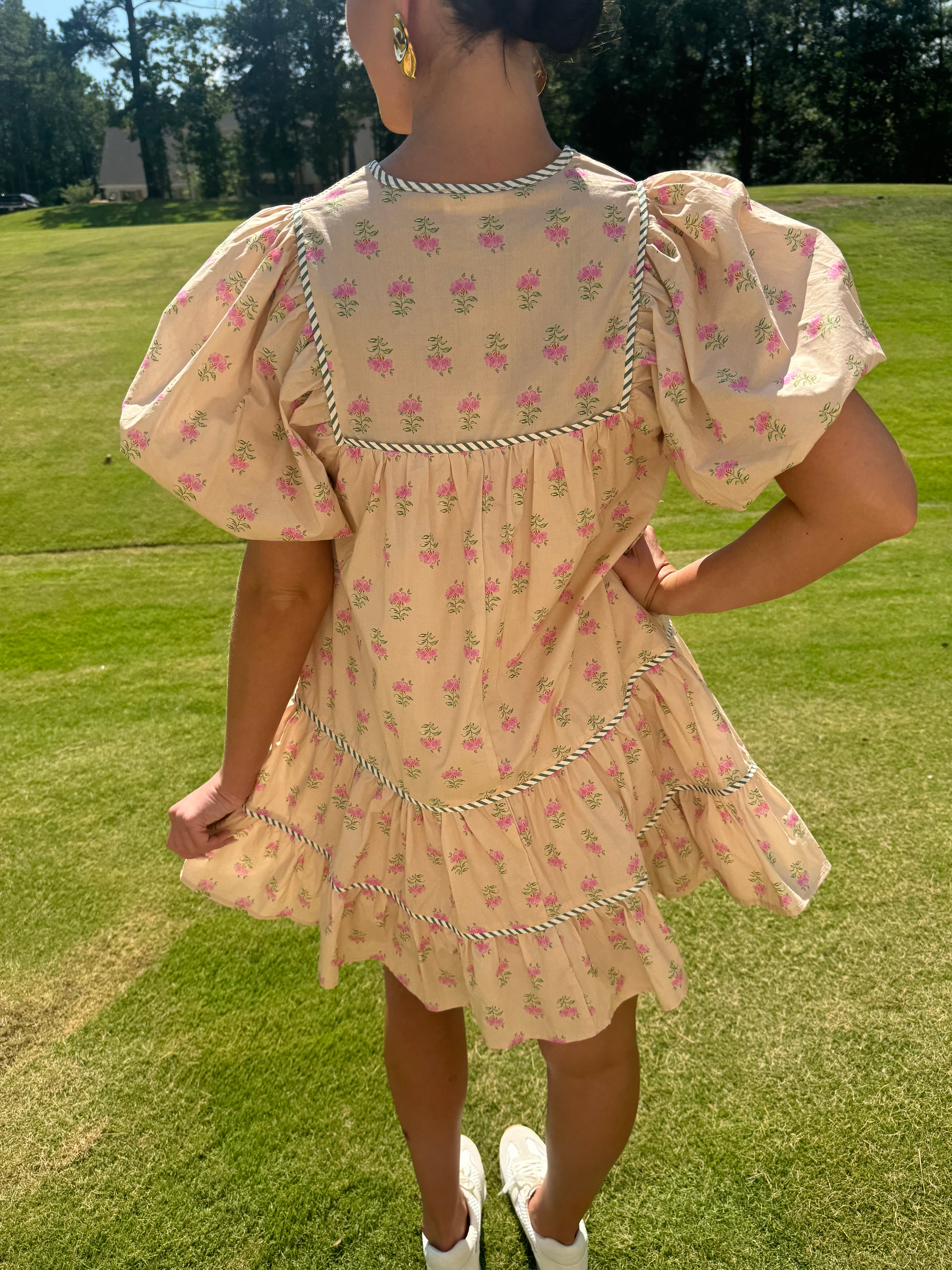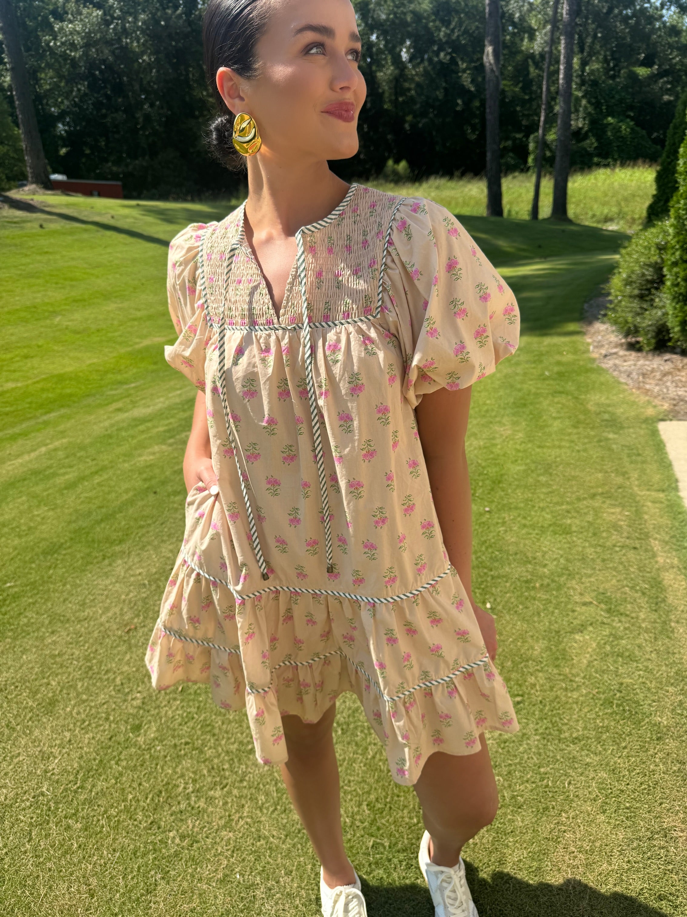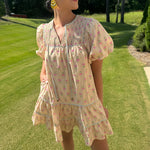 The Dorris Dress in ecru features delicate mini floral patterns combined with subtle striped detailing, creating a charming and elegant look. Its light, neutral tone makes it versatile for various occasions, while the intricate design adds a touch of sophistication to your wardrobe. Perfect for those seeking a blend of classic style and modern flair.