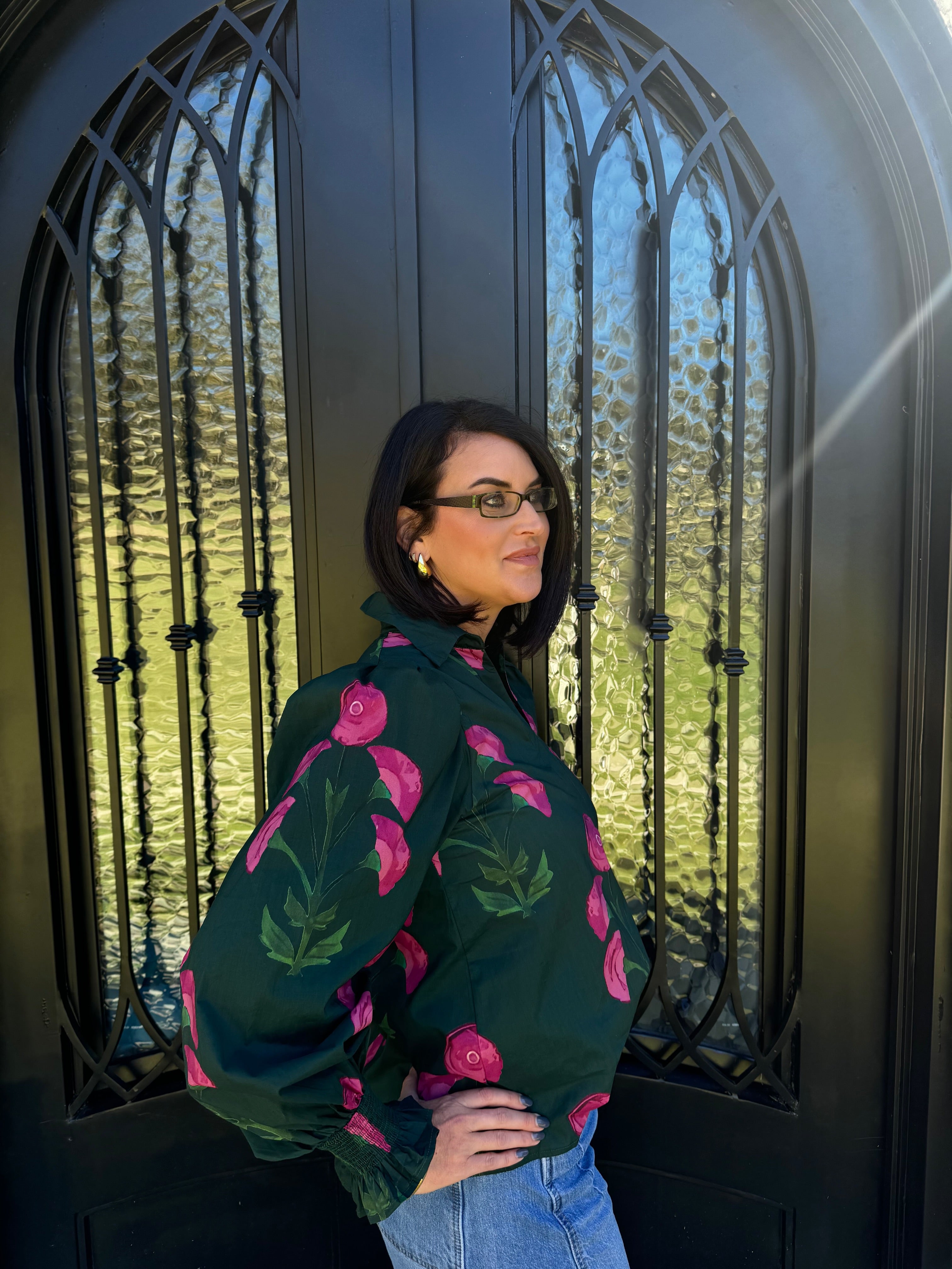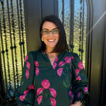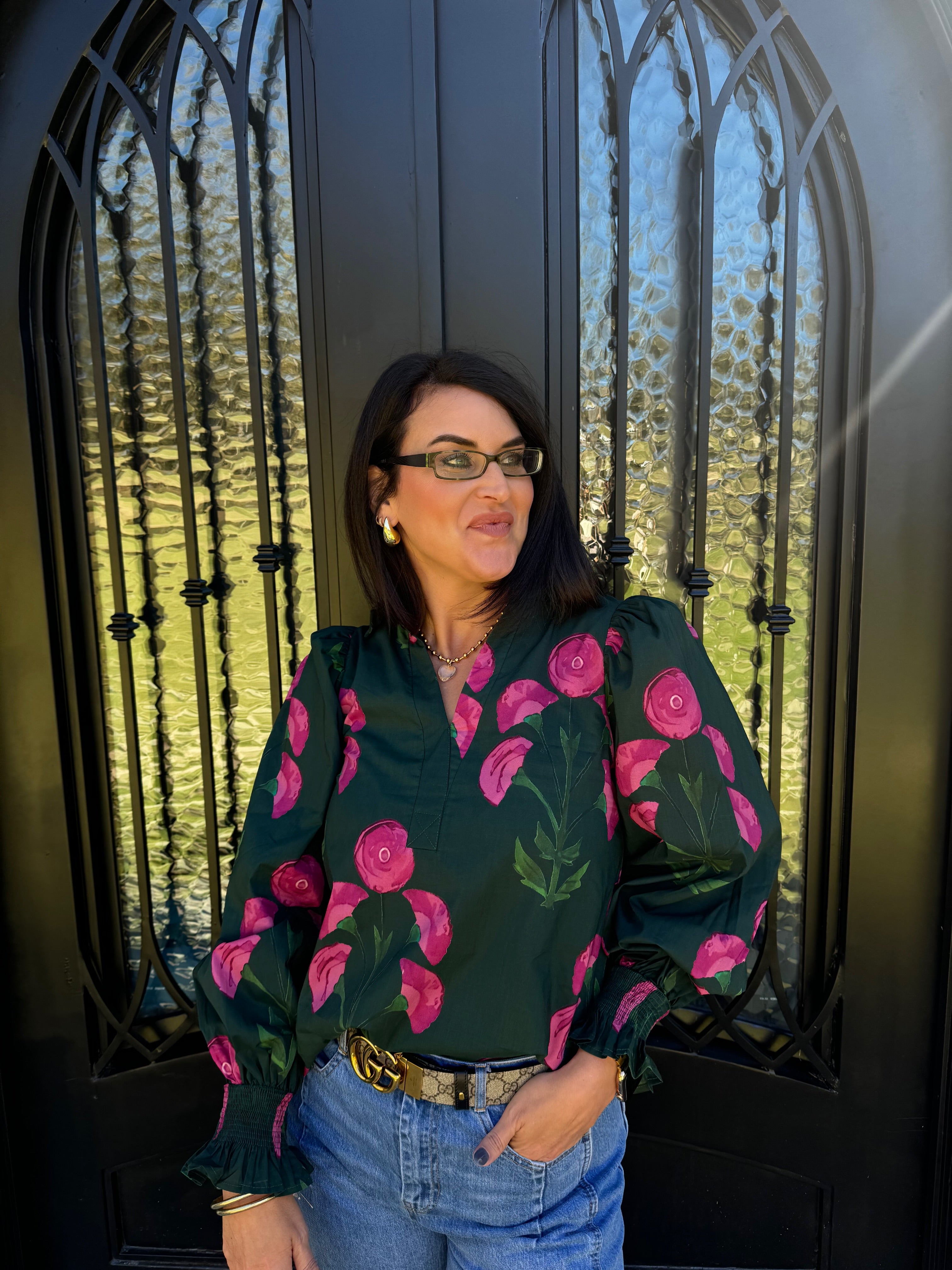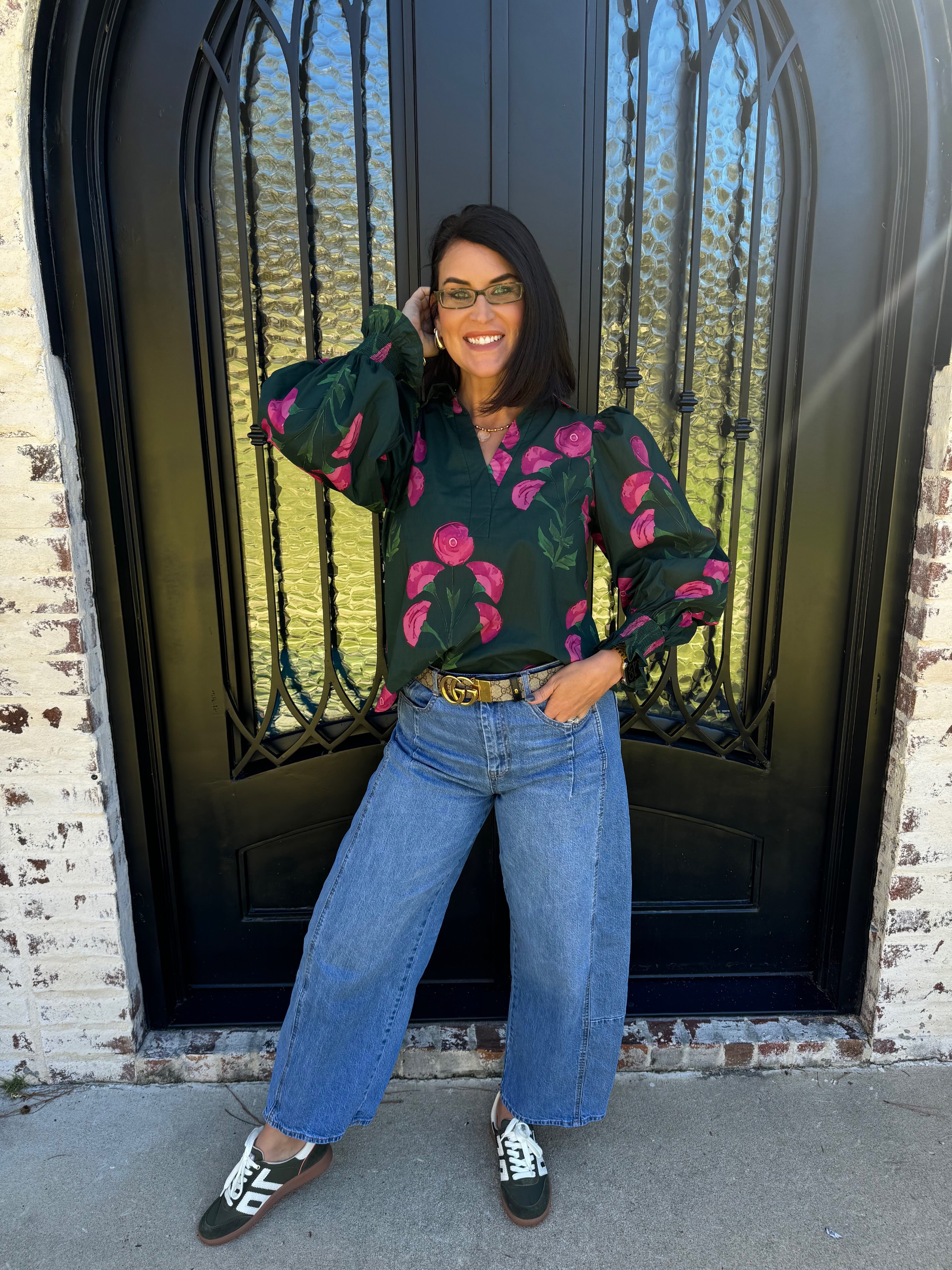 The Marni Top in Hunter Green brings timeless elegance with its V-neck design, long sleeves, and elastic cuffs for a comfortable, stylish fit. Its delicate pink floral pattern adds a vibrant contrast that brightens any outfit. Pair it with our best-selling Tractor Barrel Jeans and finish the look with our olive and orange back 70s sneakers for a perfect blend of retro flair and contemporary edge.