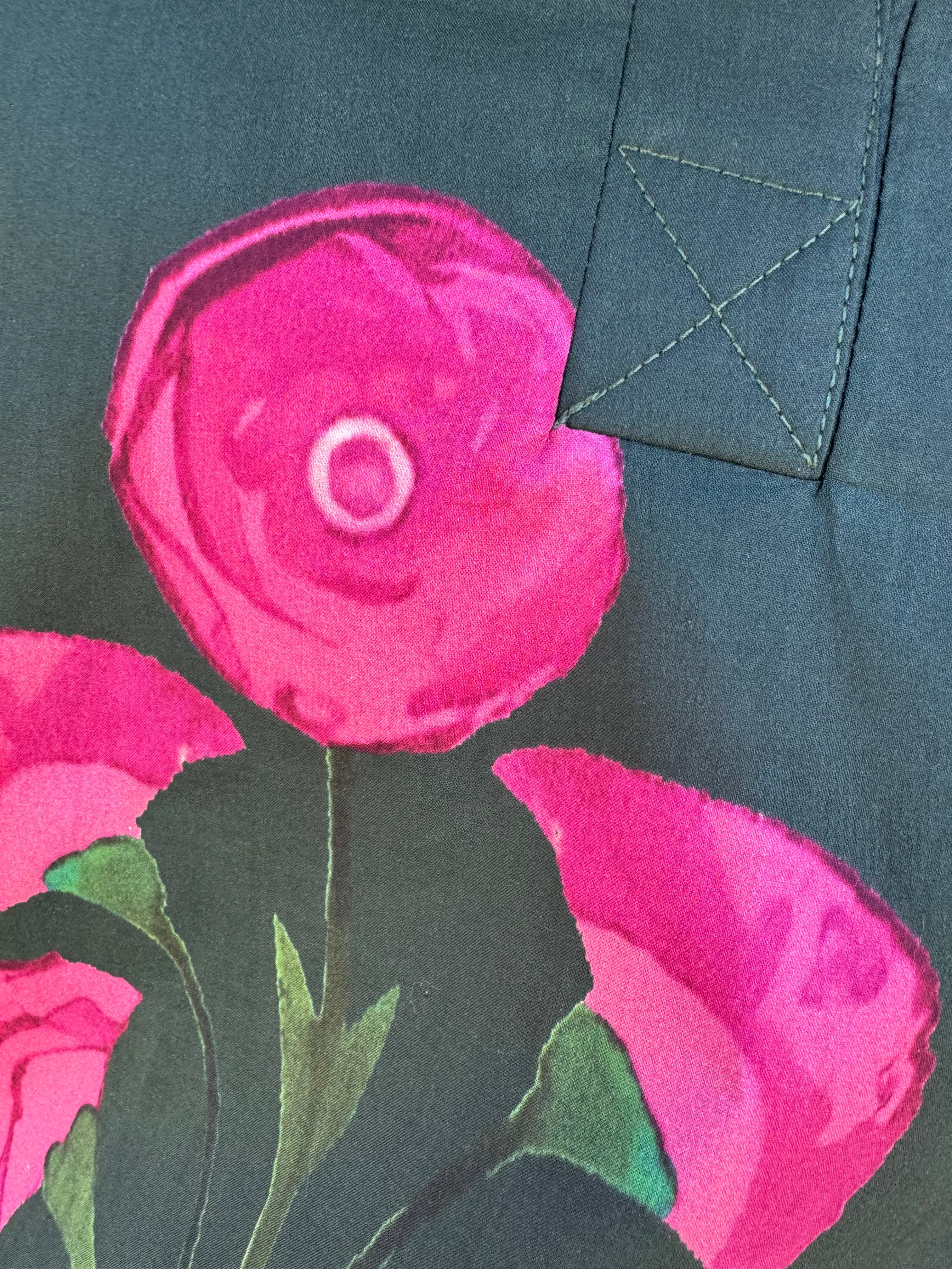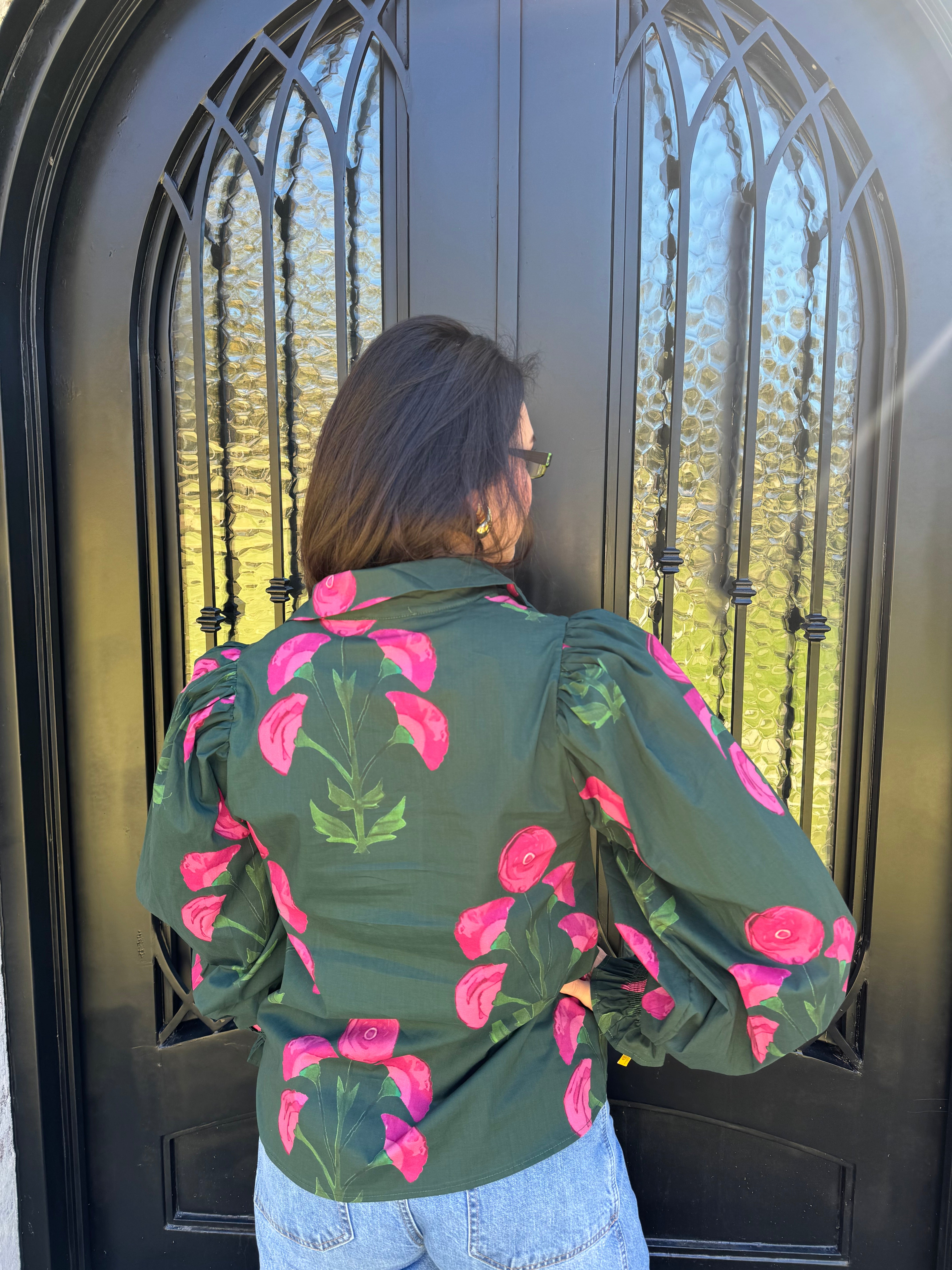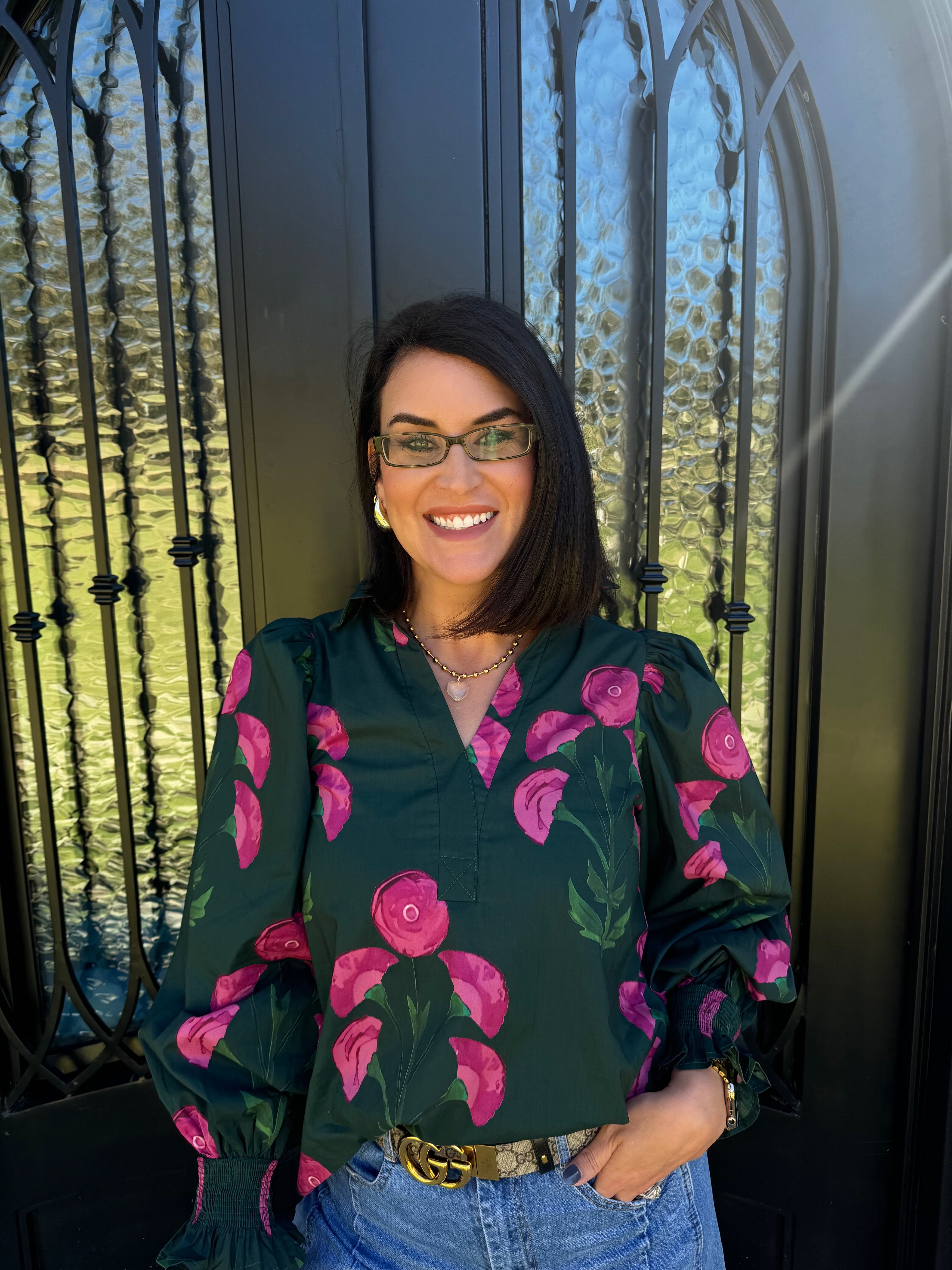 The Marni Top in Hunter Green brings timeless elegance with its V-neck design, long sleeves, and elastic cuffs for a comfortable, stylish fit. Its delicate pink floral pattern adds a vibrant contrast that brightens any outfit. Pair it with our best-selling Tractor Barrel Jeans and finish the look with our olive and orange back 70s sneakers for a perfect blend of retro flair and contemporary edge.
