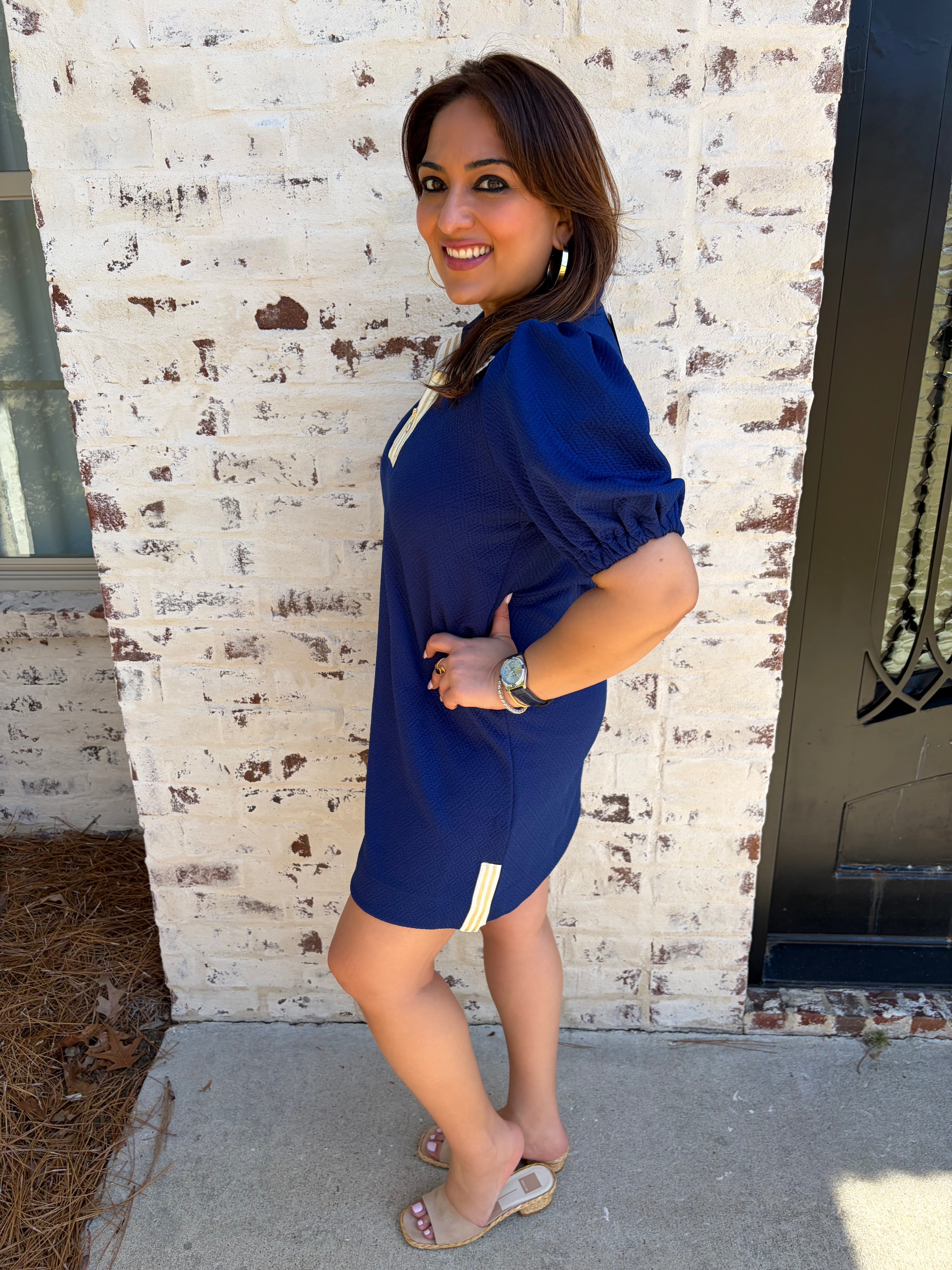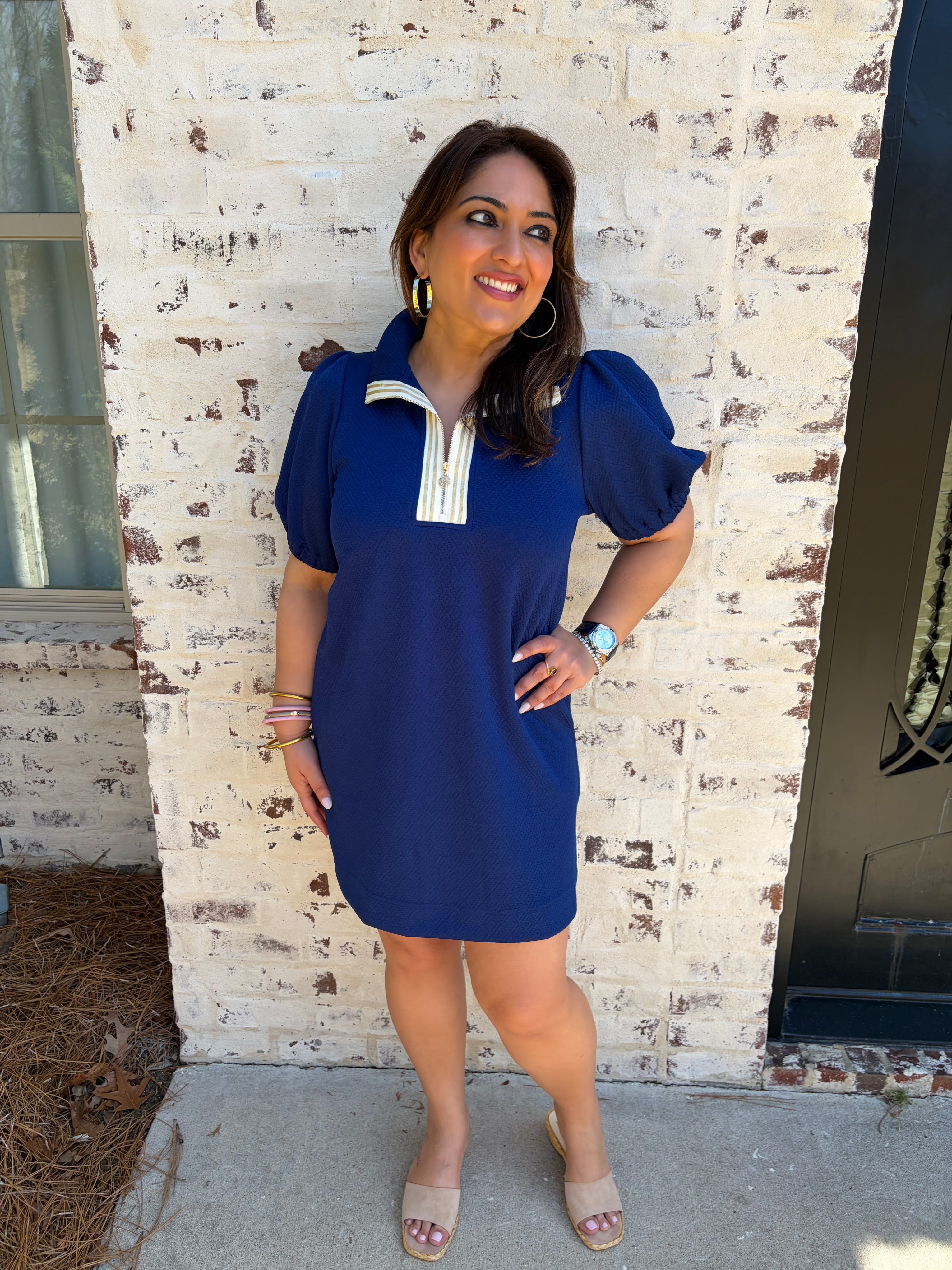 The Mary Square Andie Dress is a navy mini dress featuring a half zip collar, allowing for versatile styling with a preppy or V neck look. Designed with fun puff sleeves, this dress is suitable for various occasions, including high school athletic events, brunch, and errands, ensuring comfort and practicality.