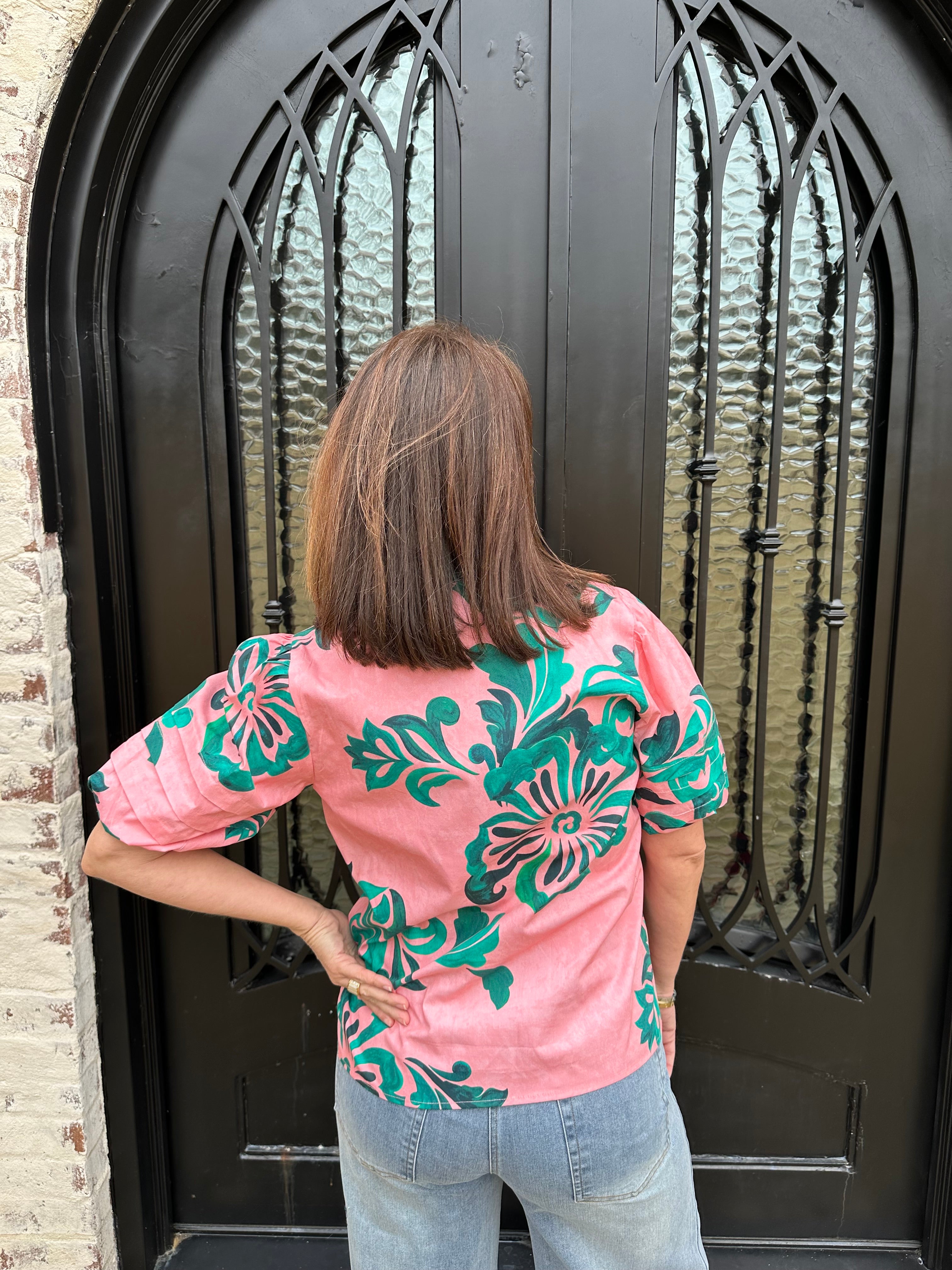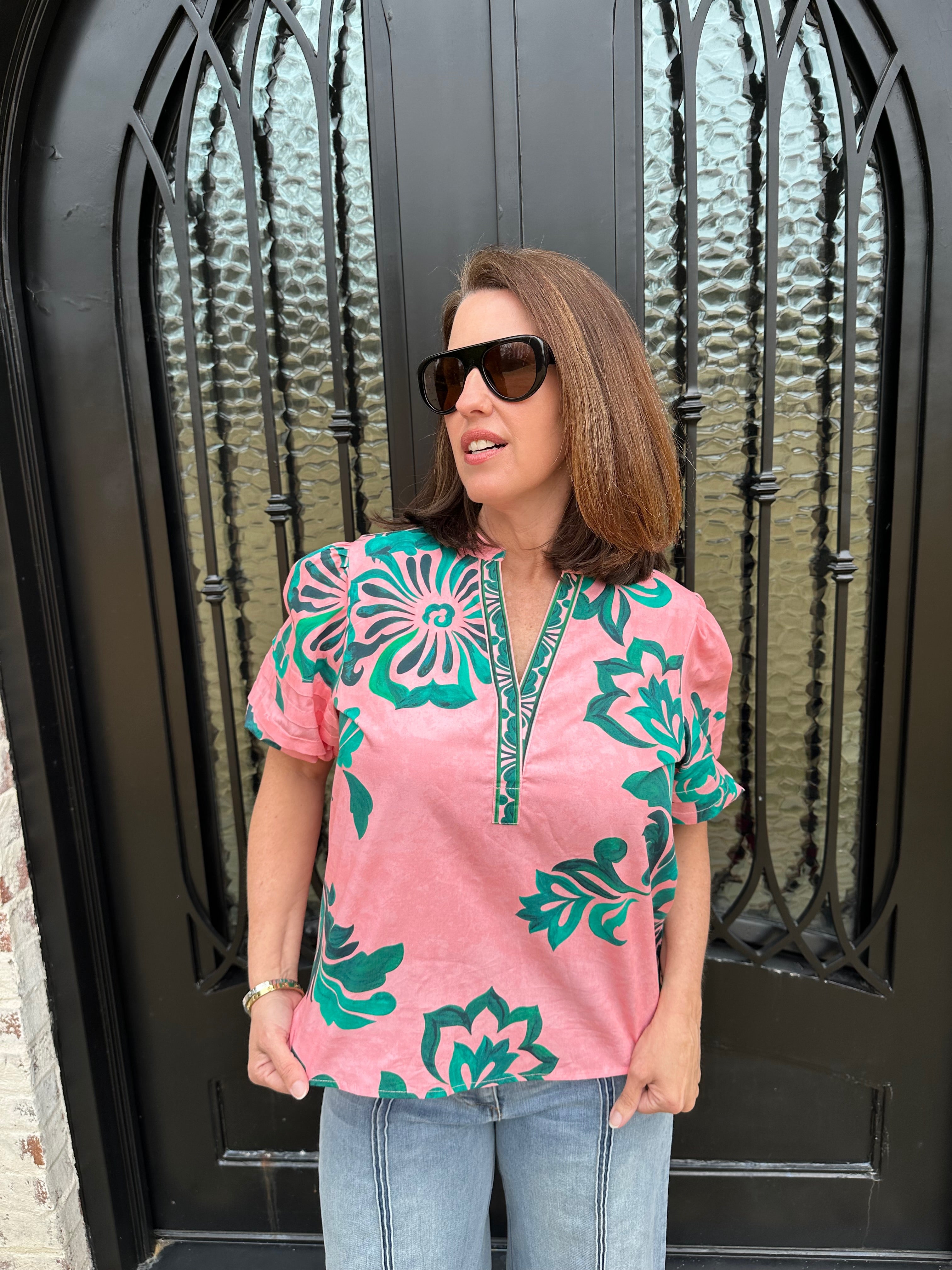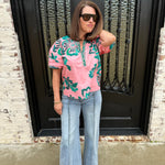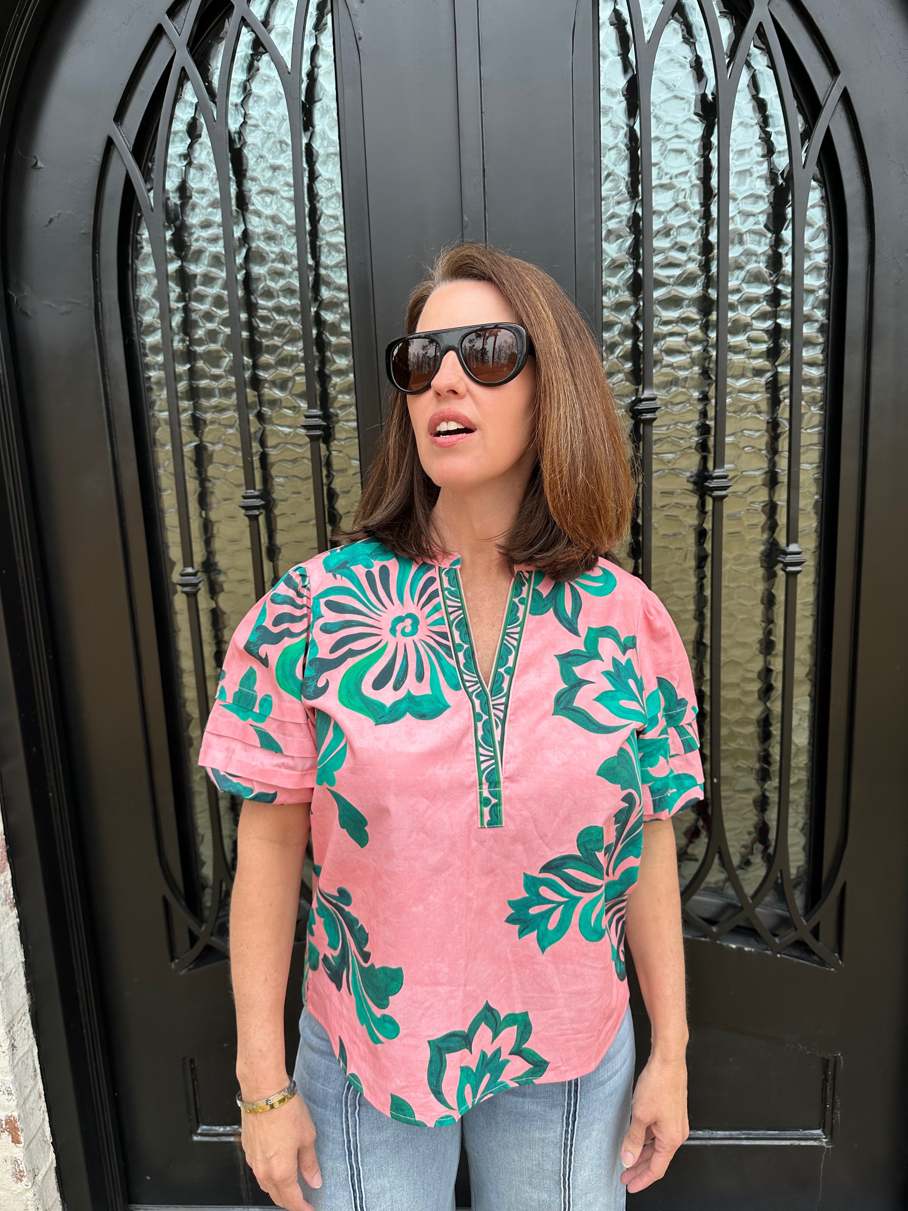 Elevate your wardrobe with the Maude Raya Top in Emerald Blush! Its vibrant emerald pattern adds a playful touch to any outfit, making it a perfect match for Nile wide leg jeans. Experience the joy of effortless style that celebrates your individuality and keeps you feeling fabulous all day long!