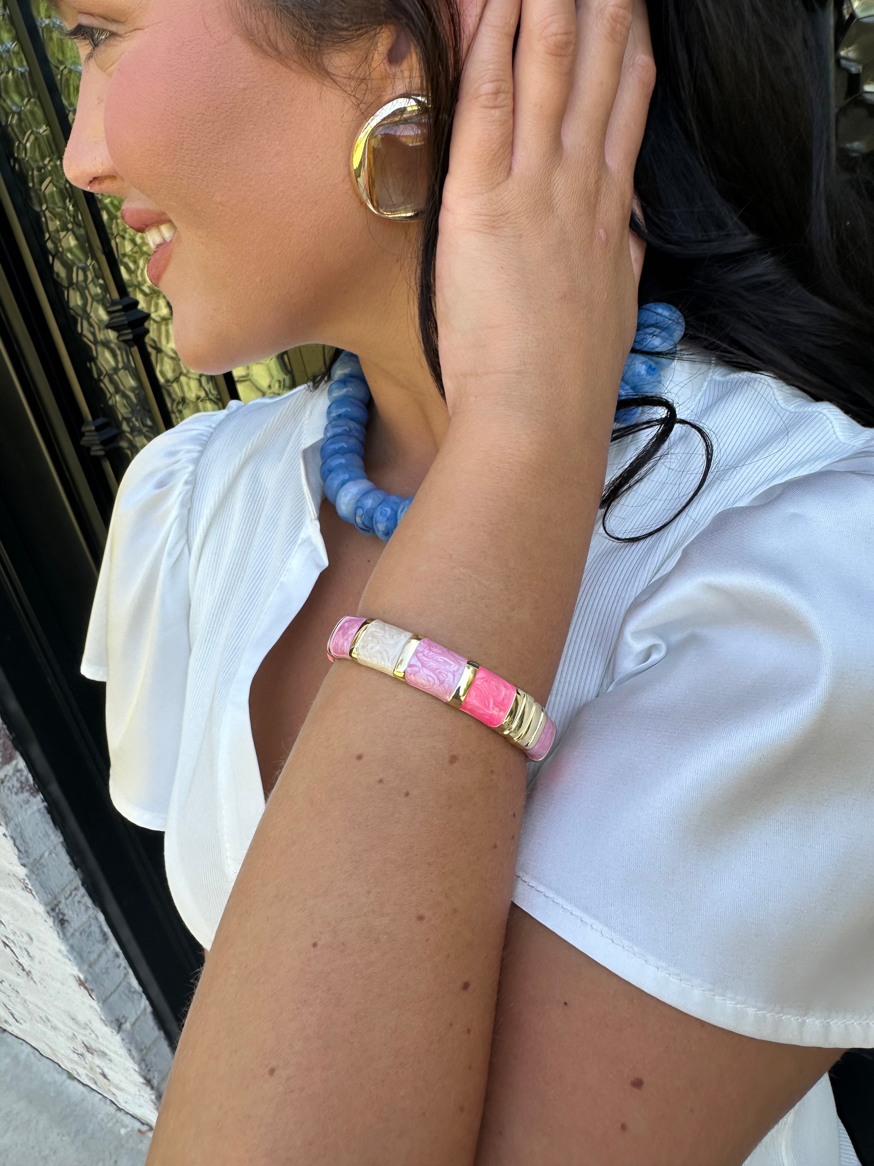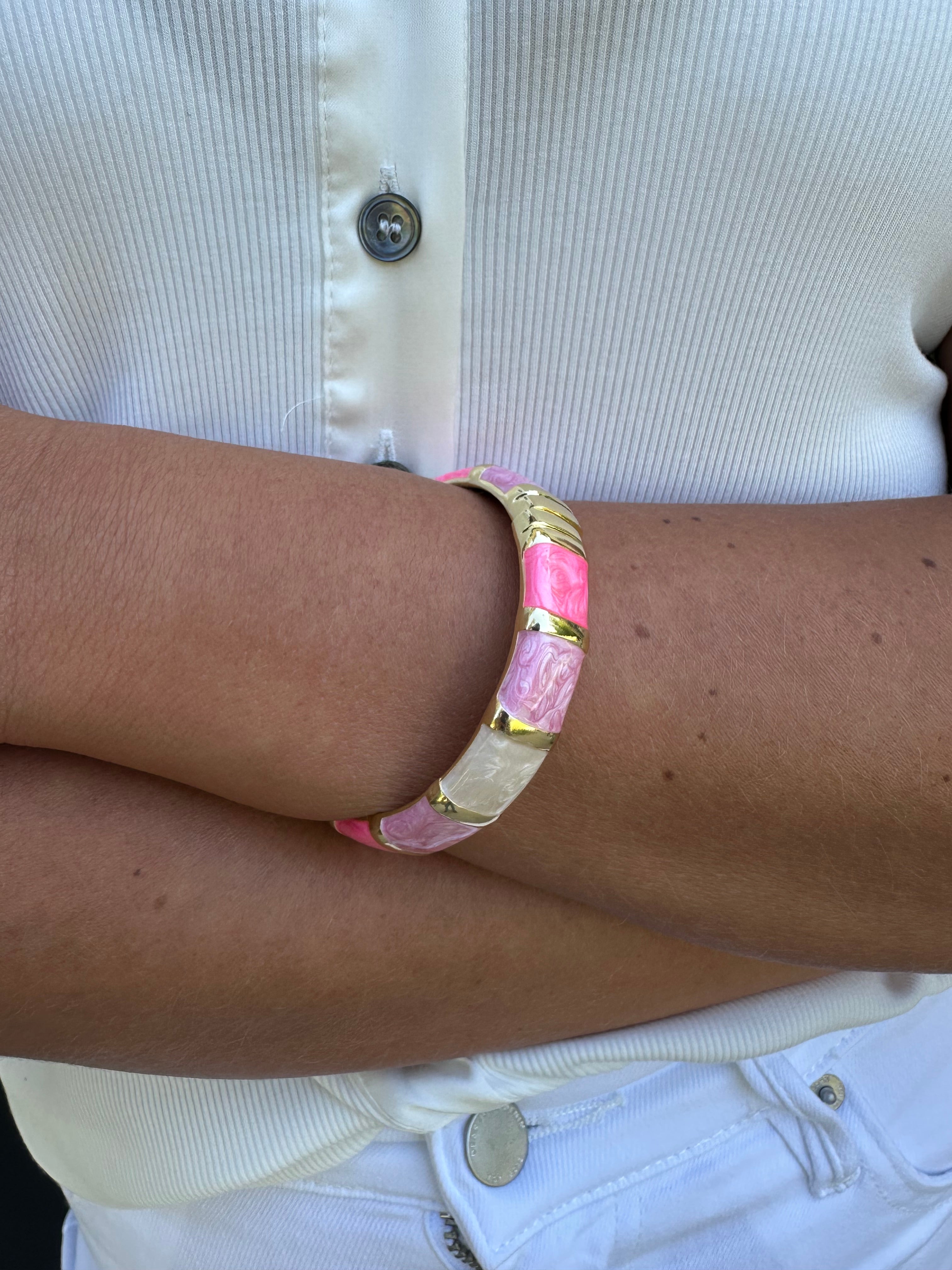 Add a pop of playful color to your stack with this pink multicolored gold hinged bangle bracelet. Crafted with a radiant gold finish, this piece features vibrant pops of pink and complementary hues that catch the light beautifully from every angle. The sleek hinged design makes it effortless to slip on and off while providing a secure, comfortable fit all day long.