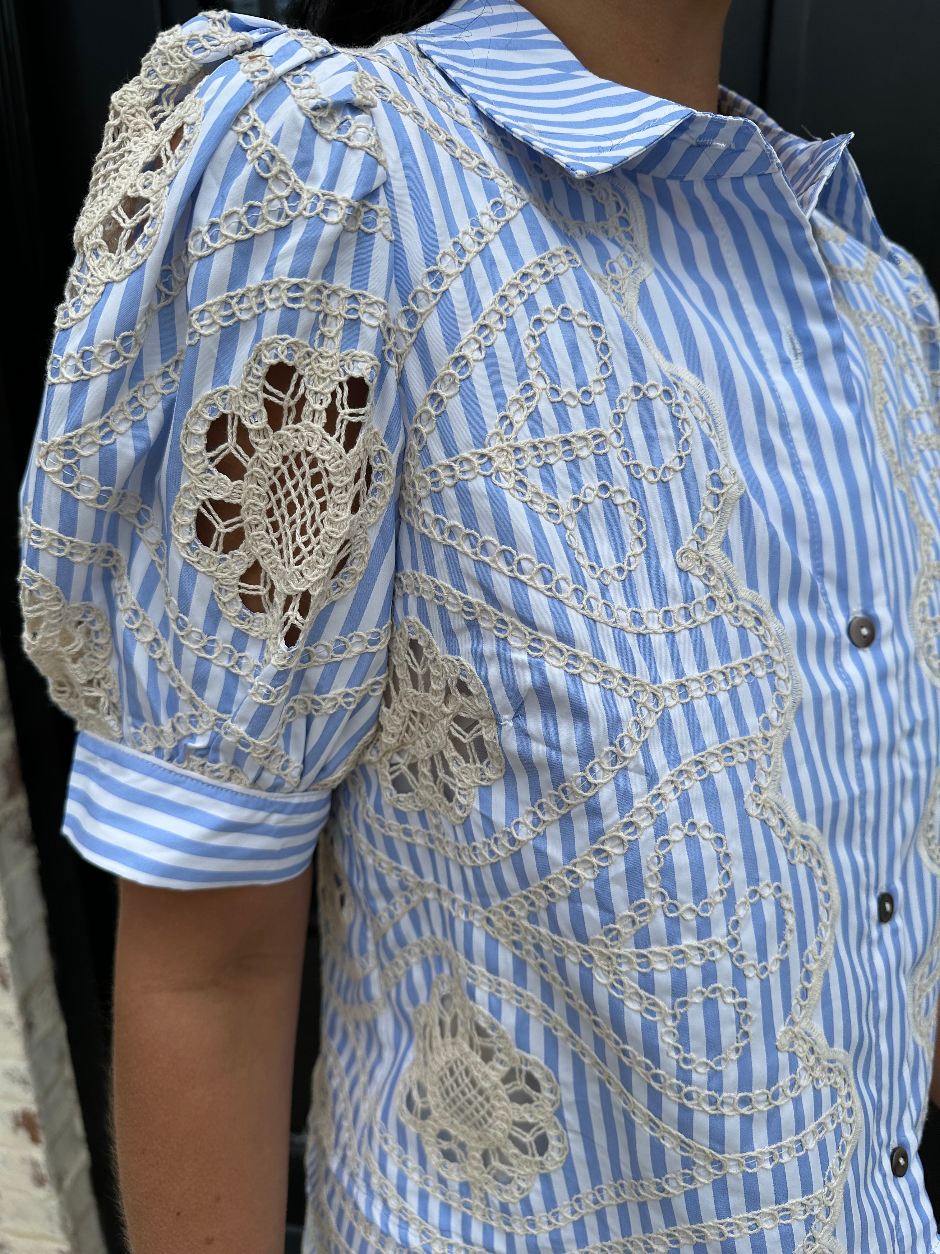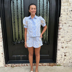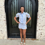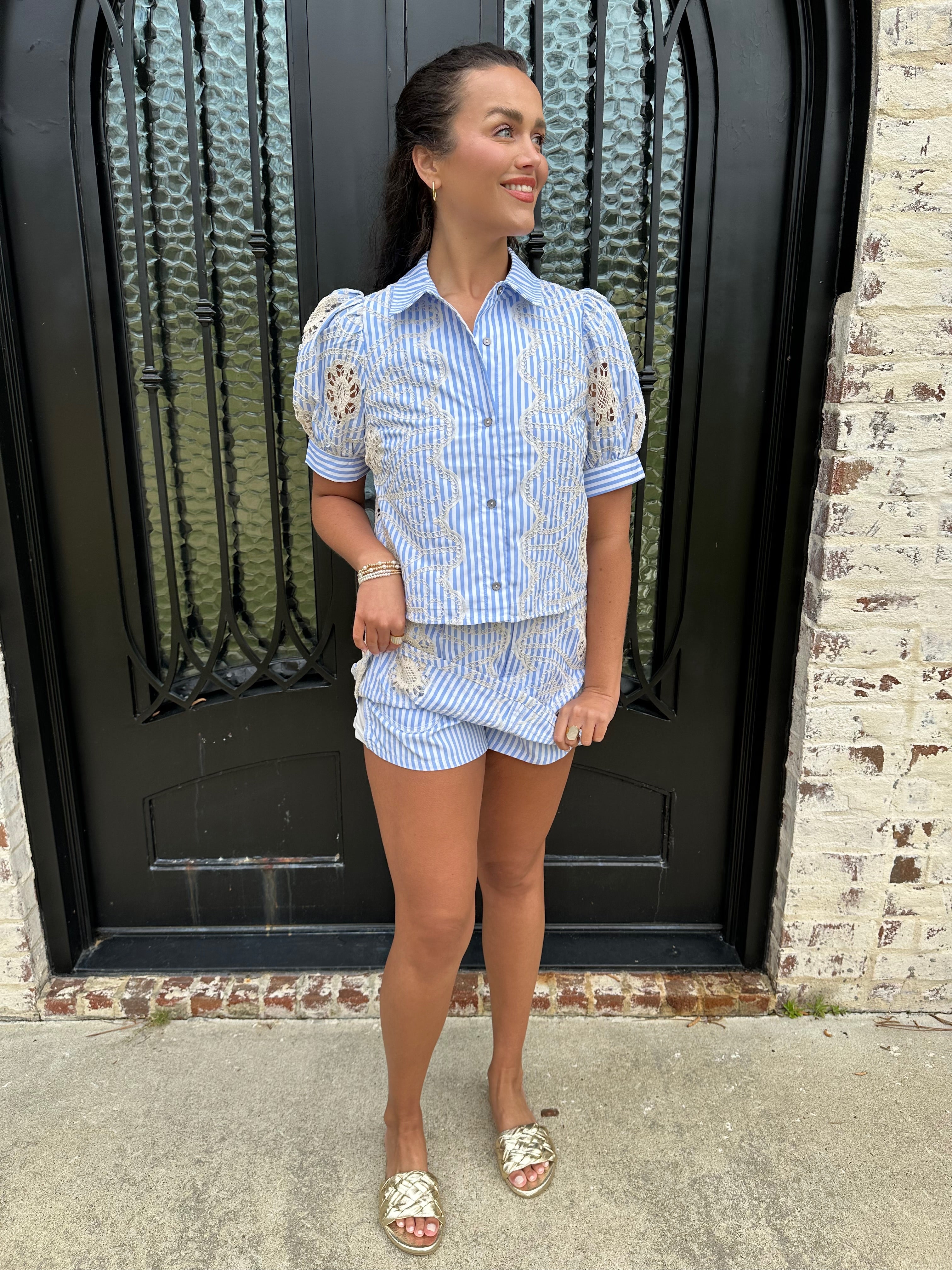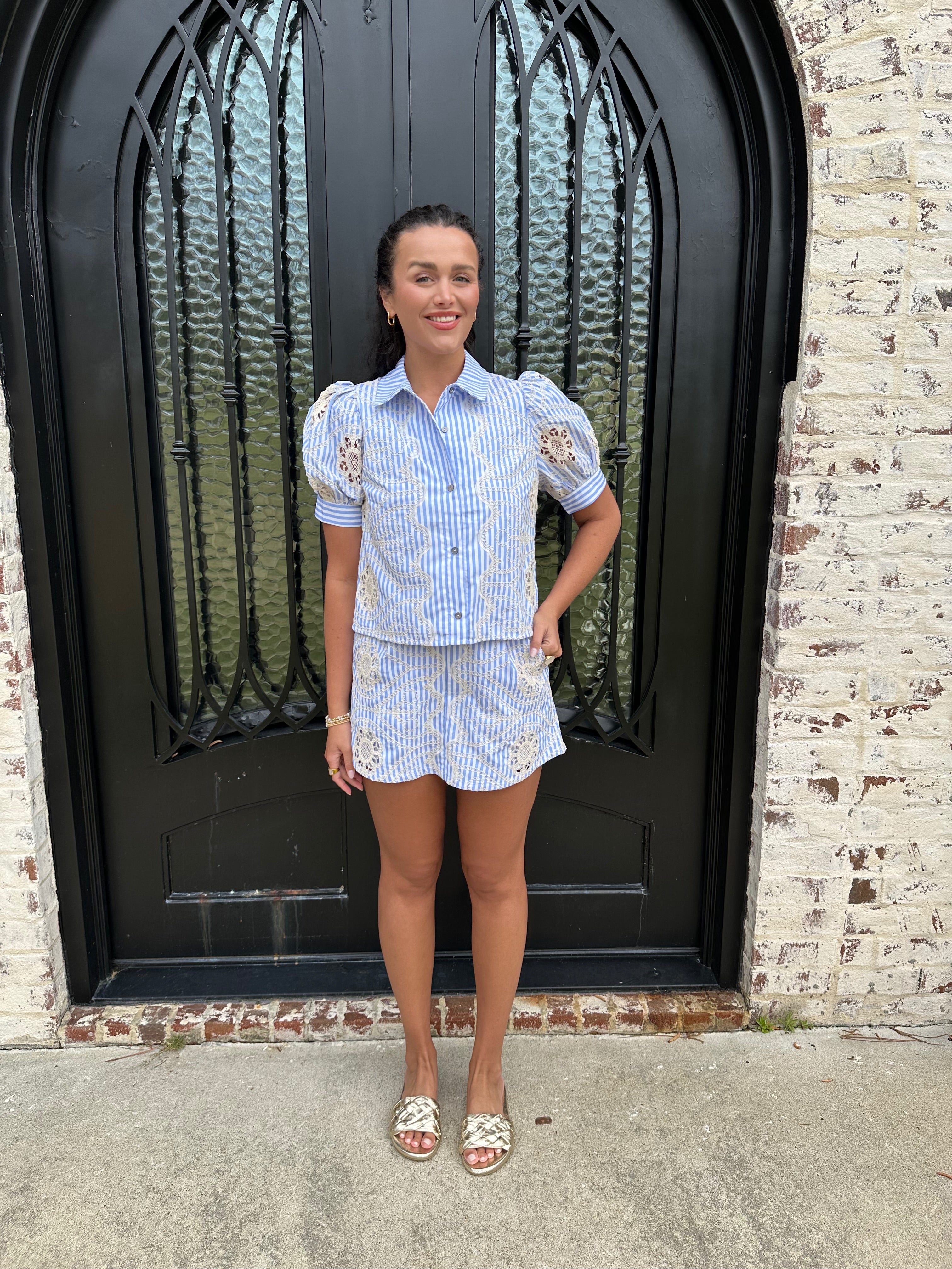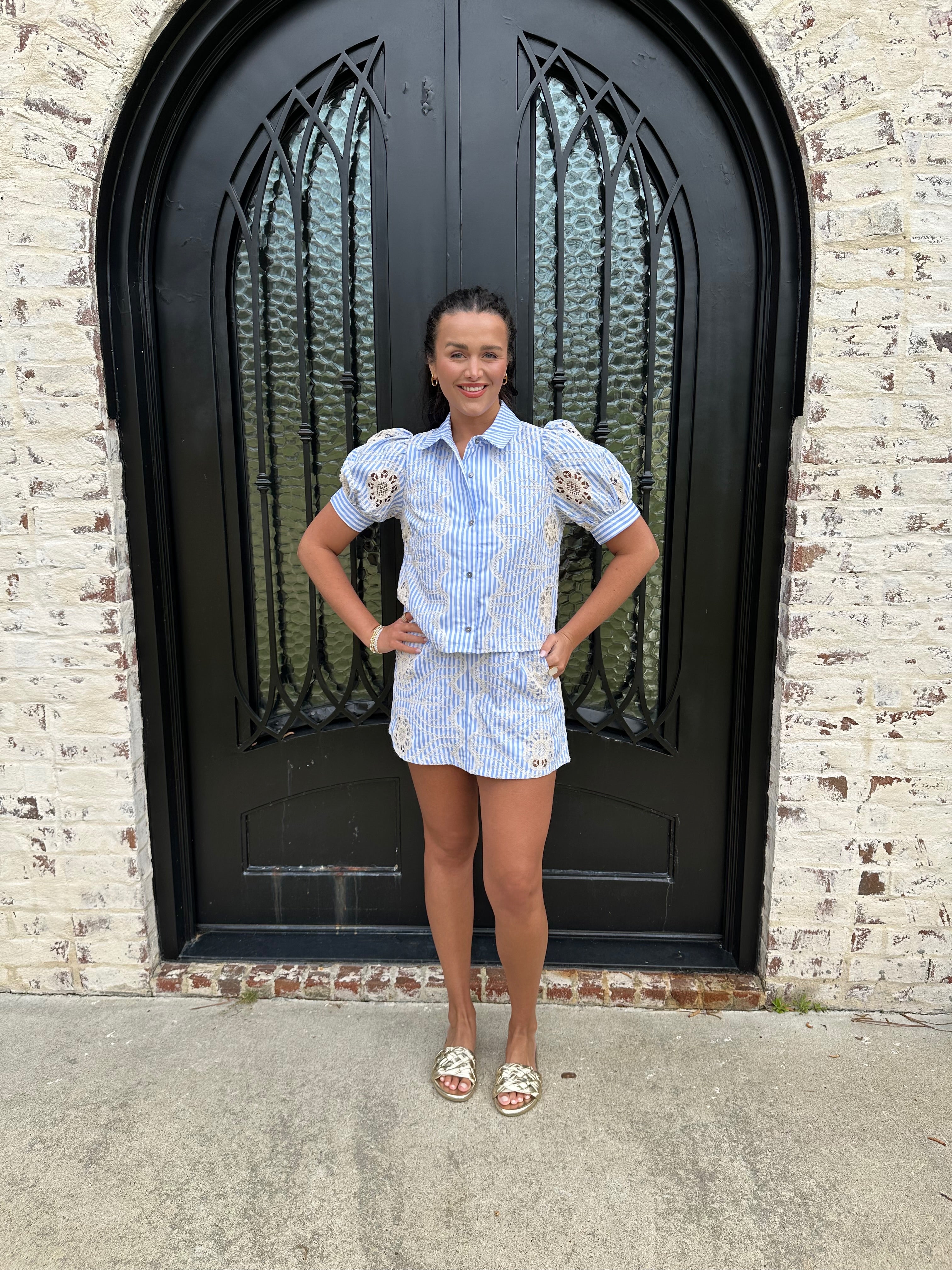 The Posh Embroidery & Stripes Set: Delicate embroidery and classic stripes are enhanced by charming eyelet accents, creating a look that's both polished and undeniably summery. The top features intelligent construction with full front lining for a refined silhouette and a breathable unlined back perfect for warm weather. The fully lined skort ensures comfort and confidence through every wear. Perfect for vacations, brunch dates, and beach getaways.